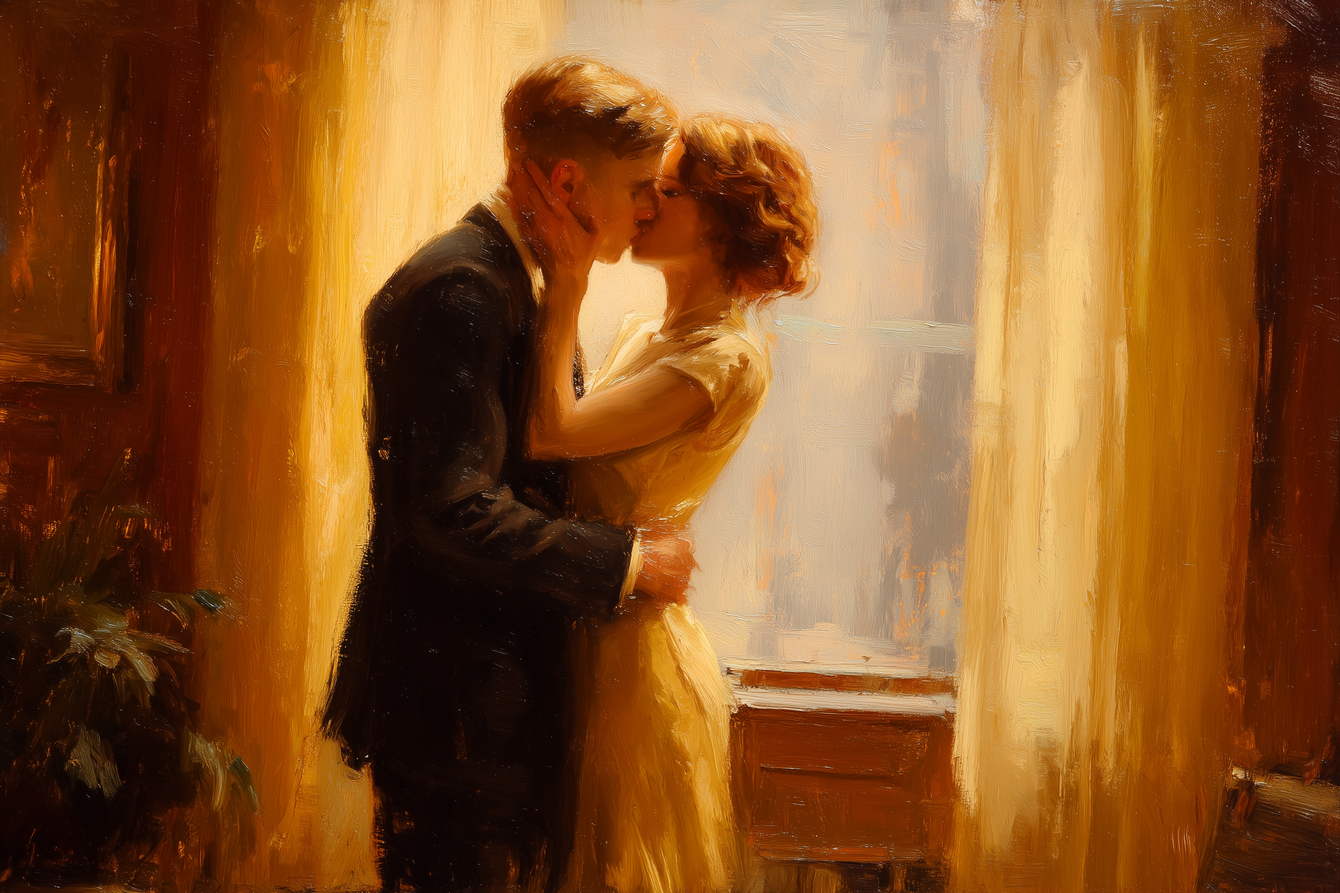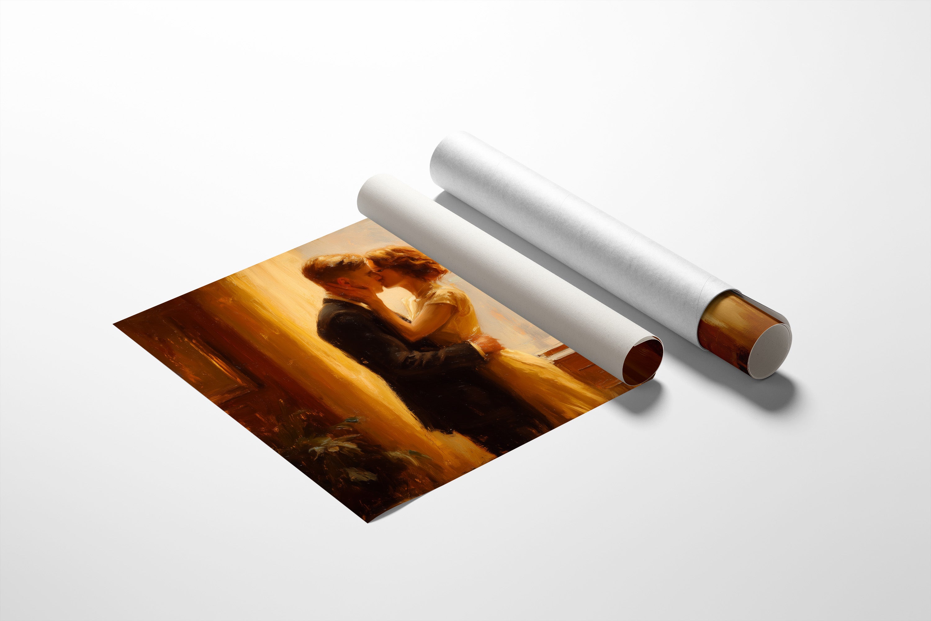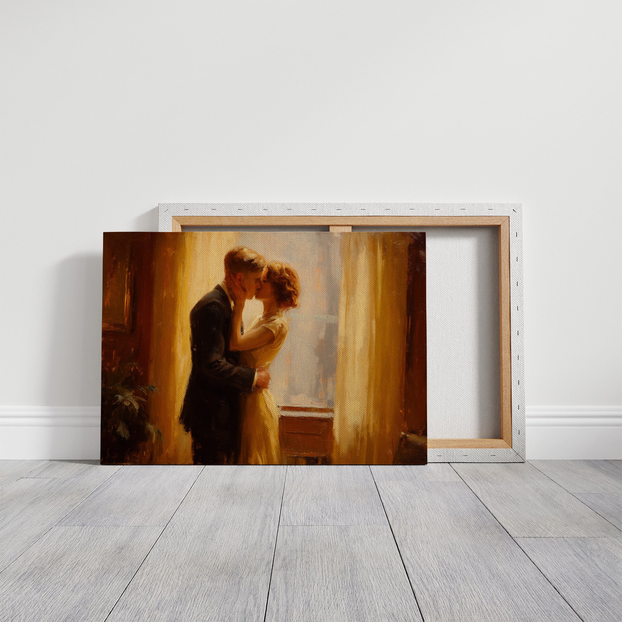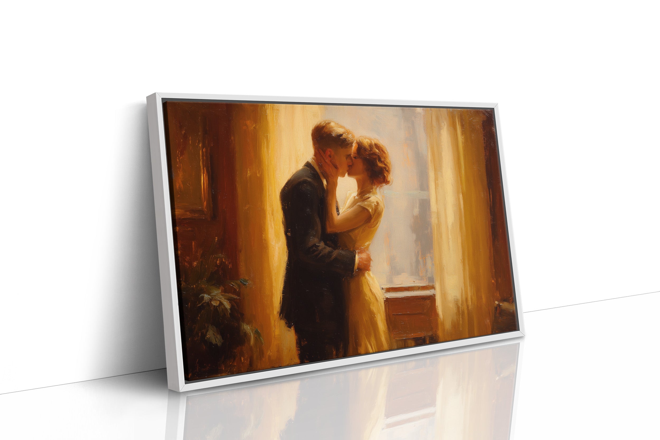 Warm amber light bathes the intimate moment, suspended in time against a backdrop of honeyed hues. The classic painting captures an eternal connection, framed in rich wood that echoes the depth of feeling within. Soft brushstrokes blend golden yellows with earthy browns, creating a sanctuary of emotion amid the glow of afternoon sun. This sophisticated piece brings romantic nostalgia to a home library, study, or reading nook, creating a contemplative focal point among cherished books.