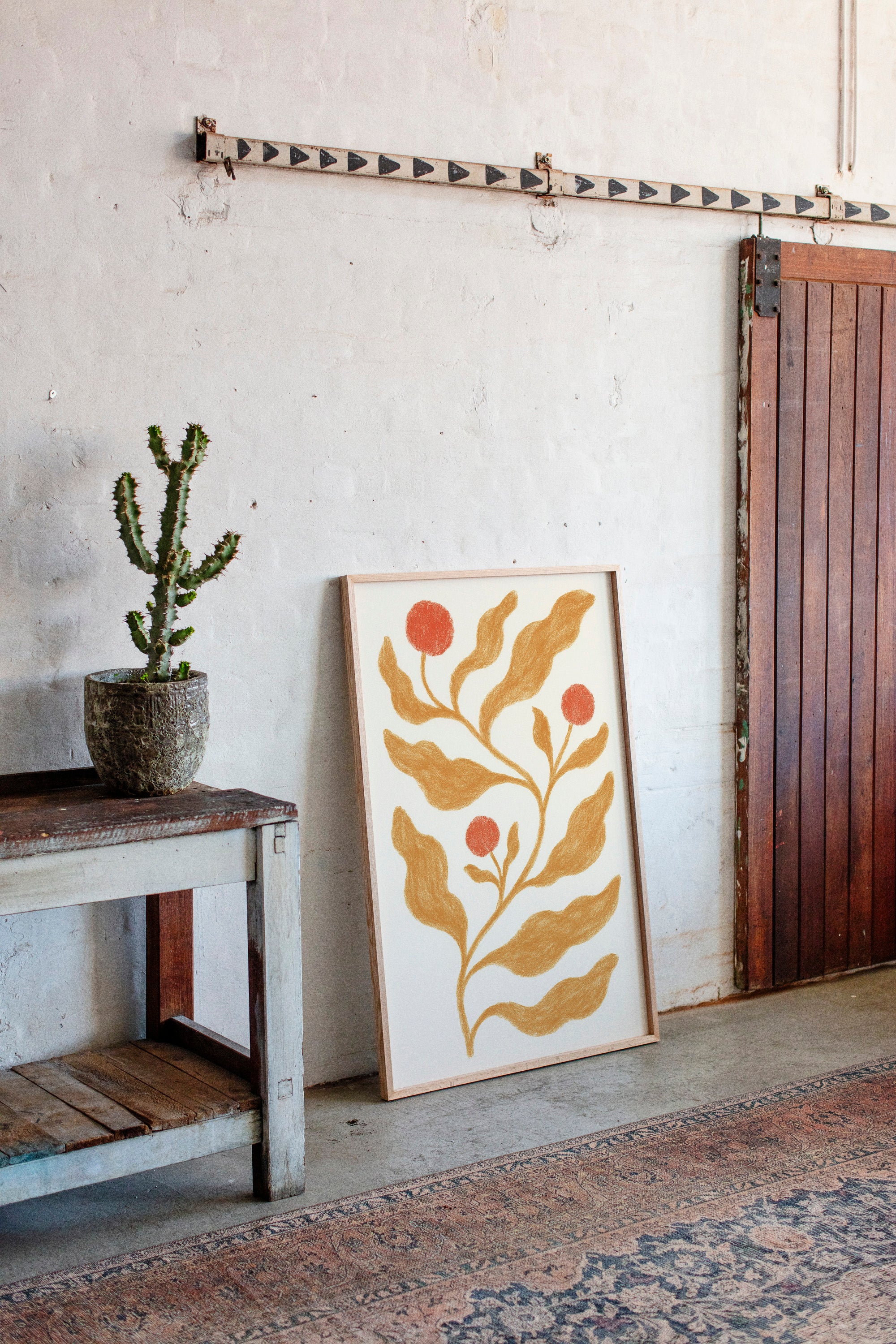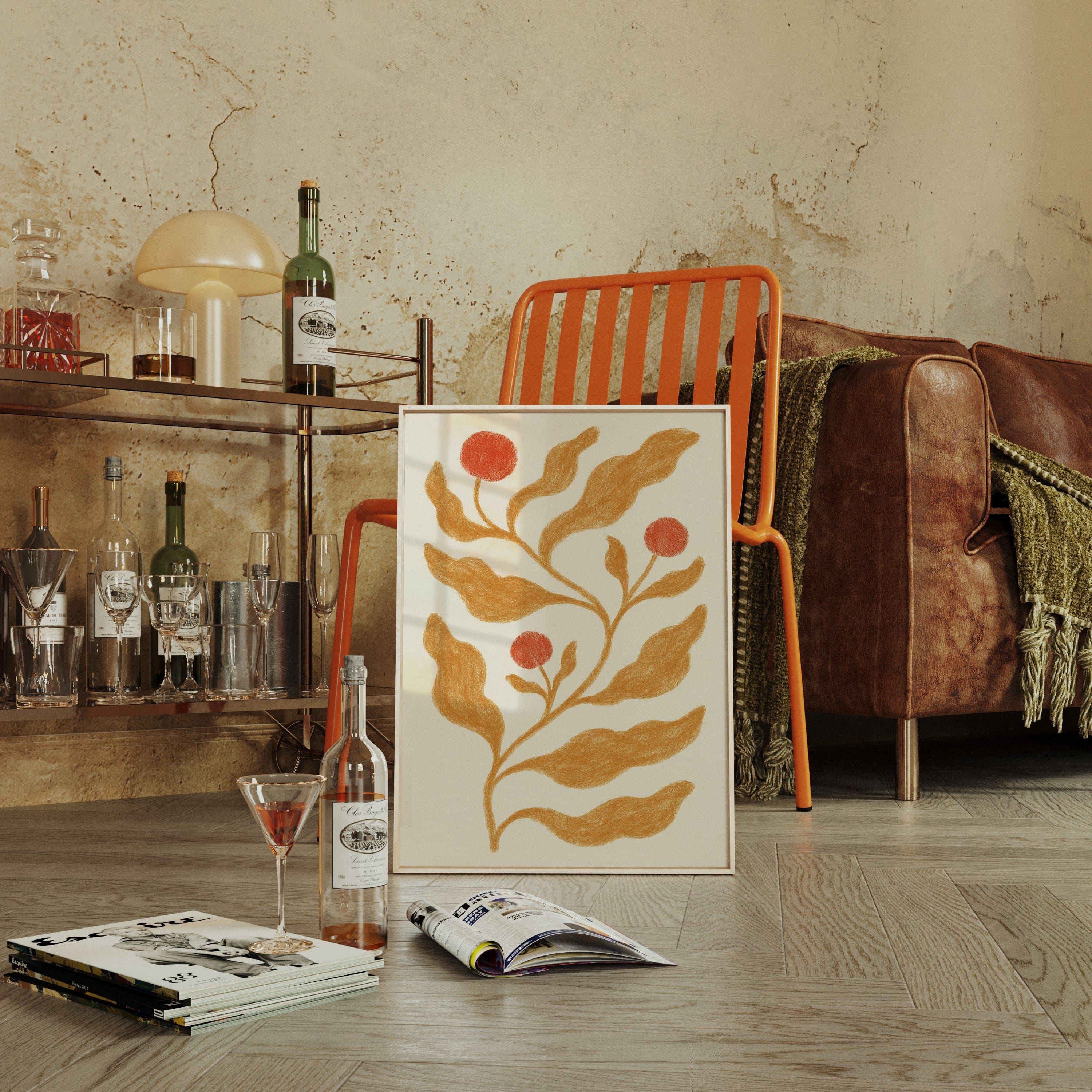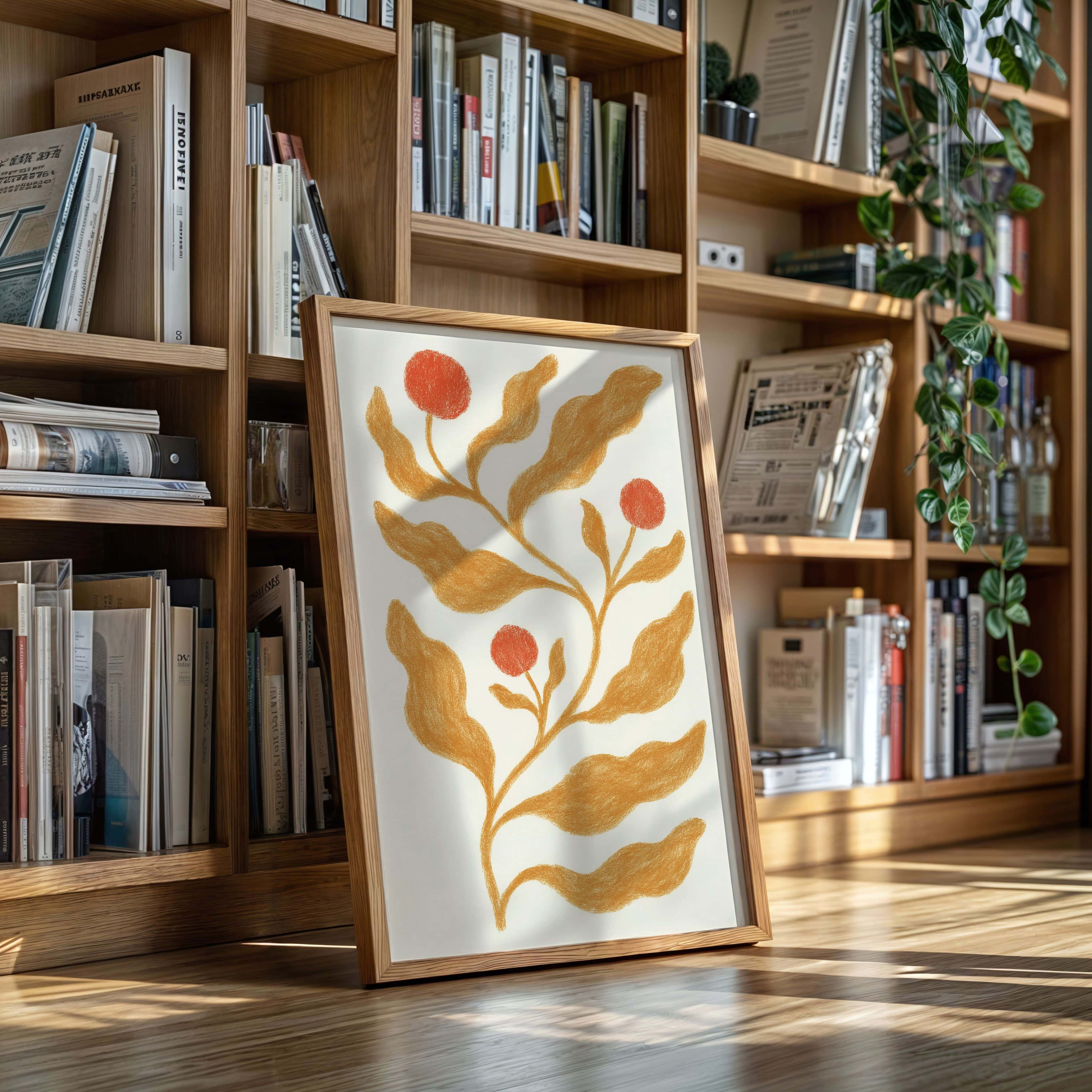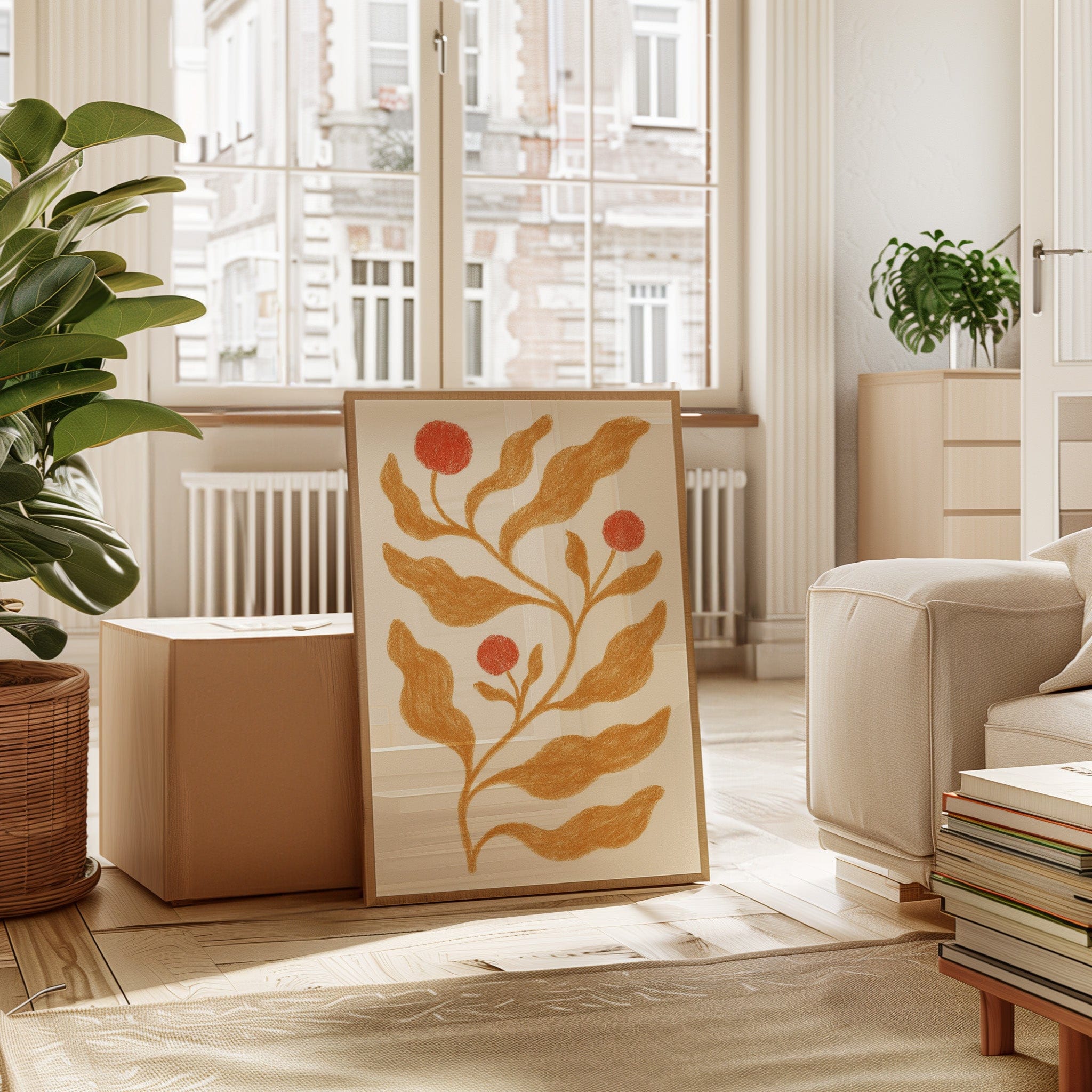 Morning light dances across a minimalist botanical illustration, where ochre leaves unfurl with graceful intention. The composition features flowing golden foliage complemented by three perfectly round coral blooms, creating a harmonious dance between organic movement and geometric precision. The piece speaks in warm undertones against a cream background, its simple elegance enhanced by the interplay of sunlight through nearby windows. This contemporary botanical piece would bring sophisticated warmth to a modern dining room or create a serene focal point in a minimalist bedroom sanctuary.