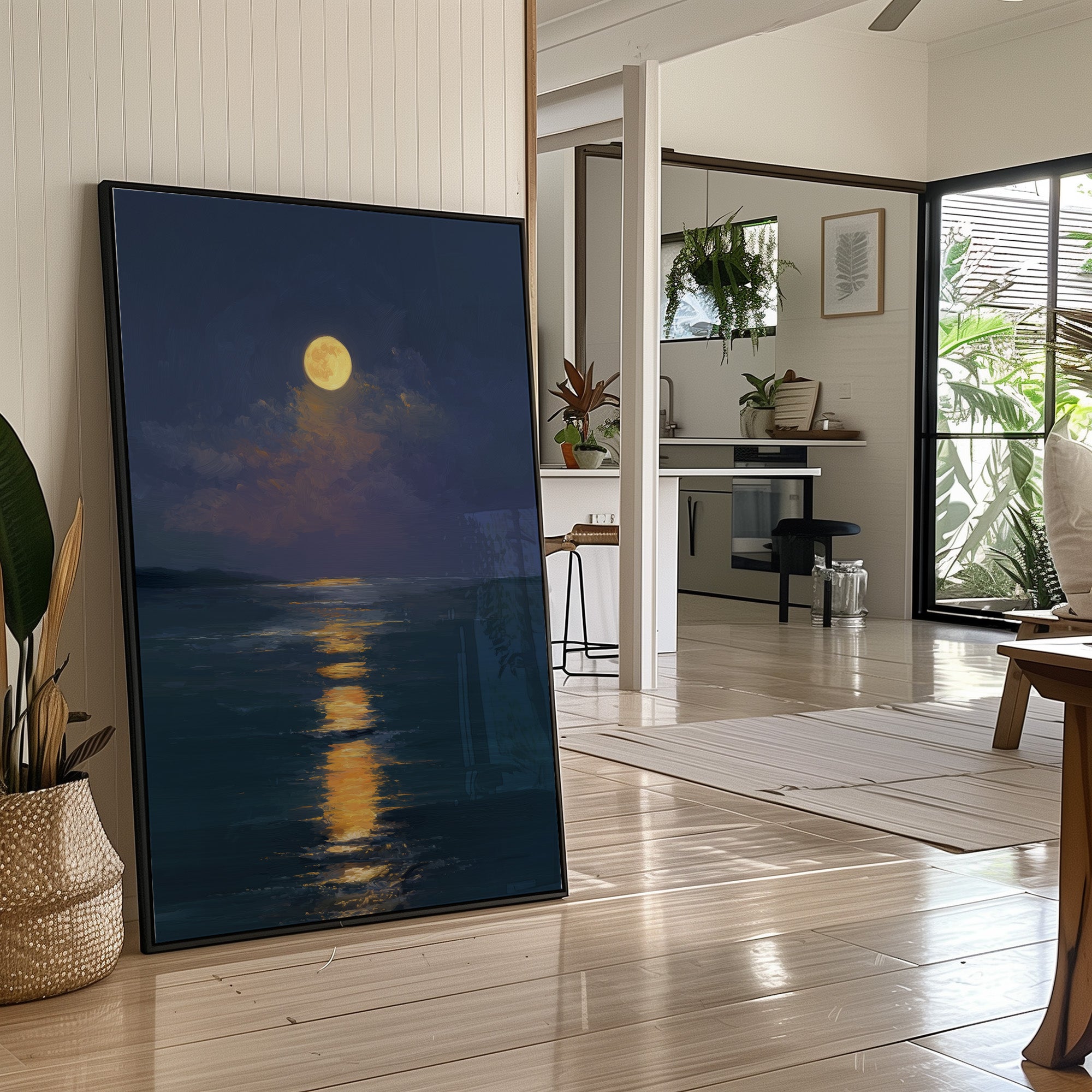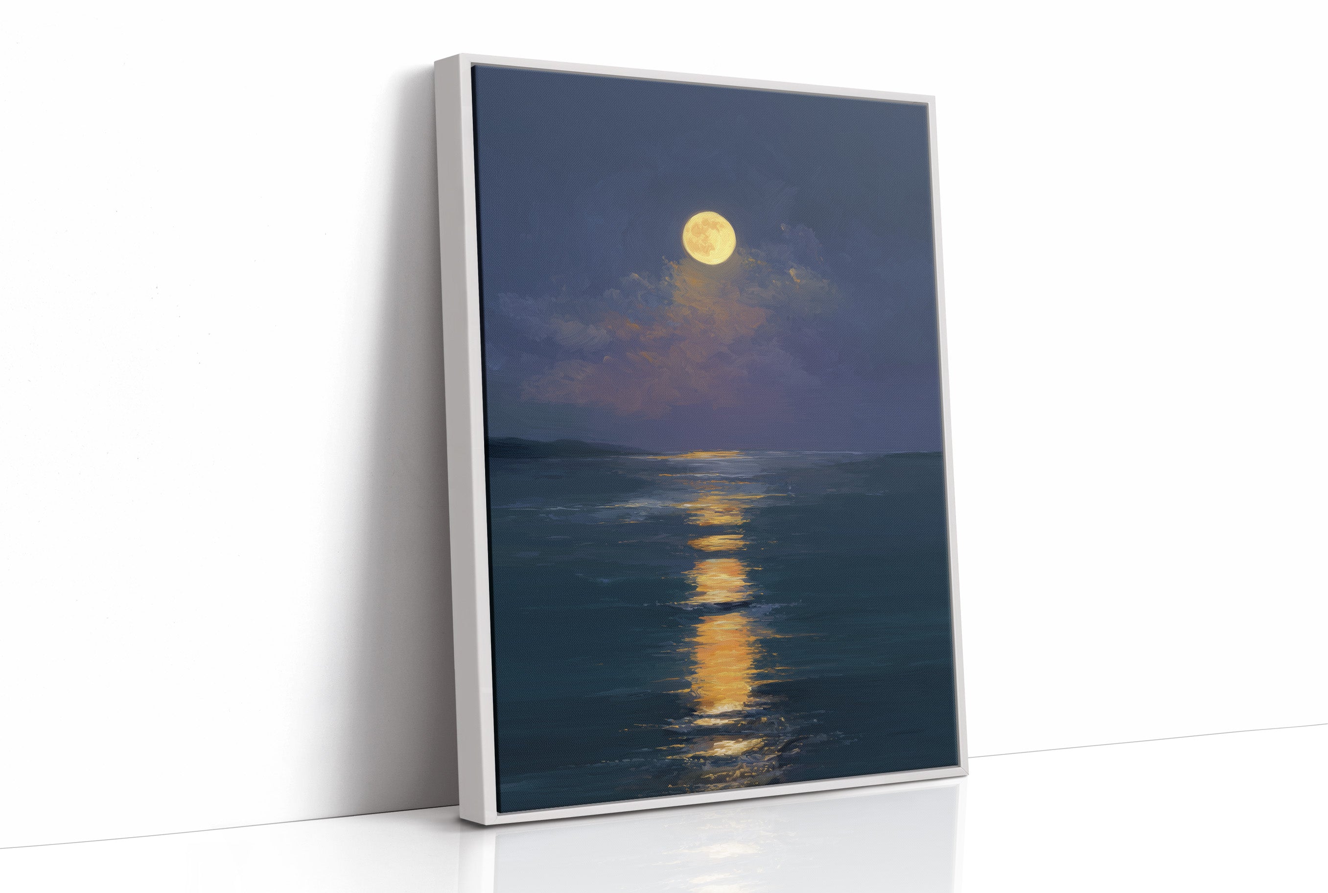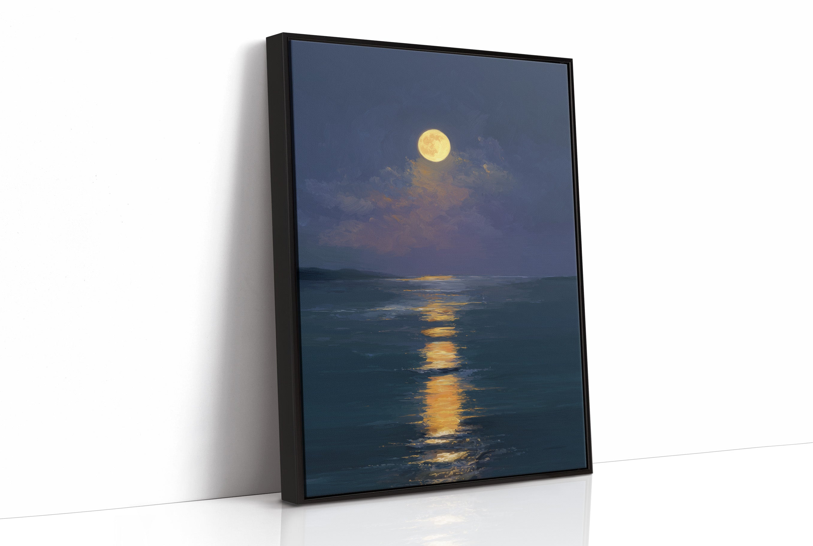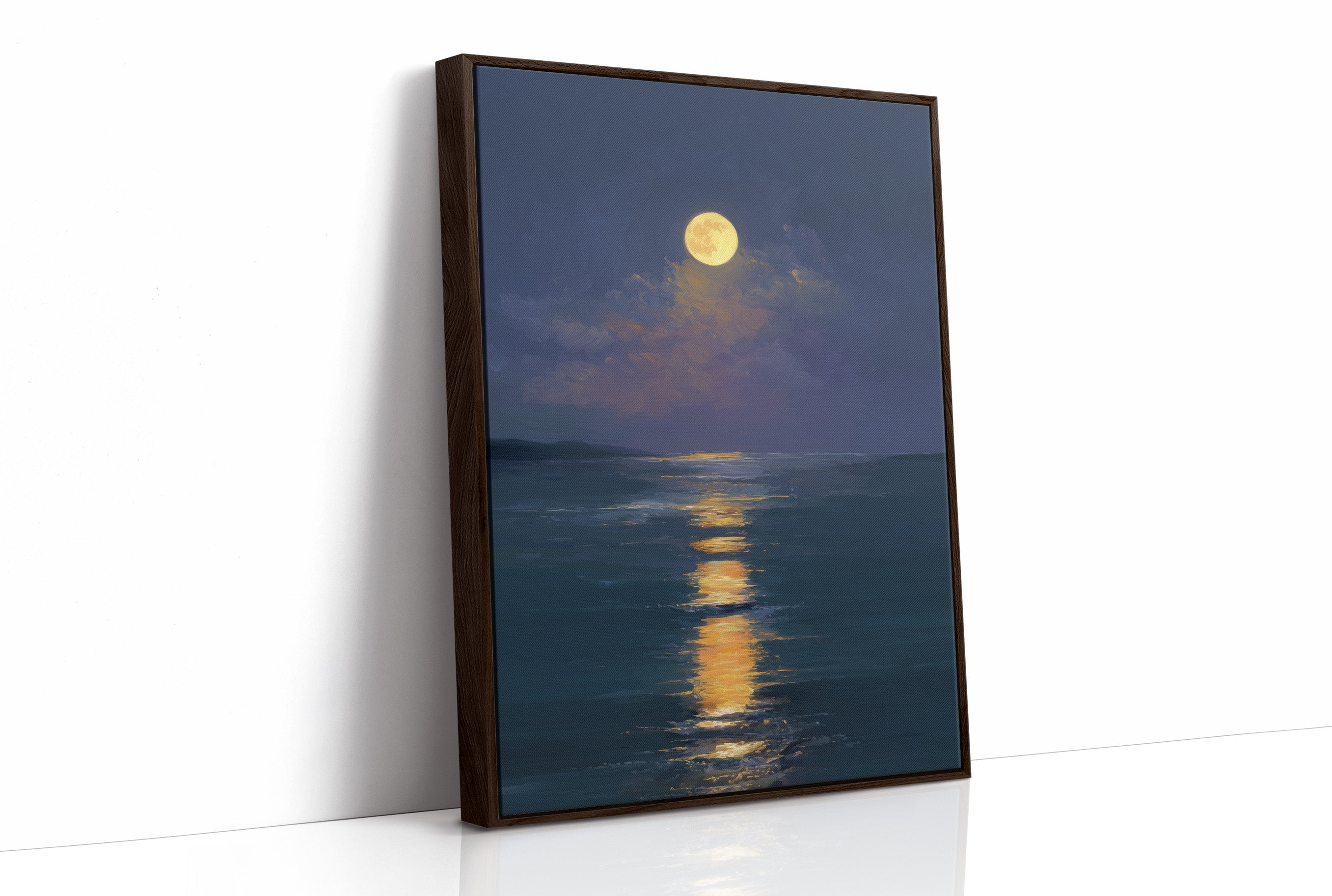 Stillness settles as the full moon carves a glowing trail across the darkened sea. The honey-gold light creates a luminous highway through deep indigo waters, inviting the eye to follow its shimmering journey. Brushstrokes capture the gentle movement of clouds embracing the radiant orb, while the horizon melts into a soft boundary between ocean and night sky. This serene seascape brings tranquil energy to bedrooms or meditation spaces, offering a moment of peaceful contemplation.