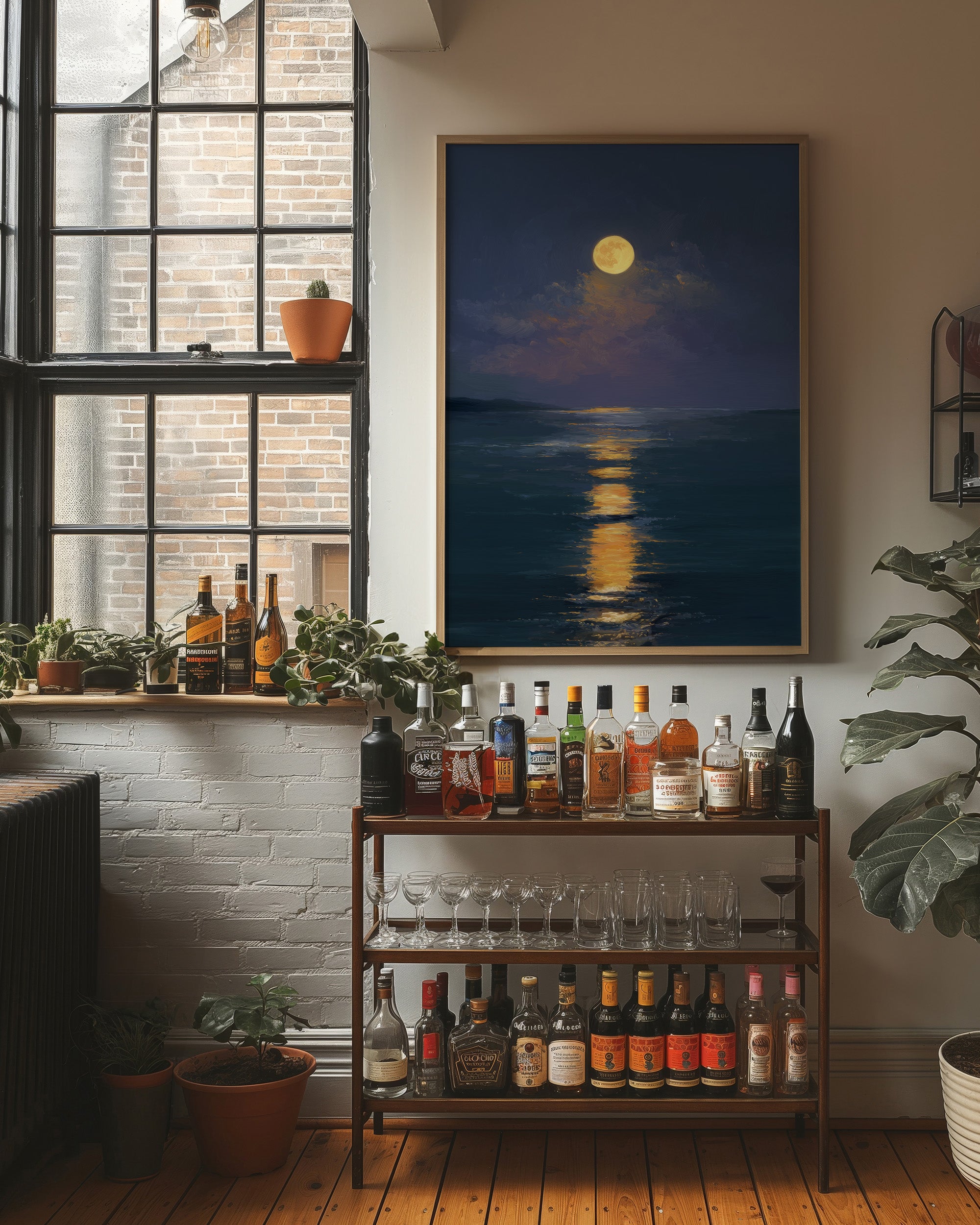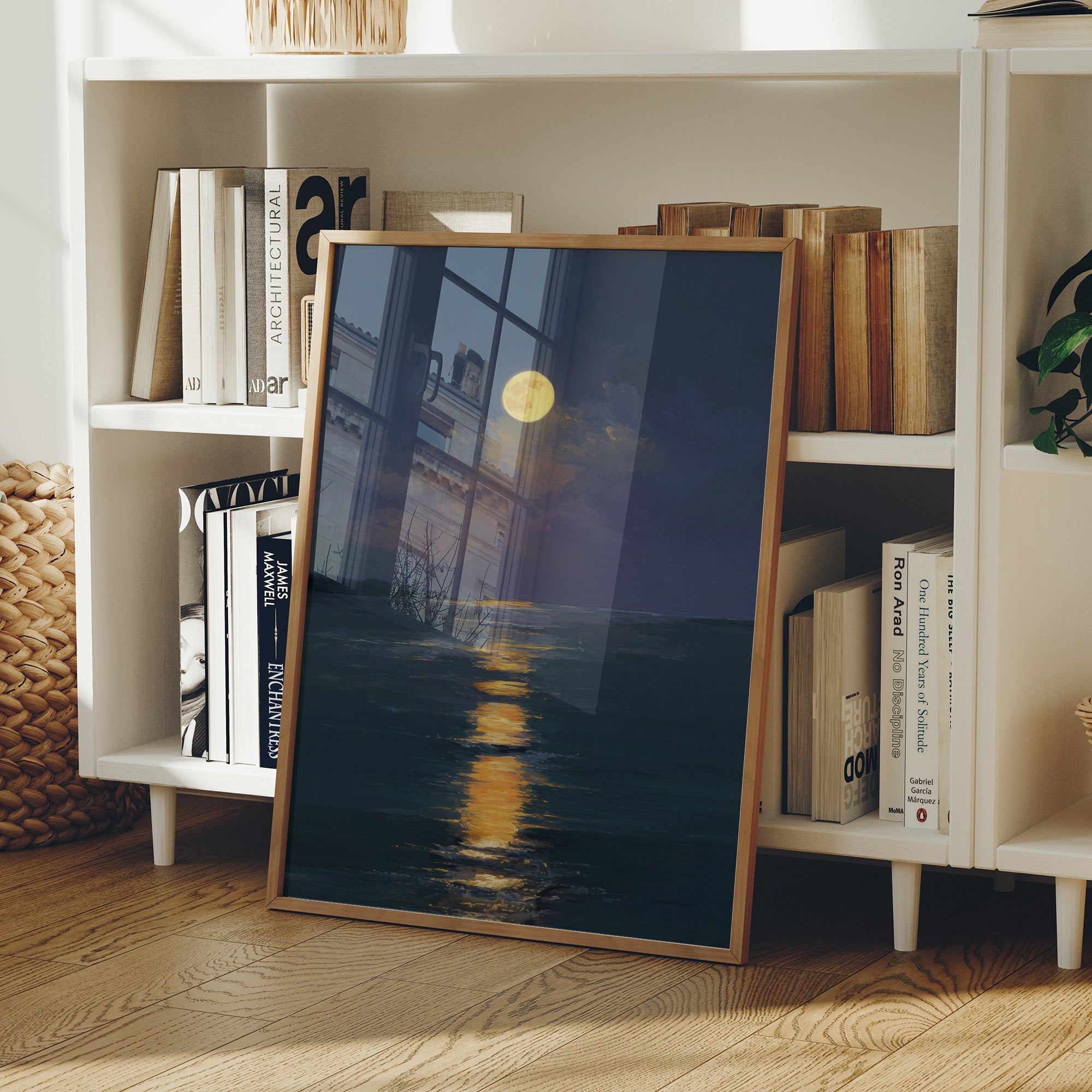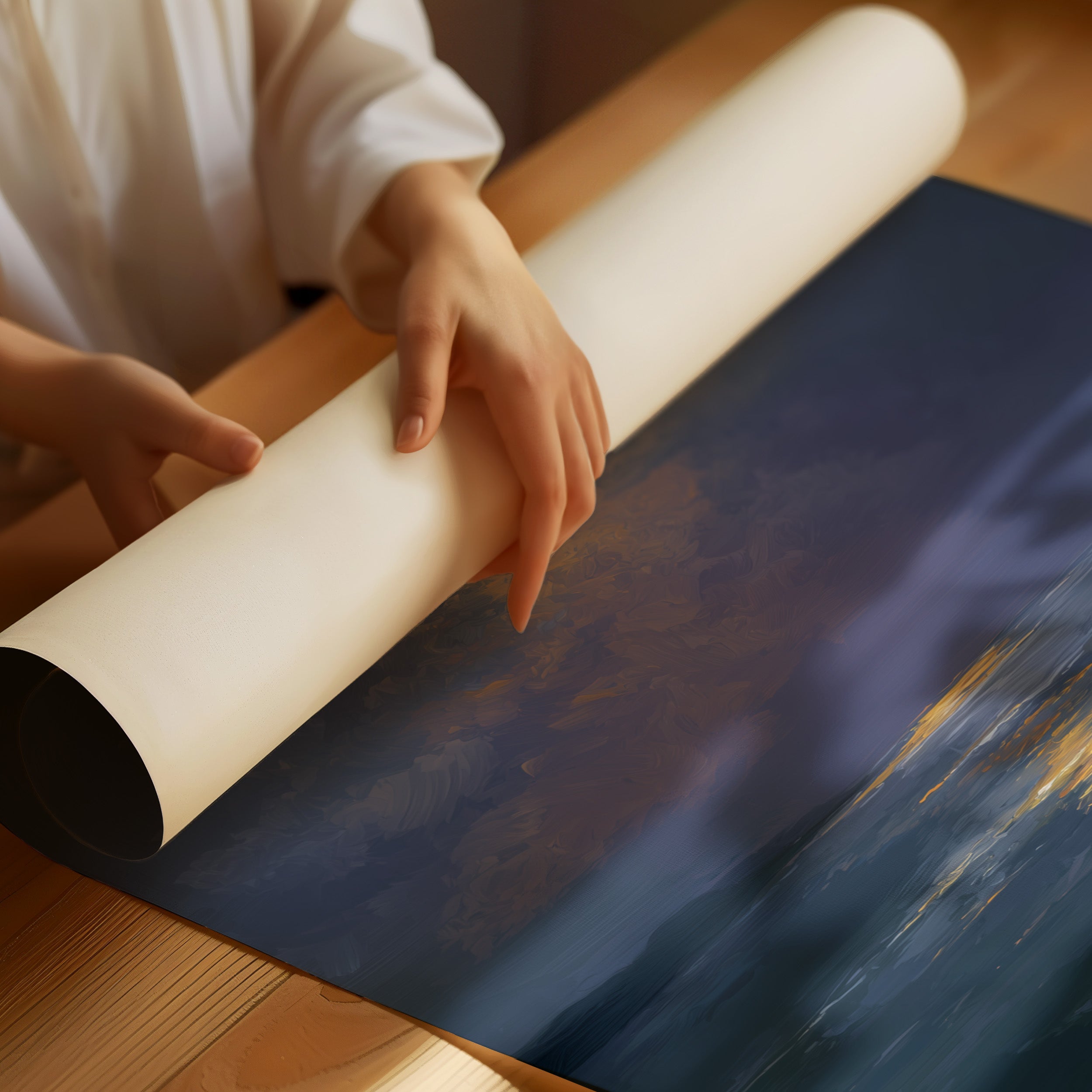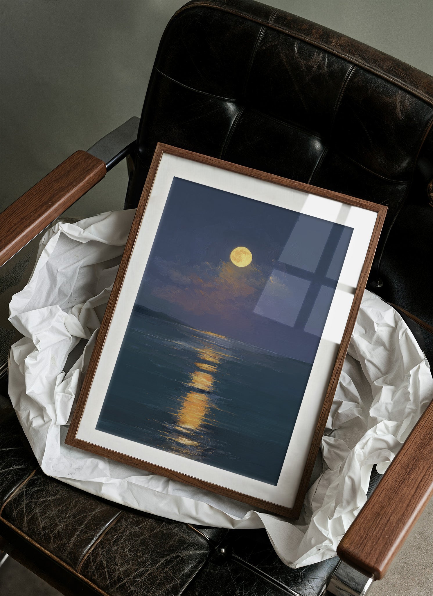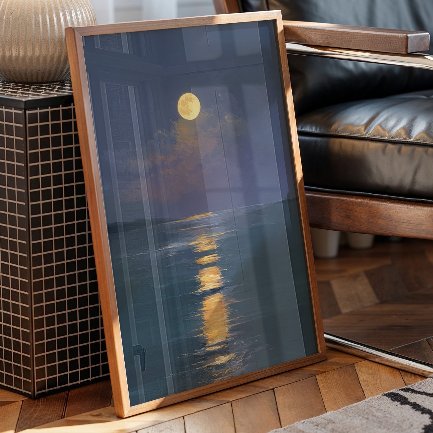 Stillness settles as the full moon carves a glowing trail across the darkened sea. The honey-gold light creates a luminous highway through deep indigo waters, inviting the eye to follow its shimmering journey. Brushstrokes capture the gentle movement of clouds embracing the radiant orb, while the horizon melts into a soft boundary between ocean and night sky. This serene seascape brings tranquil energy to bedrooms or meditation spaces, offering a moment of peaceful contemplation.