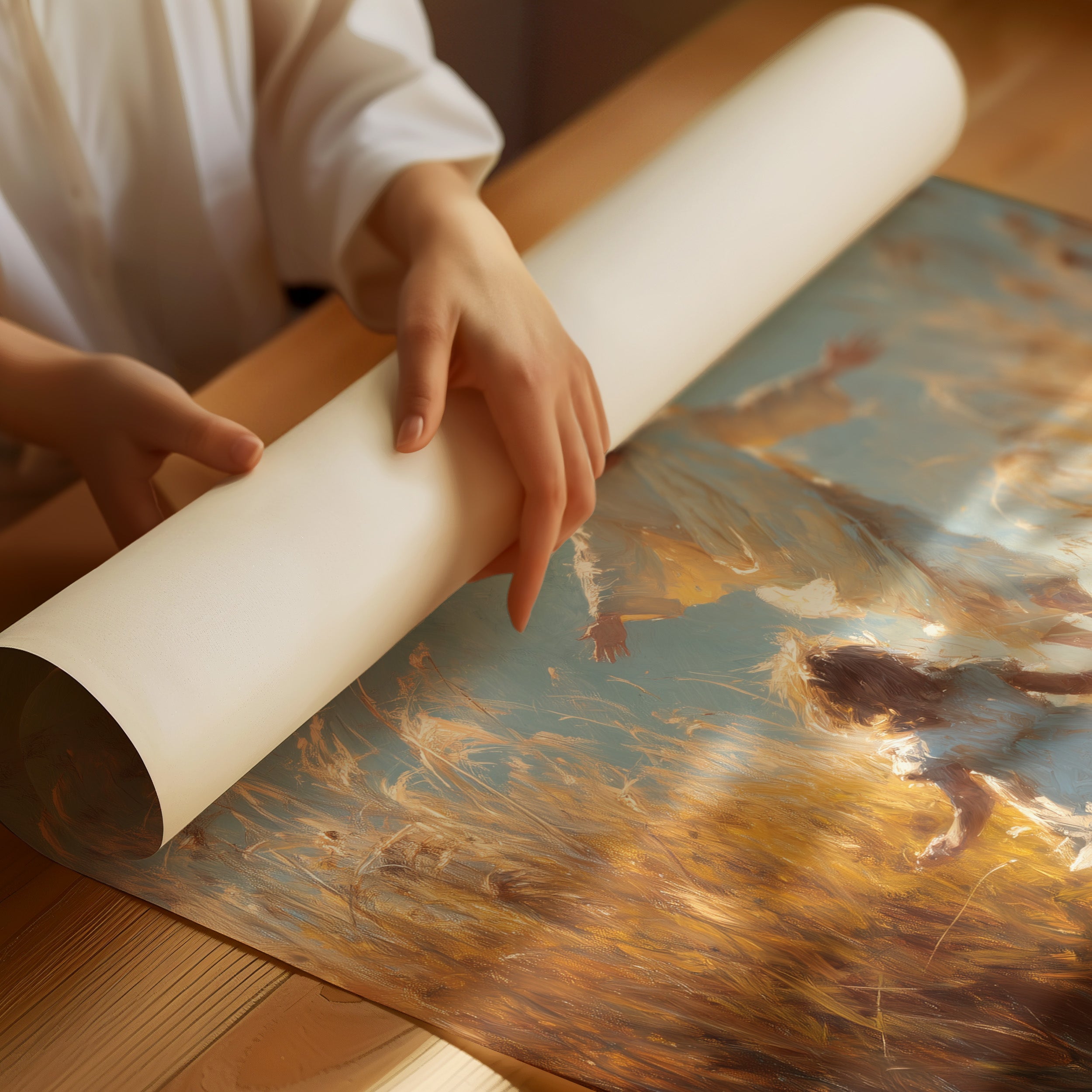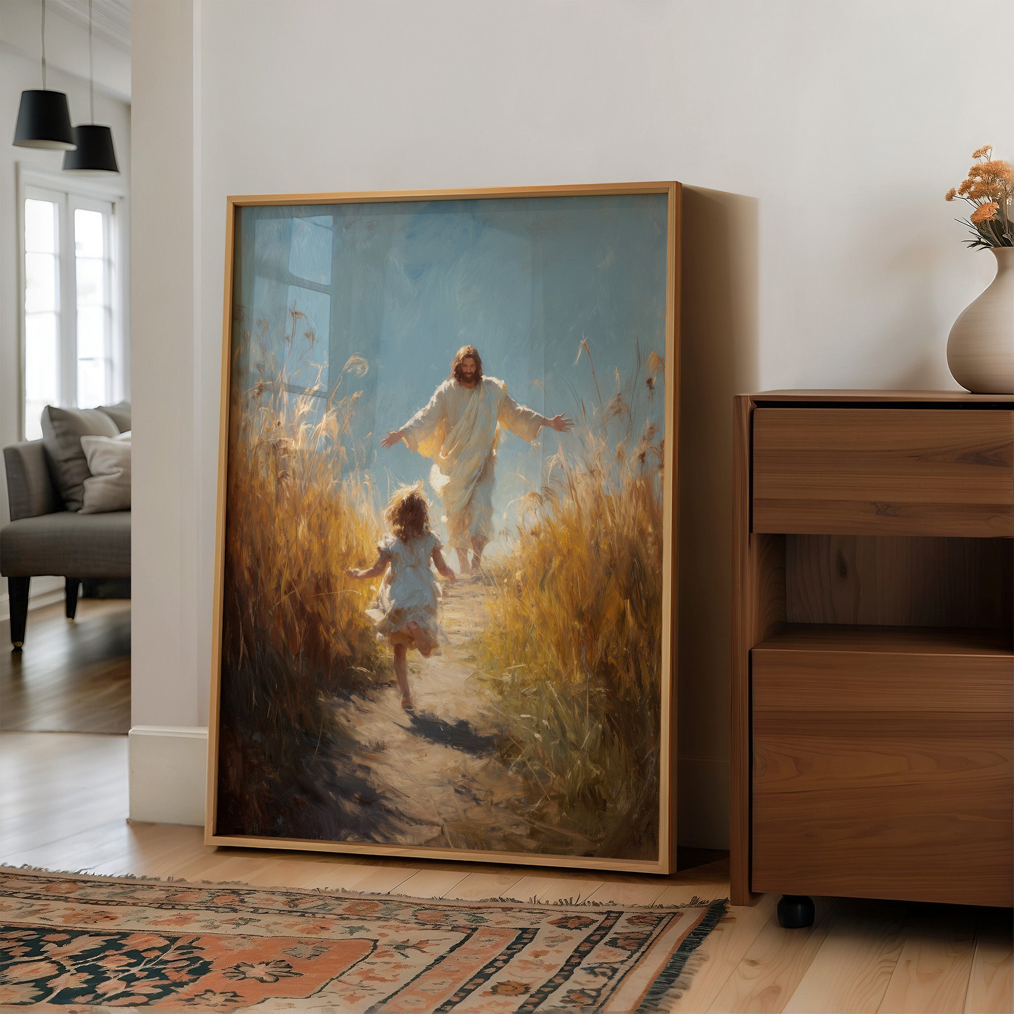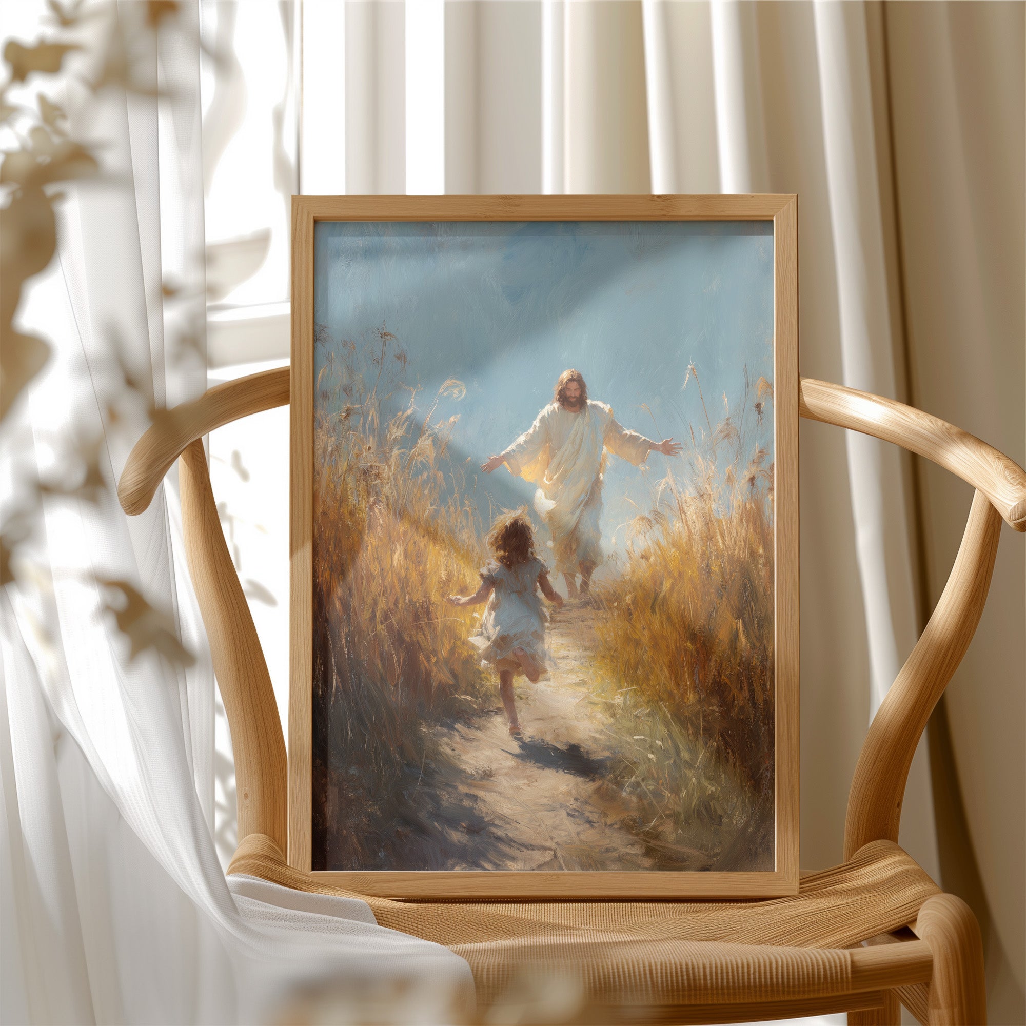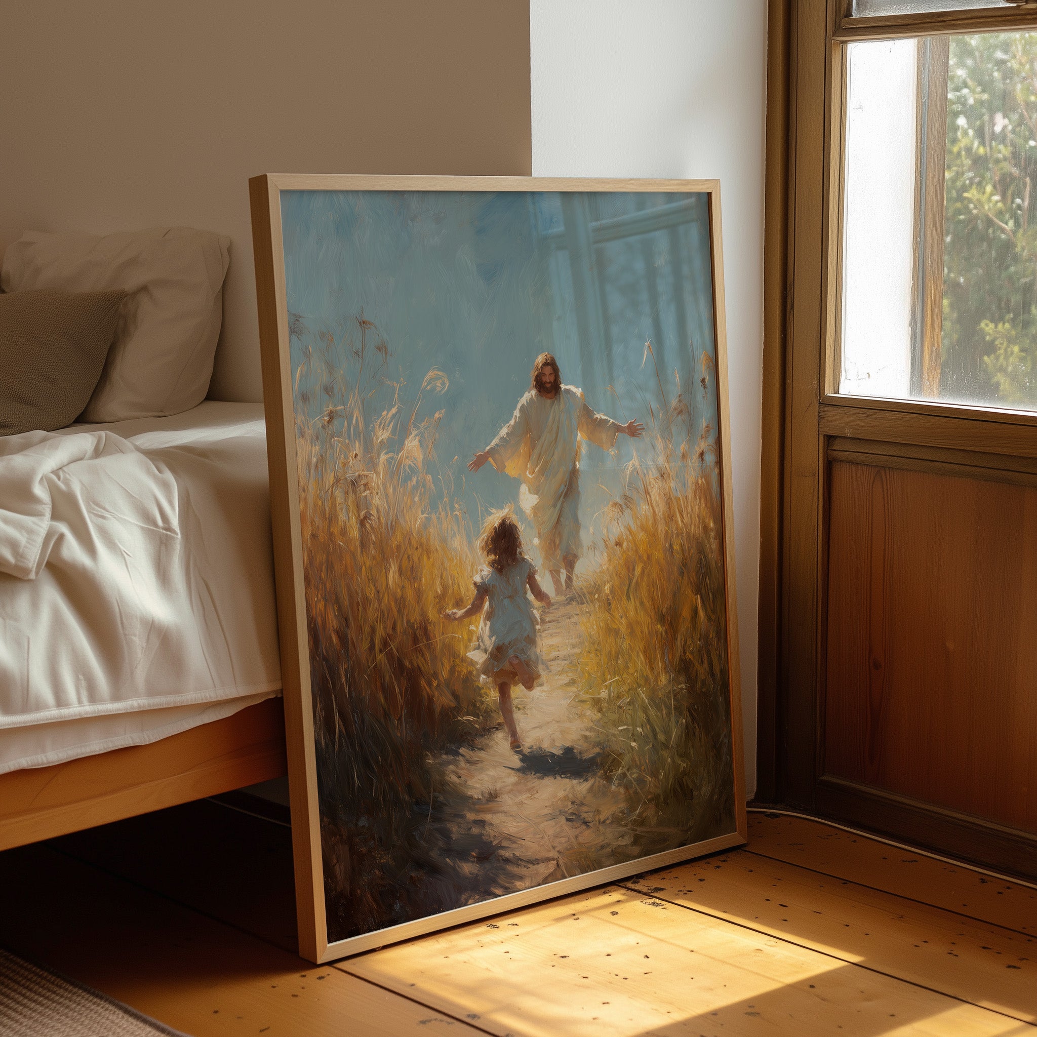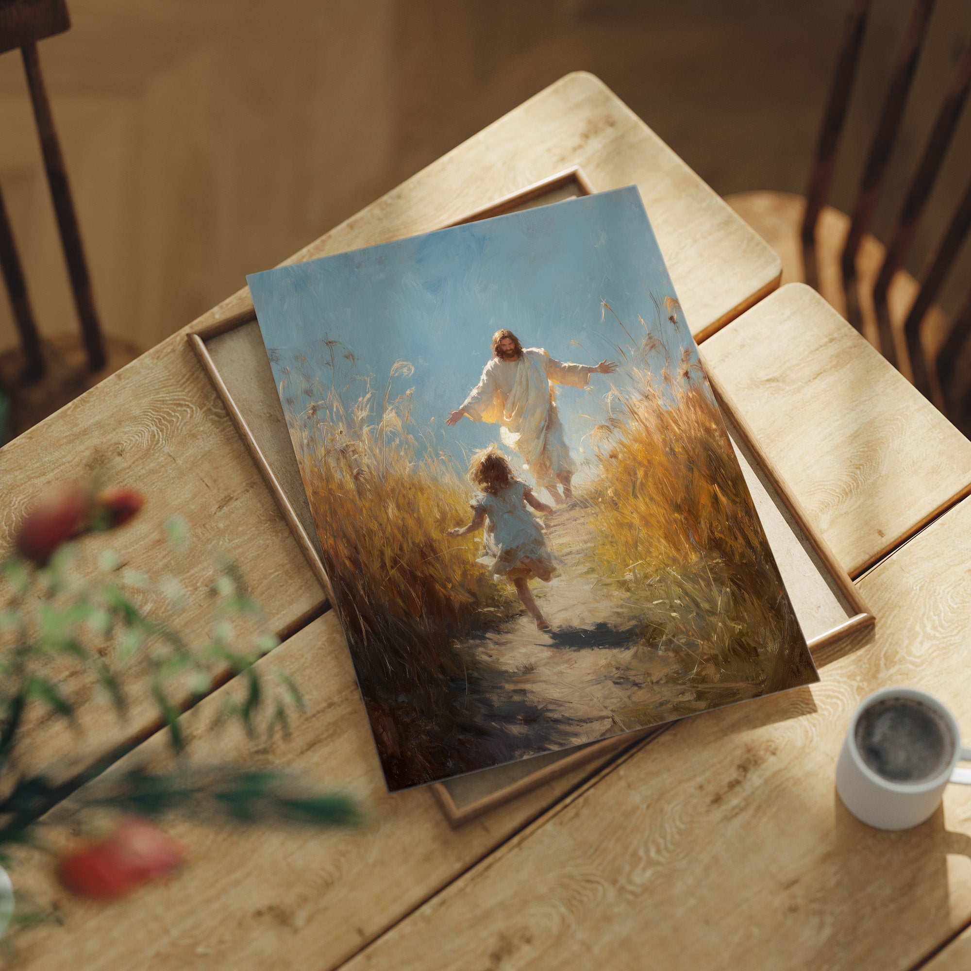 Morning light bathes the wheat field in gold as a child runs toward welcoming arms. The painting captures that perfect moment of trust and joy, where azure skies meet amber grasses and create a pathway of light and shadow. Each brushstroke conveys movementthe gentle sway of tall grass, the flutter of white garments, the eager motion of small feet on a well-worn trail. This piece brings serenity and hope to any space, perfect for a quiet reading nook or family room where it can inspire daily moments of connection.
