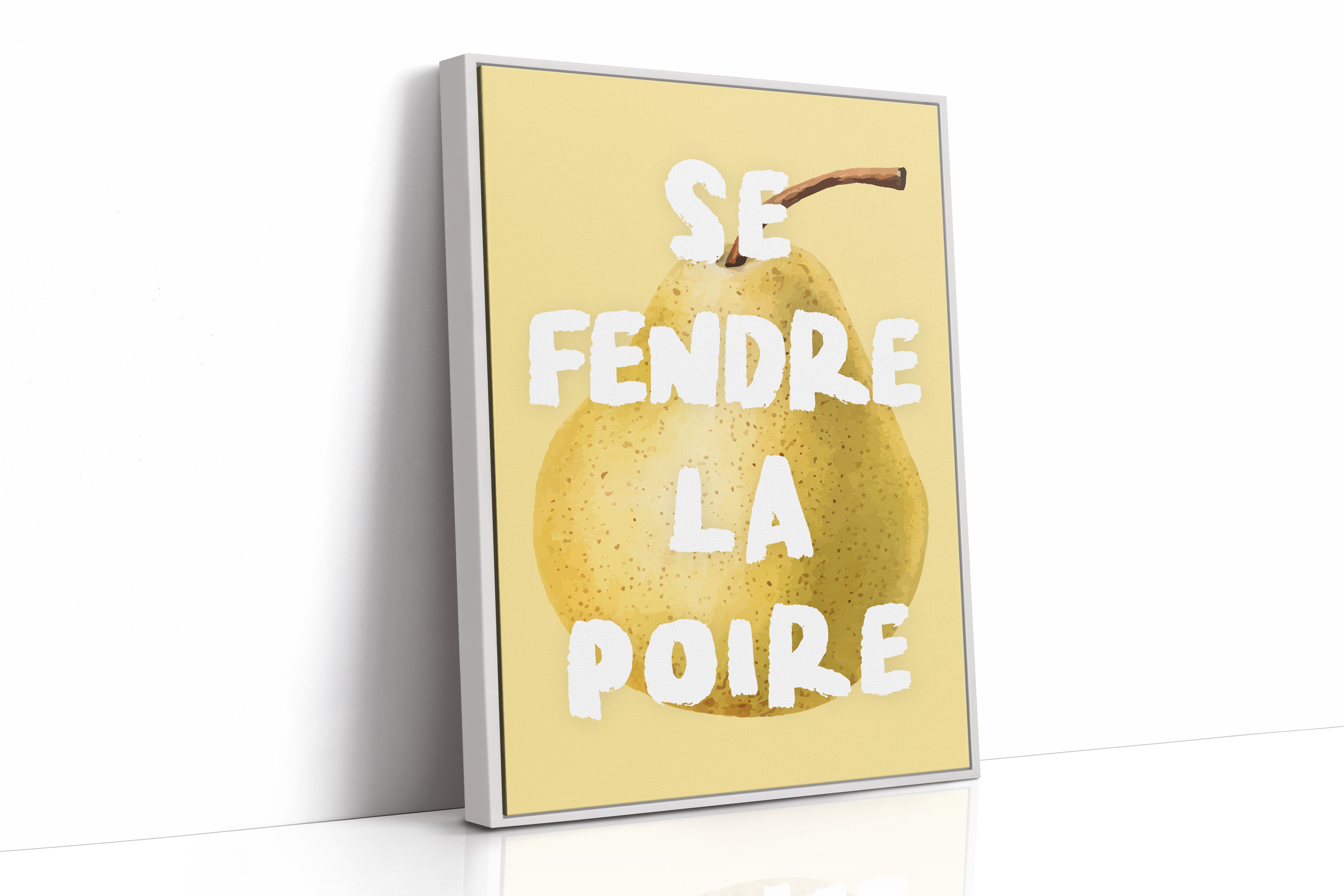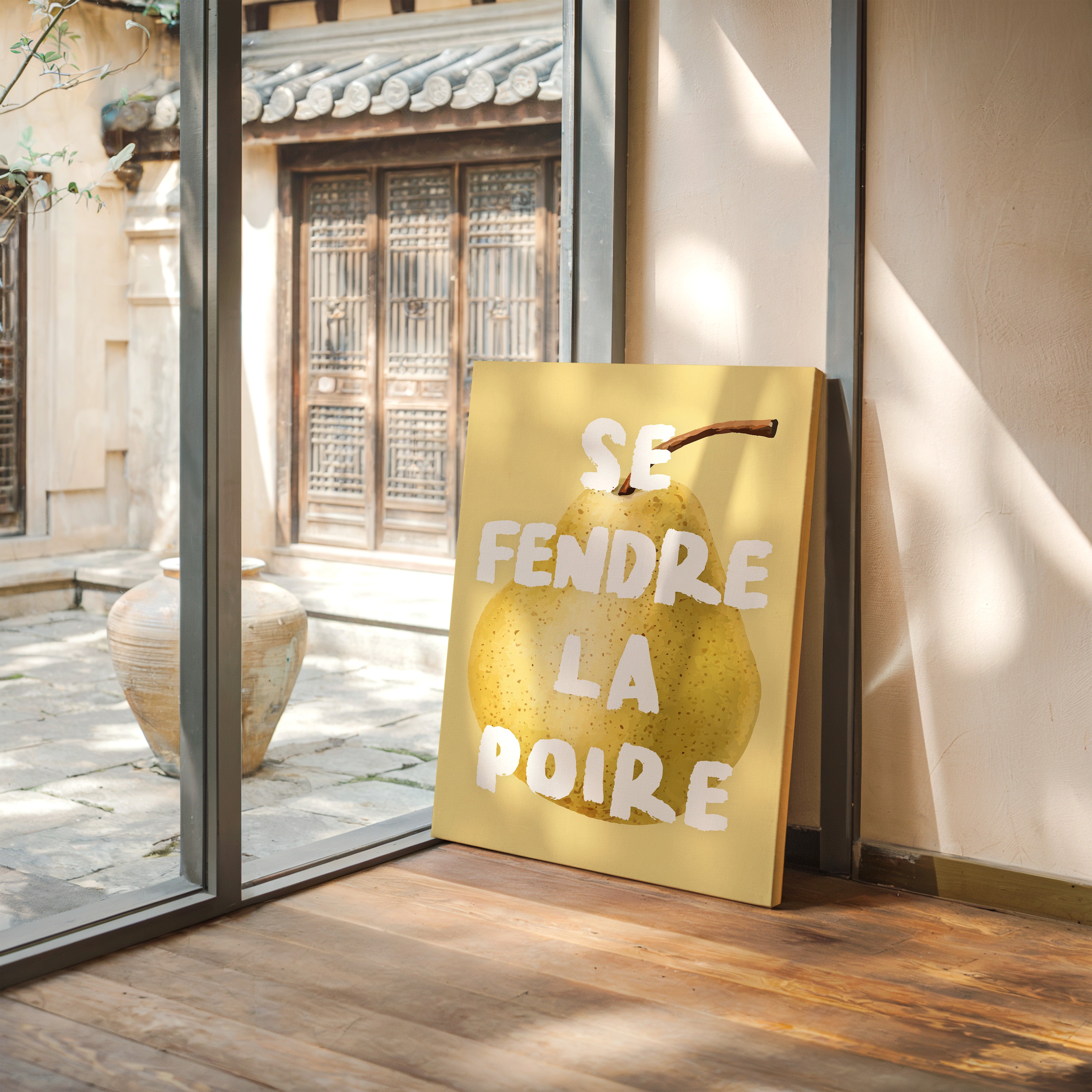 A sun-ripened pear basks in warm yellow light, its speckled skin telling stories of summer orchards and French countryside charm. This contemporary typographic piece merges culinary art with modern design sensibility. The bold white letters dance across the golden fruit's surface, creating a playful contrast while celebrating the simple beauty of fresh produce and Parisian market culture. The composition balances whimsy with sophistication, transforming a humble pear into a statement of joie de vivre. Perfect for adding a touch of culinary charm to a modern kitchen, dining room, or cafe-inspired space. Each viewing brings a fresh appreciation for the artful intersection of food, language, and design.