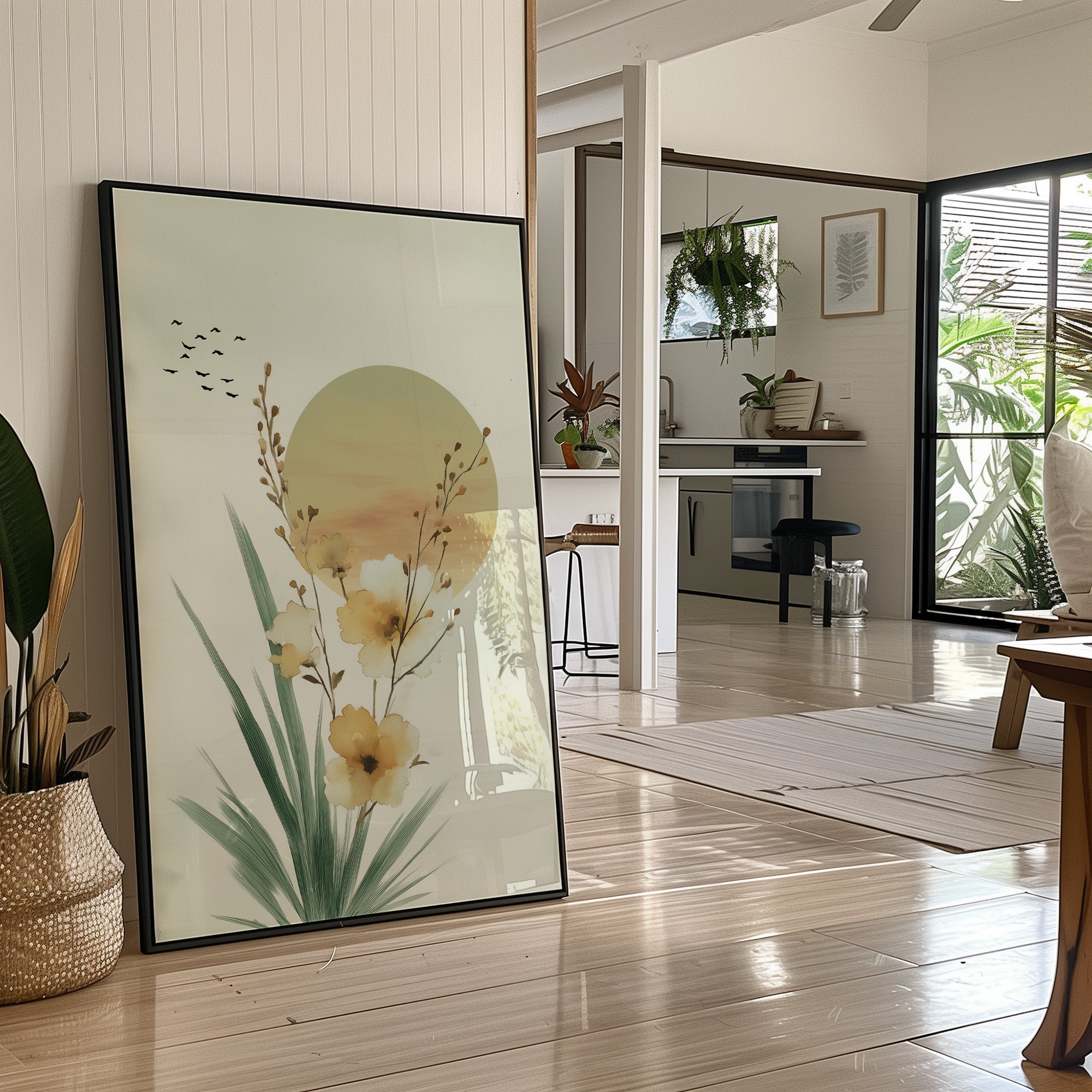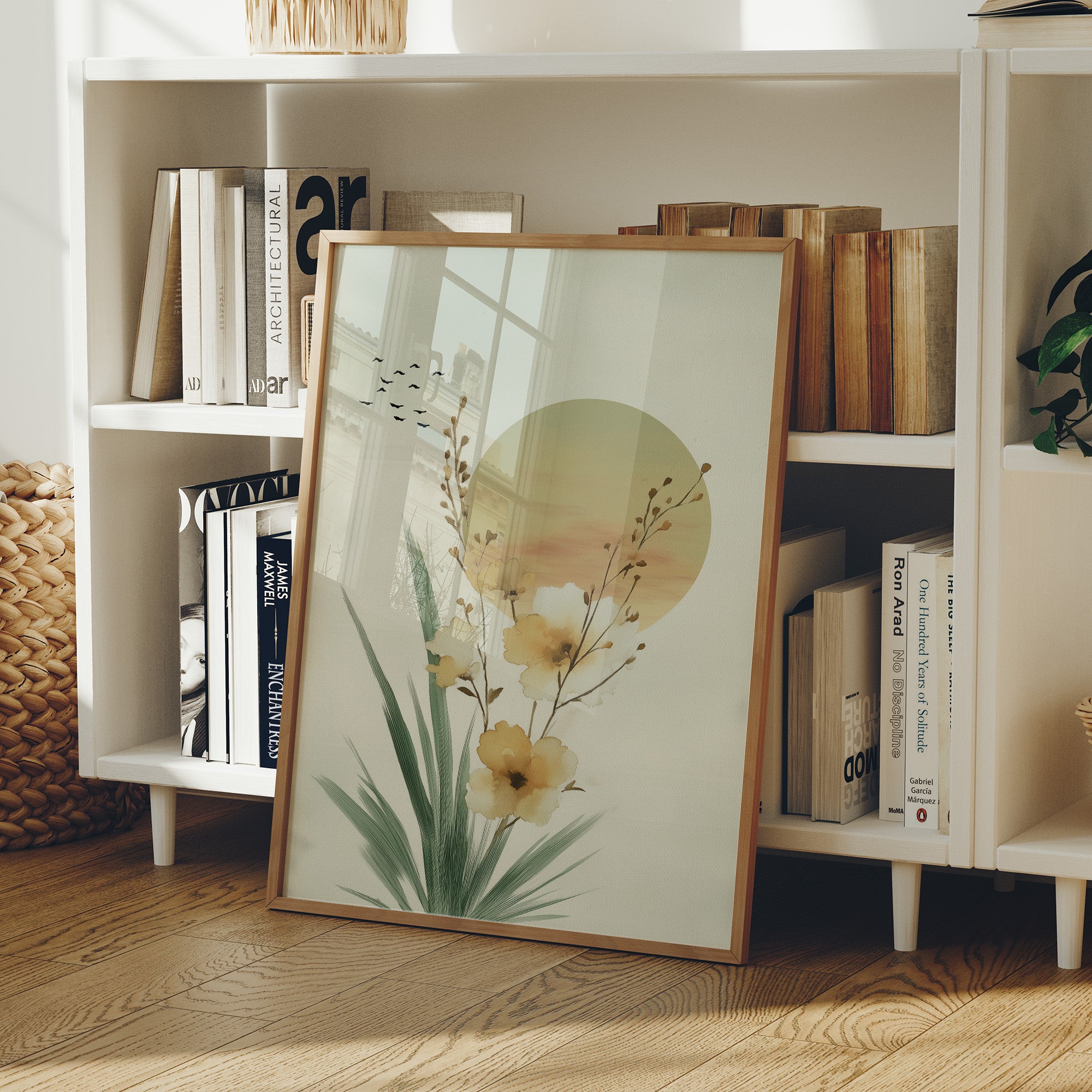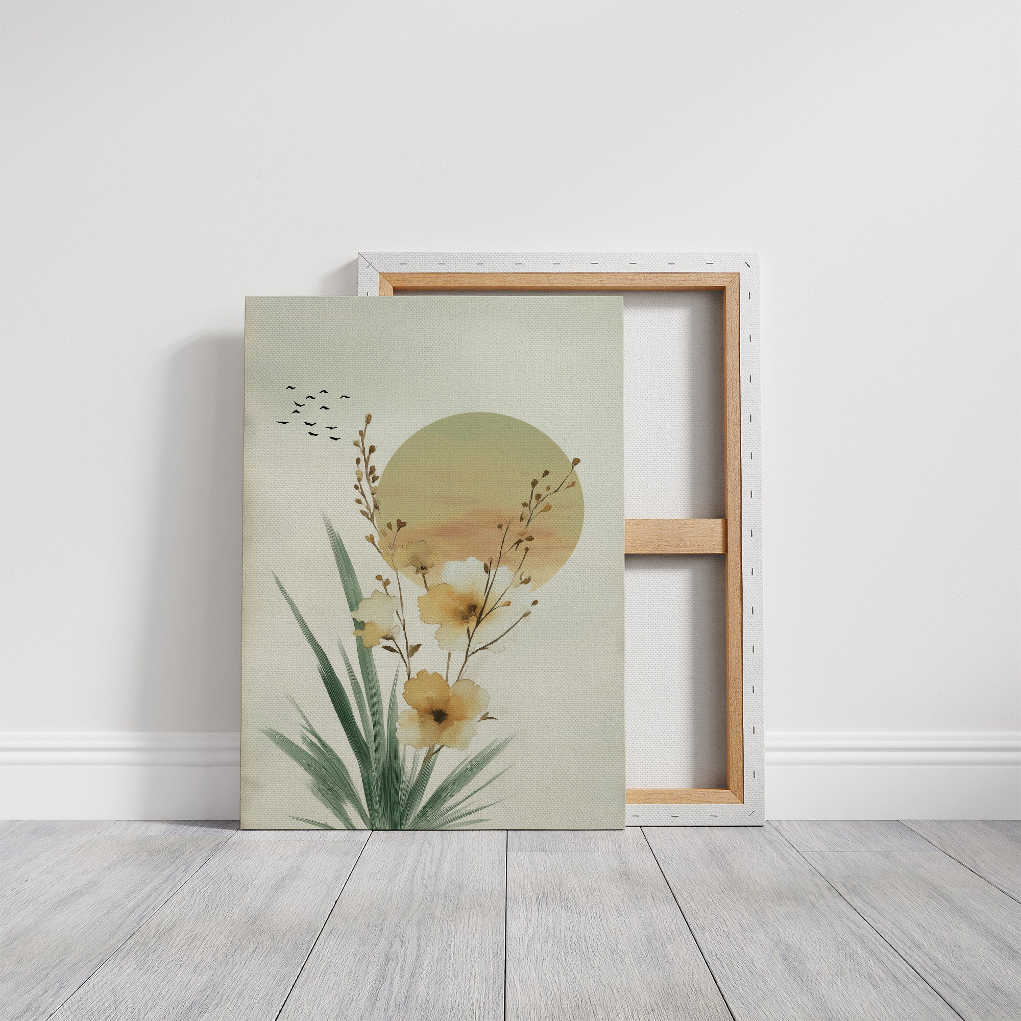 Soft yellow blooms reach toward a gentle sunrise, their delicate forms dancing against a misty backdrop. The watercolor strokes create an ethereal scene where emerald leaves and ochre petals harmonize beneath a luminous orb, while distant birds drift through the peaceful composition. This minimalist botanical study captures the quiet poetry of daybreak, where nature's simplest elements become profound statements of beauty. Perfect for bringing serenity to a reading nook, meditation space, or anywhere you seek to create a moment of calm contemplation.