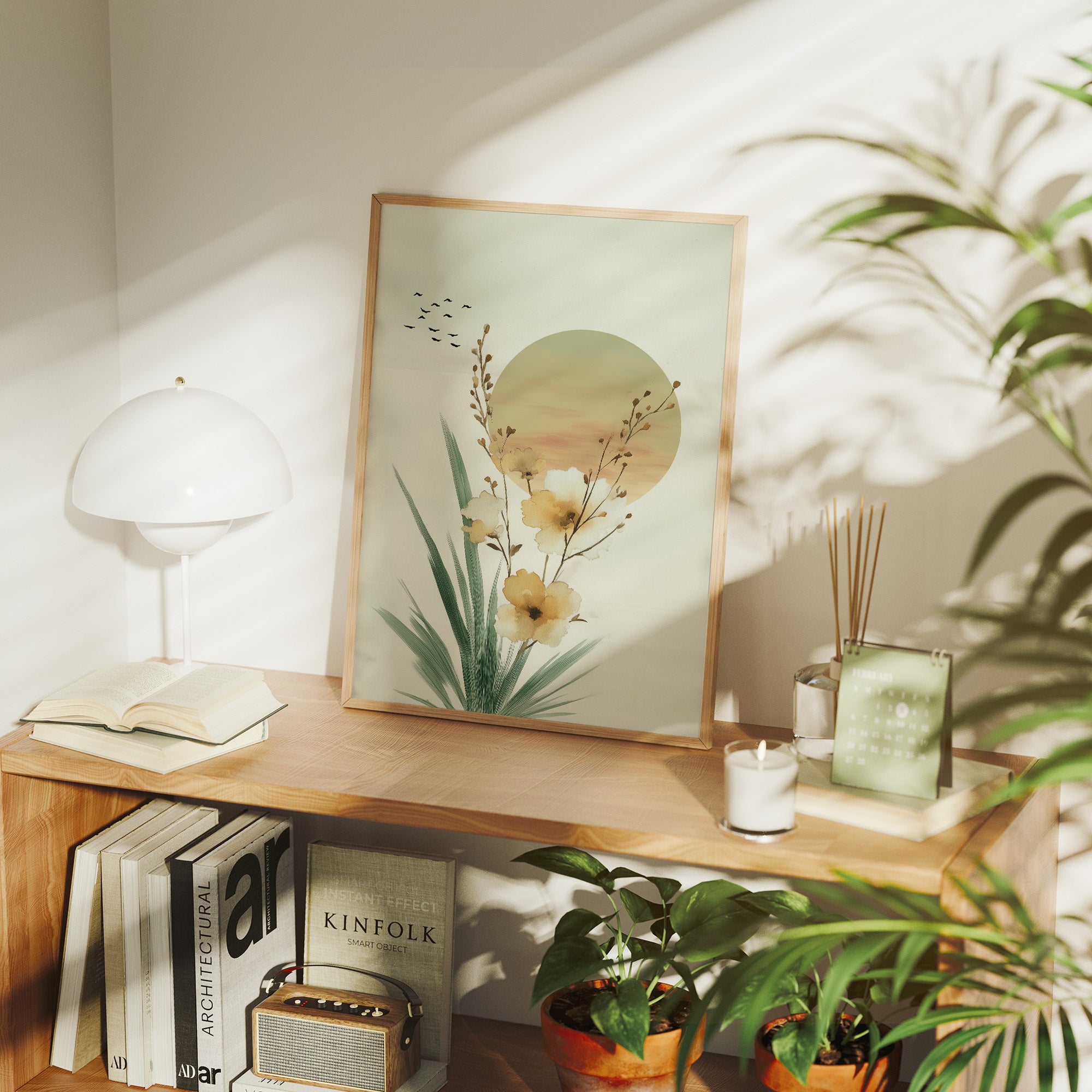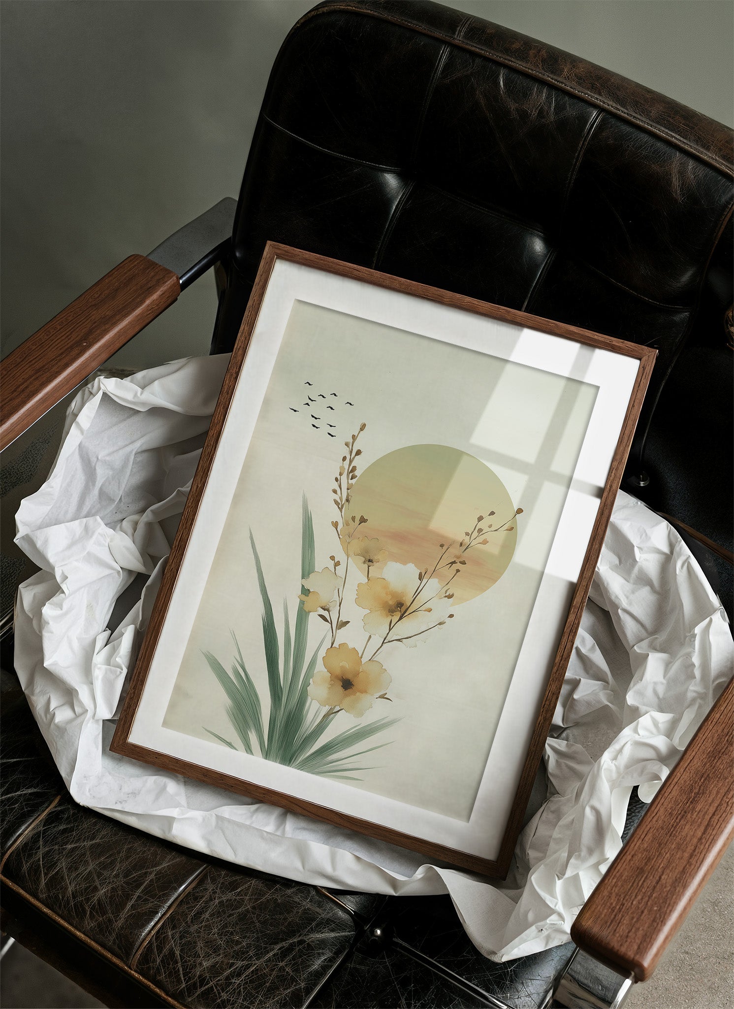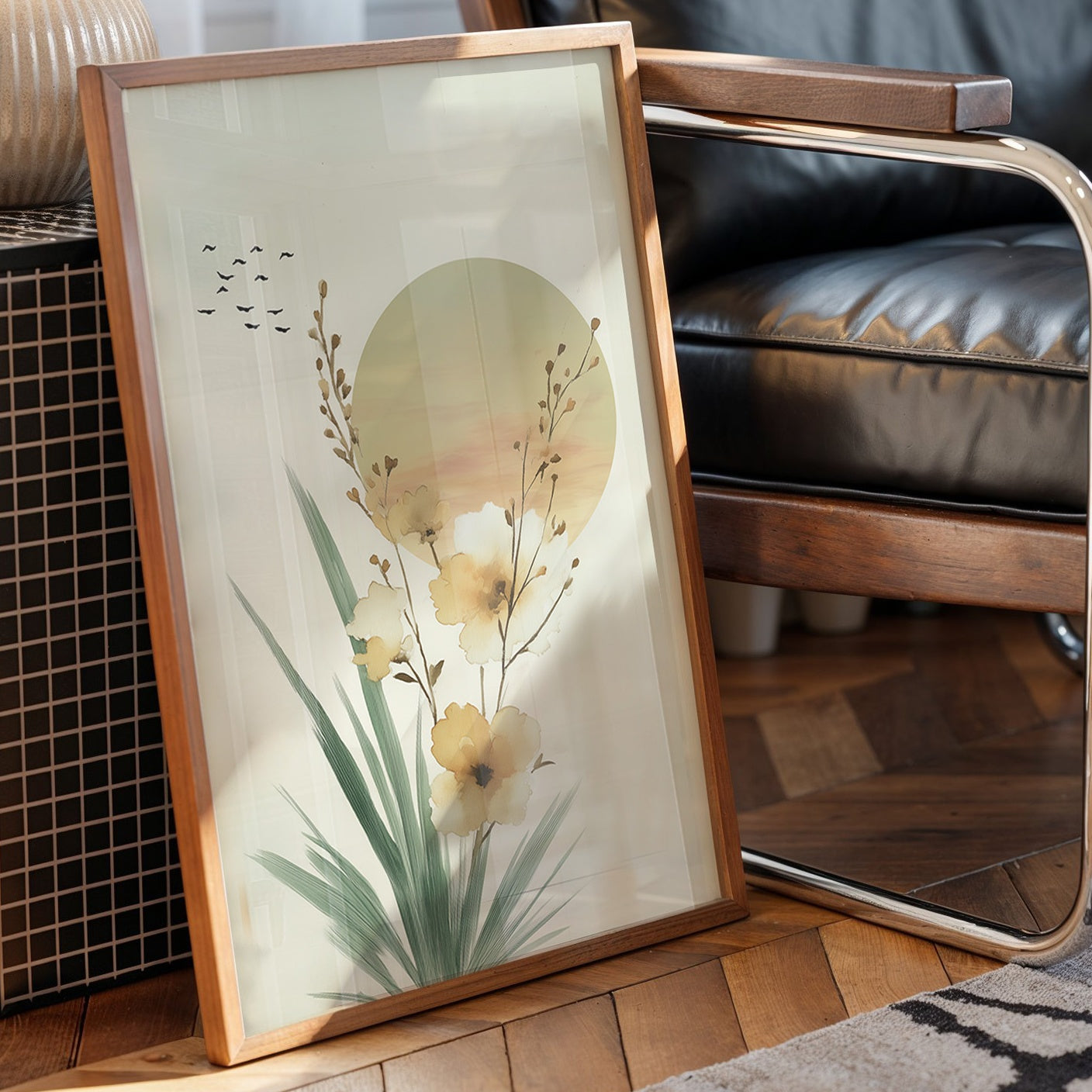 Soft yellow blooms reach toward a gentle sunrise, their delicate forms dancing against a misty backdrop. The watercolor strokes create an ethereal scene where emerald leaves and ochre petals harmonize beneath a luminous orb, while distant birds drift through the peaceful composition. This minimalist botanical study captures the quiet poetry of daybreak, where nature's simplest elements become profound statements of beauty. Perfect for bringing serenity to a reading nook, meditation space, or anywhere you seek to create a moment of calm contemplation.