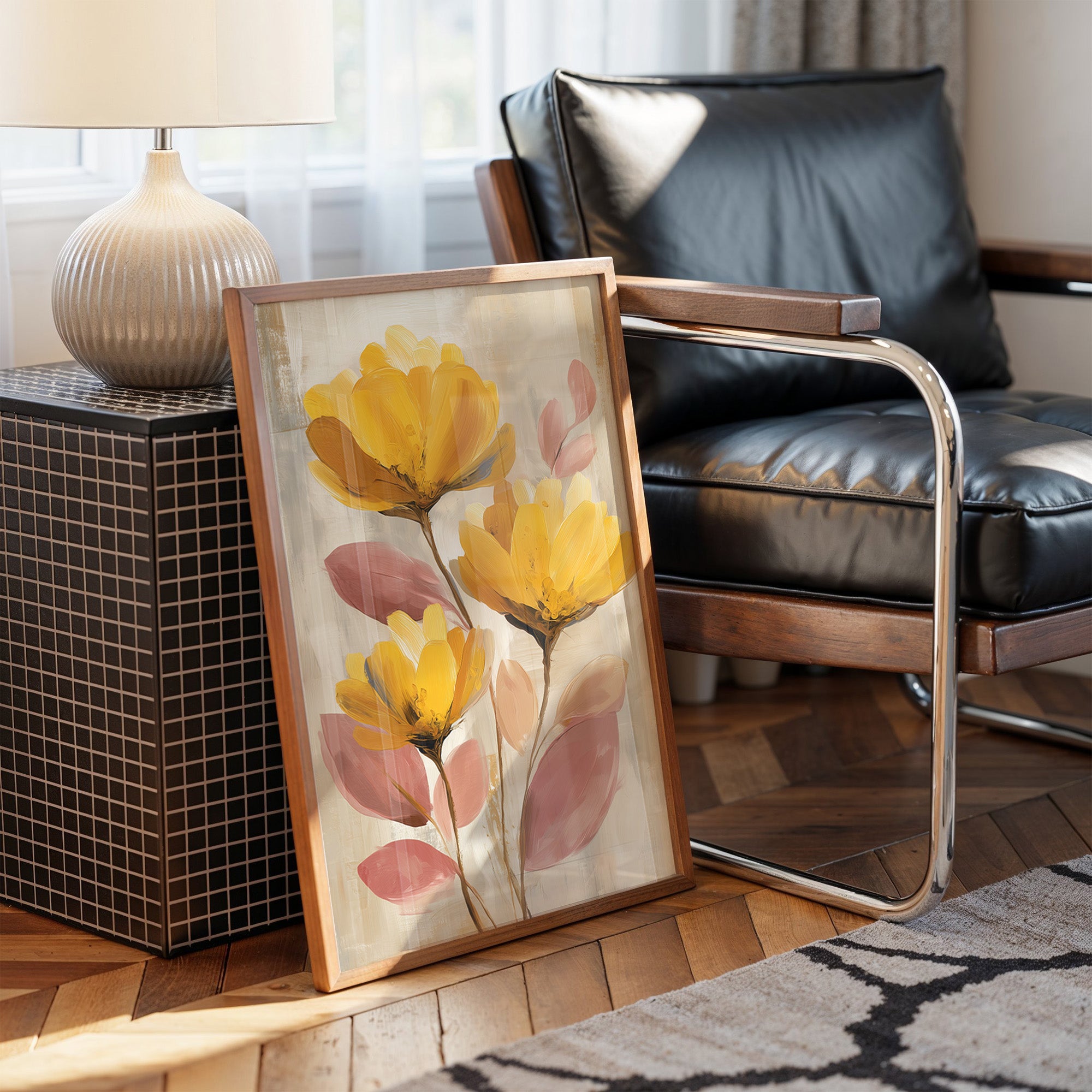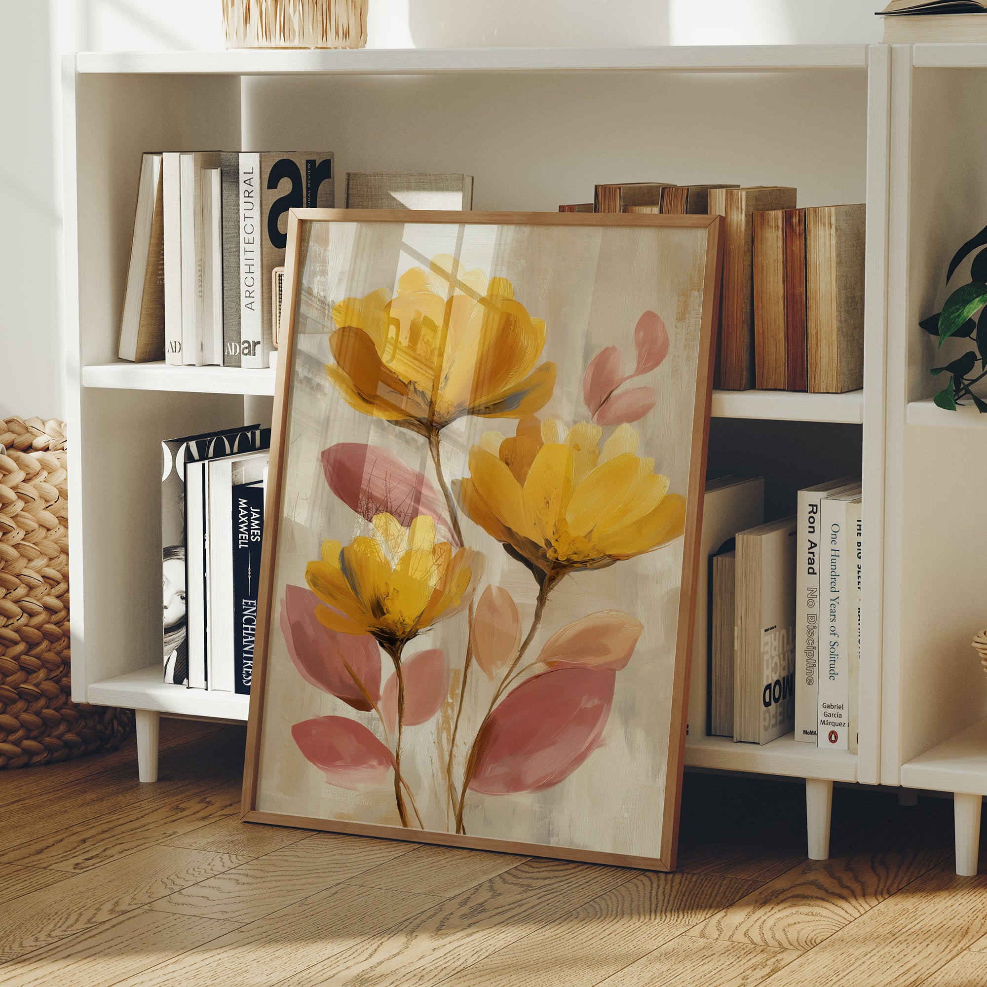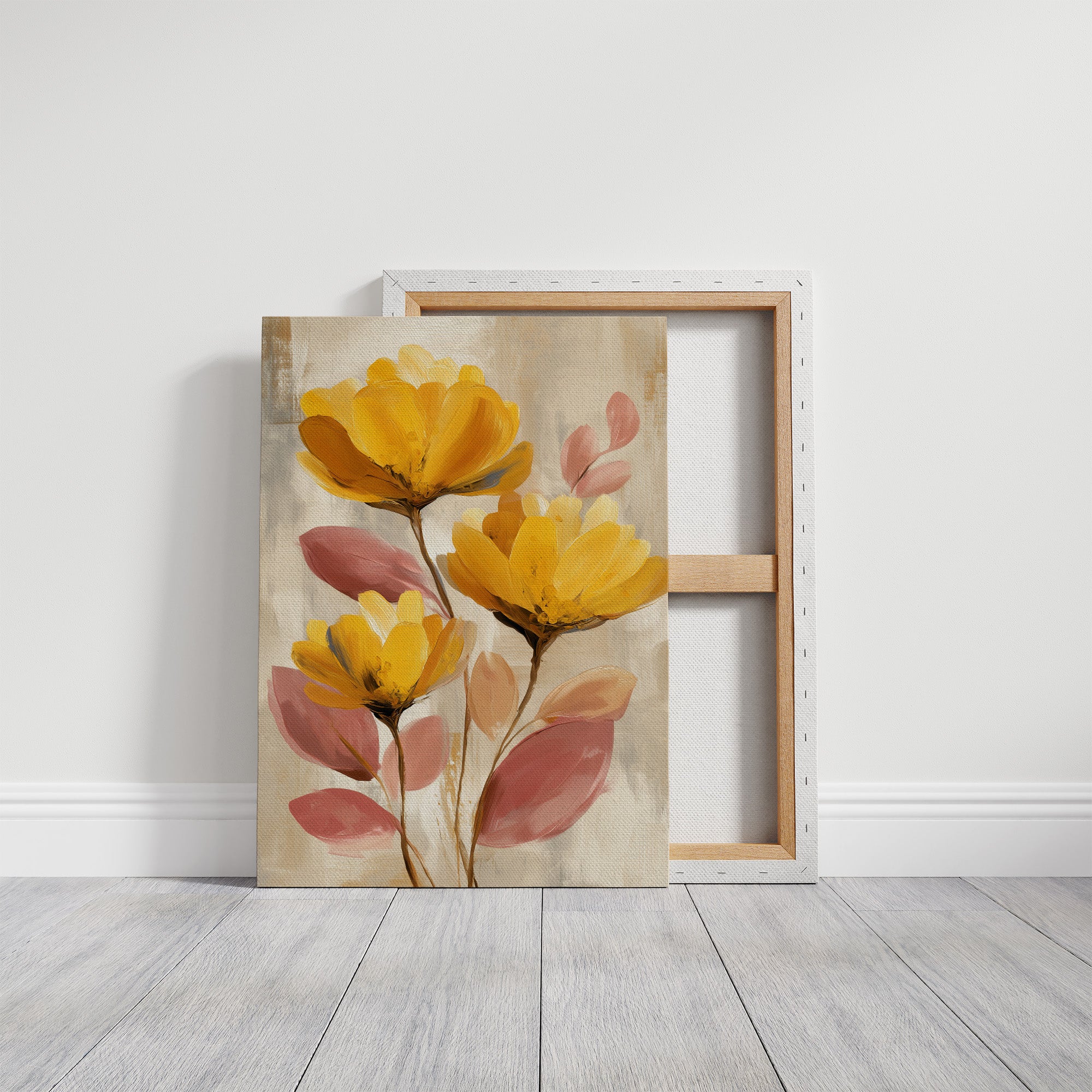 Sunlight streams across a serene corner, where vibrant yellow blooms stretch gracefully against a neutral backdrop. The watercolor-style flowers burst with warmth, their golden petals complemented by soft coral leaves in a delicate dance of color and form. The composition creates a harmonious balance between bold and subtle elements, with each flower capturing the essence of natural beauty in full bloom. This piece would elevate any reading nook or home office, bringing a touch of springtime serenity to your daily moments.