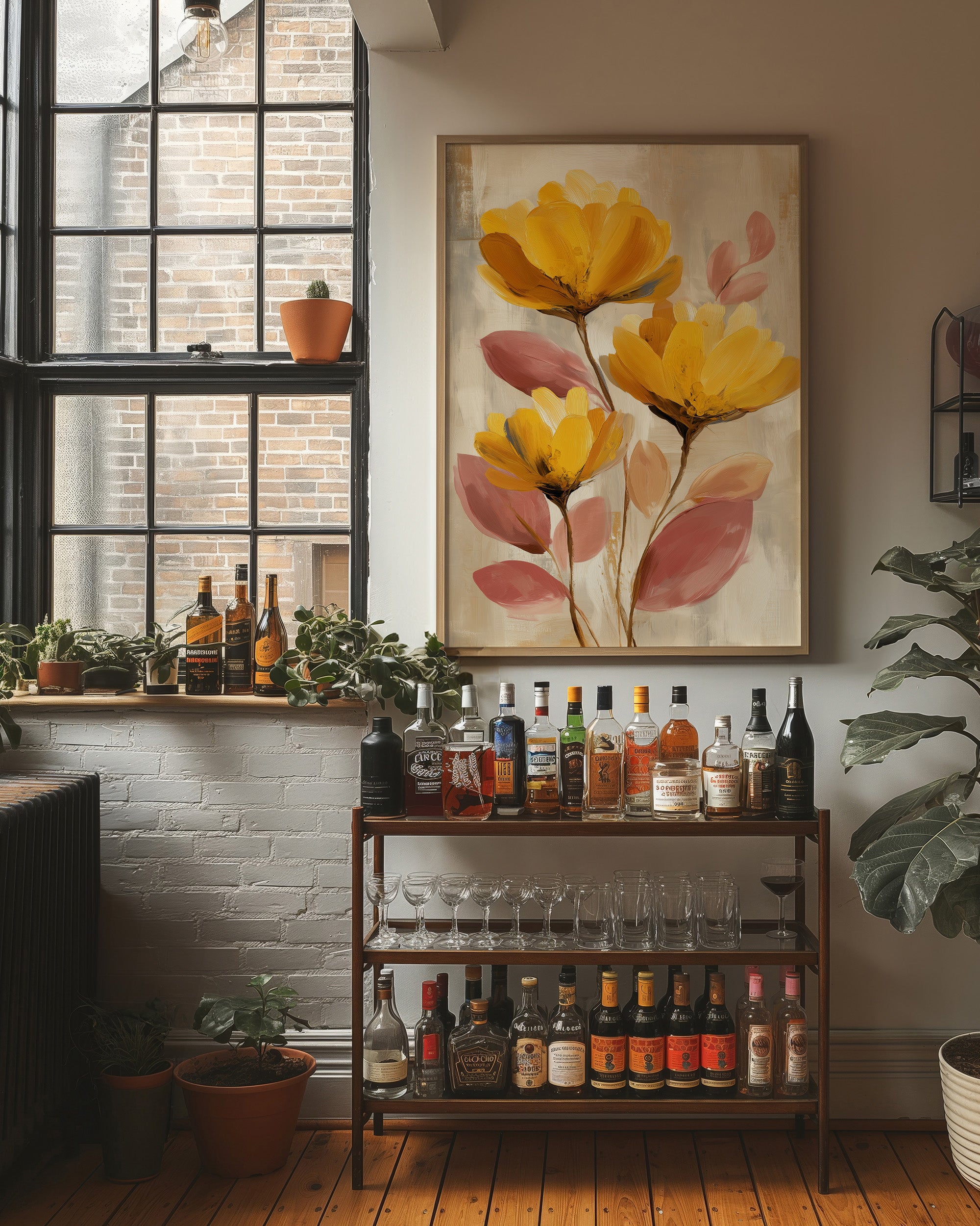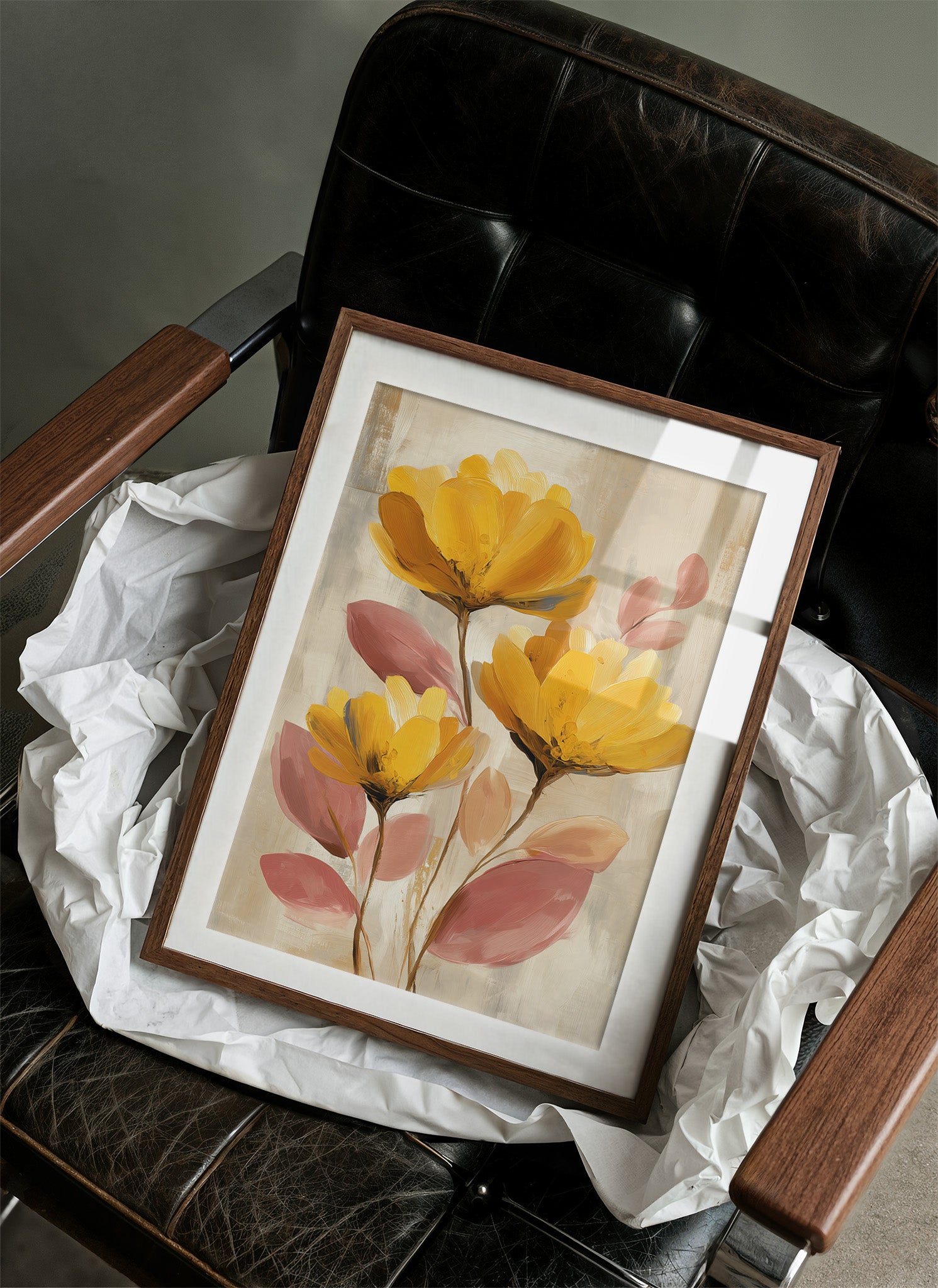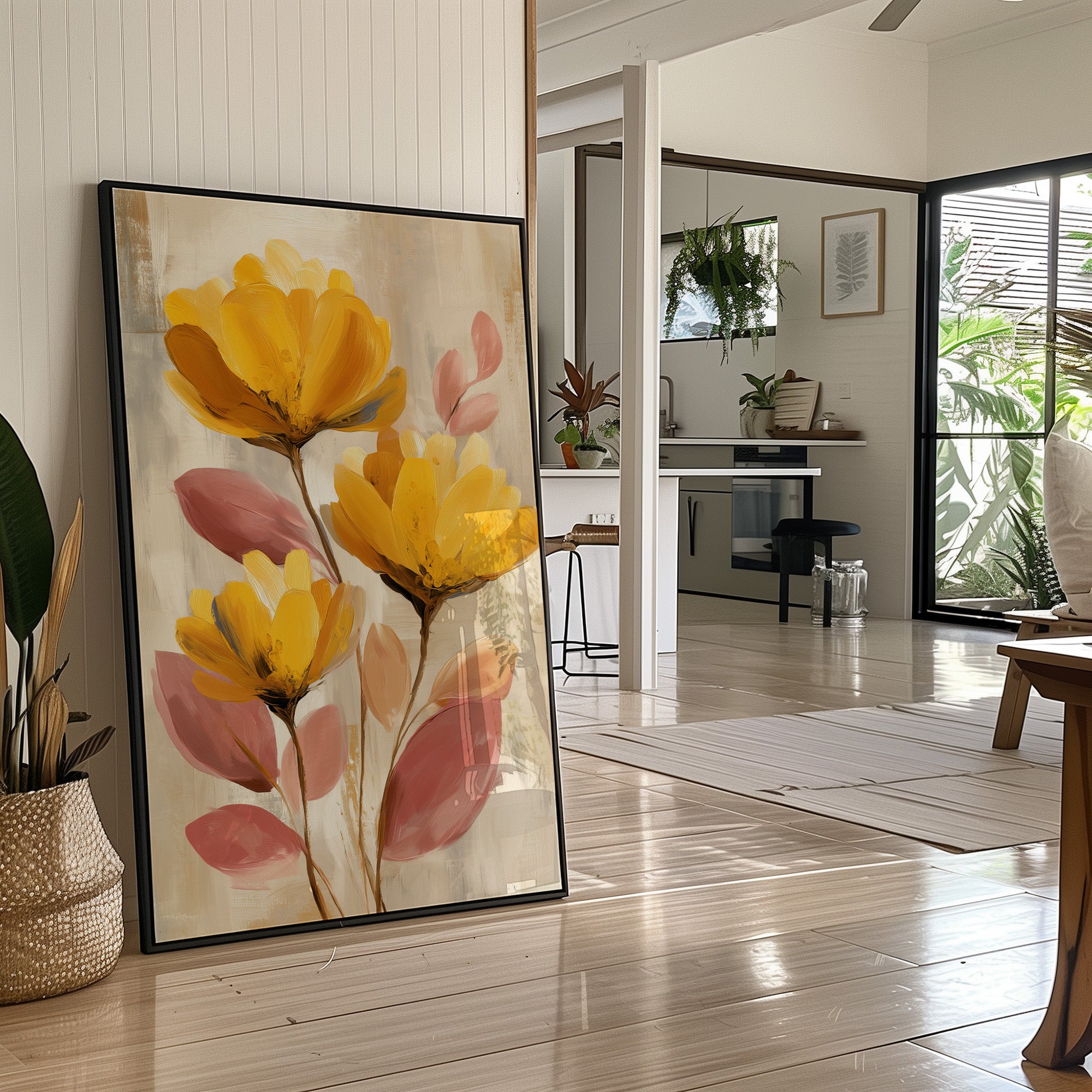Sunlight streams across a serene corner, where vibrant yellow blooms stretch gracefully against a neutral backdrop. The watercolor-style flowers burst with warmth, their golden petals complemented by soft coral leaves in a delicate dance of color and form. The composition creates a harmonious balance between bold and subtle elements, with each flower capturing the essence of natural beauty in full bloom. This piece would elevate any reading nook or home office, bringing a touch of springtime serenity to your daily moments.