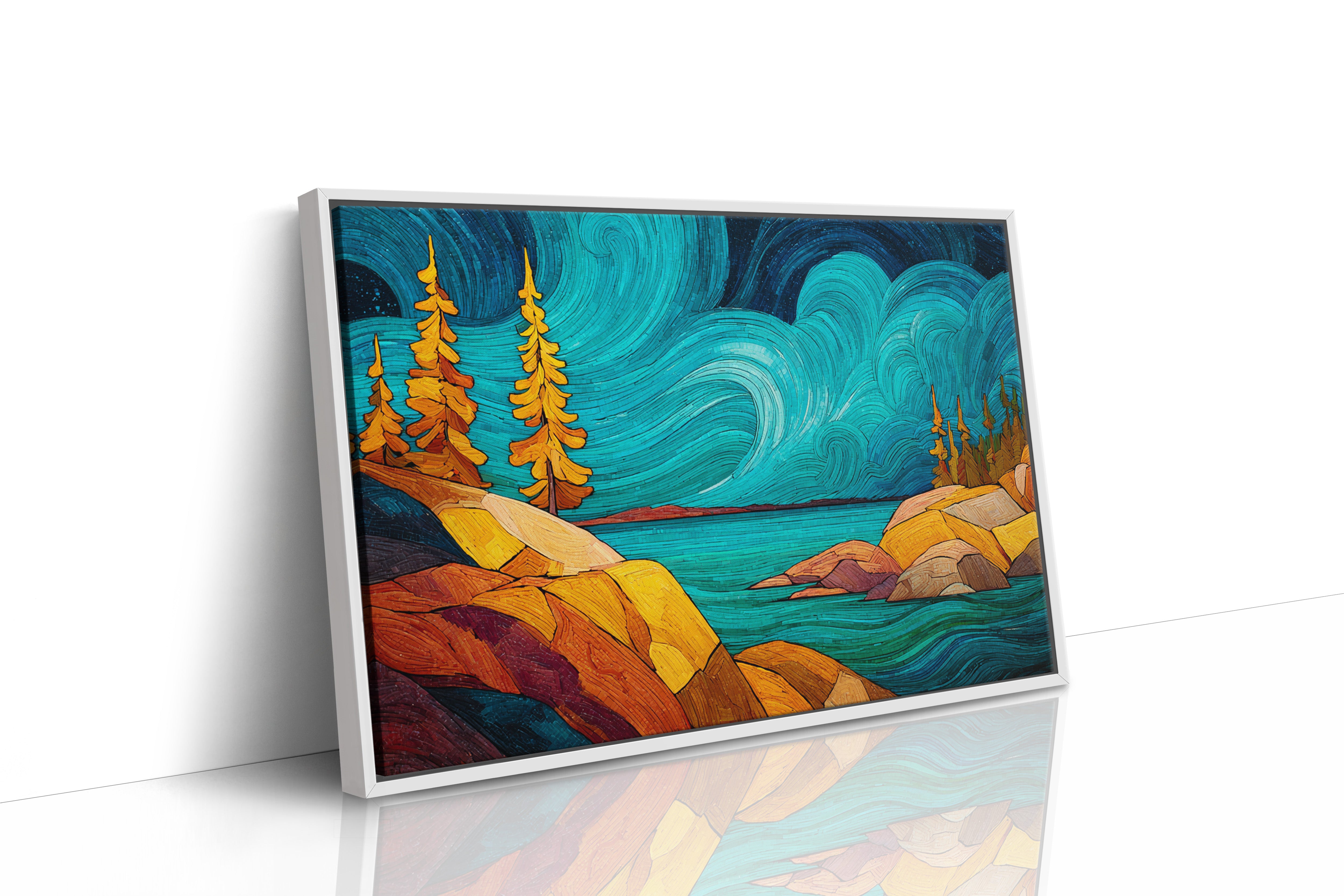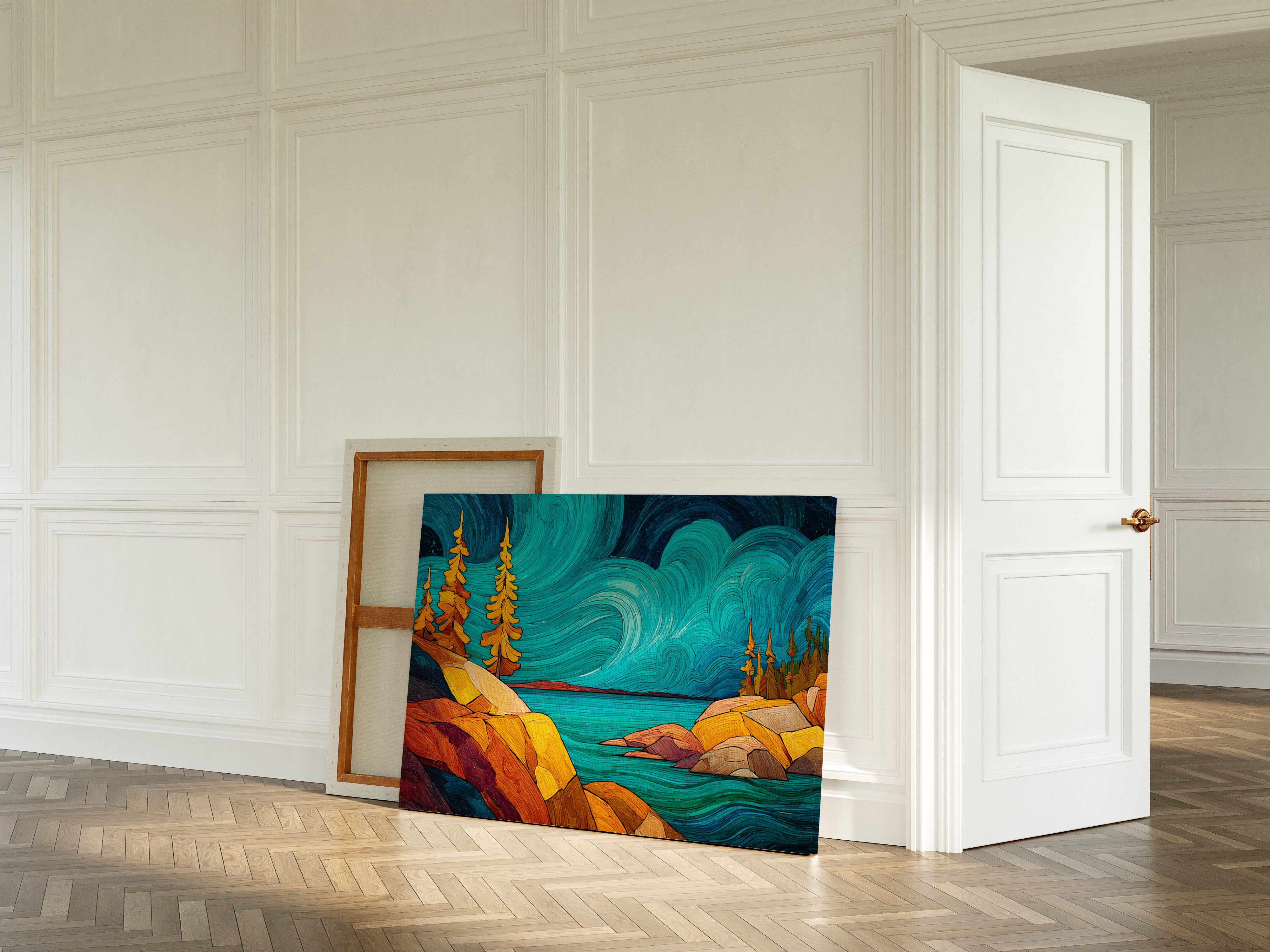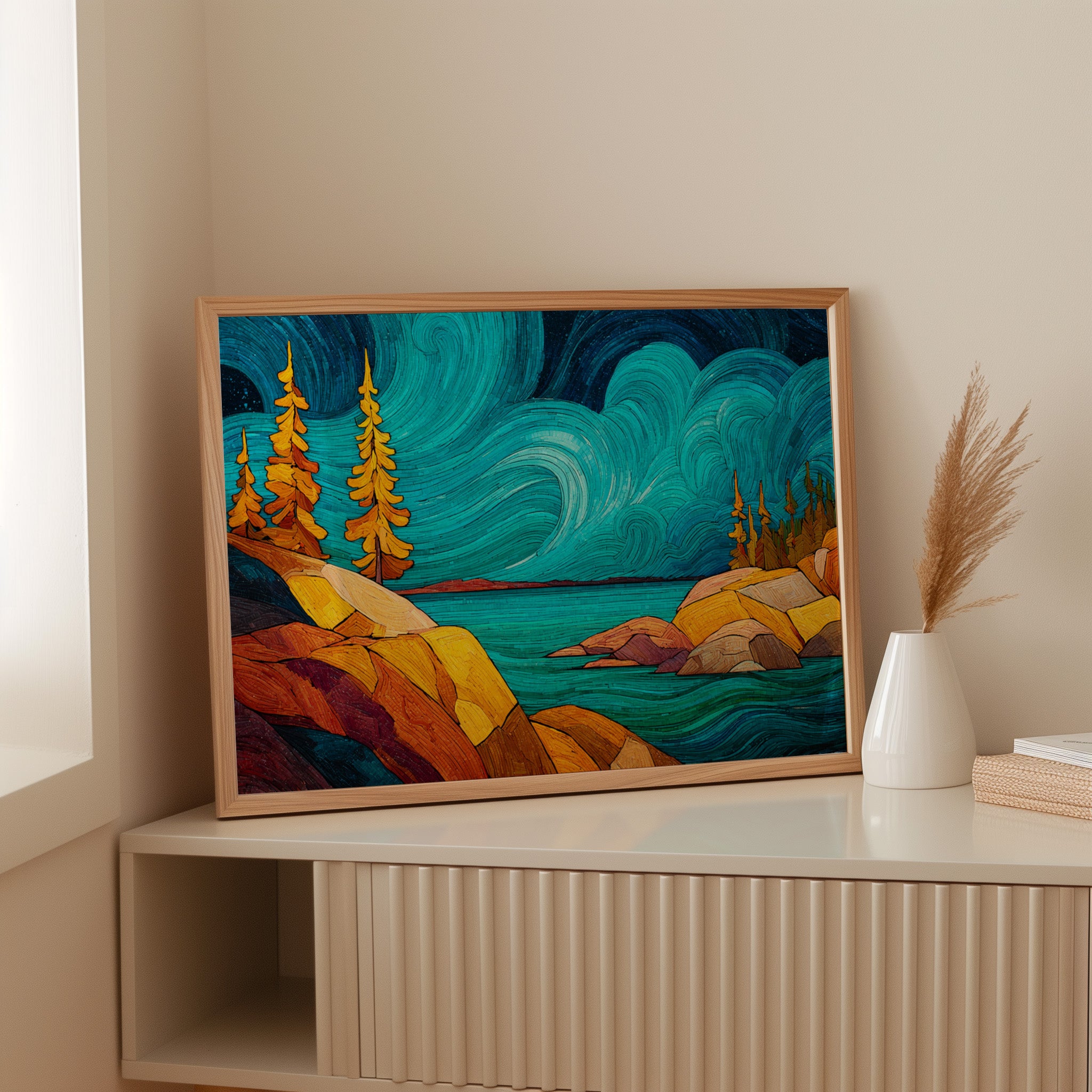 Waves of ethereal turquoise energy sweep across the night sky, creating a mesmerizing dance of color and movement. Golden pines stand sentinel on rocky outcrops, their warm amber hues contrasting brilliantly against the deep azure waters below. The scene captures a moment of perfect harmony between earth and sky, where textured brushstrokes create a mosaic-like quality that brings the landscape to life. The composition draws inspiration from the raw beauty of northern coastlines, where rugged shores meet mystical skies. This piece would create a stunning focal point in a modern cabin interior or add a touch of natural drama to a contemporary living space.