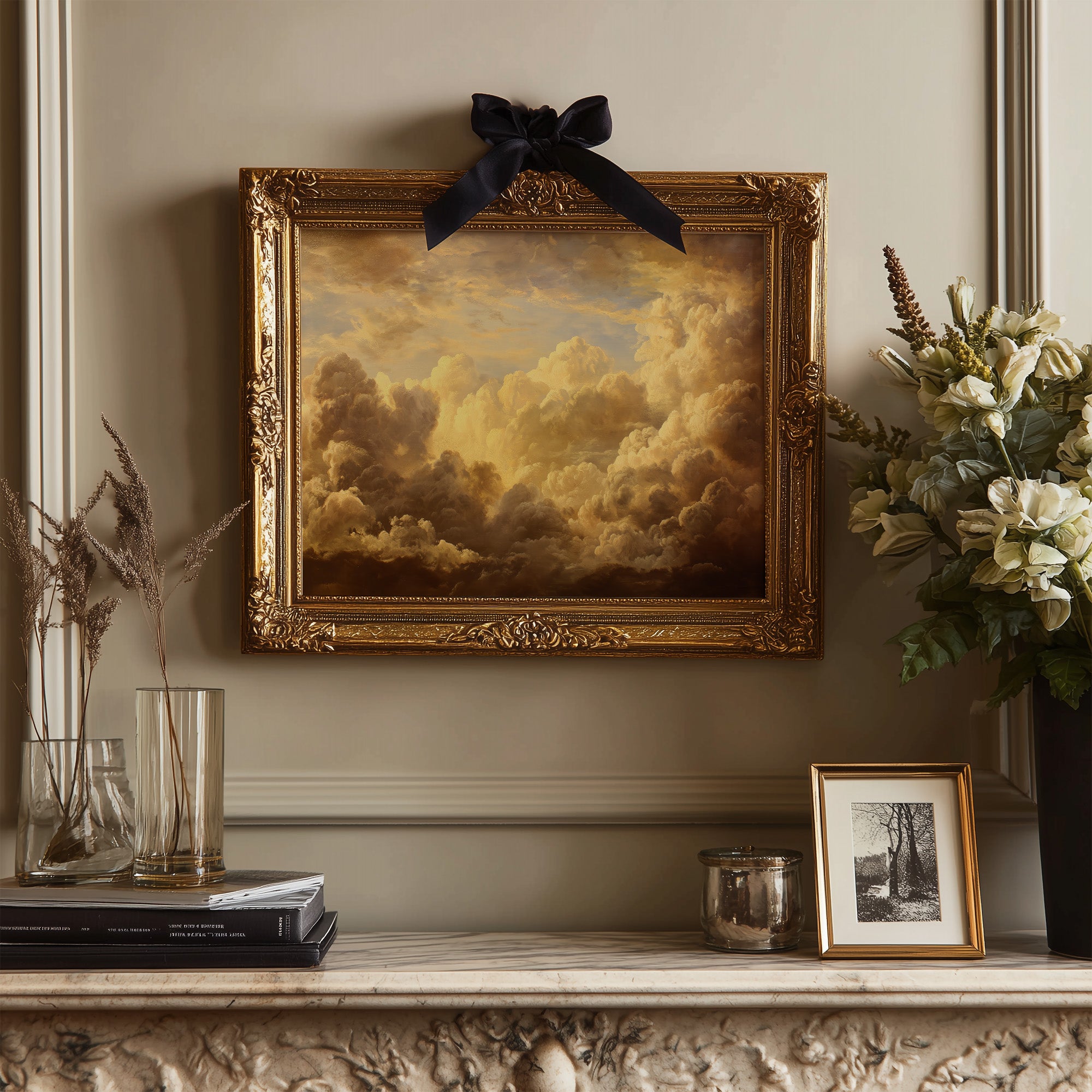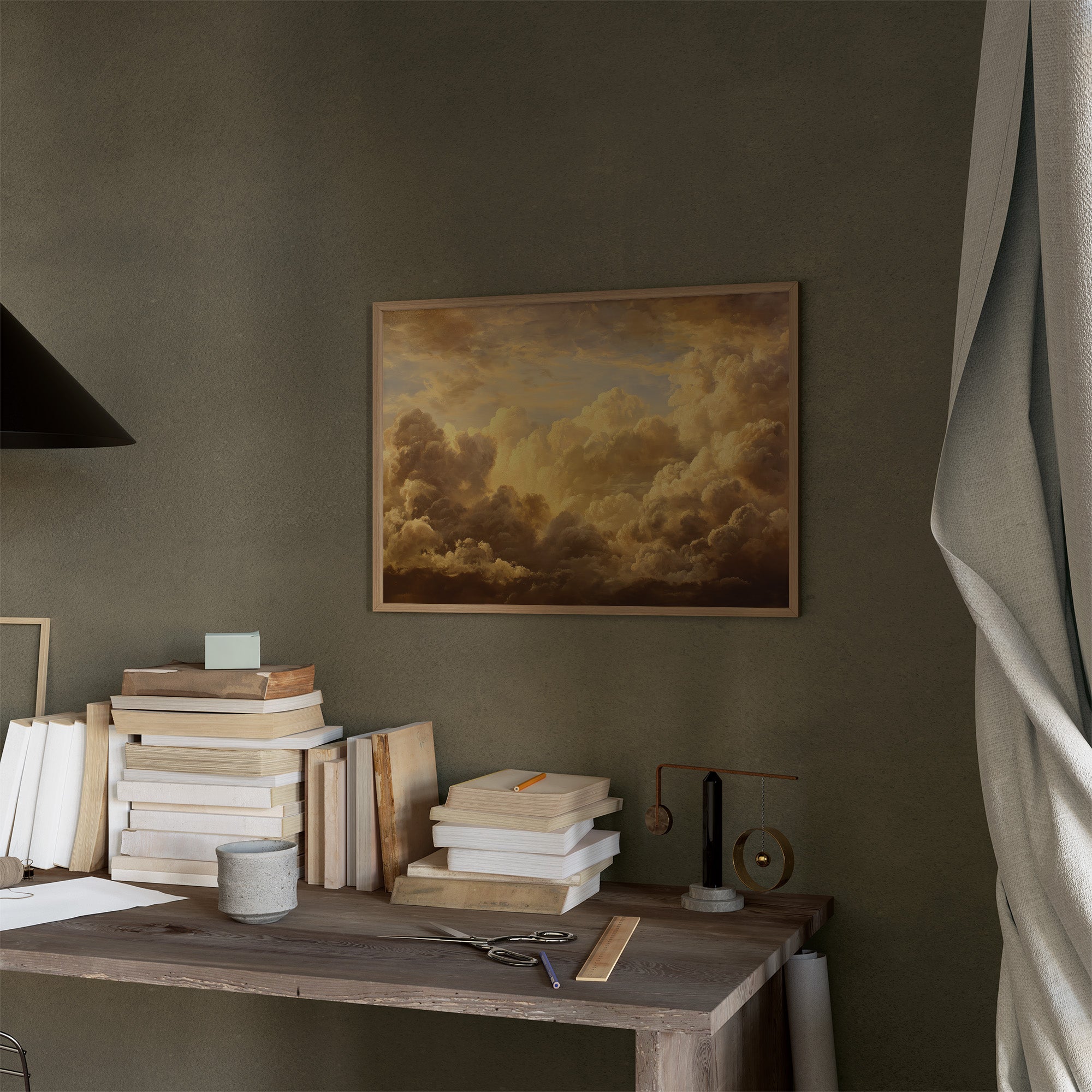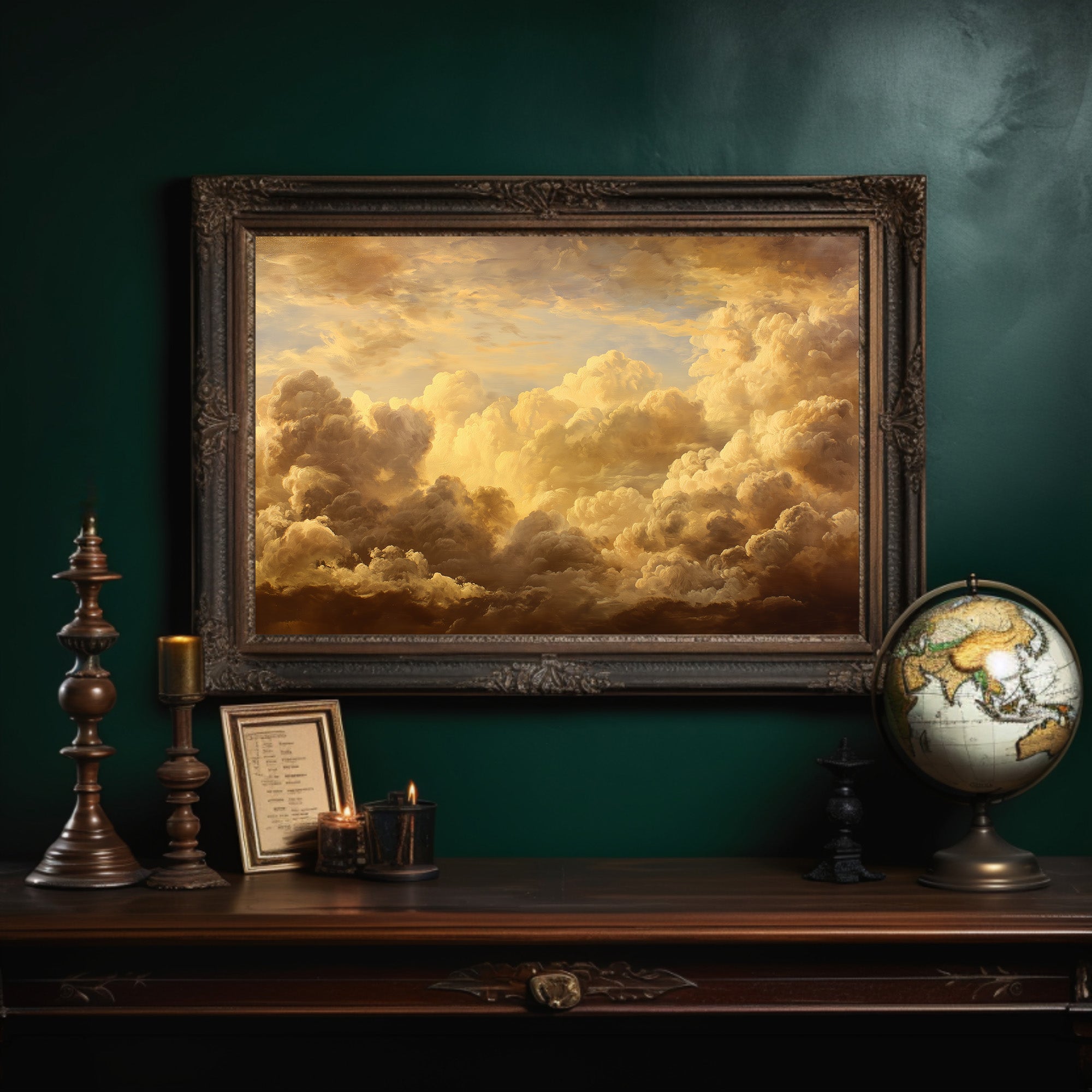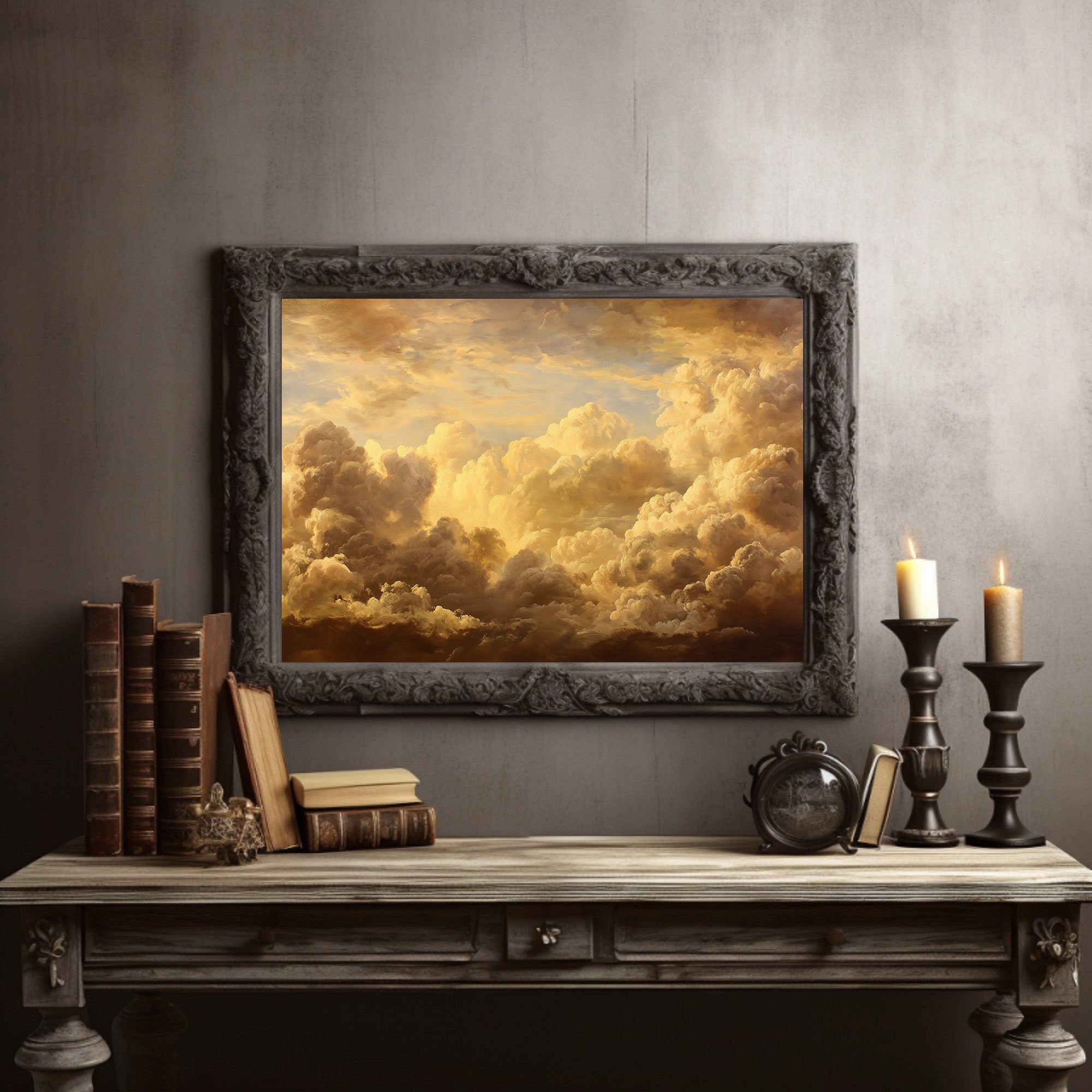 Sunlight filters through billowing clouds, captured in golden hues that seem to glow from within the ornate frame. The painting rests against a backdrop of countless books, their spines creating a patchwork of knowledge and stories waiting to be discovered. Rich amber tones dance across the canvas, creating a perfect harmony with the wooden shelves and the quiet presence of potted greenery beside it.