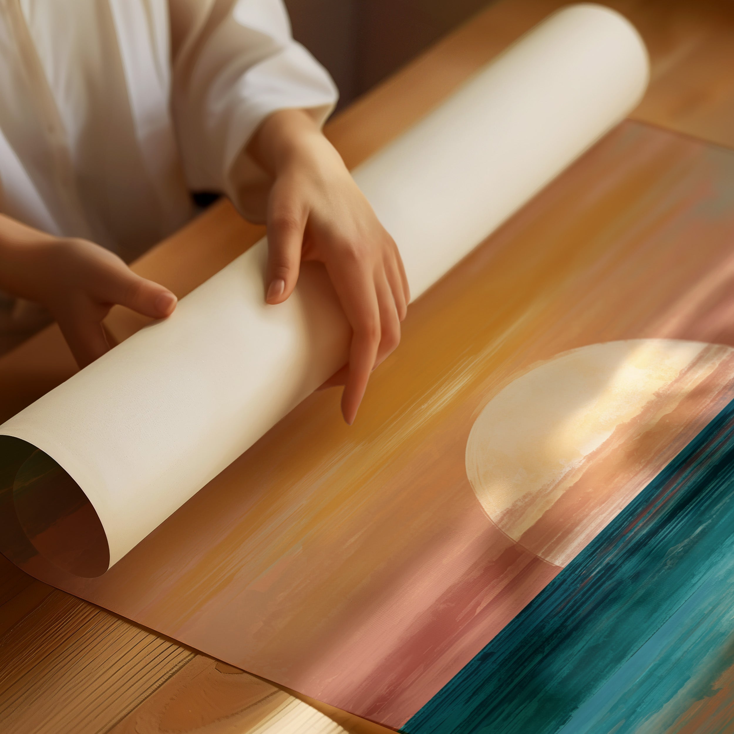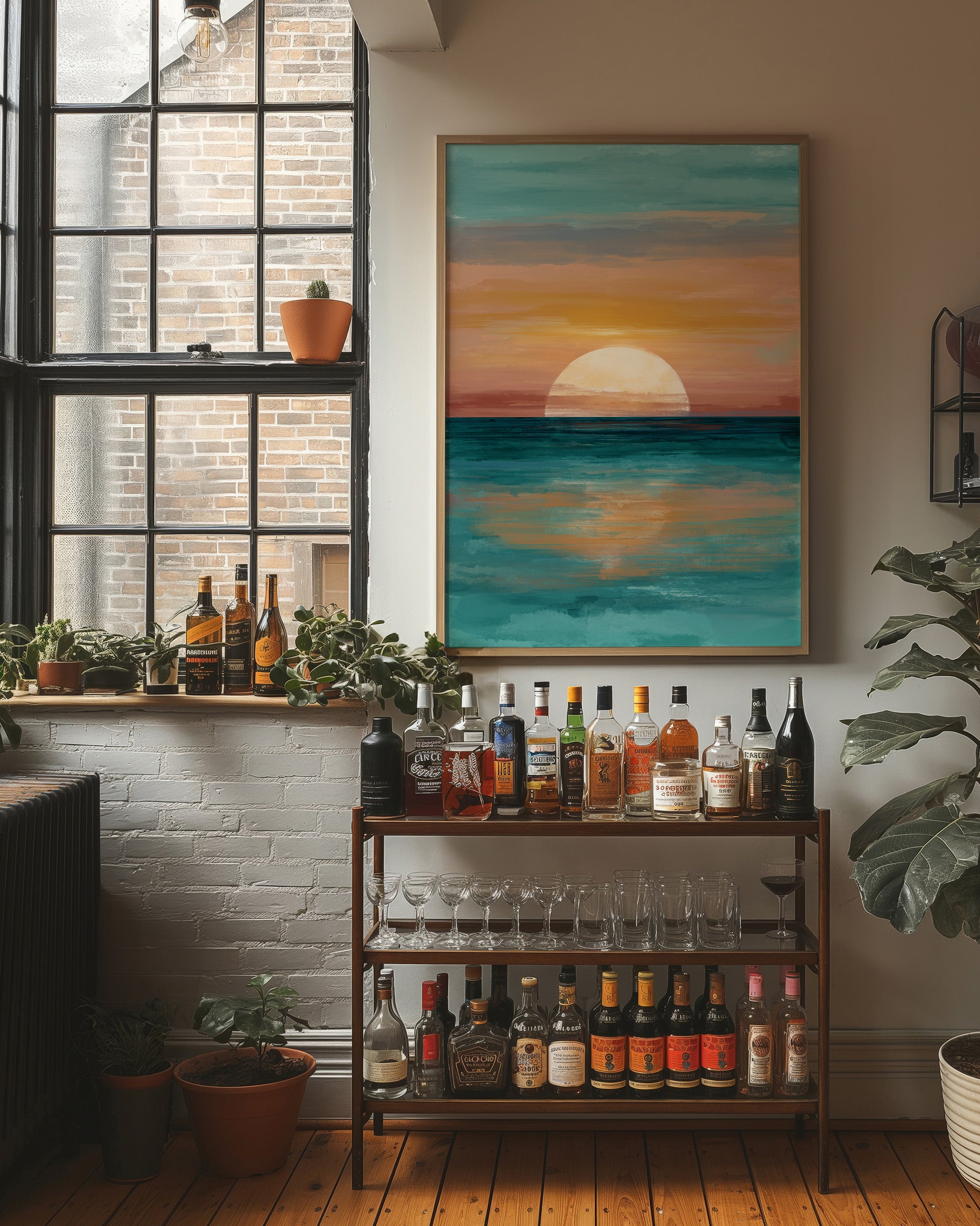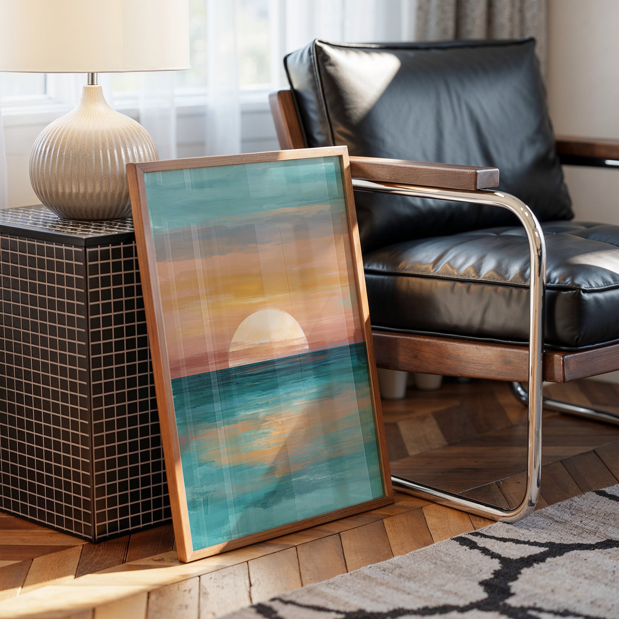 A contemporary seascape painting rests against its wooden frame on a light wooden floor. The artwork captures a serene sunset or sunrise moment where a large golden orb hovers just above the horizon line. Warm peach and amber tones radiate from the glowing sphere, creating a striking contrast against the cool teal waters below. The painting's reflective surface shows the sun's golden light dancing across gentle waves. The minimalist composition balances warm and cool colors in a meditative scene that evokes tranquility and the timeless rhythm of nature's daily transitions.