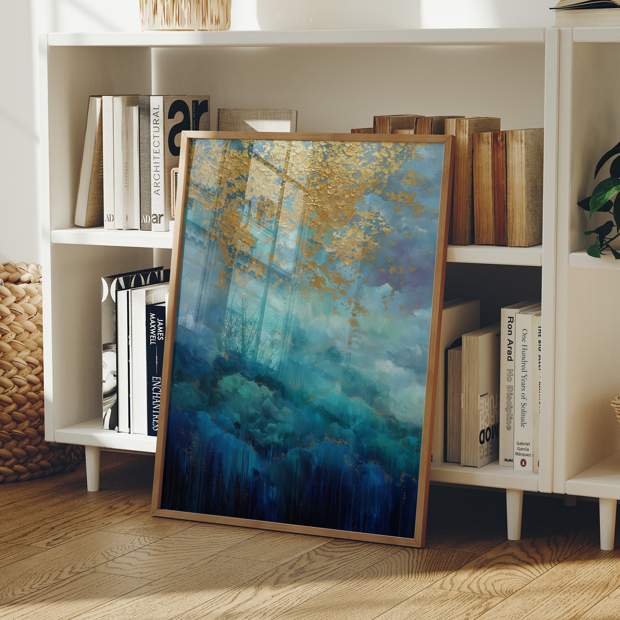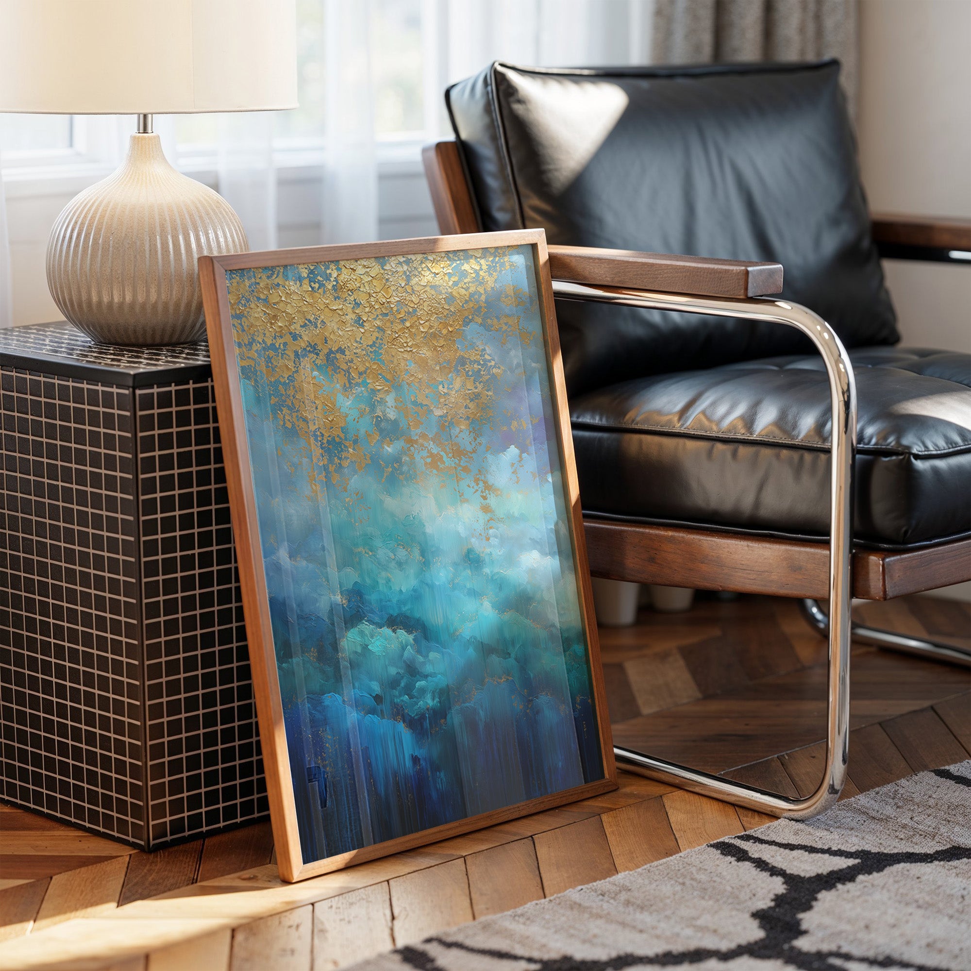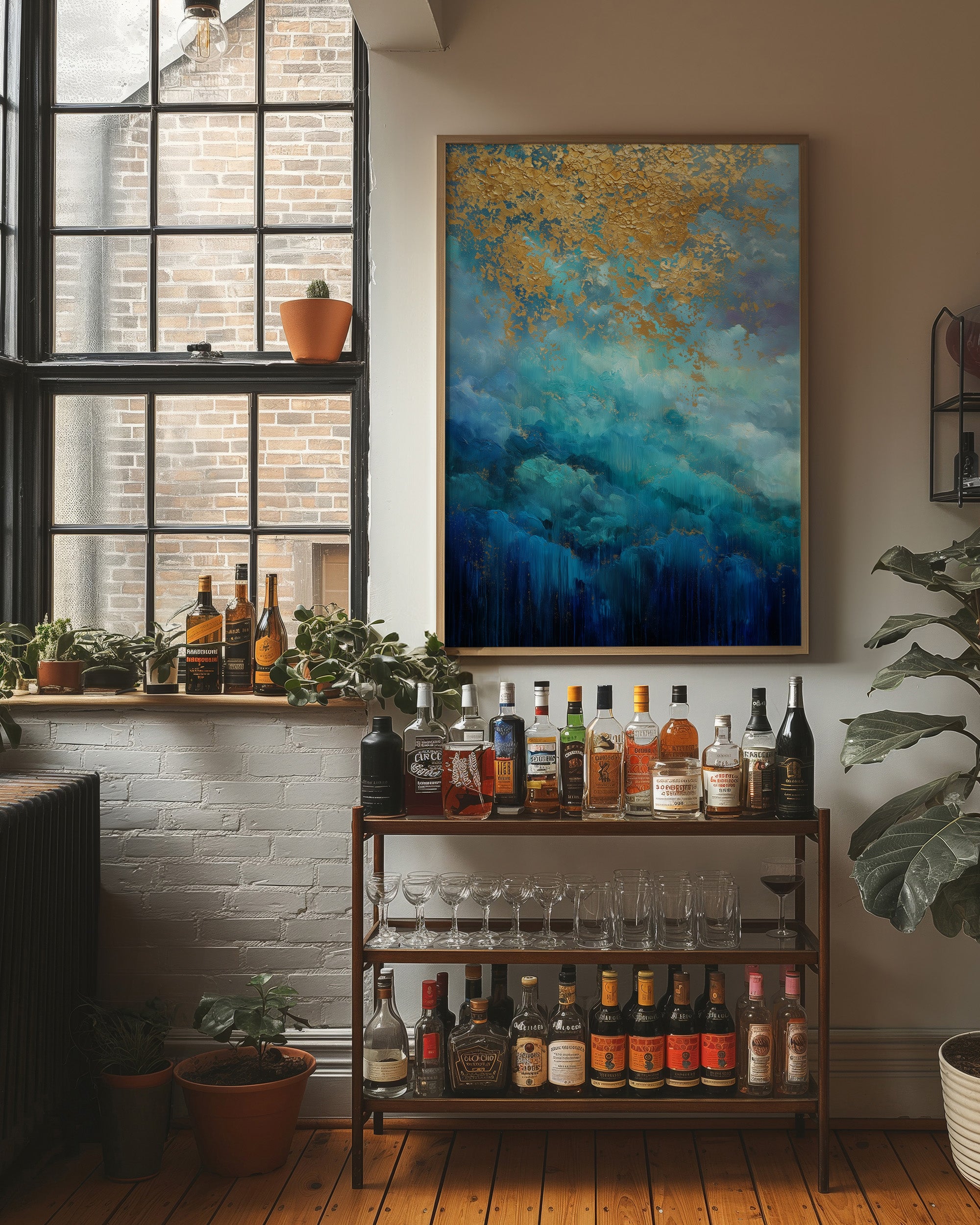 Tumultuous waves of deep azure and turquoise crash beneath a sky adorned with gilded clouds, creating a dramatic intersection of movement and stillness. The painting's rich metallic accents dance across the canvas like scattered sunlight, while depths of navy blue ground the composition in mysterious oceanic depths. In this urban sanctuary, the artwork commands attention above a thoughtfully curated bar cart, its colors harmonizing with the warm wooden floors and industrial windows. Perfect for elevating contemporary living spaces, especially those seeking to balance modern sophistication with organic energy. This piece creates an impressive focal point in home bars, dining rooms, or any space where gatherings naturally flow.