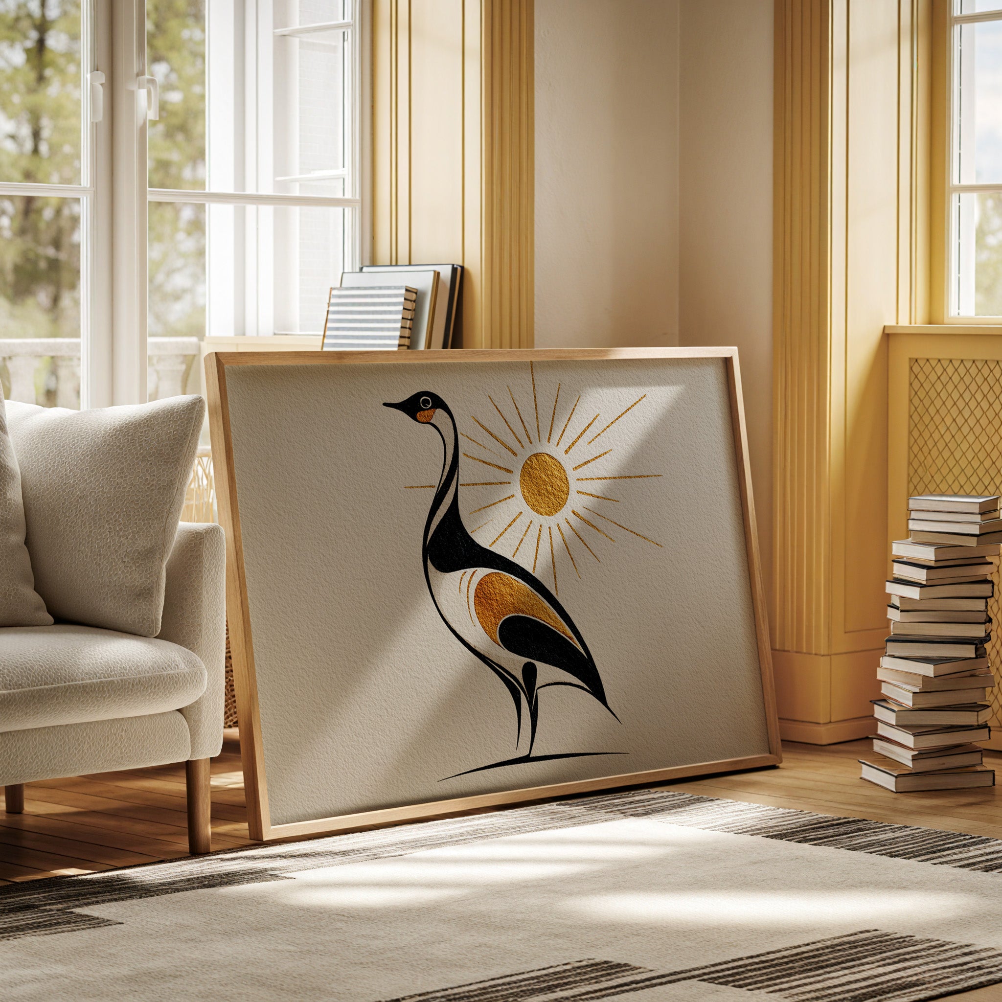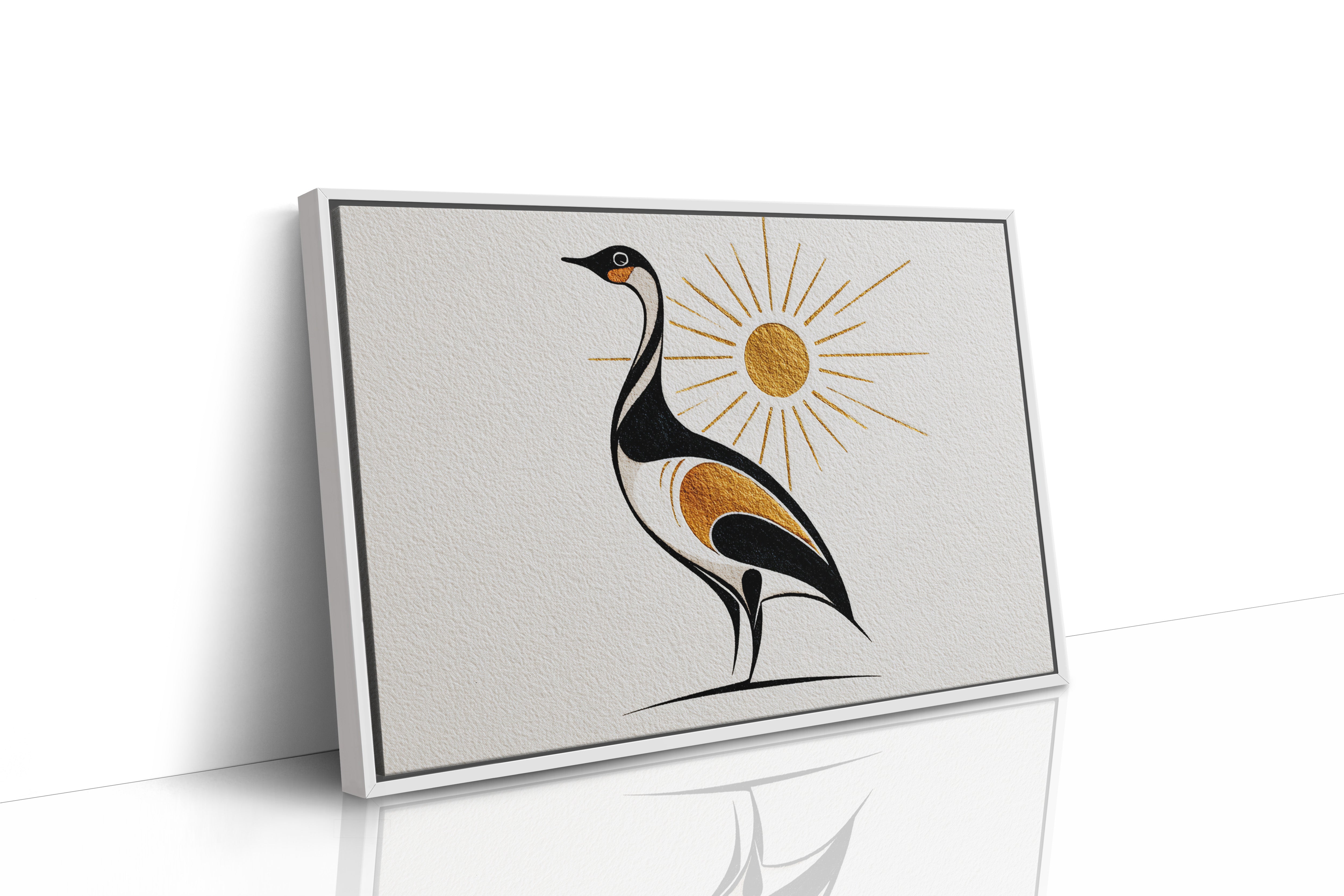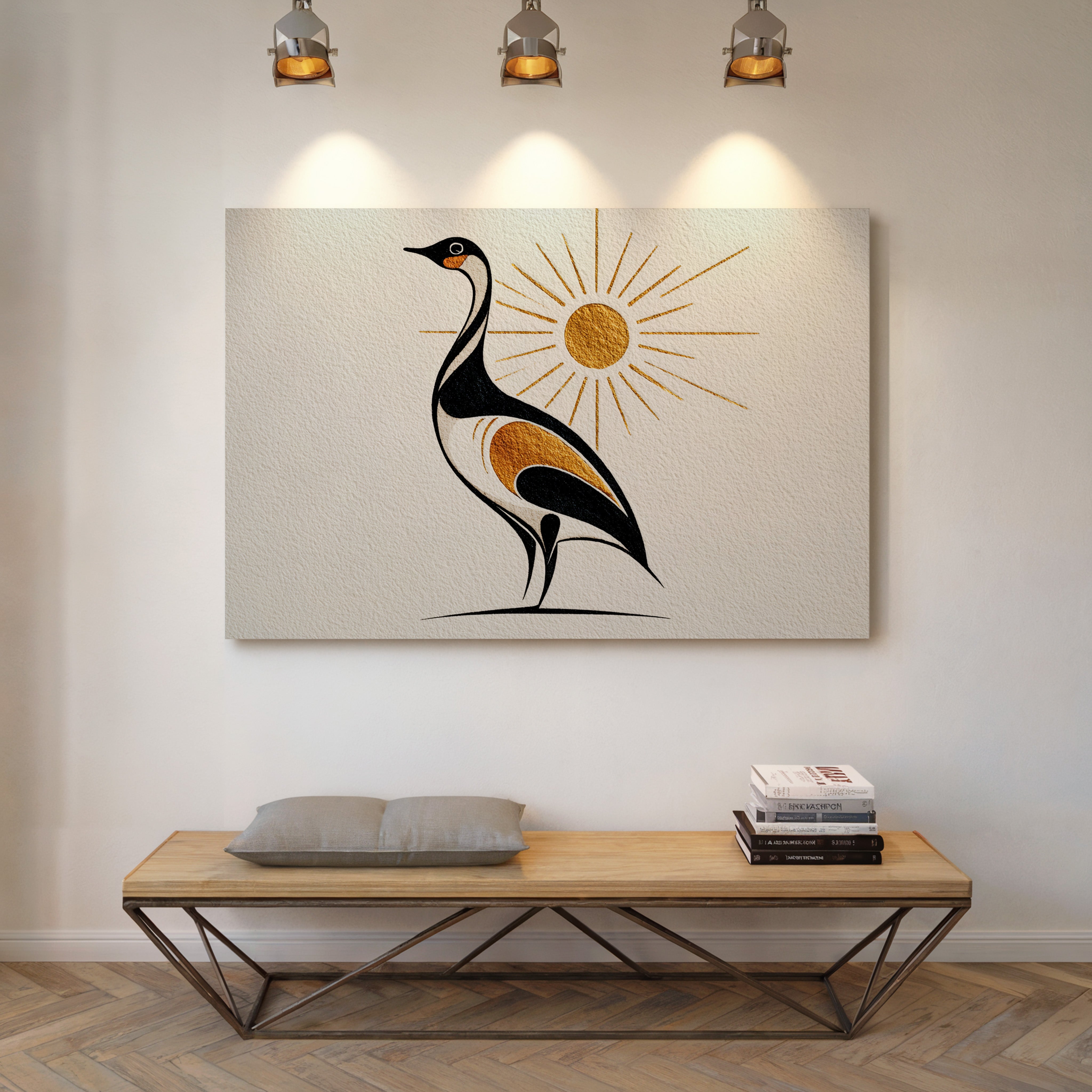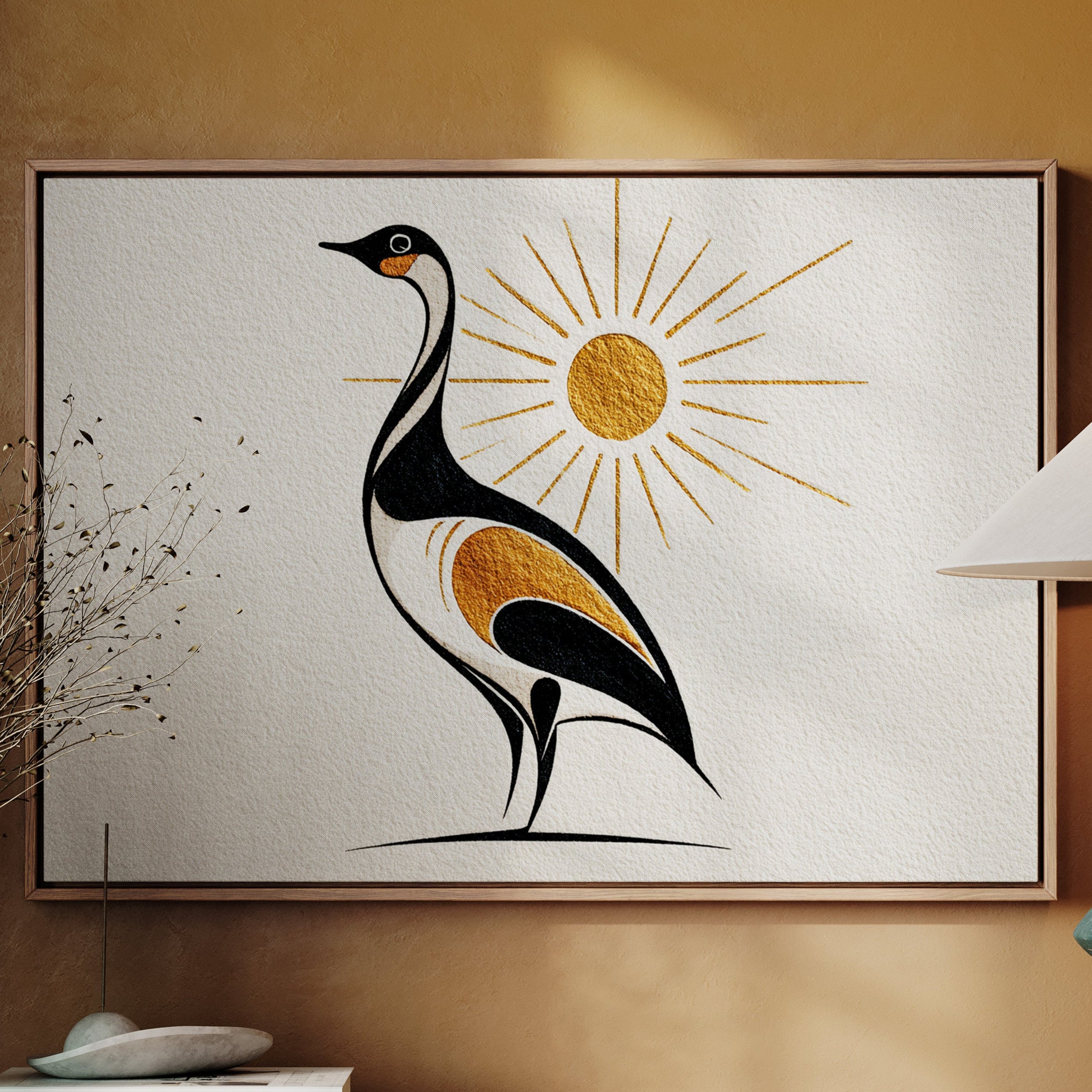 A majestic goose stands in elegant silhouette, its graceful form captured in bold black strokes against pristine white. Behind it, a radiant golden sun spreads its rays like a celestial crown, creating a striking harmony of metallic warmth and graphic precision. The composition merges Art Deco sophistication with modern minimalism, celebrating the natural dignity of waterfowl through clean lines and geometric patterns. The interplay of black contours with shimmering gold leaf creates a sense of timeless nobility.