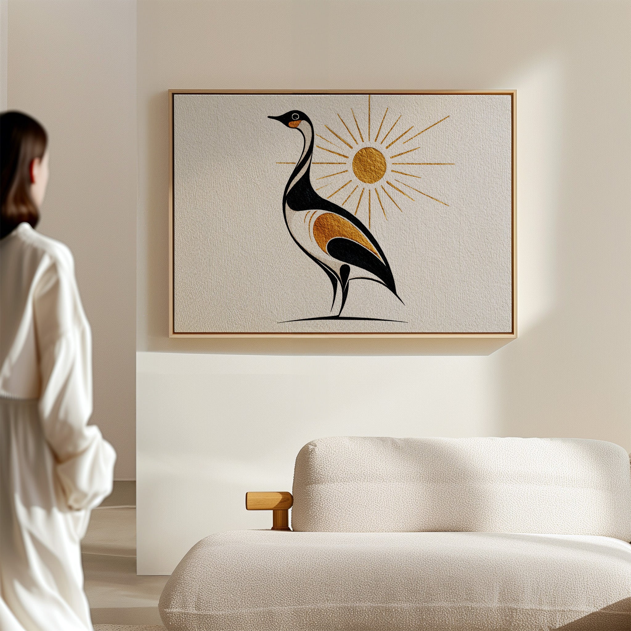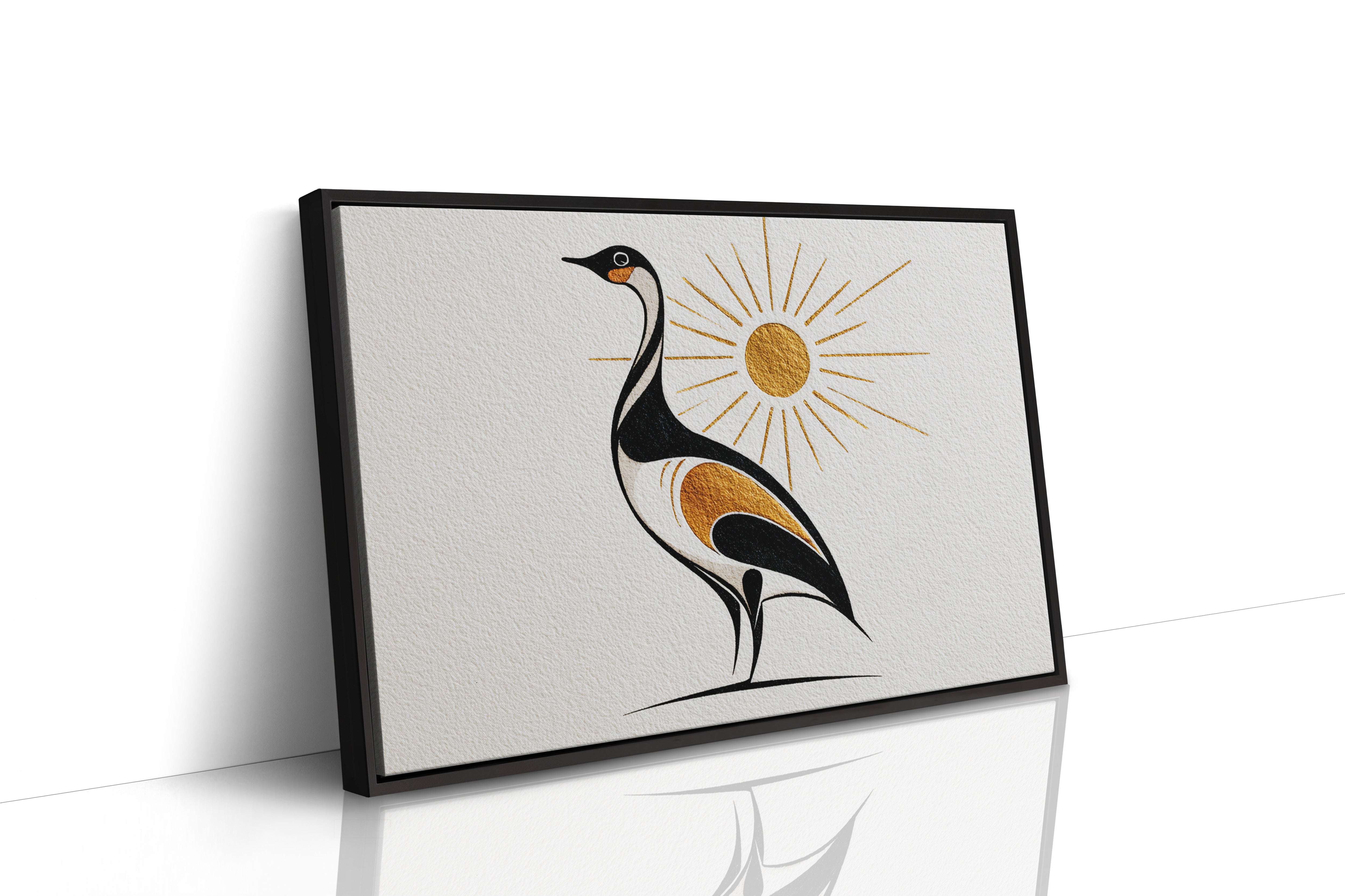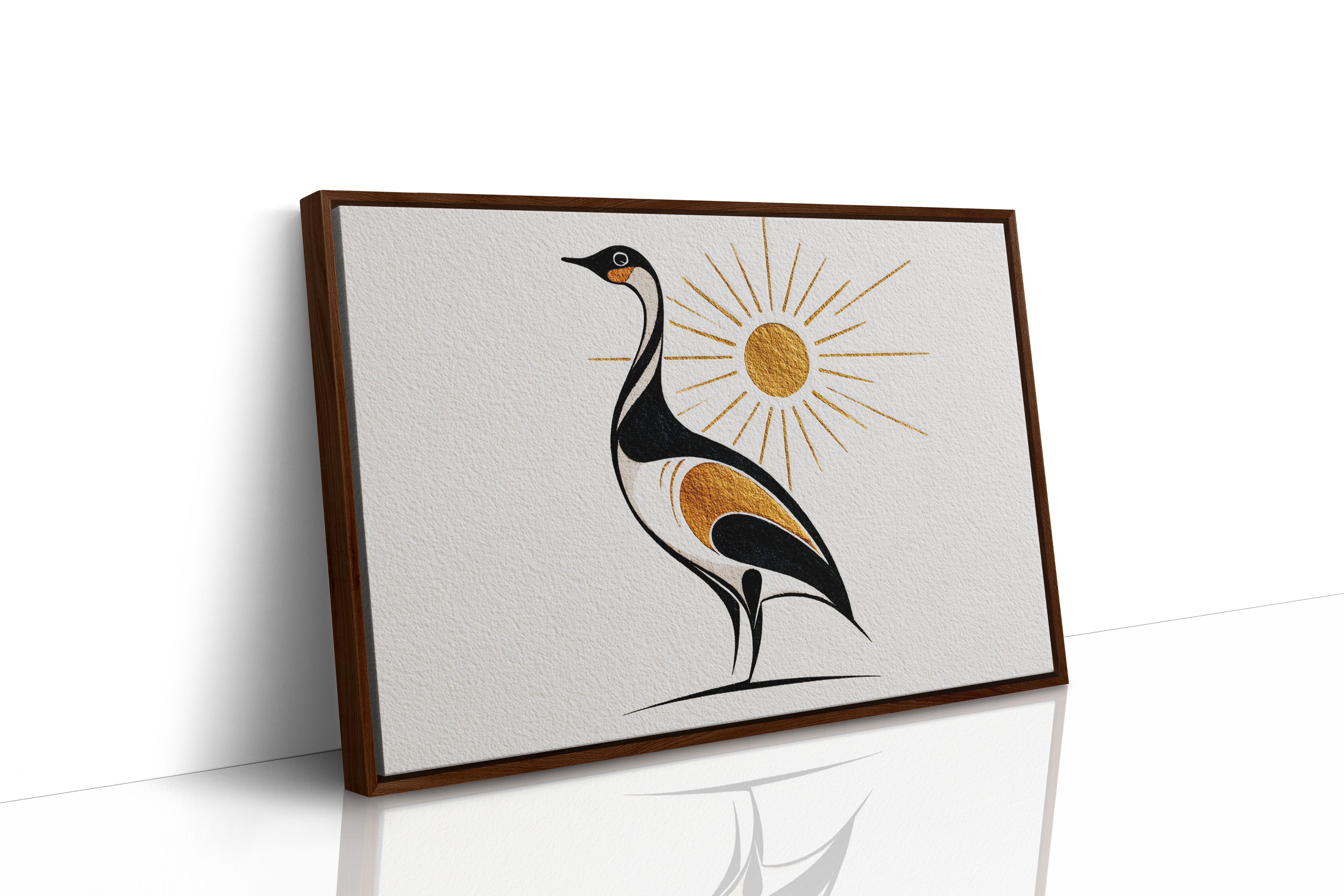 A majestic goose stands in elegant silhouette, its graceful form captured in bold black strokes against pristine white. Behind it, a radiant golden sun spreads its rays like a celestial crown, creating a striking harmony of metallic warmth and graphic precision. The composition merges Art Deco sophistication with modern minimalism, celebrating the natural dignity of waterfowl through clean lines and geometric patterns. The interplay of black contours with shimmering gold leaf creates a sense of timeless nobility.