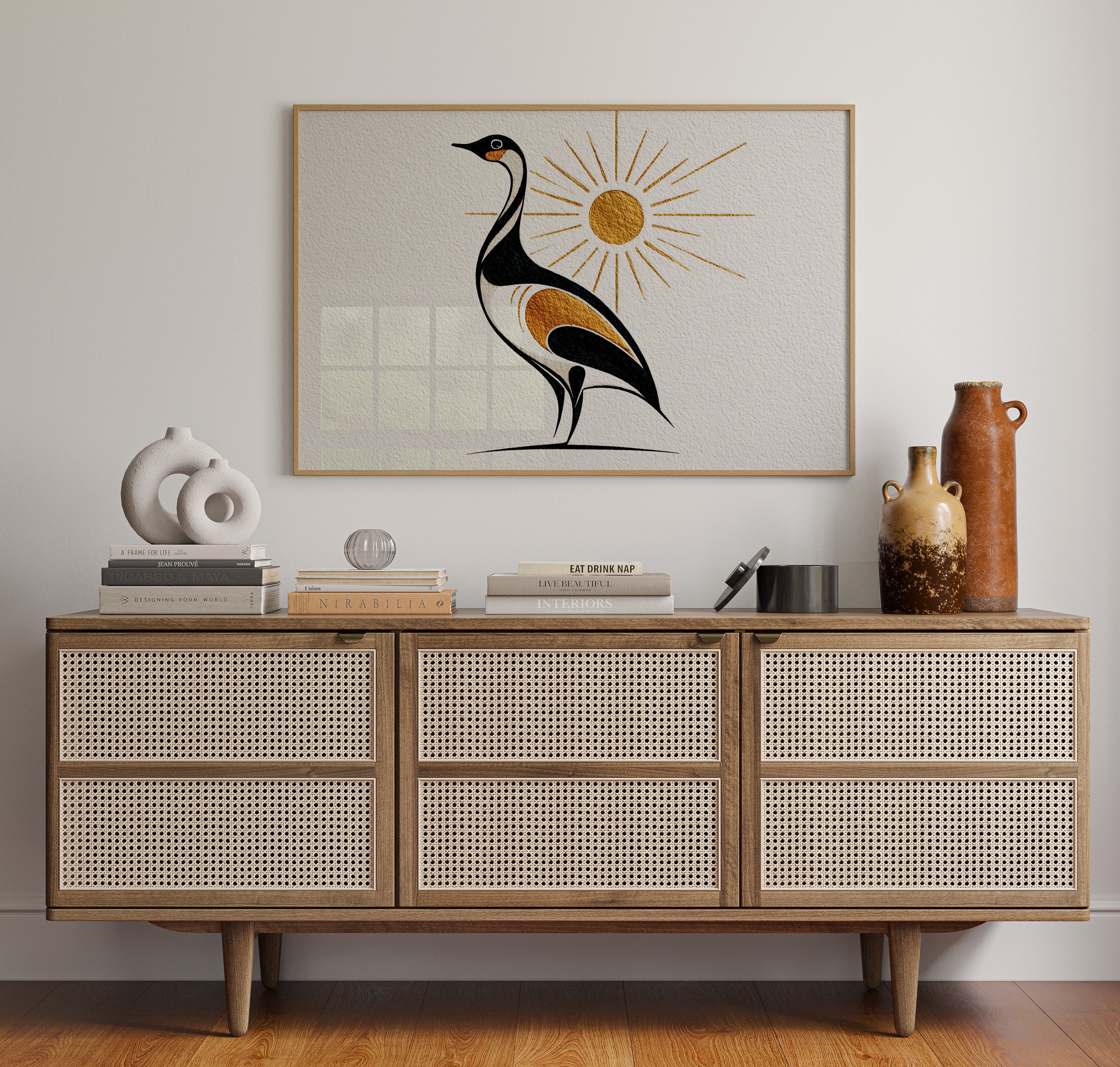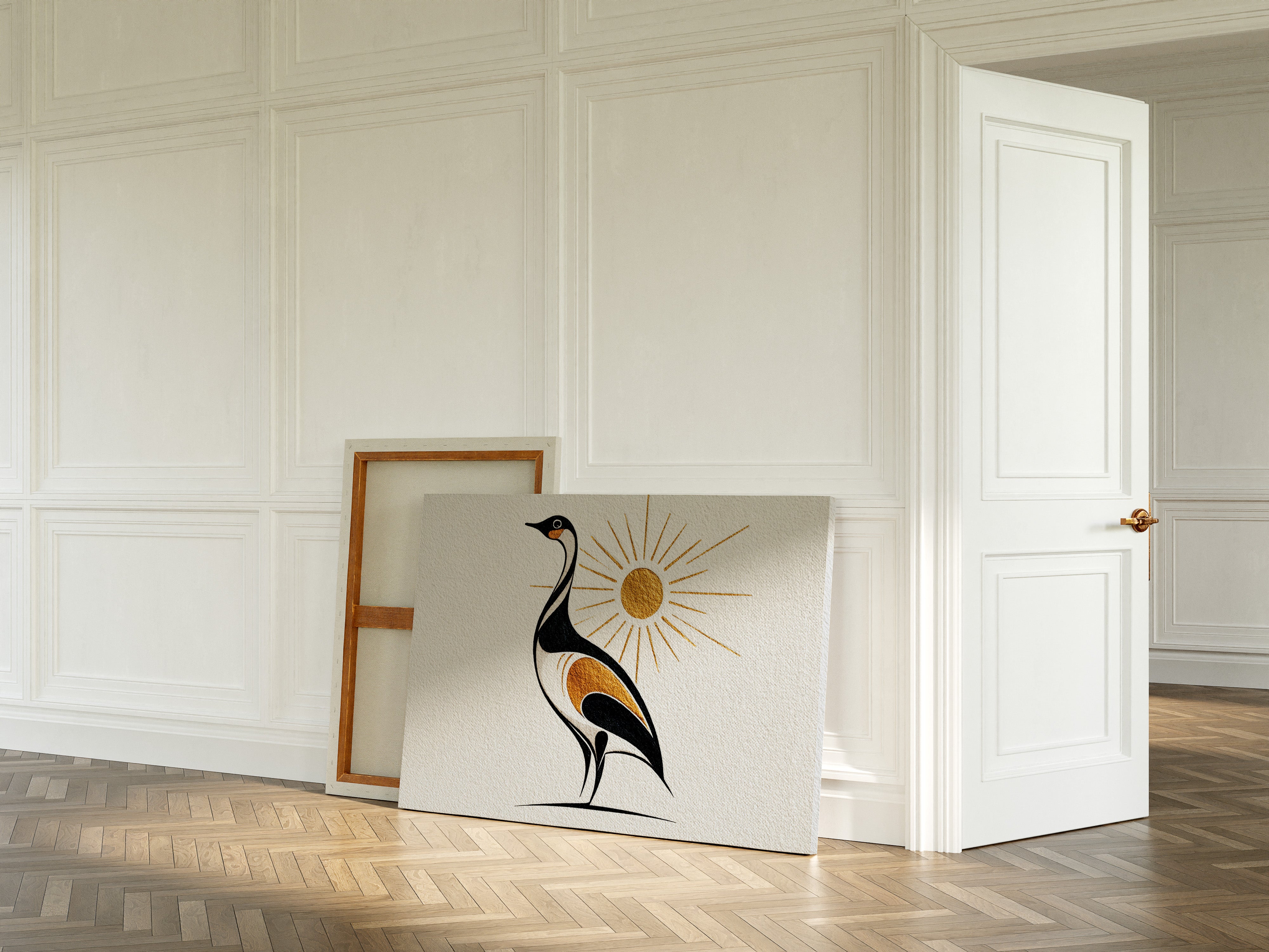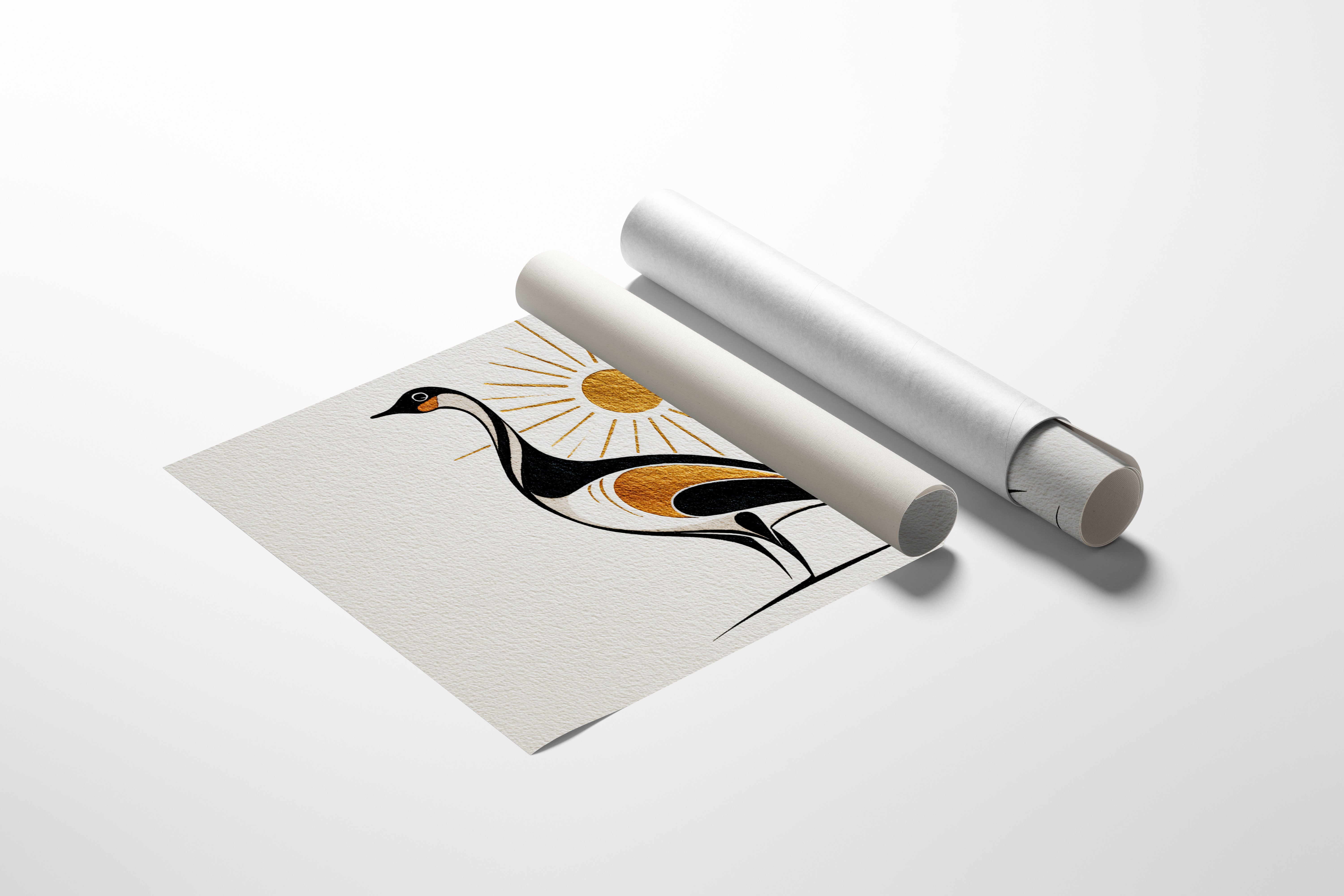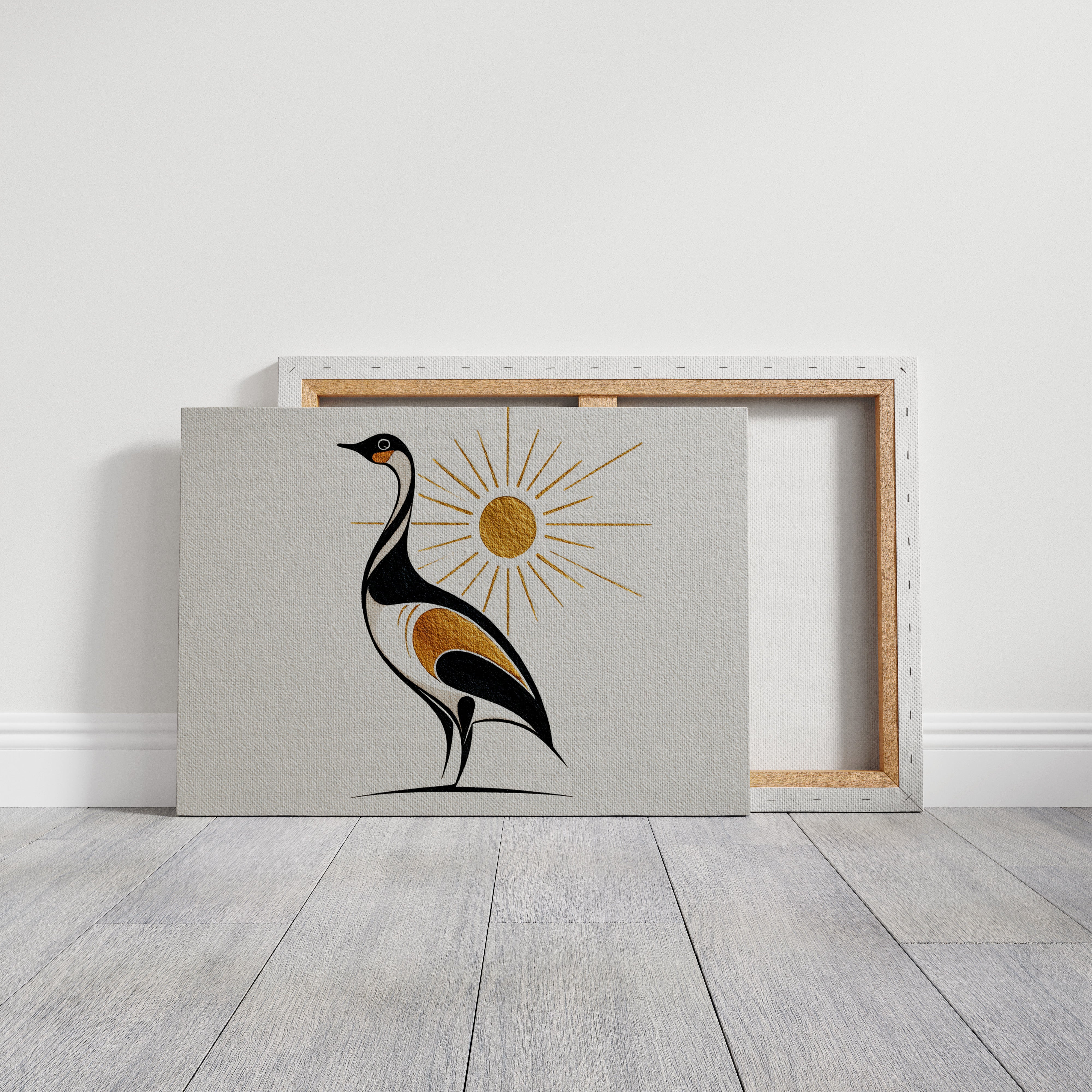 A majestic goose stands in elegant silhouette, its graceful form captured in bold black strokes against pristine white. Behind it, a radiant golden sun spreads its rays like a celestial crown, creating a striking harmony of metallic warmth and graphic precision. The composition merges Art Deco sophistication with modern minimalism, celebrating the natural dignity of waterfowl through clean lines and geometric patterns. The interplay of black contours with shimmering gold leaf creates a sense of timeless nobility.