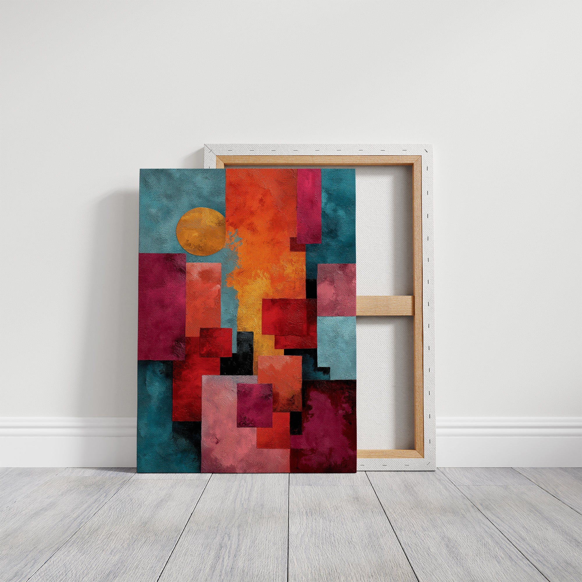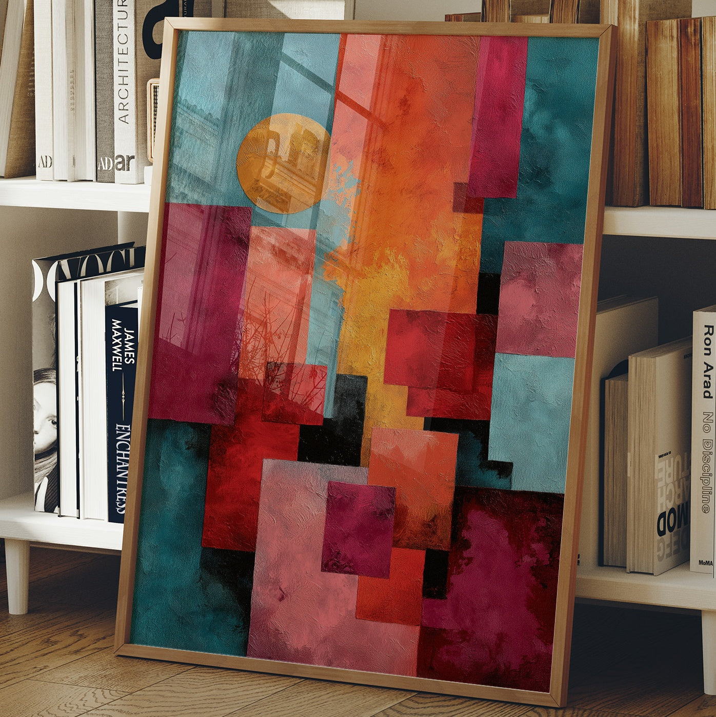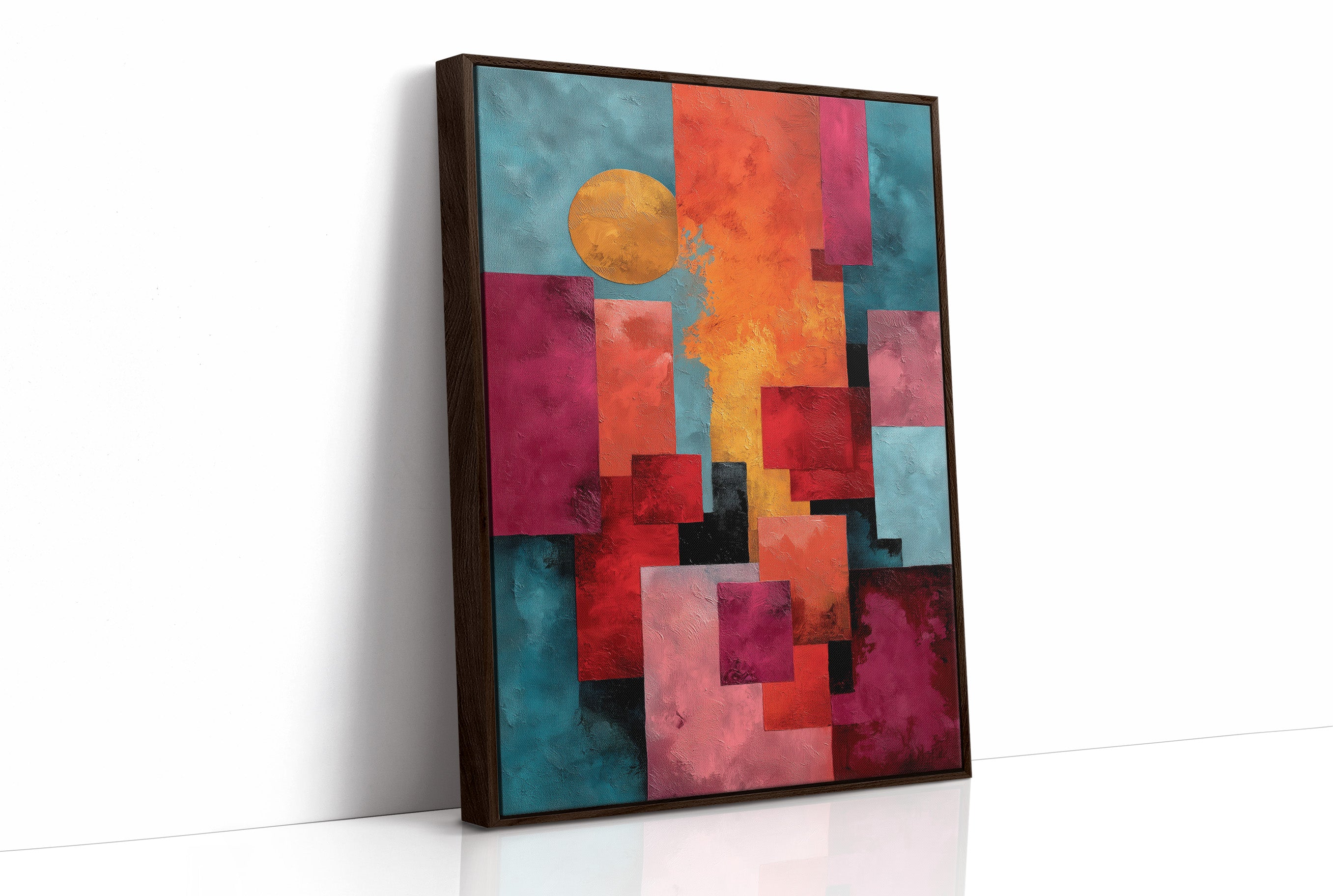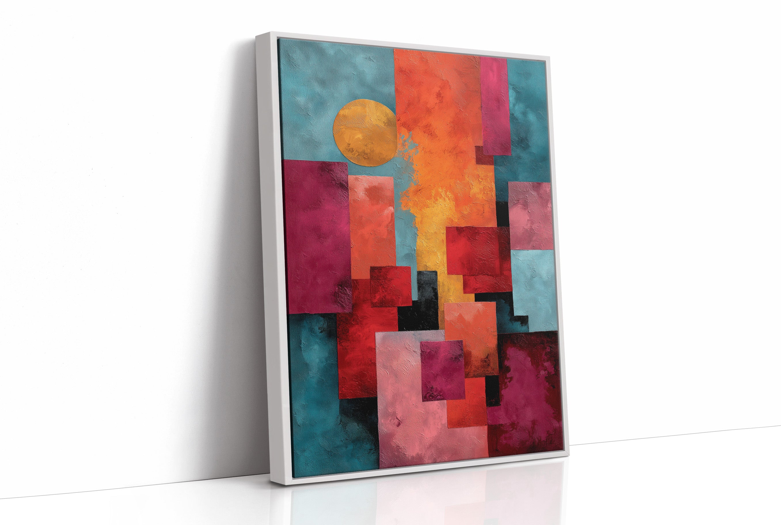 A brilliant golden orb hovers amidst a geometric cityscape of vibrant blocks, casting warmth across an abstract urban landscape. Rich teals, magentas, and coral rectangles stack and overlap, creating depth through their textured surfaces and bold color interactions. The composition speaks to modern city life - the way sunlight plays between buildings, reflecting and refracting across architectural faces throughout the day. This striking piece would make a bold statement in a contemporary living room or add creative energy to a minimalist office space.