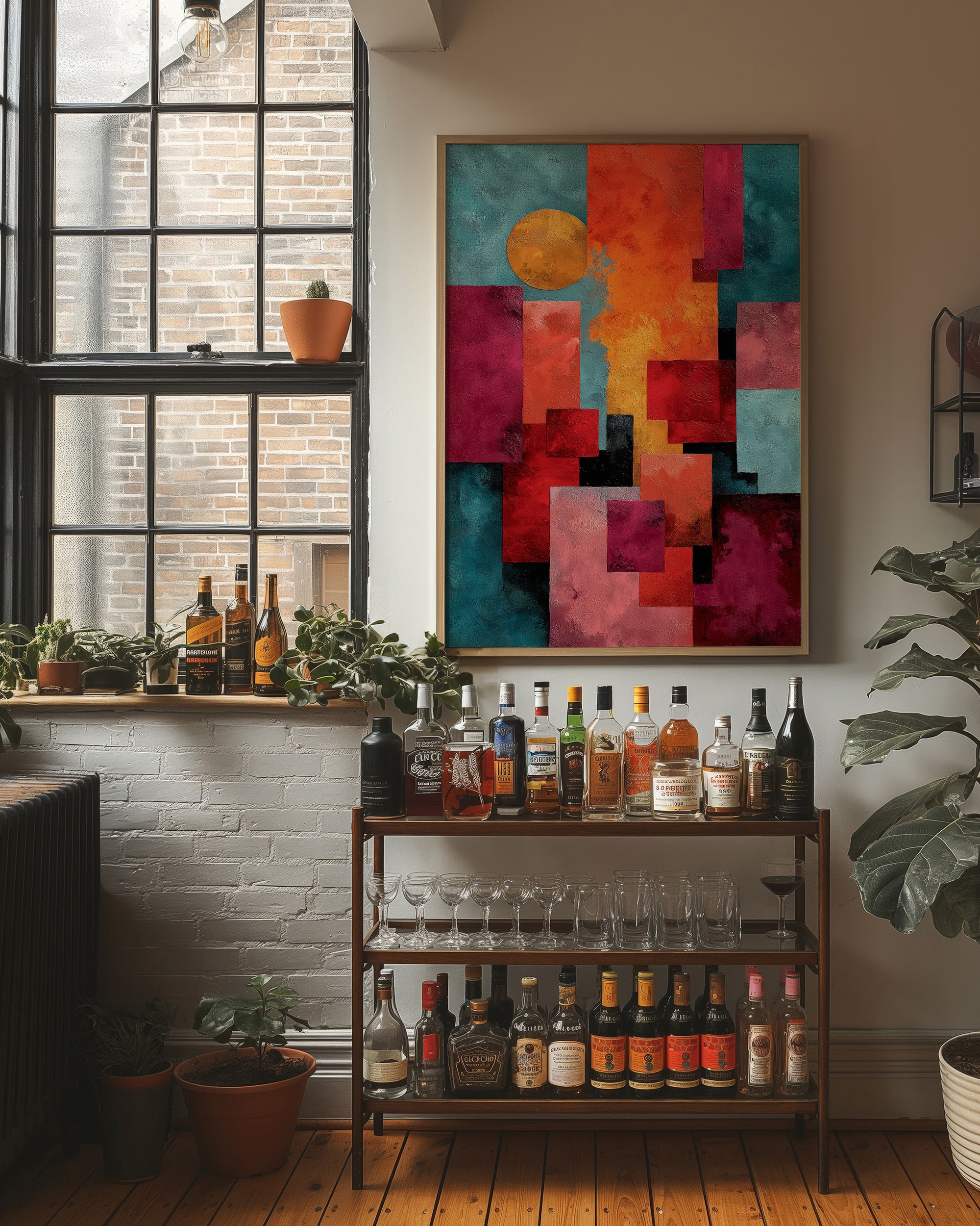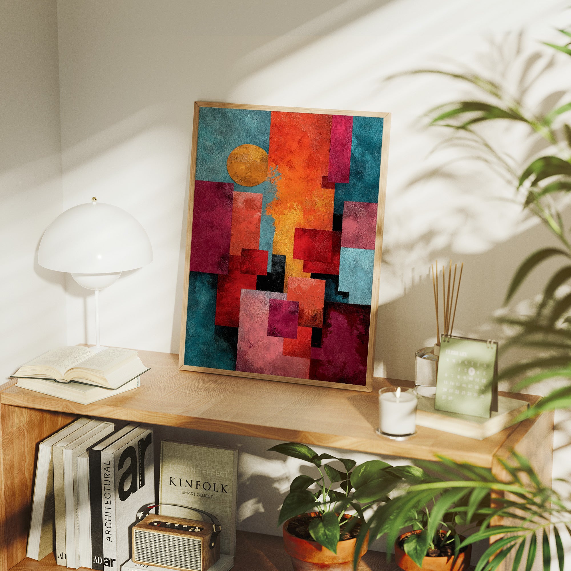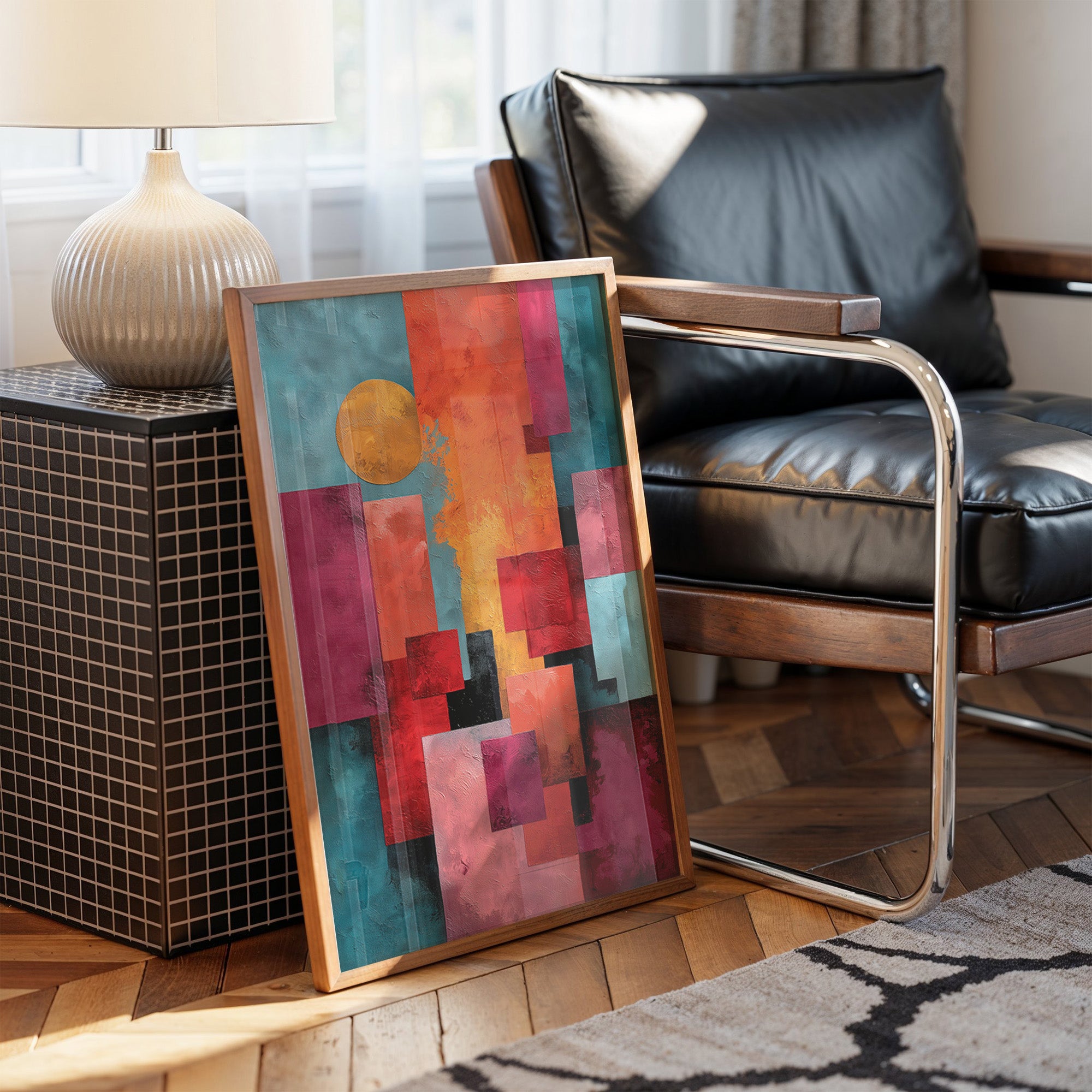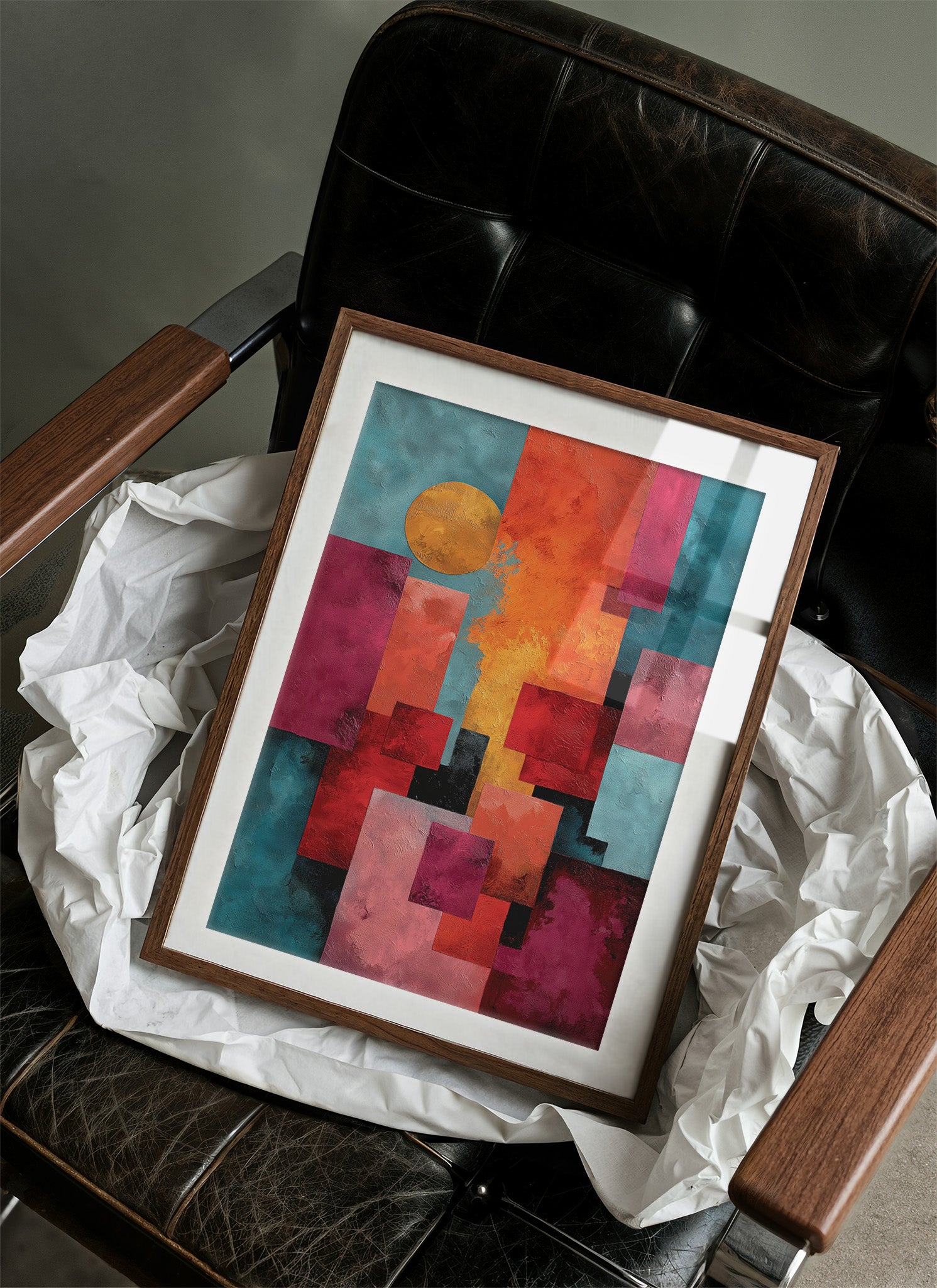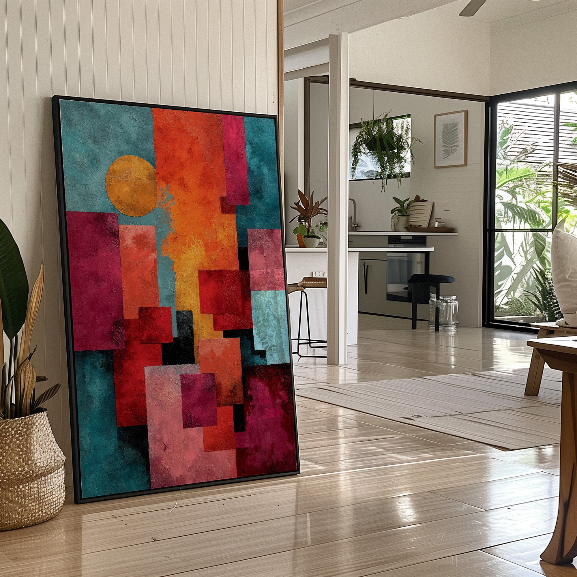 A brilliant golden orb hovers amidst a geometric cityscape of vibrant blocks, casting warmth across an abstract urban landscape. Rich teals, magentas, and coral rectangles stack and overlap, creating depth through their textured surfaces and bold color interactions. The composition speaks to modern city life - the way sunlight plays between buildings, reflecting and refracting across architectural faces throughout the day. This striking piece would make a bold statement in a contemporary living room or add creative energy to a minimalist office space.