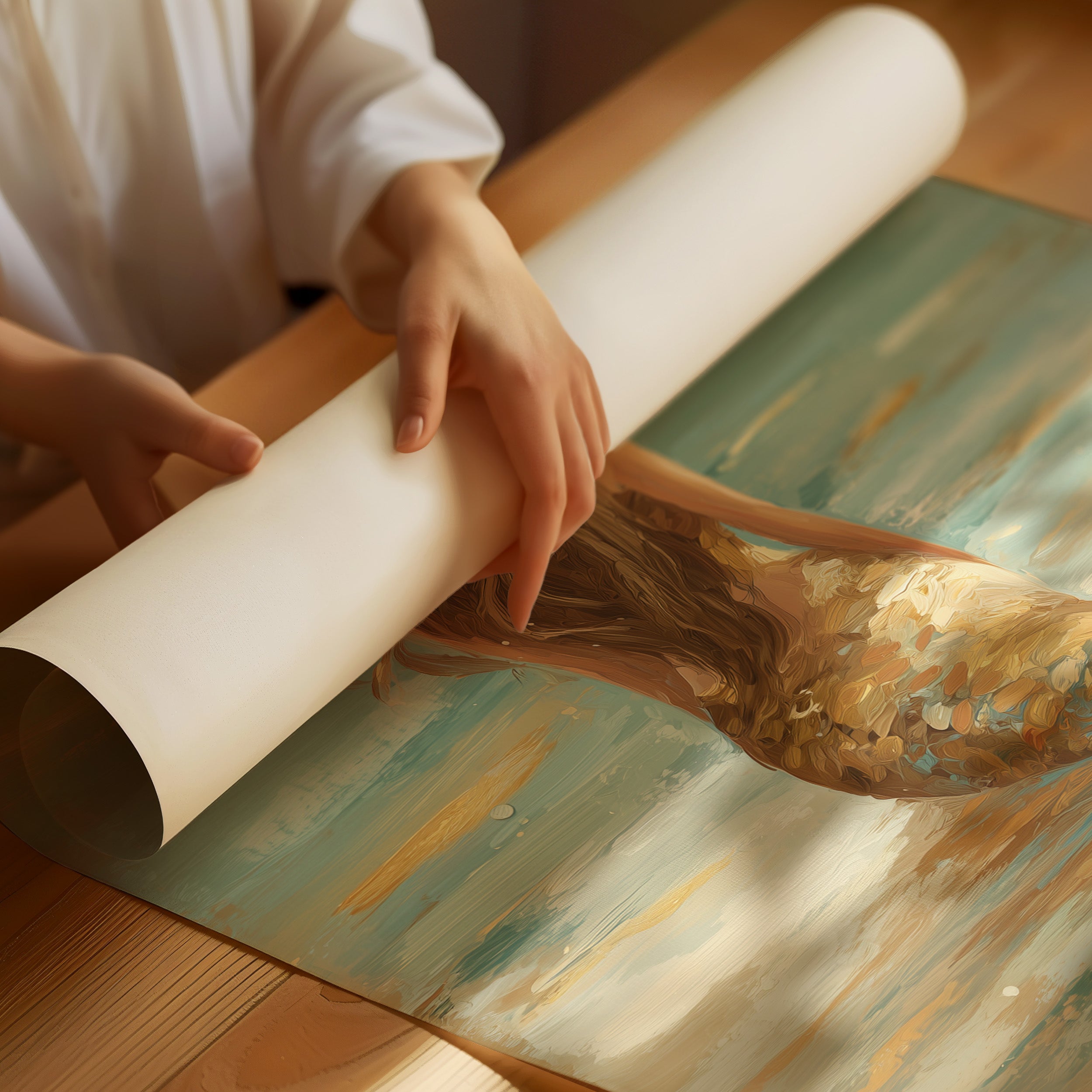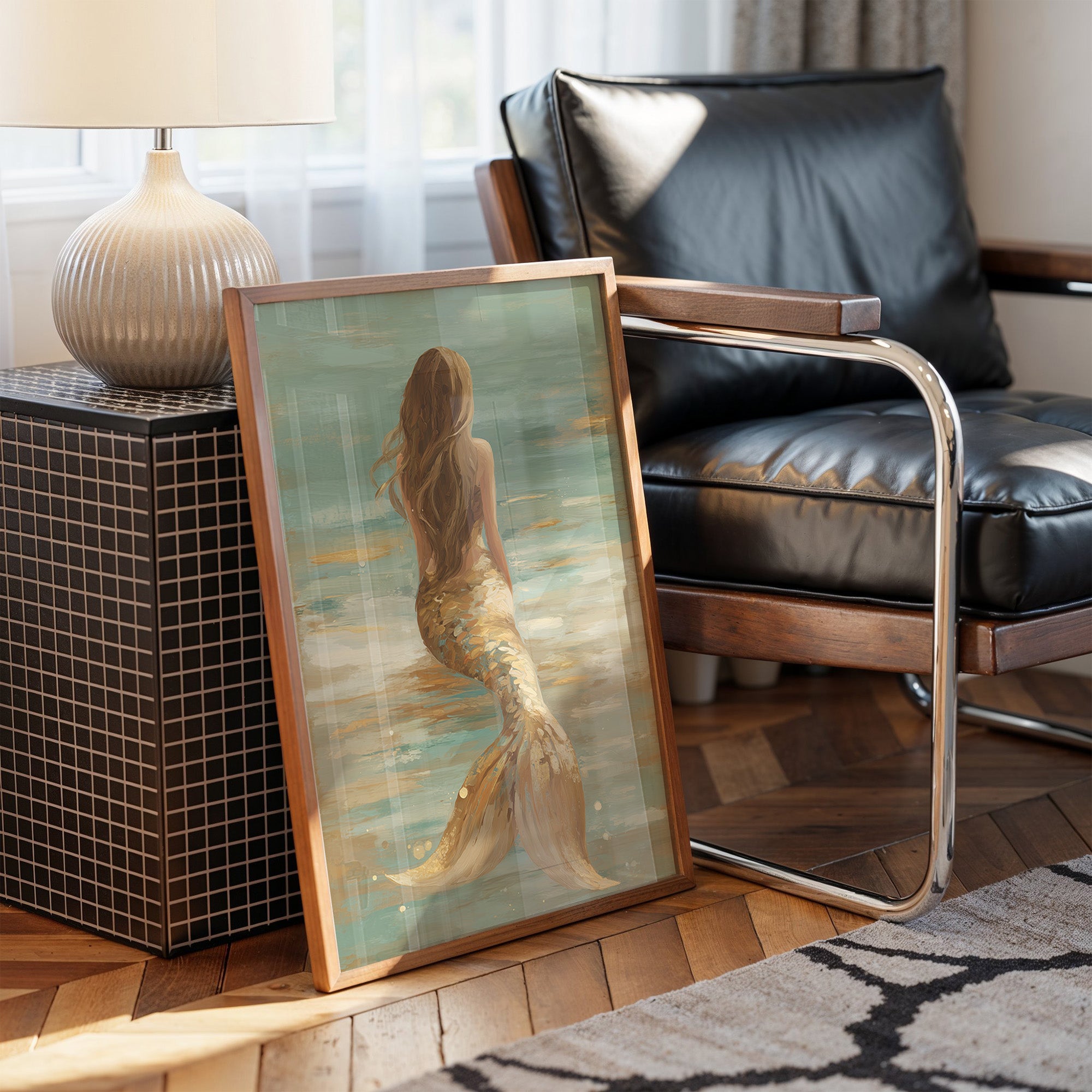 Sunlight dances across a dreamy painting of a mermaid, her golden tail catching light like treasure beneath shallow waters. Soft seafoam greens and sandy beiges create a tranquil seascape, where brushstrokes blend to capture the ethereal boundary between fantasy and reality. The wooden frame complements the warm tones in the artwork, creating a harmonious balance against the contemporary living space surrounding it.