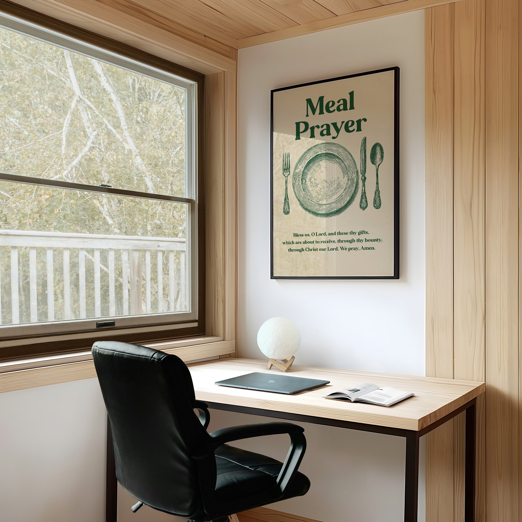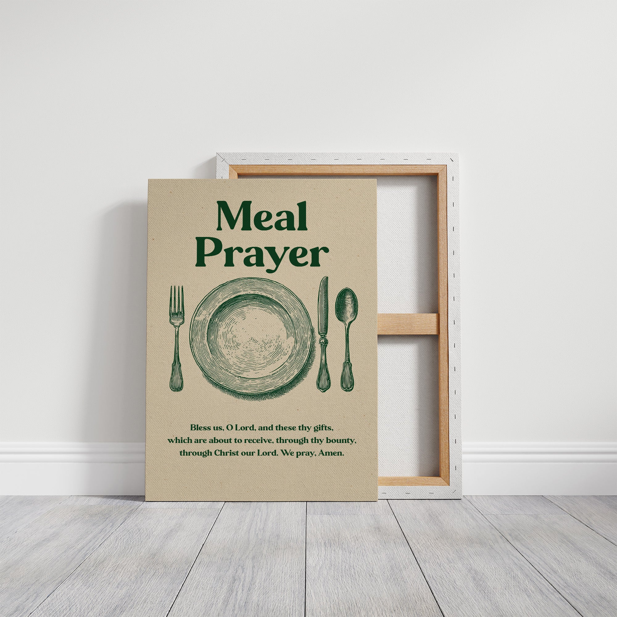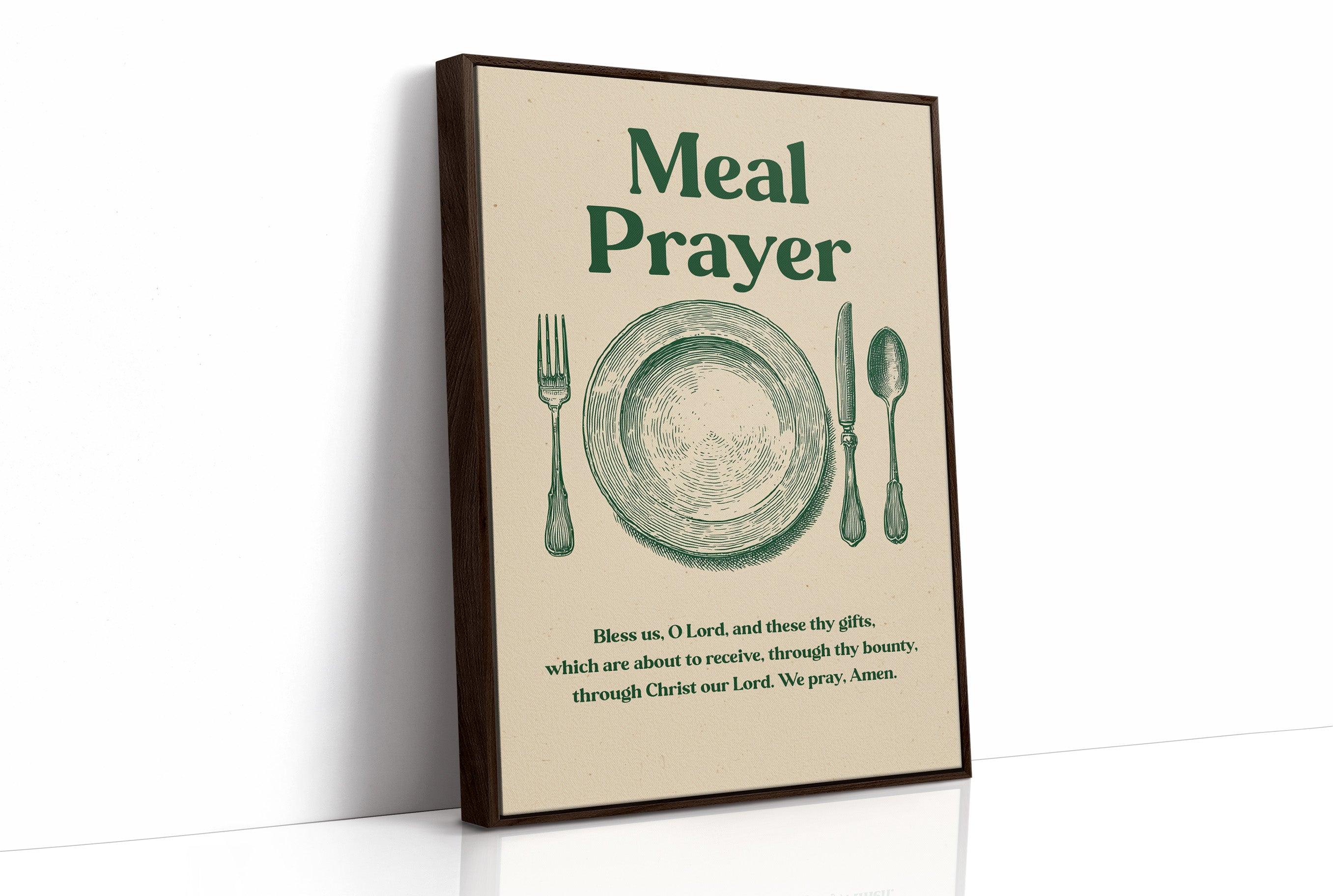 Sunlight caresses the cream-colored prayer card, its emerald text offering a moment of pause before nourishment. The illustration of plate and silverware rests against warm, honey-toned wooden slats, inviting reflection and gratitude. A small cup waits patiently nearby while hints of greenery and blossoms peek from the edge, suggesting a thoughtfully prepared space for communion and conversation. This contemplative piece brings tranquil intention to dining rooms, breakfast nooks, or kitchen walls where family gathers to share both food and fellowship.