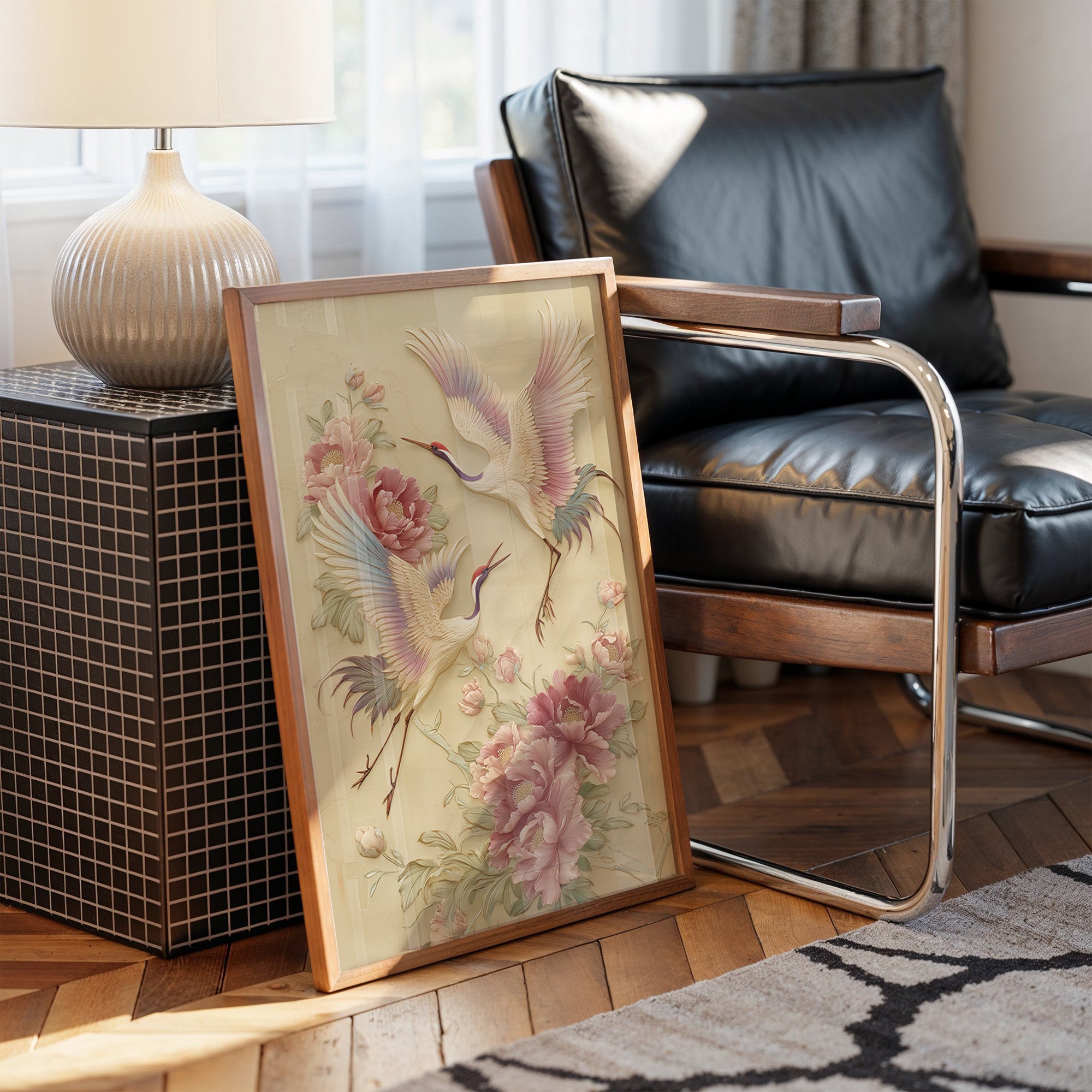 Delicate brushstrokes capture the dance of two elegant cranes, their wings spread in ethereal movement against a soft cream backdrop. The composition flows with feminine energy, as dusty pink peonies unfurl their petals beneath the graceful birds, creating a harmonious balance of movement and stillness. The traditional Asian-inspired artwork speaks of spring mornings and eternal beauty, rendered in gentle pastels and confident lines. This piece would bring serene elegance to a reading nook, bedroom, or meditation space where its calming energy can be fully appreciated.