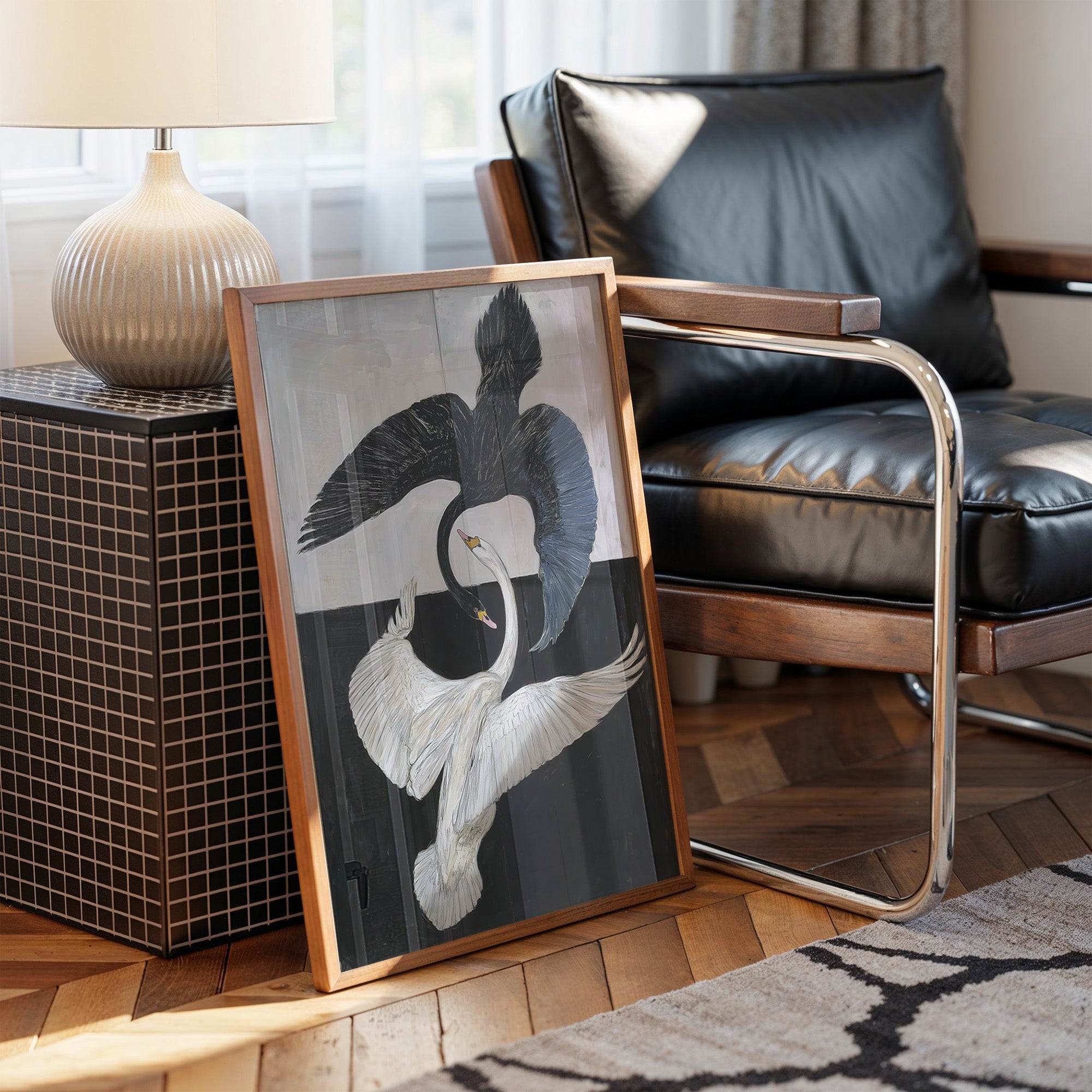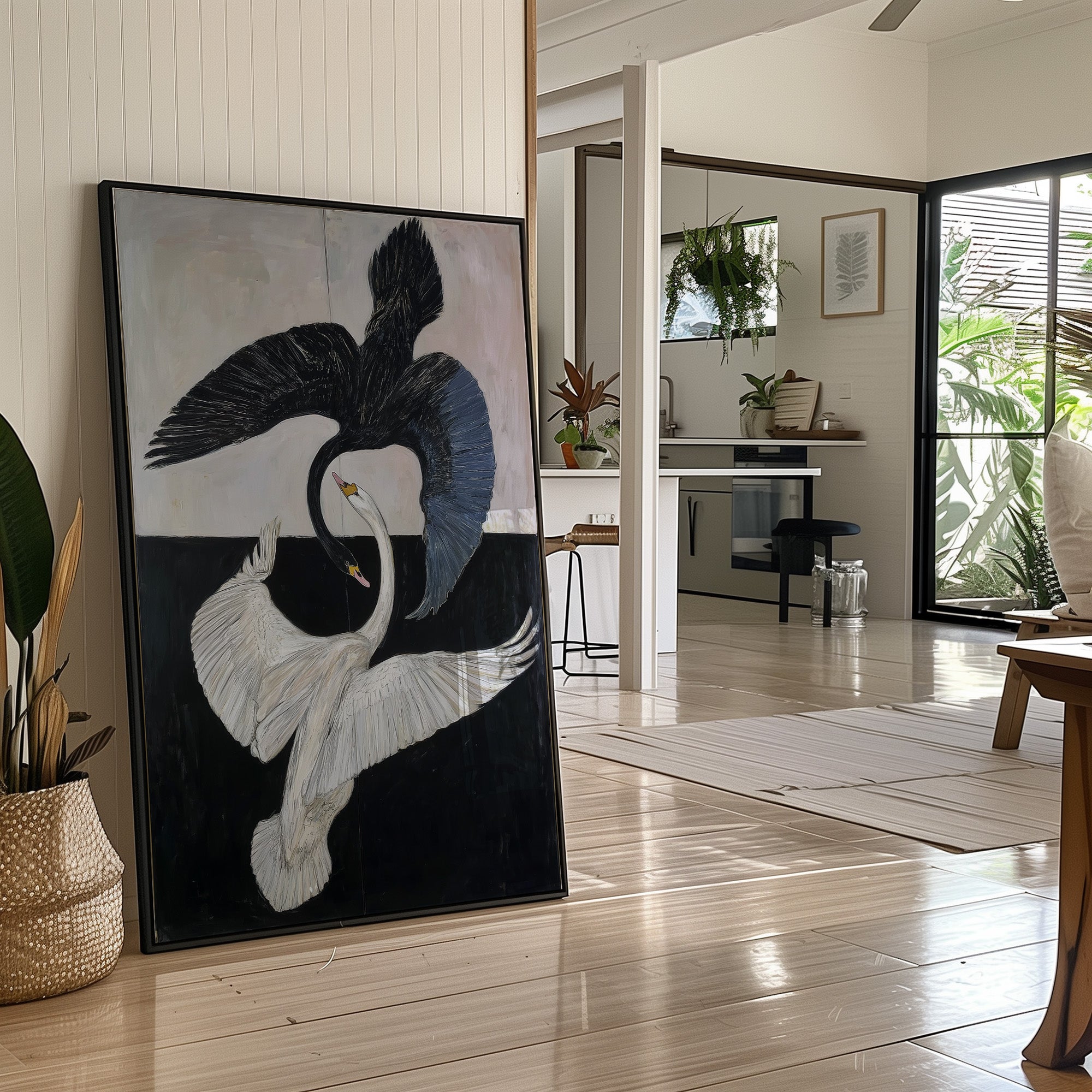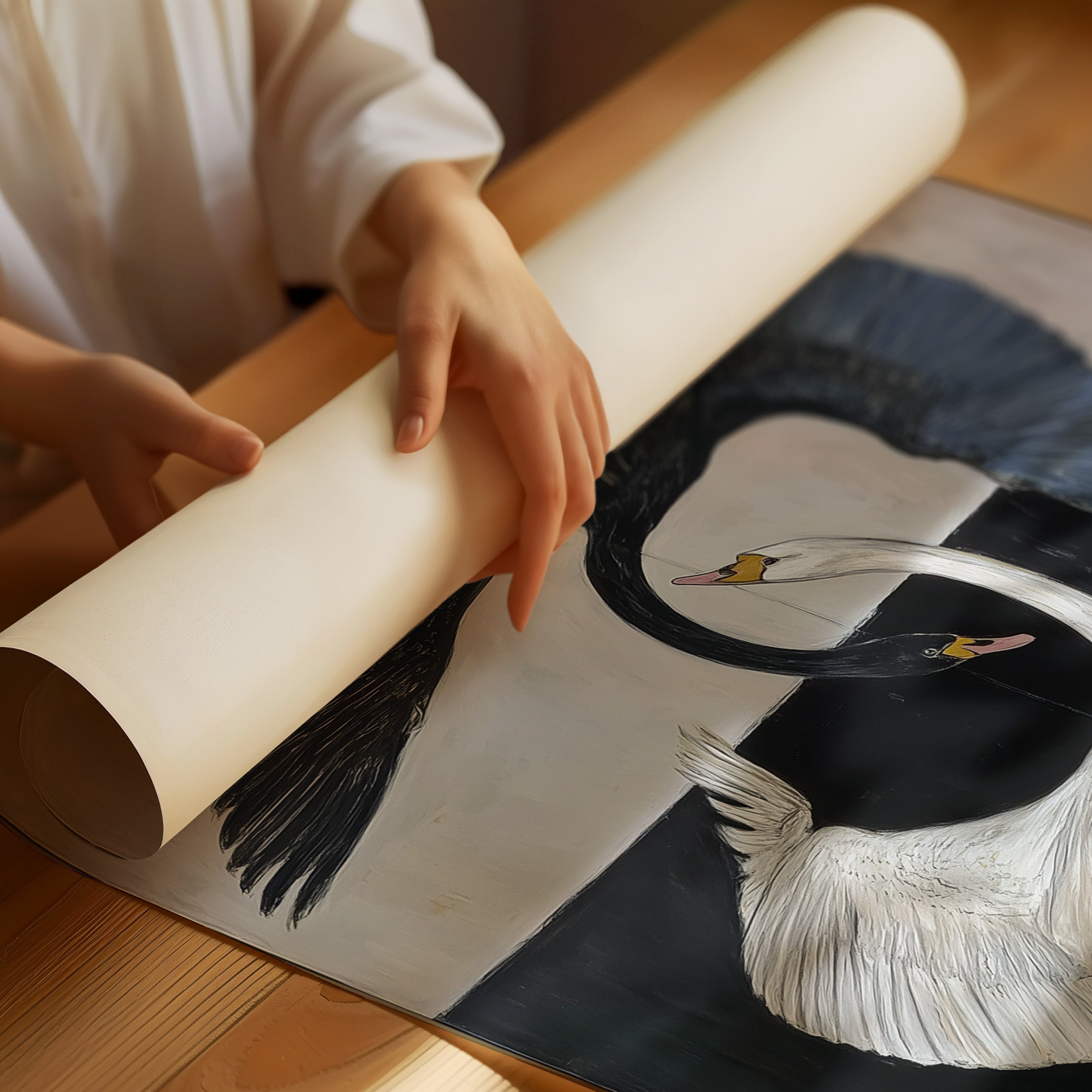 A striking contrast emerges as two cranes intertwine in an ethereal dance, their forms both delicate and powerful against a moody backdrop. The white crane's luminous feathers create a brilliant counterpoint to its darker companion, their synchronized movement capturing a moment of natural choreography. The dramatic composition speaks to the eternal dance of light and shadow, strength and grace. This sophisticated piece would elevate a modern living room or bring artistic gravitas to a minimalist dining space, its contemporary style complementing both neutral and bold interior palettes.