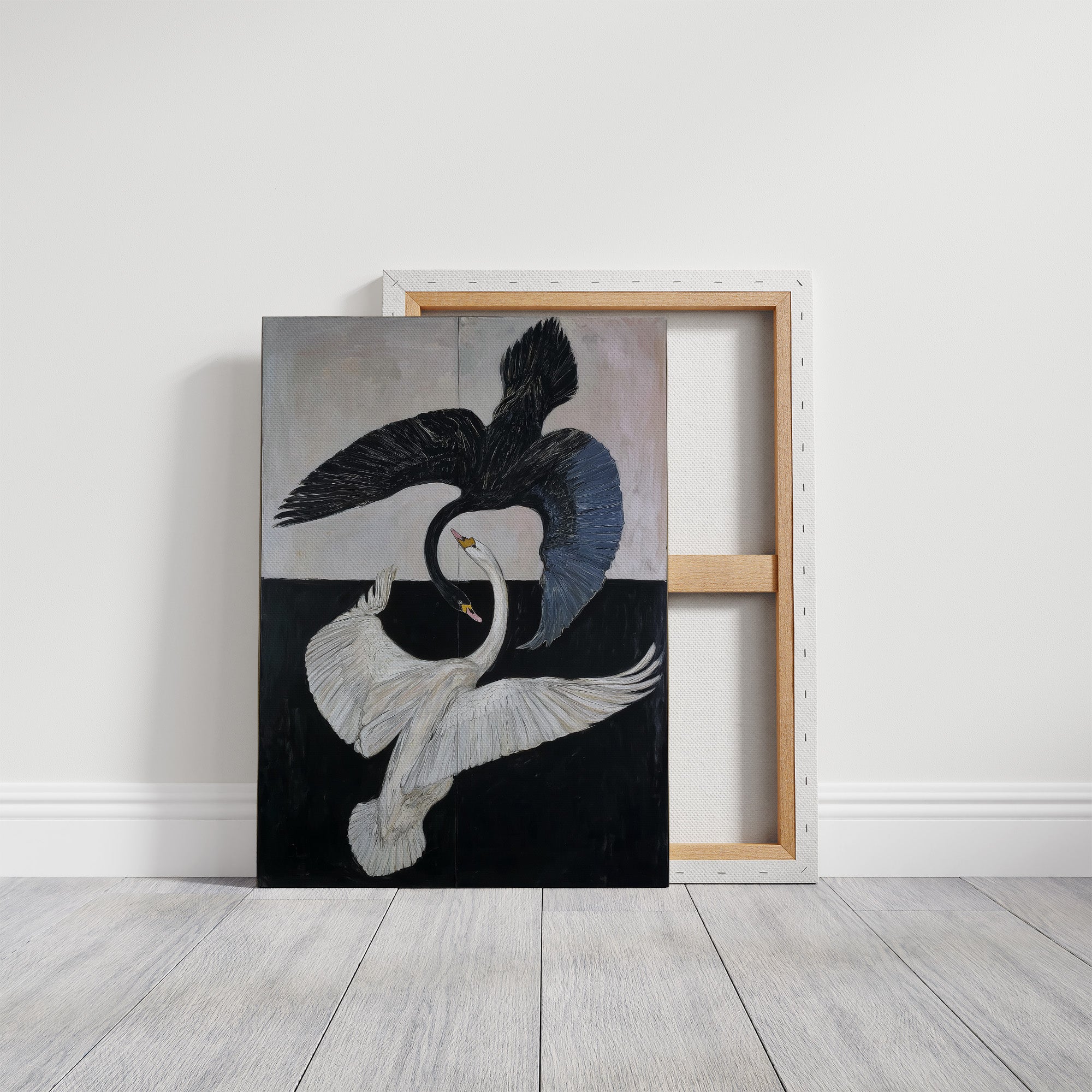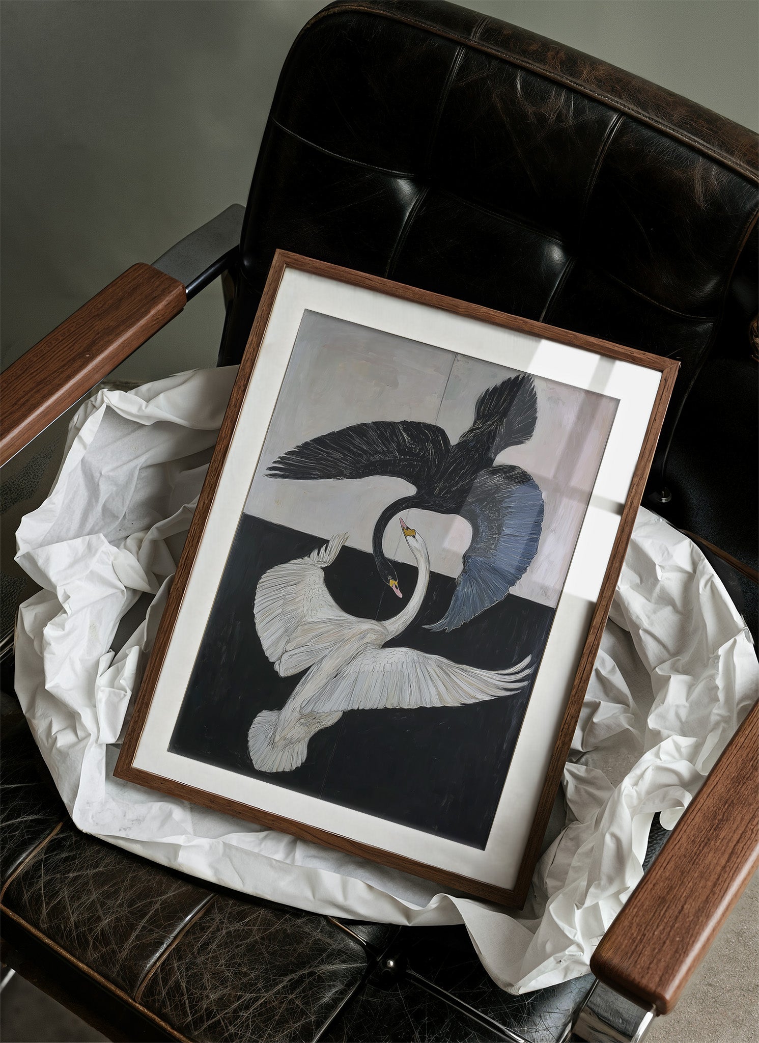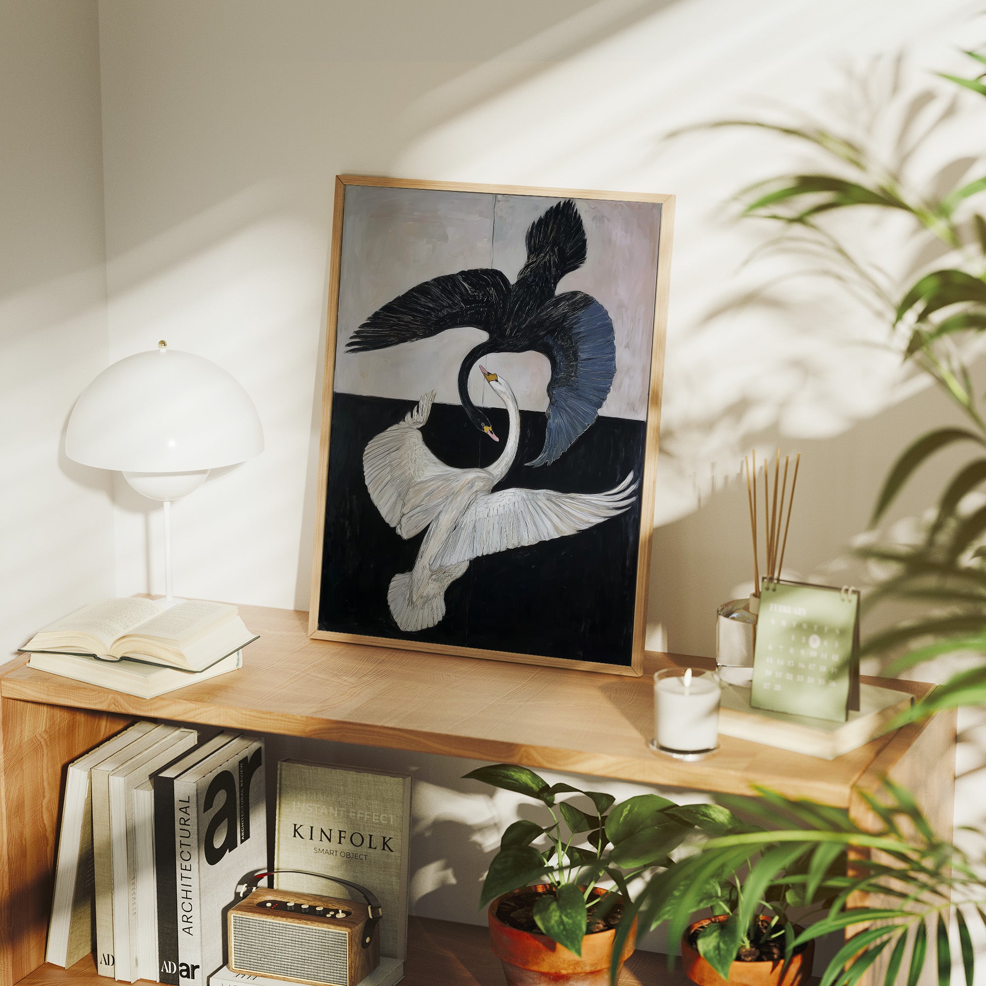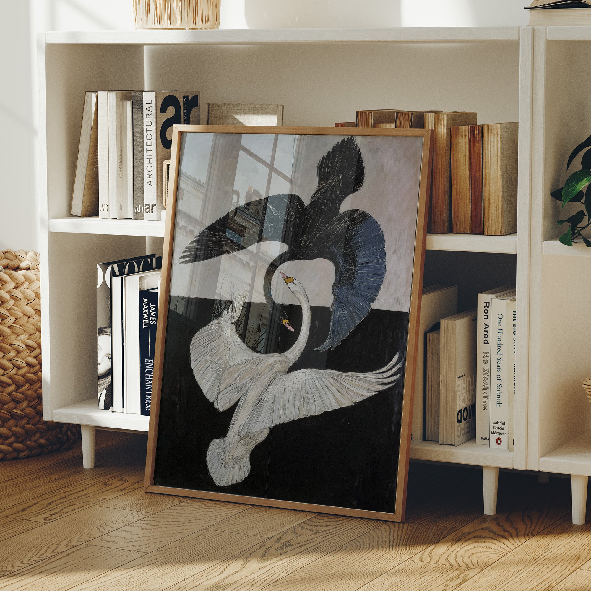 A striking contrast emerges as two cranes intertwine in an ethereal dance, their forms both delicate and powerful against a moody backdrop. The white crane's luminous feathers create a brilliant counterpoint to its darker companion, their synchronized movement capturing a moment of natural choreography. The dramatic composition speaks to the eternal dance of light and shadow, strength and grace. This sophisticated piece would elevate a modern living room or bring artistic gravitas to a minimalist dining space, its contemporary style complementing both neutral and bold interior palettes.