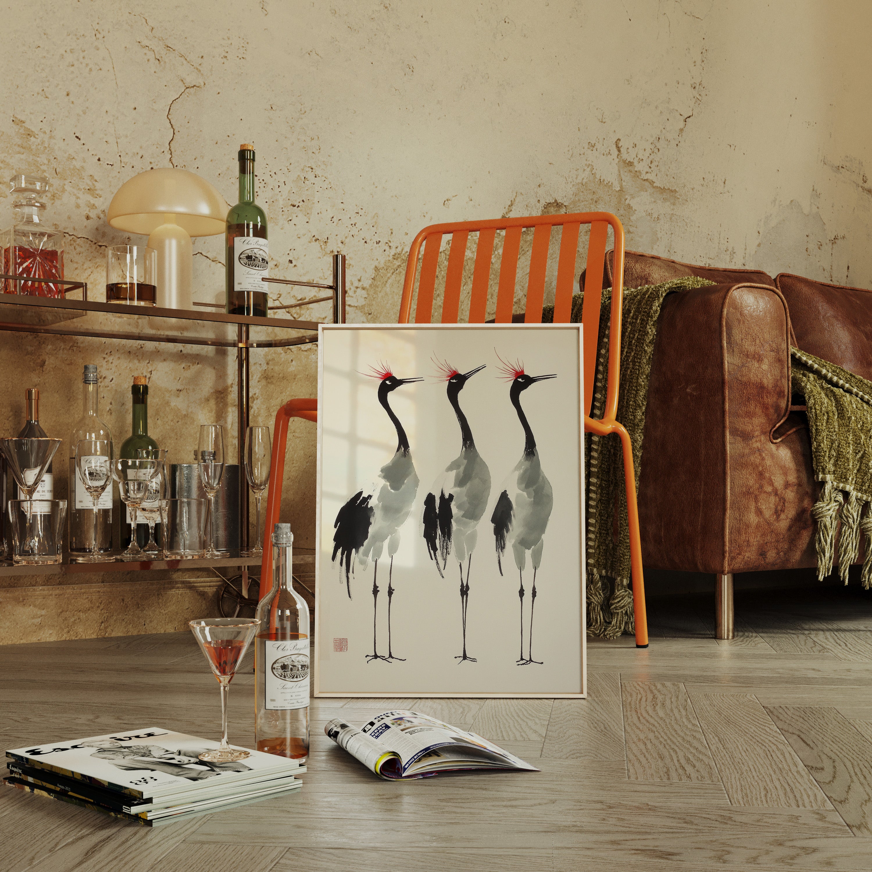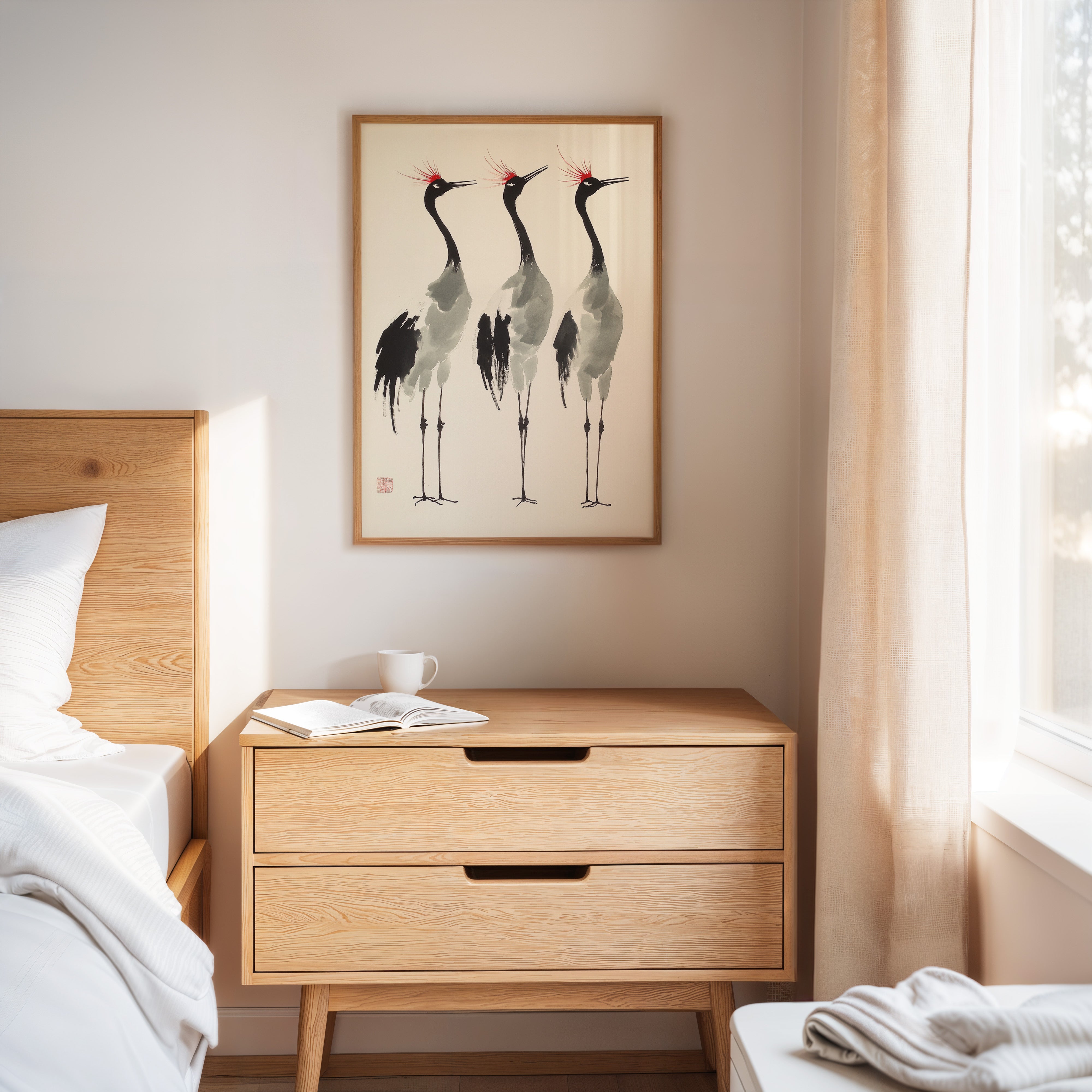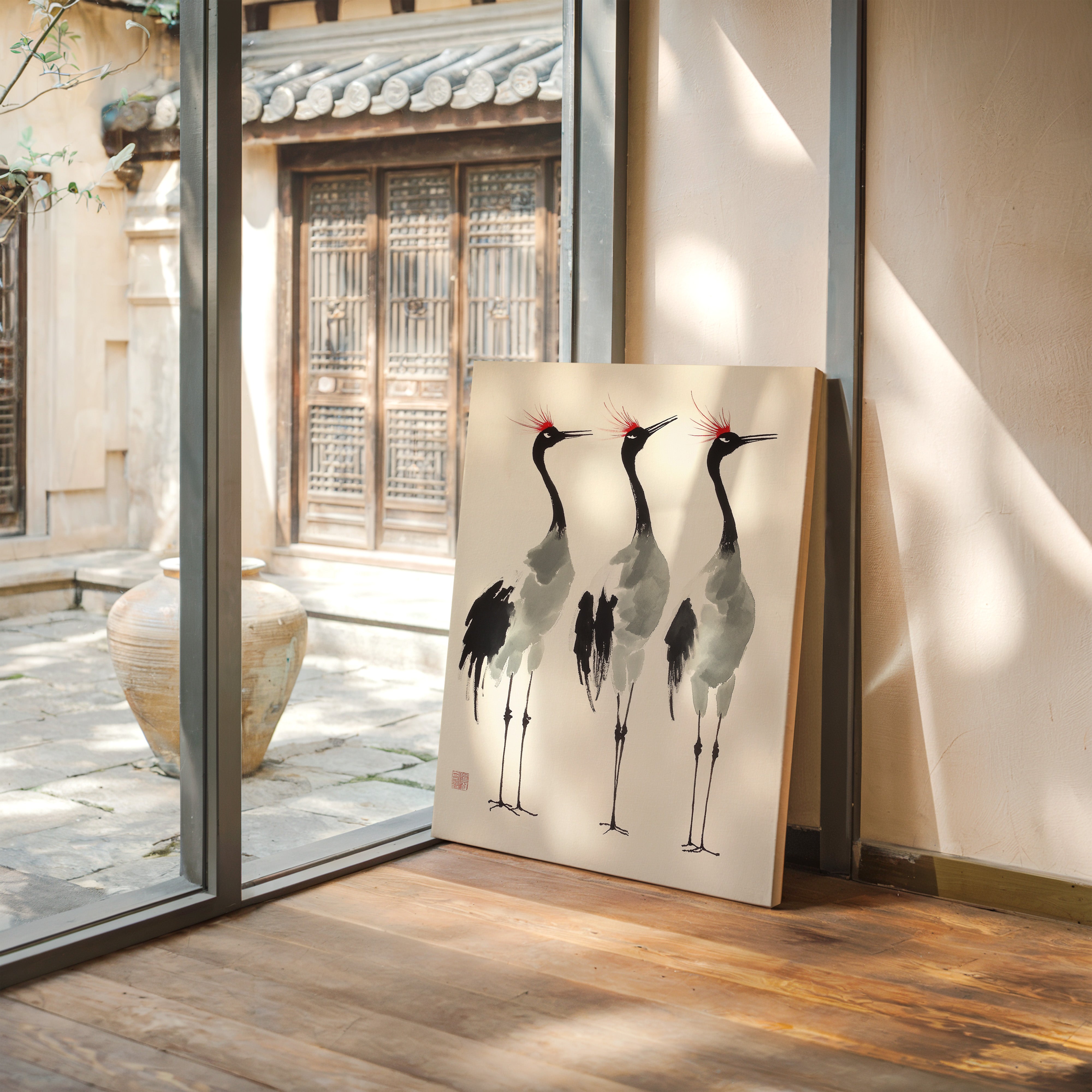 Step into a world of serene elegance with 'Graceful Cranes,' where the delicate brushstrokes capture the timeless beauty of three poised cranes. This artwork embodies the essence of Japandi minimalism, blending understated black and white tones with a touch of vibrant red, evoking a sense of tranquility and balance. Perfectly suited for those who appreciate the art of wabi-sabi and the organic beauty of nature, this piece will transform your living space into a cozy sanctuary of mindfulness and calm. SKU: AL0031