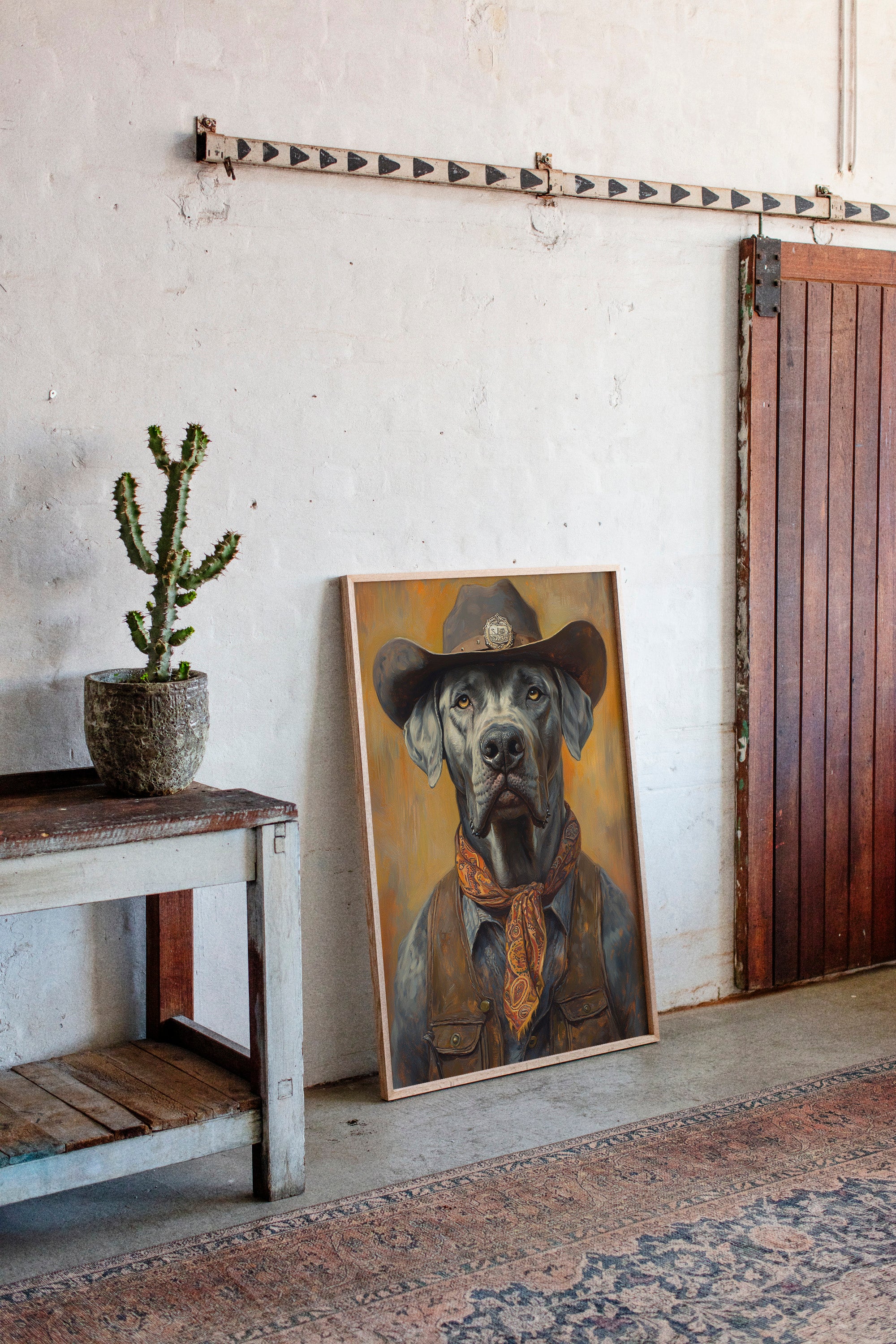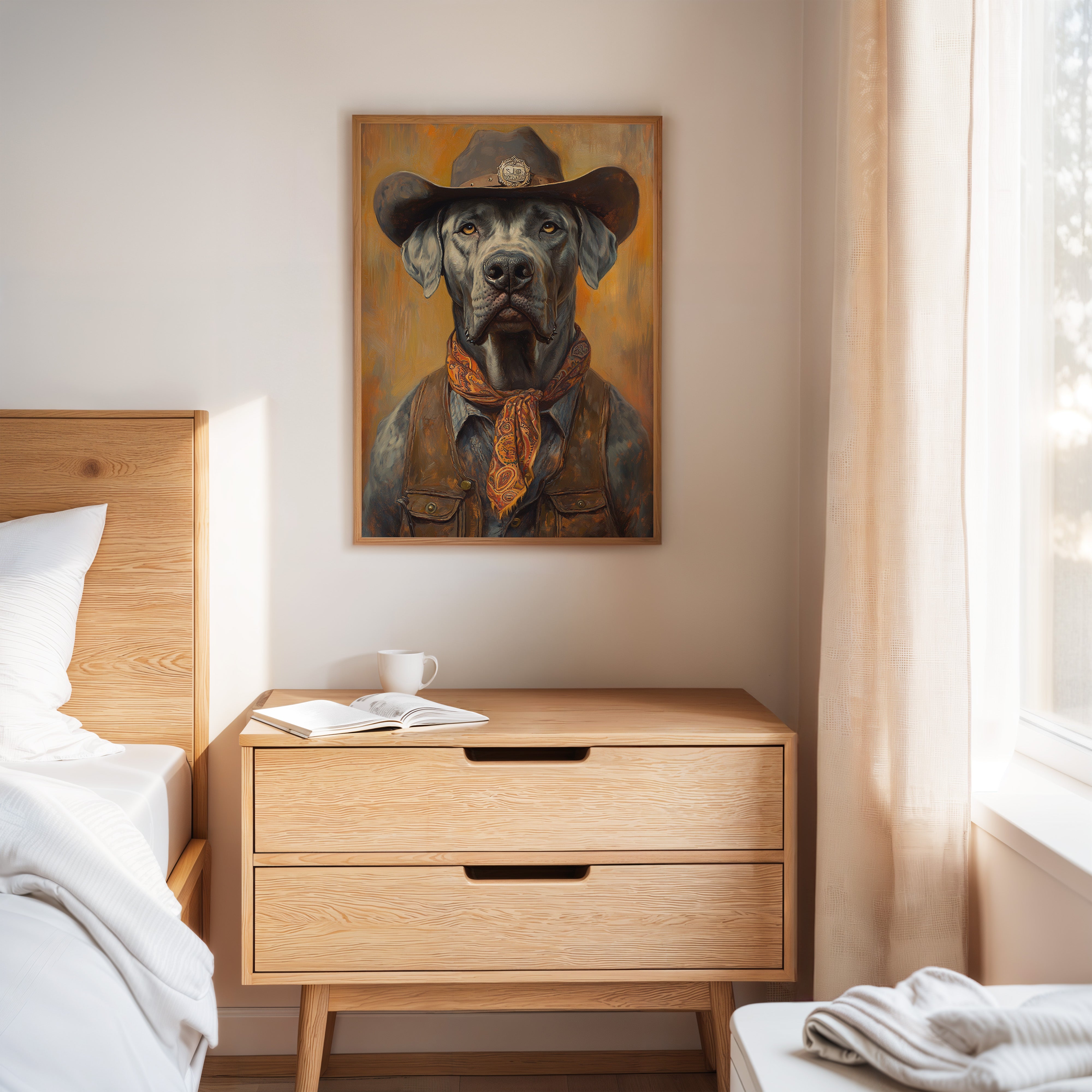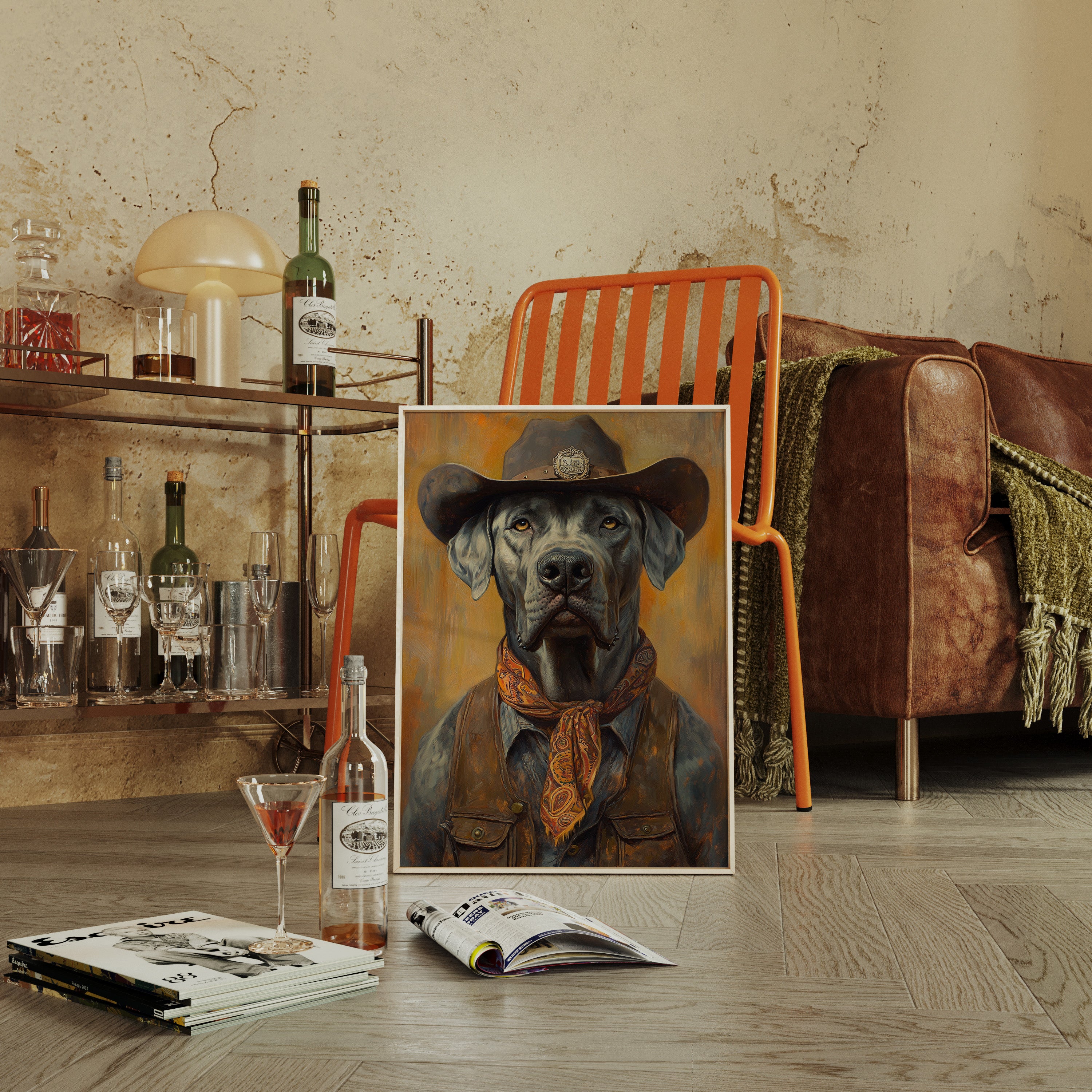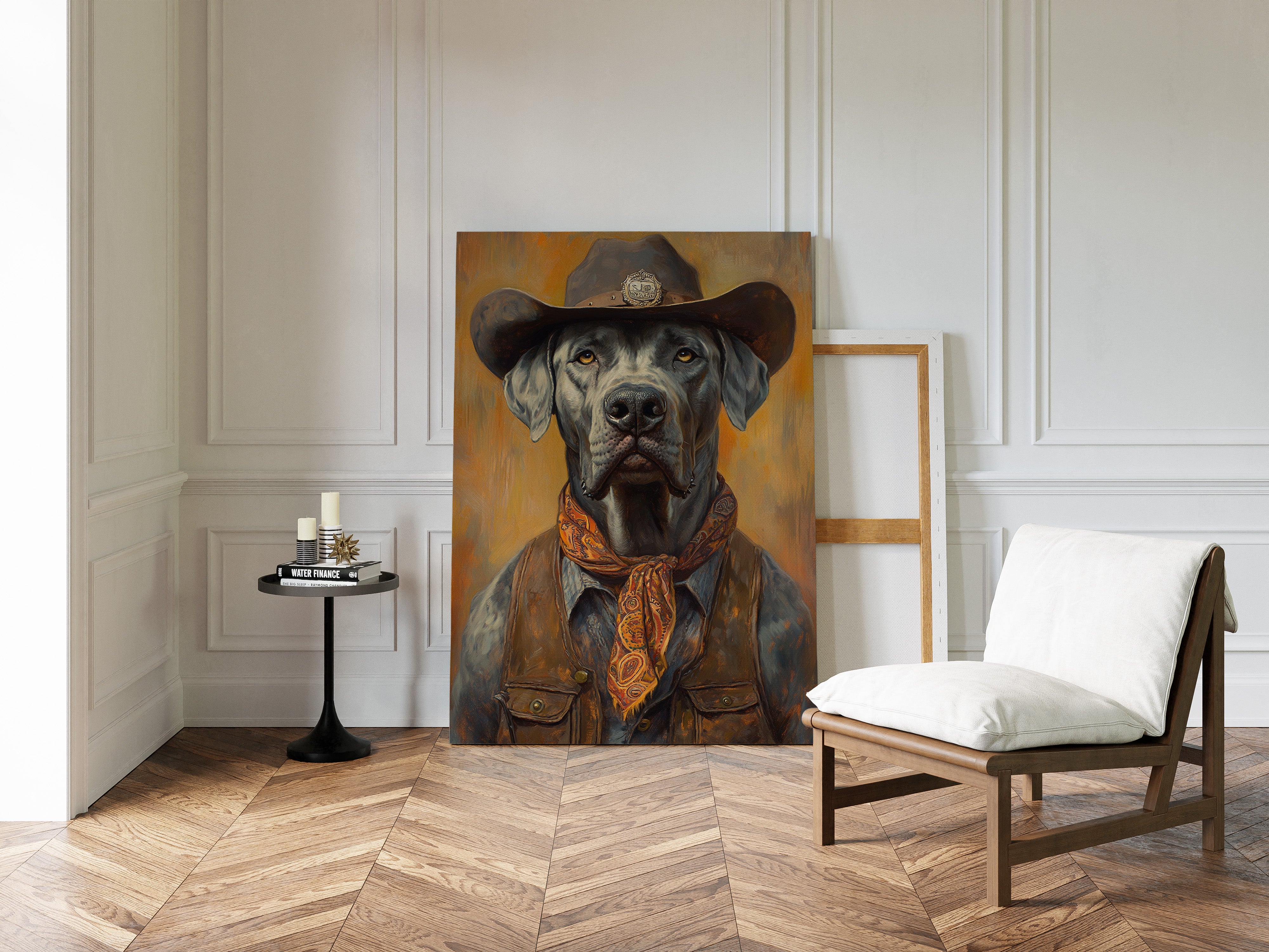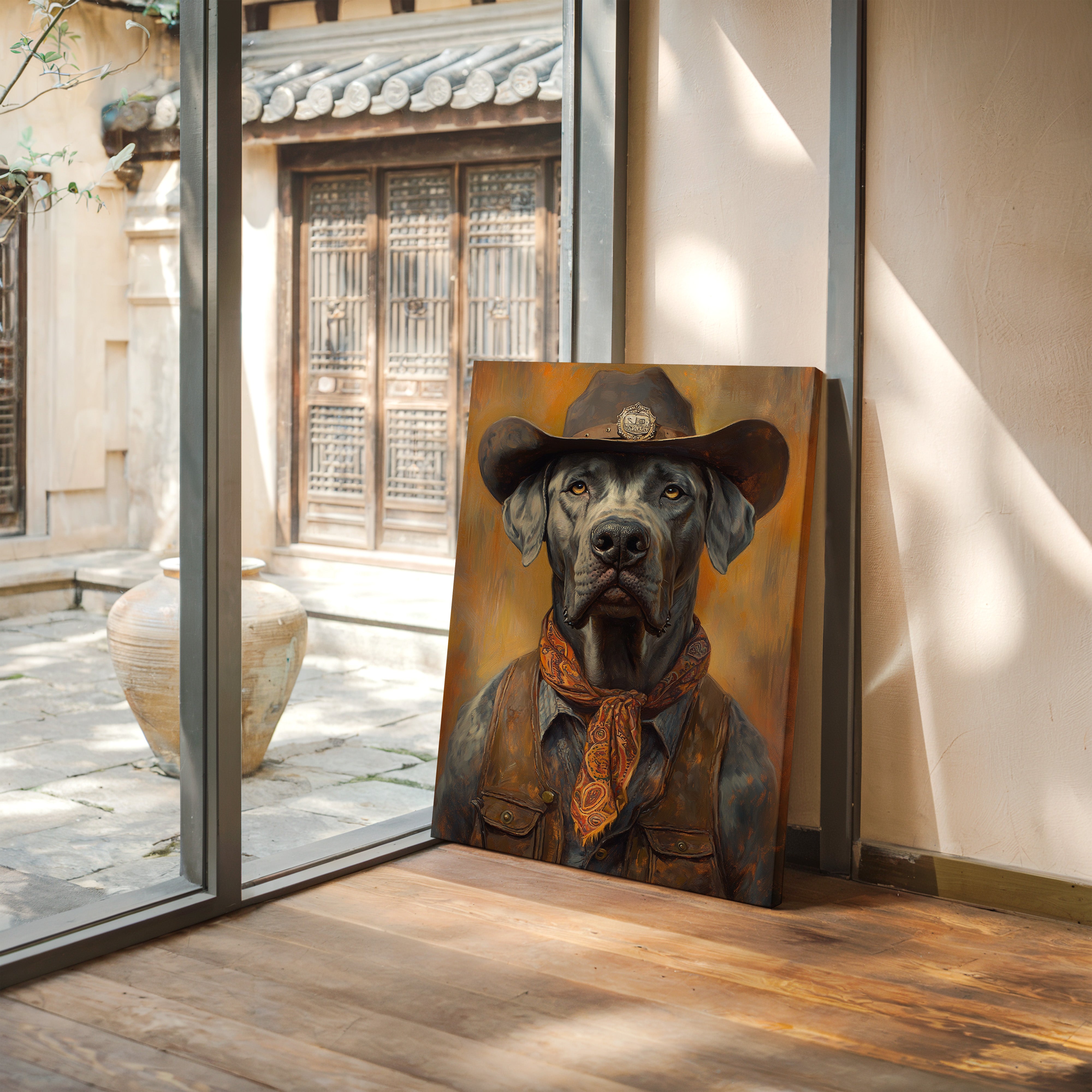 A towering presence in hat and leather, this stoic Great Dane commands respect under the sunbaked skies of the Old West.