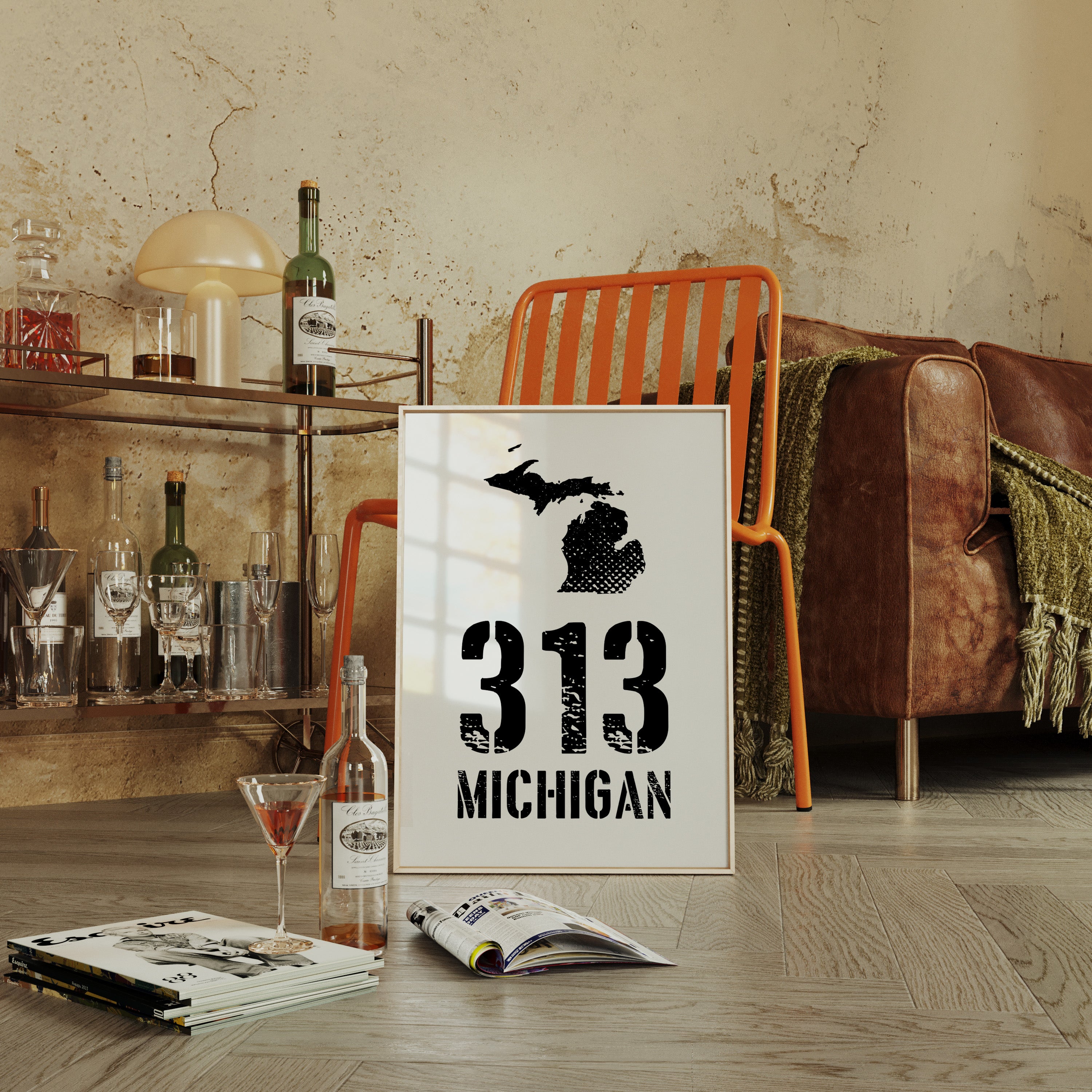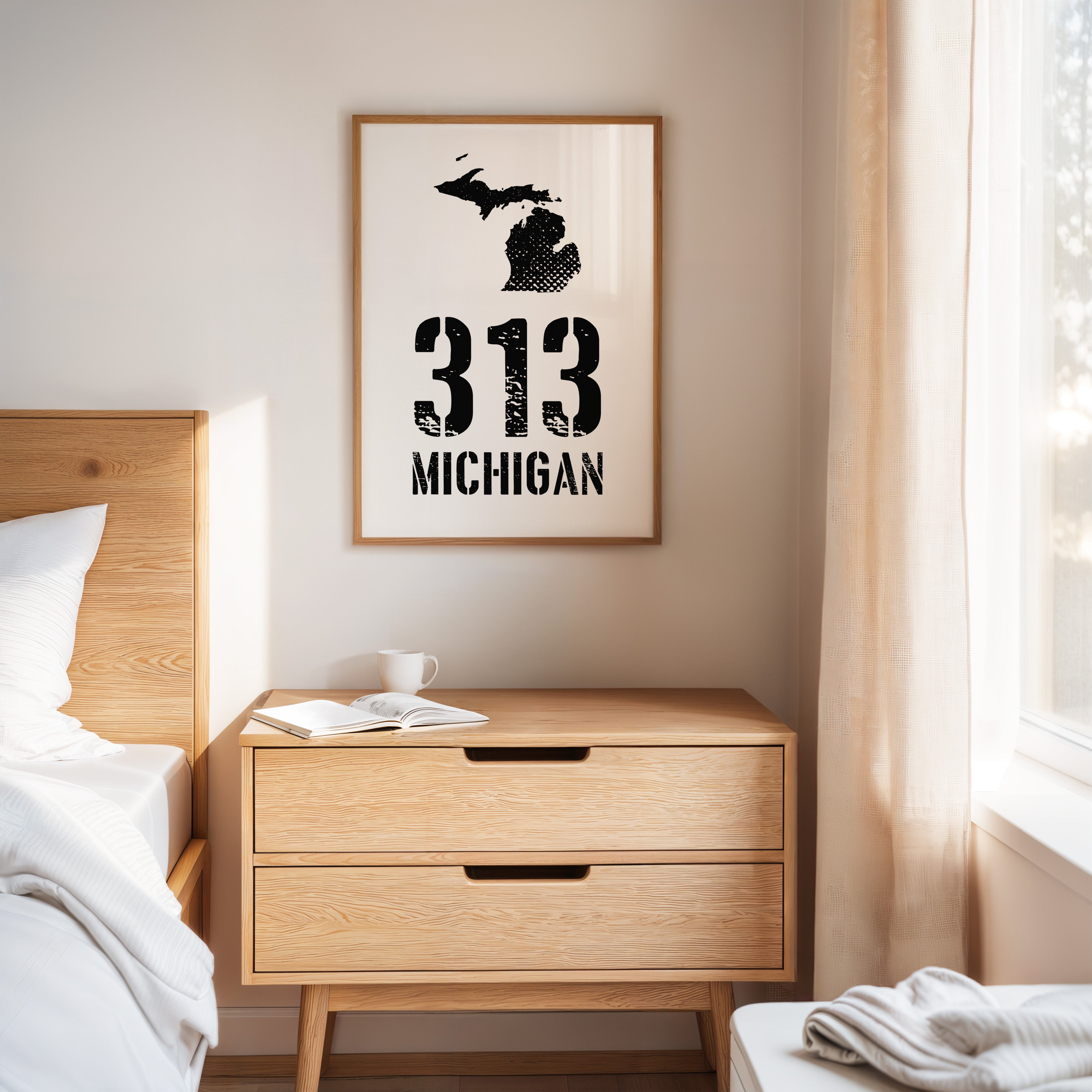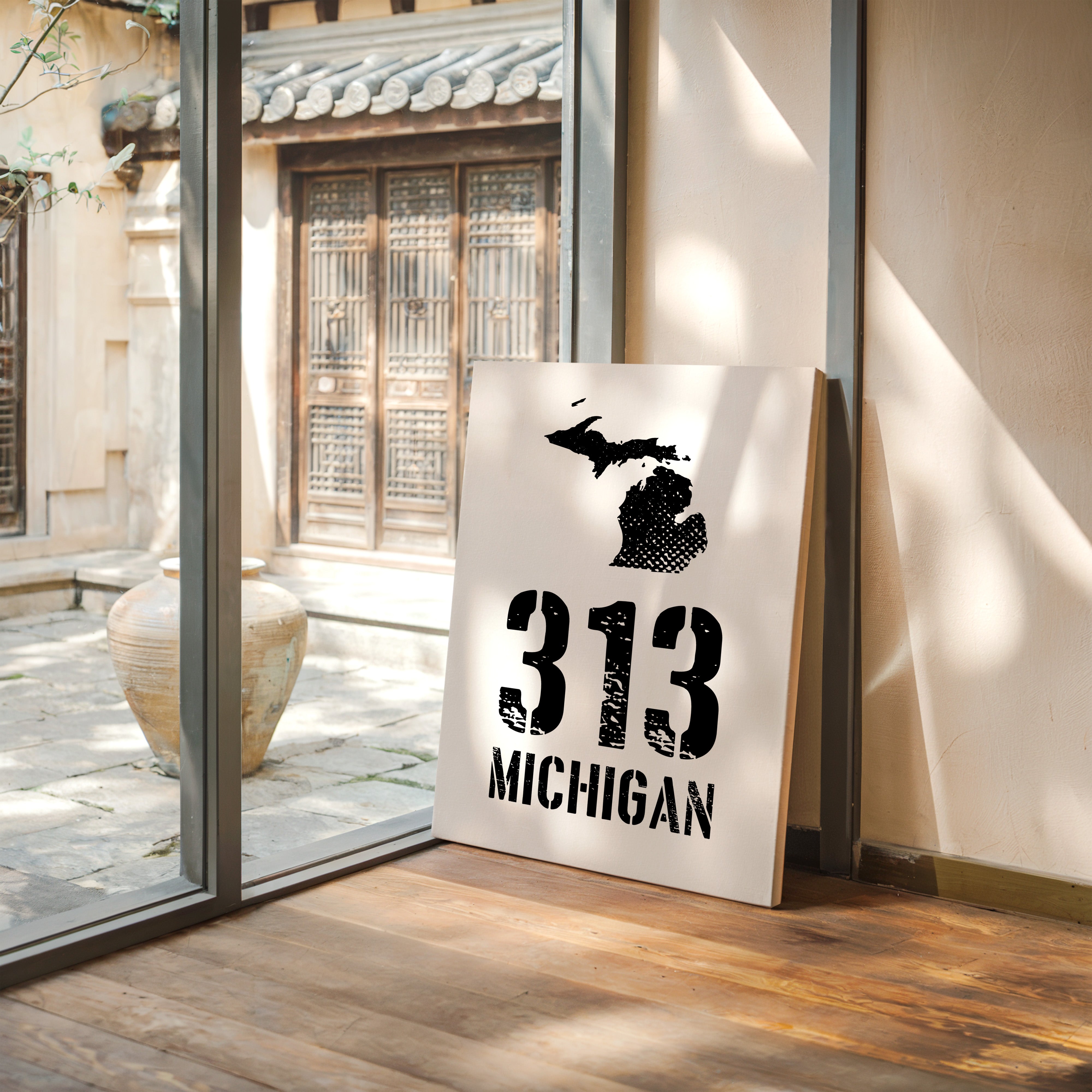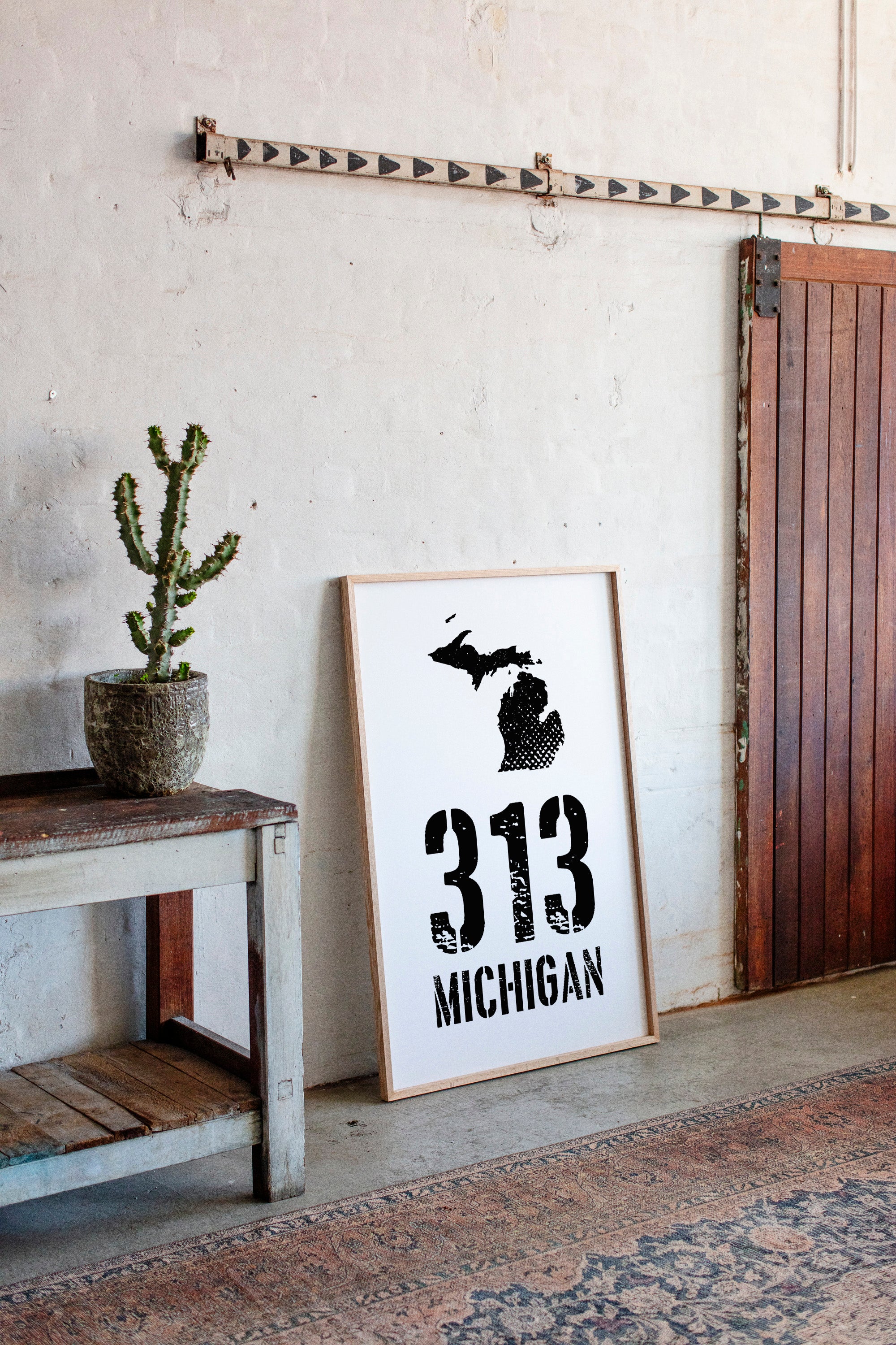 Sharp black against pristine white, a story of identity emerges through stark contrasts and bold typography. This piece from our Contemporary collection marries industrial strength with geographic pride. The distressed texture of the numbers speaks to Michigan's rich manufacturing heritage, while the clean silhouette of the state floats above like a banner of belonging. Every worn edge and deliberate mark builds character, creating a powerful statement of place and purpose. Perfect for adding a bold graphic punch to modern offices, industrial-style lofts, or any space celebrating local pride.