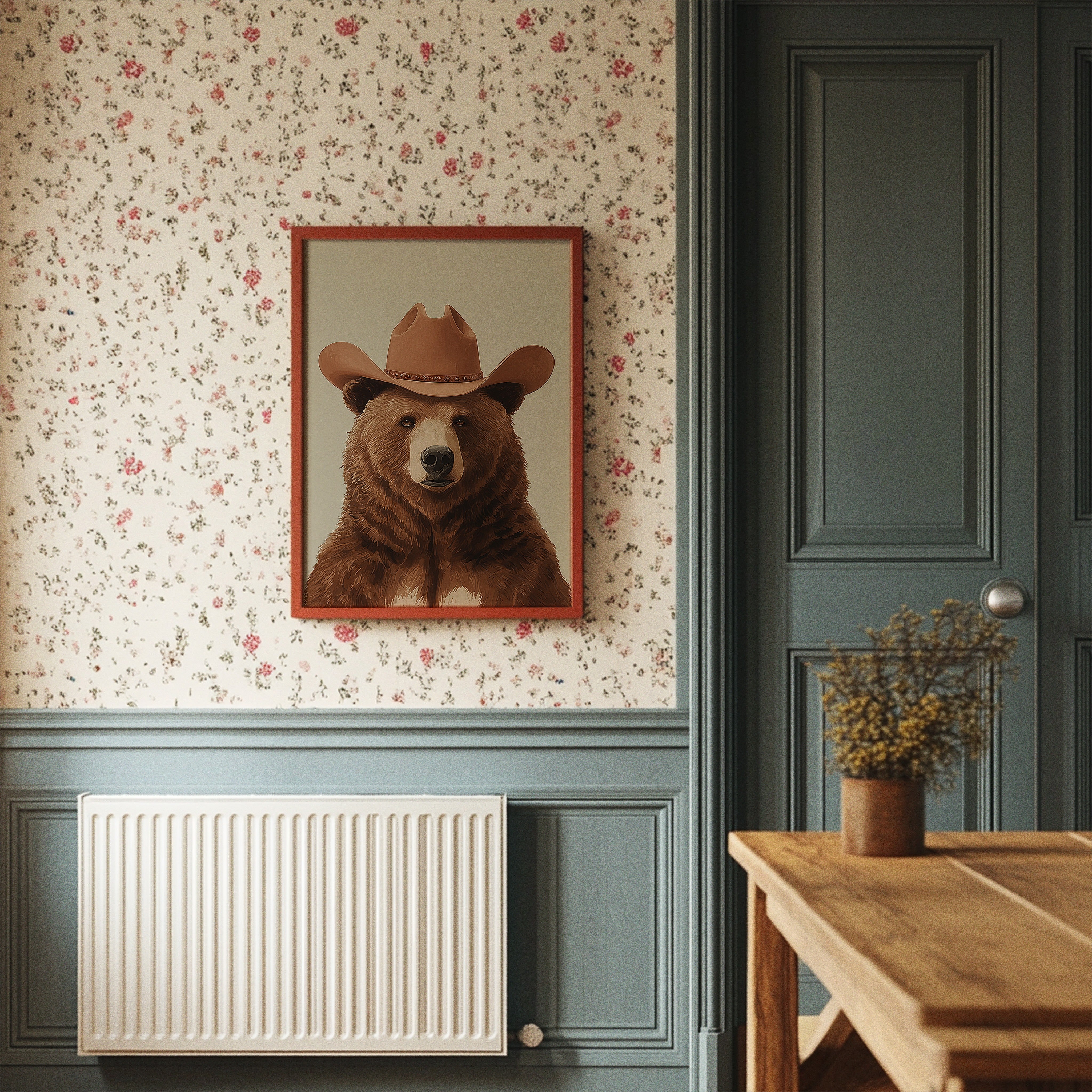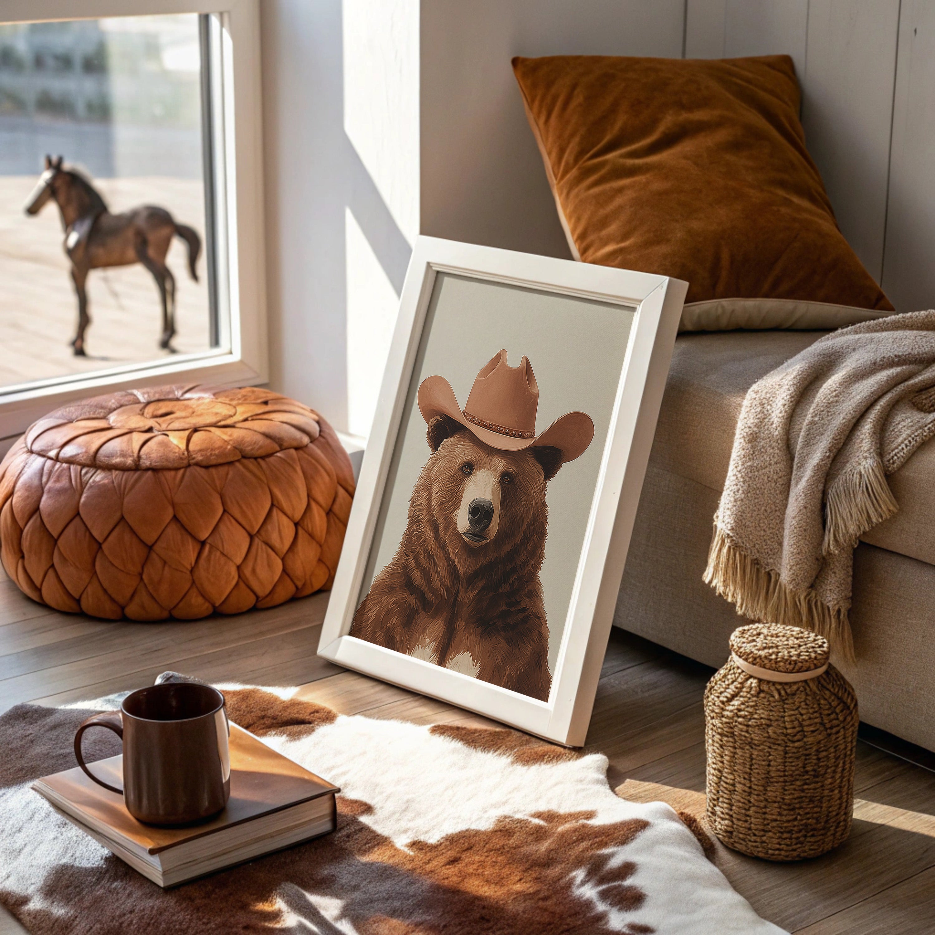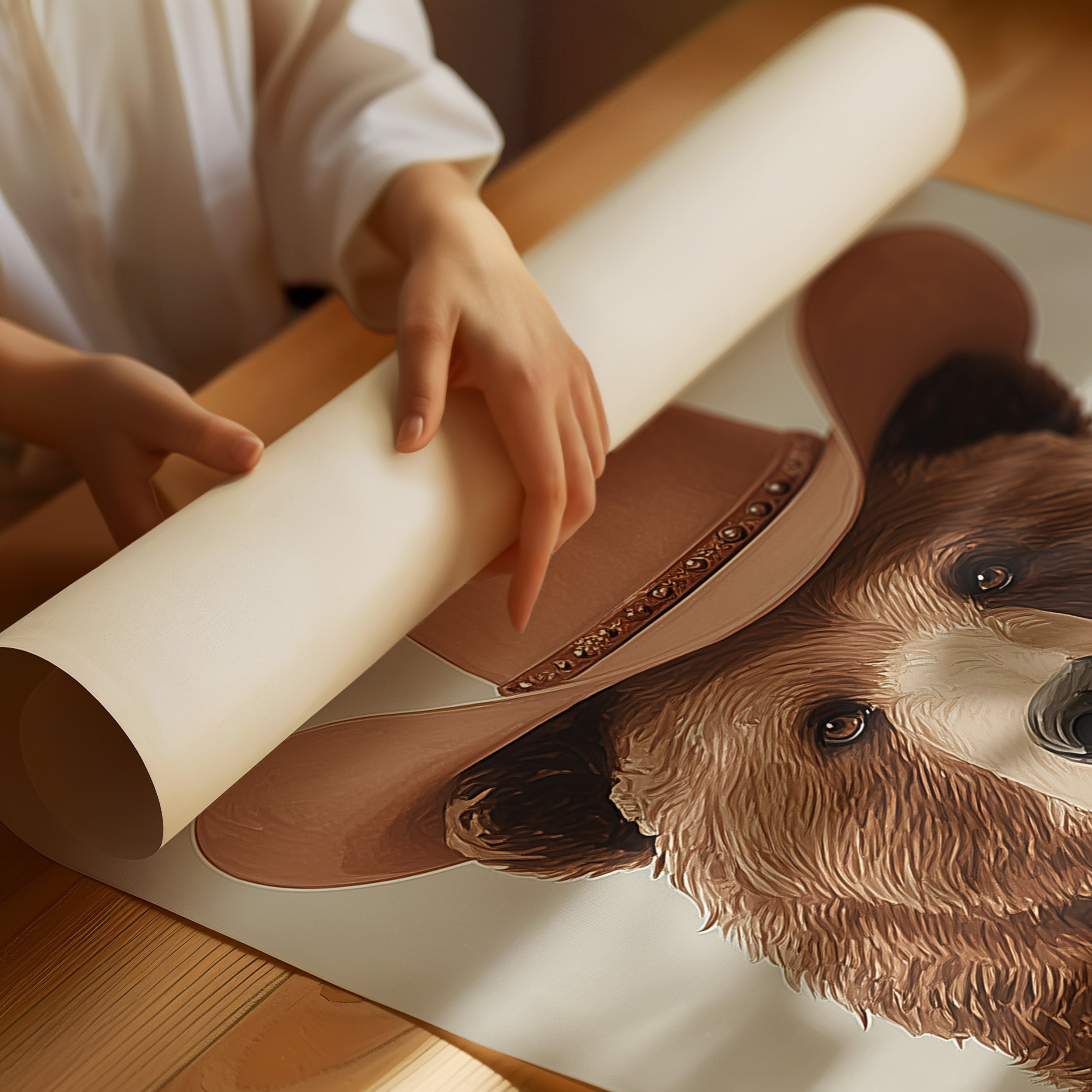 A gentle giant peers out from beneath the brim of a studded leather cowboy hat, his expression both commanding and curiously tender. This playful portrait from our Contemporary collection masterfully blends whimsy with wilderness. Rich browns cascade through the bear's thick fur, while the tan hat adds a touch of western charm, creating a delightful contrast between wild nature and human culture. Perfect for adding a splash of sophisticated humor to a den, office, or children's room. Each glance reveals new details in this charming celebration of western wildlife.