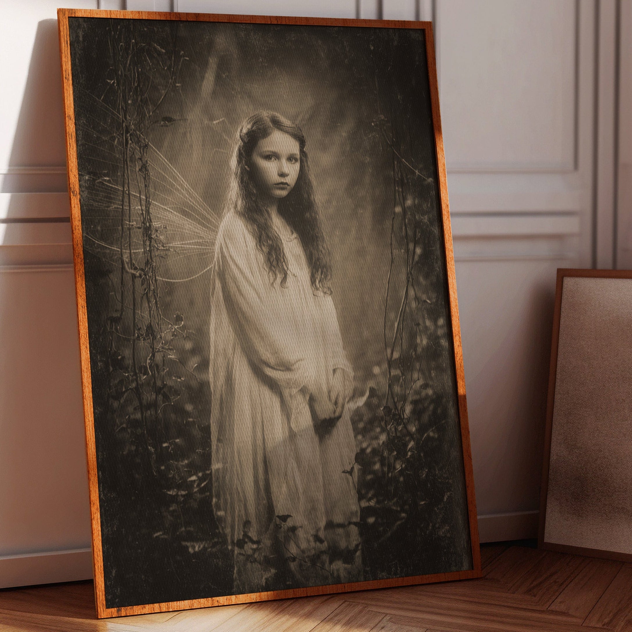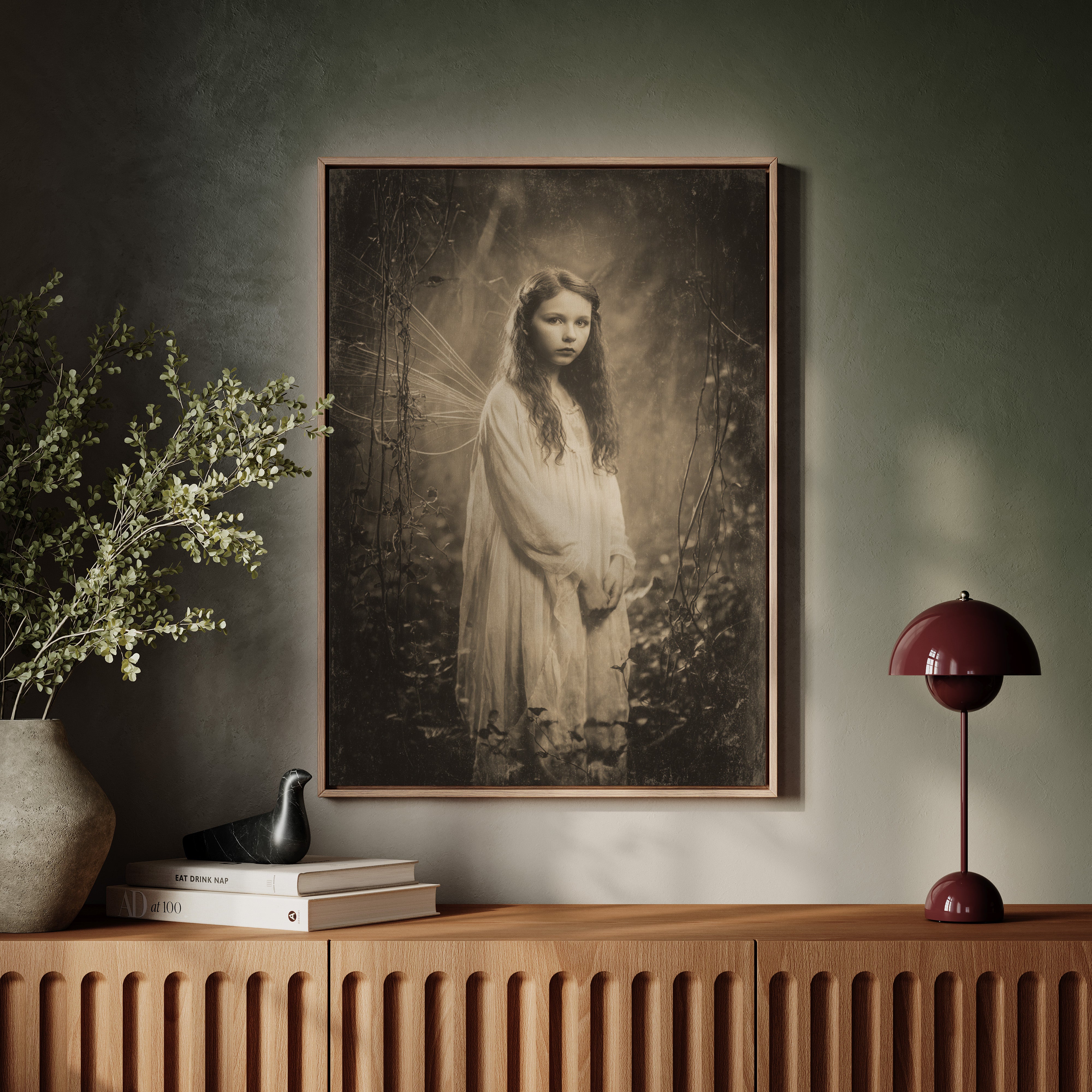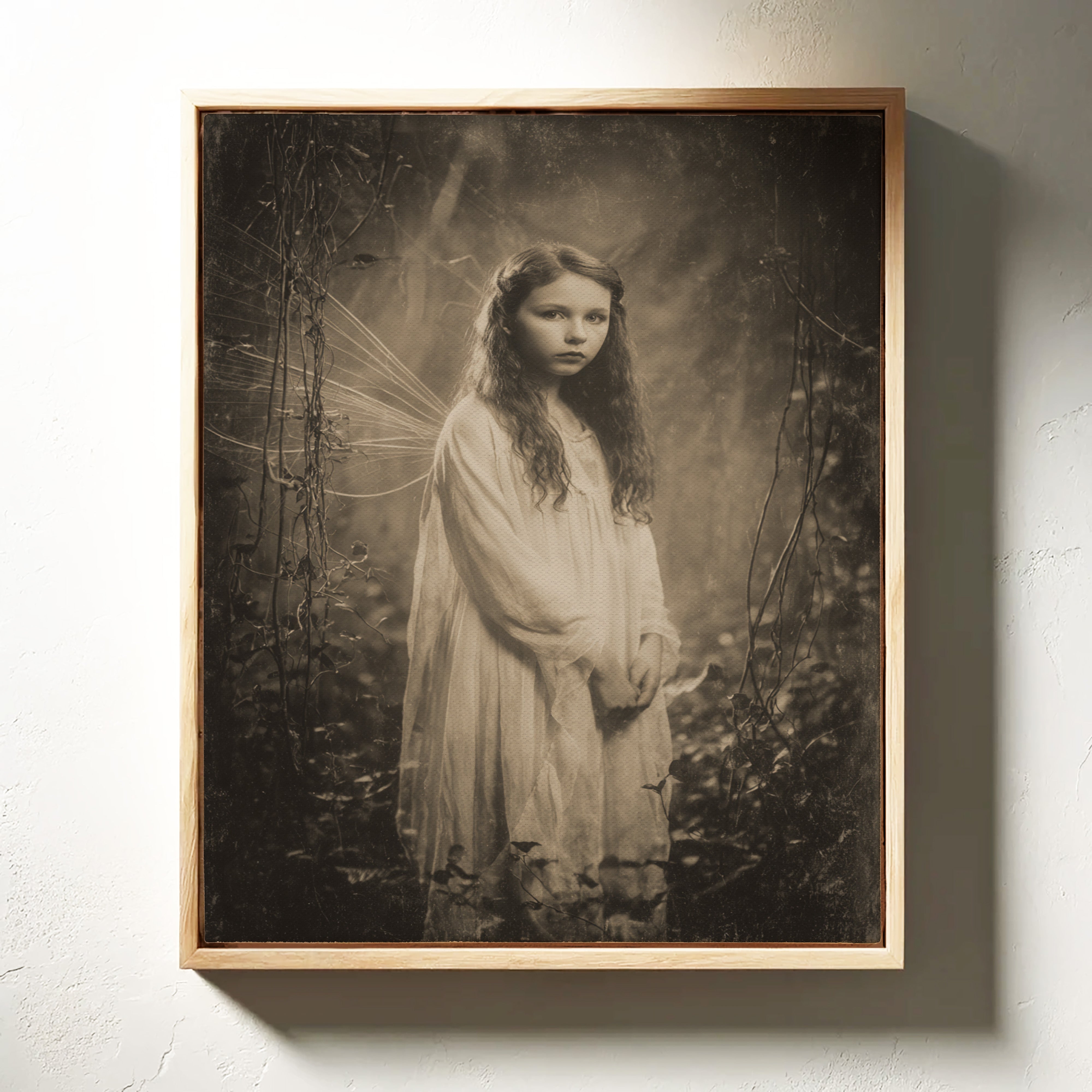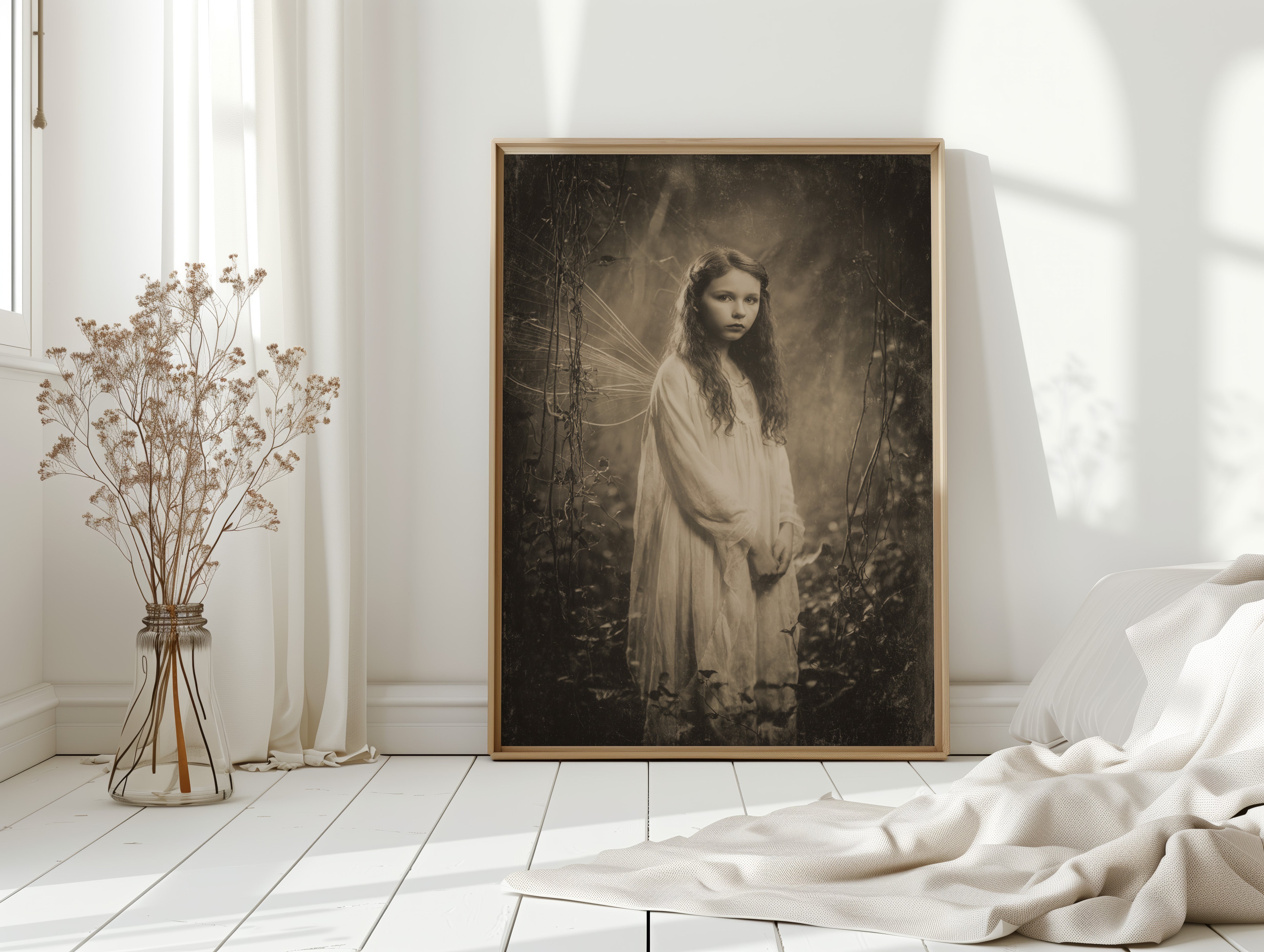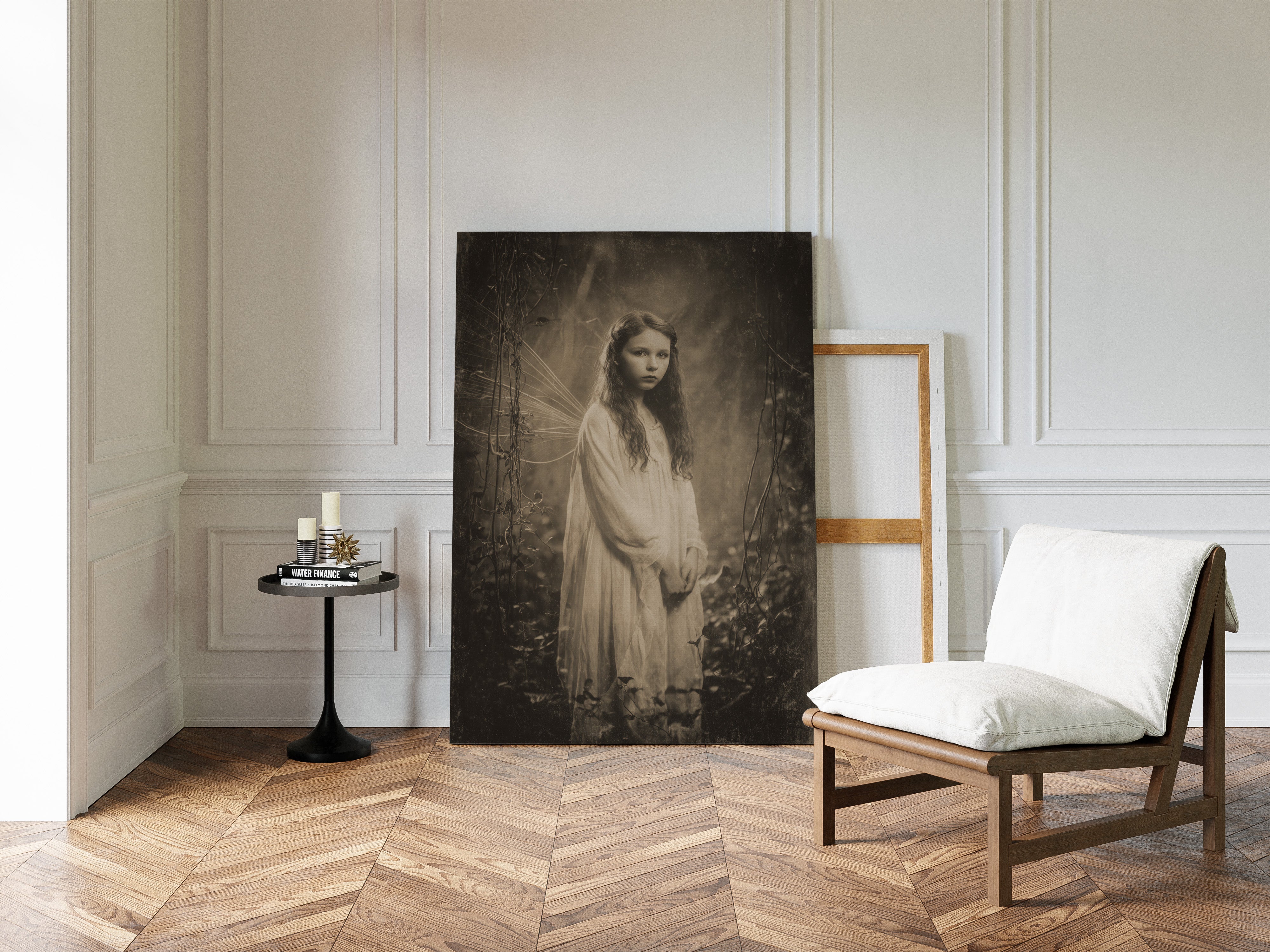 In a realm where magic lingers, a young figure stands, embodying both innocence and strength. This piece captures the essence of the 'Artisanal' collection, where craftsmanship meets ethereal beauty. The soft, flowing fabric of her gown contrasts with the intricate vines encircling her, creating a narrative of nature's embrace. Her solemn gaze invites you into a world of wonder and mystery, perfect for a cozy reading nook or a whimsical child's bedroom.