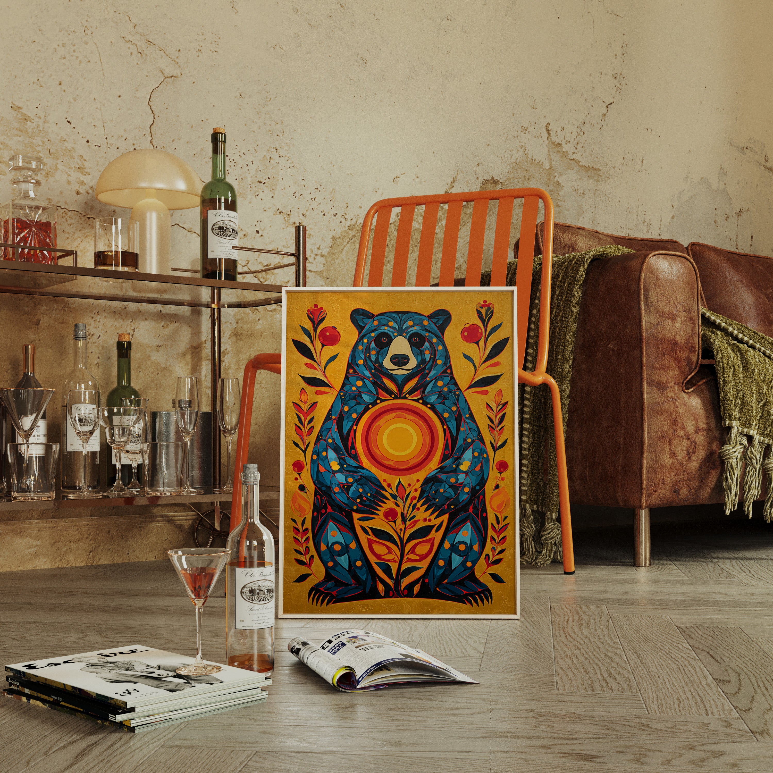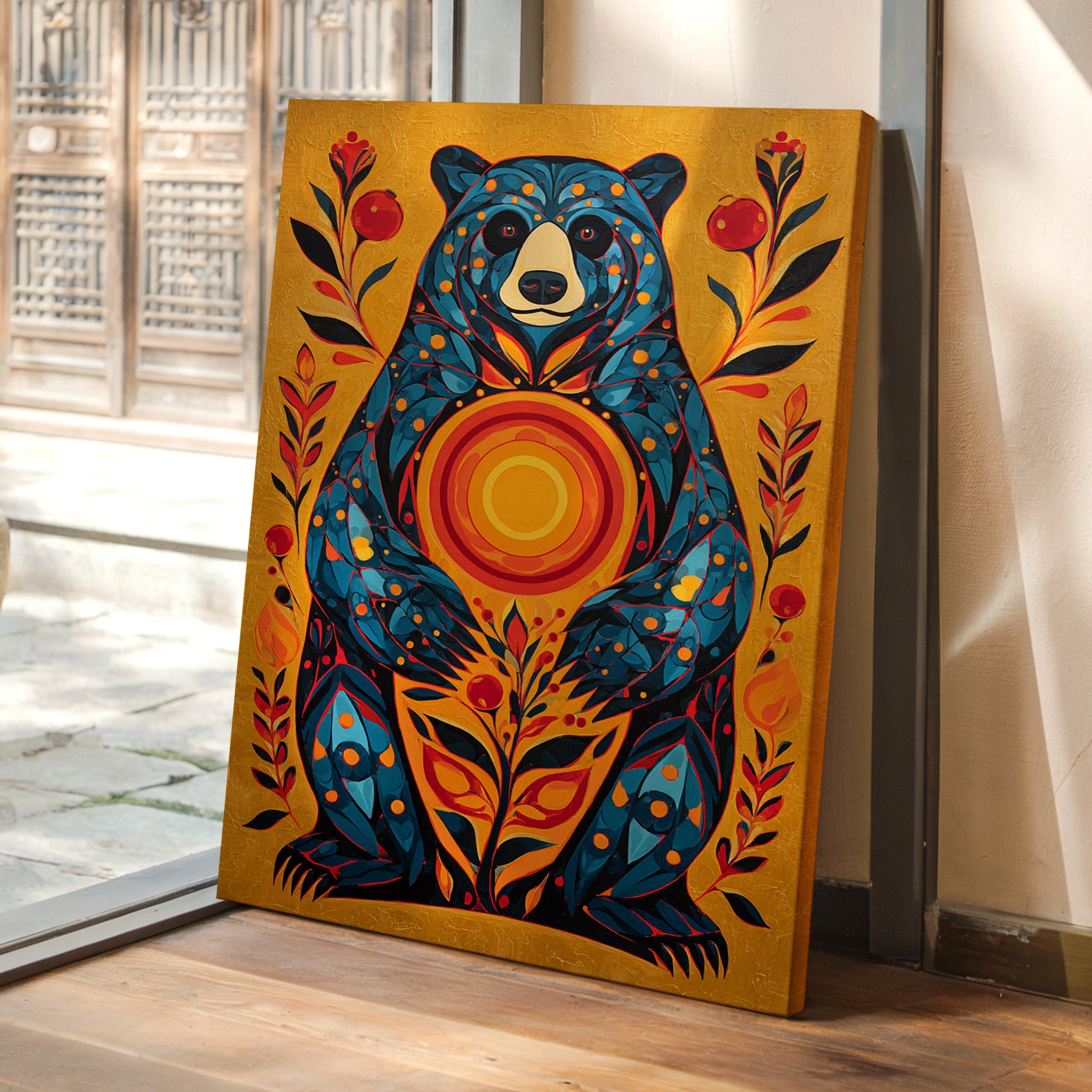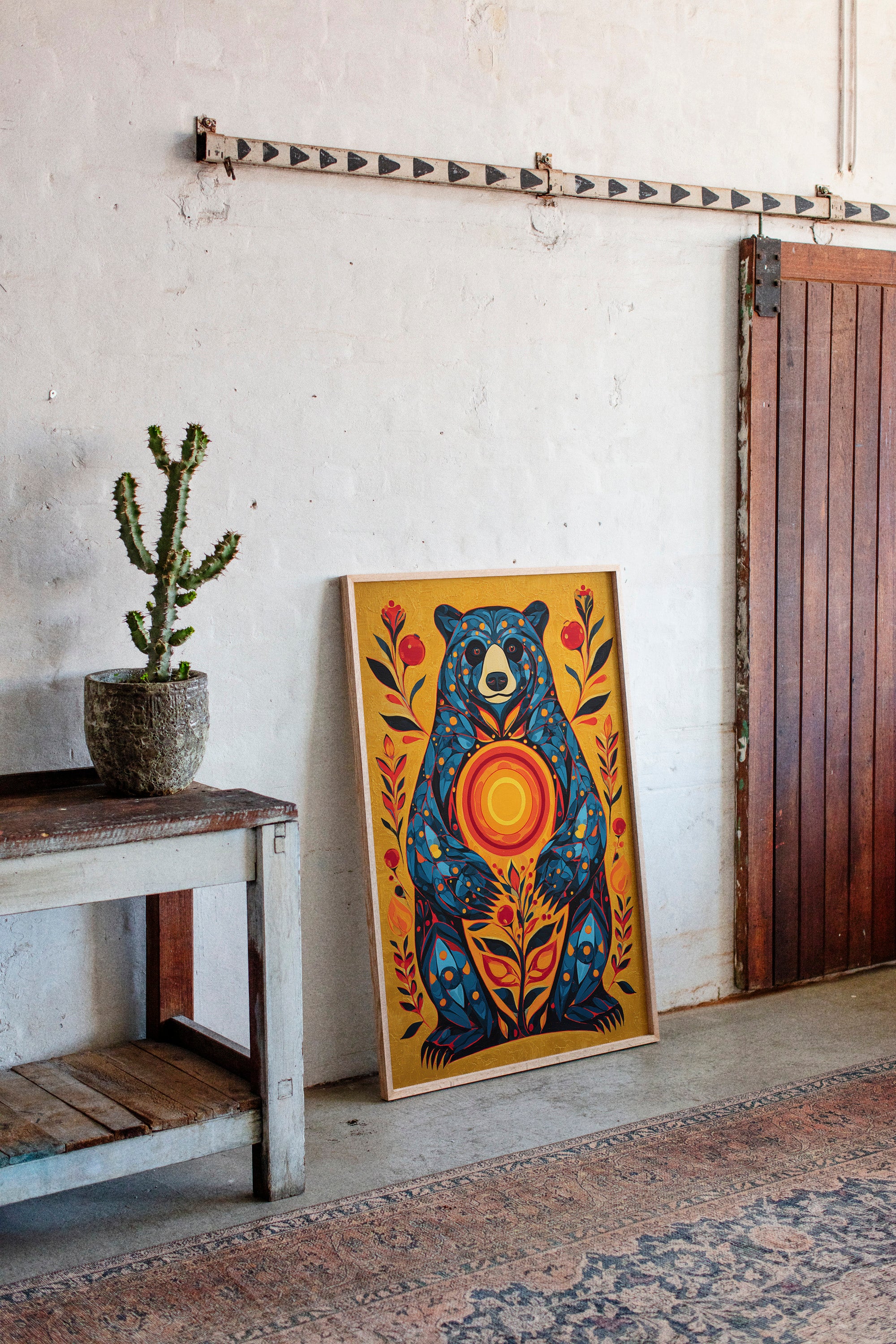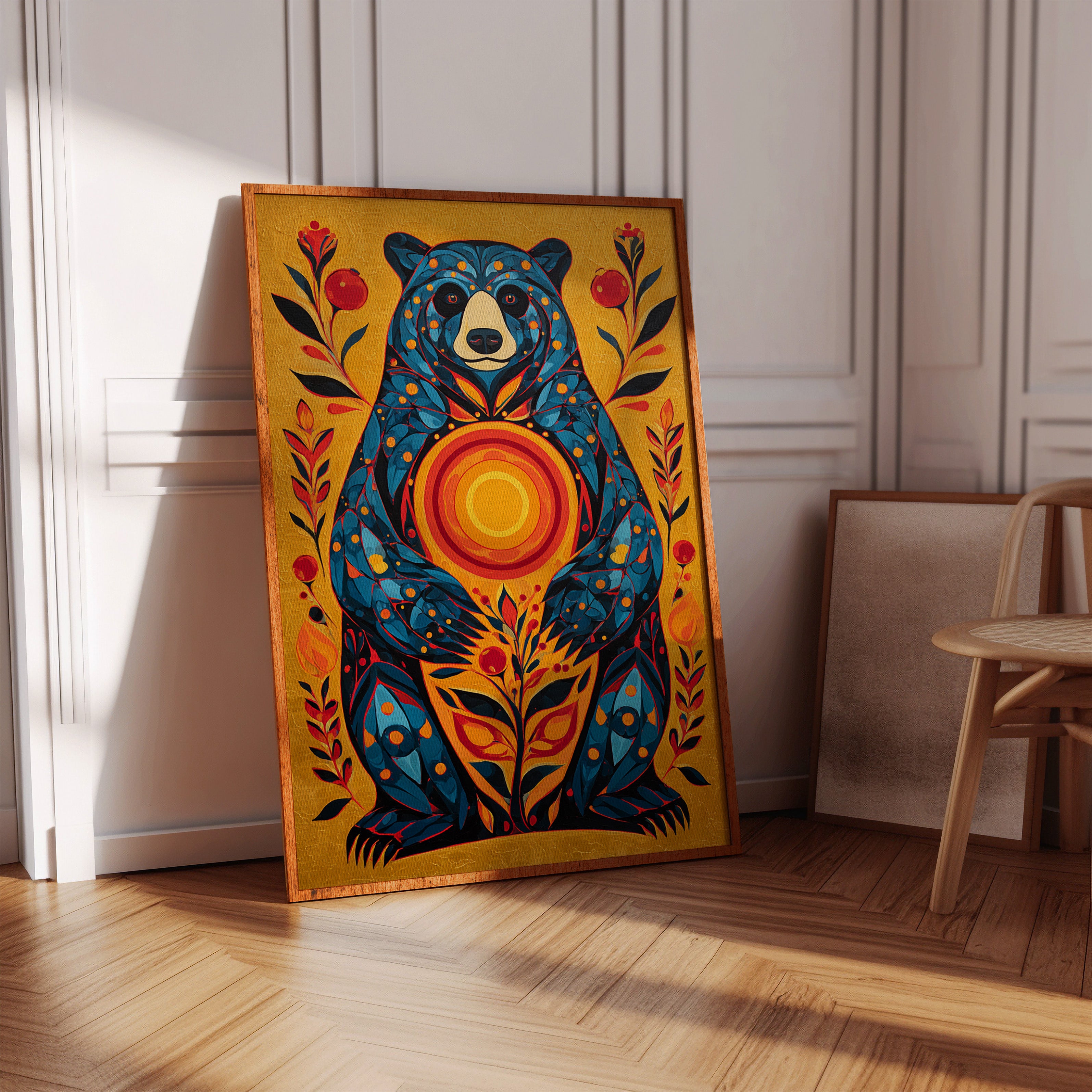 In a vibrant embrace of color, a bear sits steadfast, cradling the suns warmth within its grasp. This piece embodies the essence of the Artisanal collection, where tradition meets vivid imagination. With intricate patterns of blue and fiery orange, the bear symbolizes strength and nurturing, surrounded by flora that bursts with life, inviting contemplation of nature's harmony. Ideal for a cozy reading nook or a lively kitchen space, it brings a sense of comfort and connection to the wild.