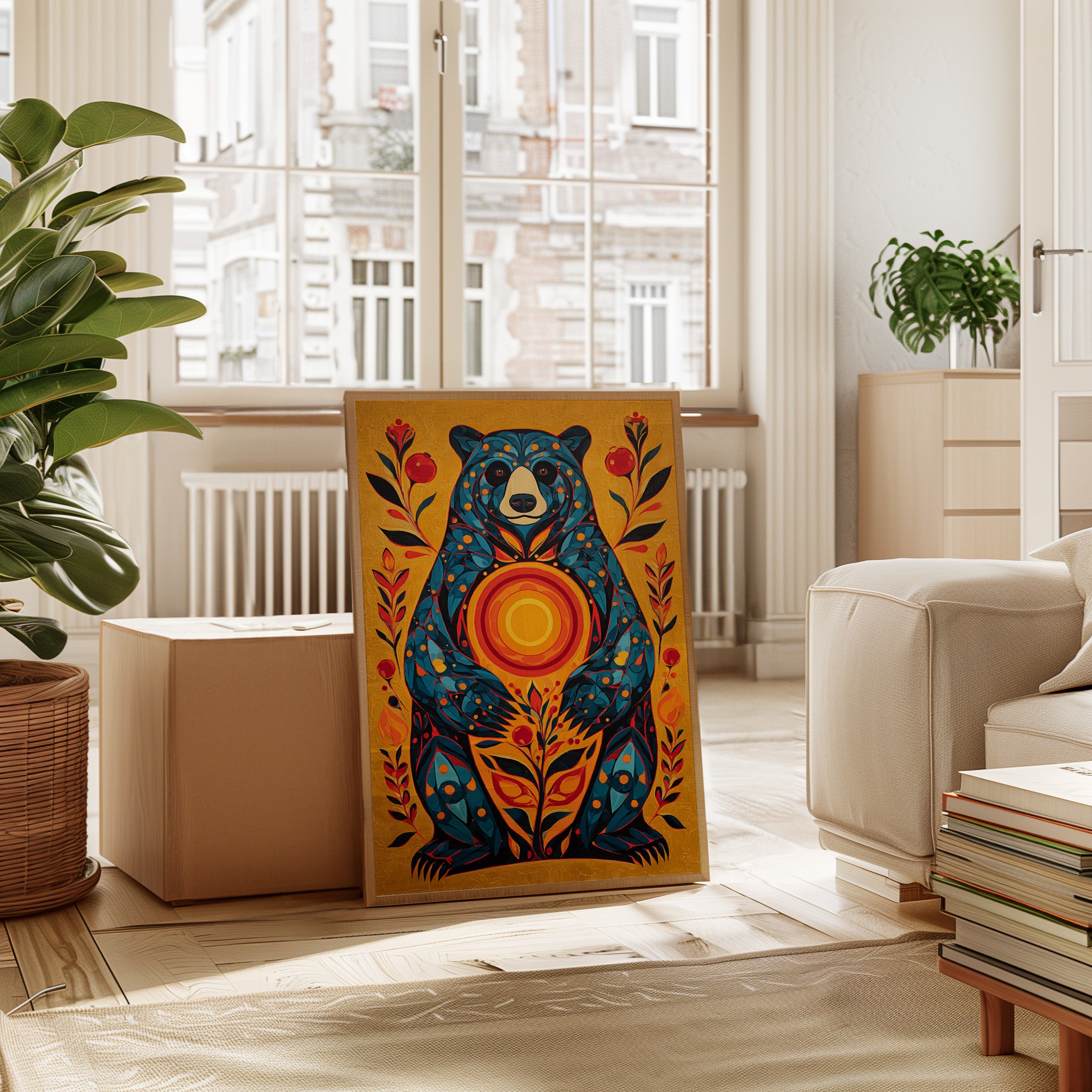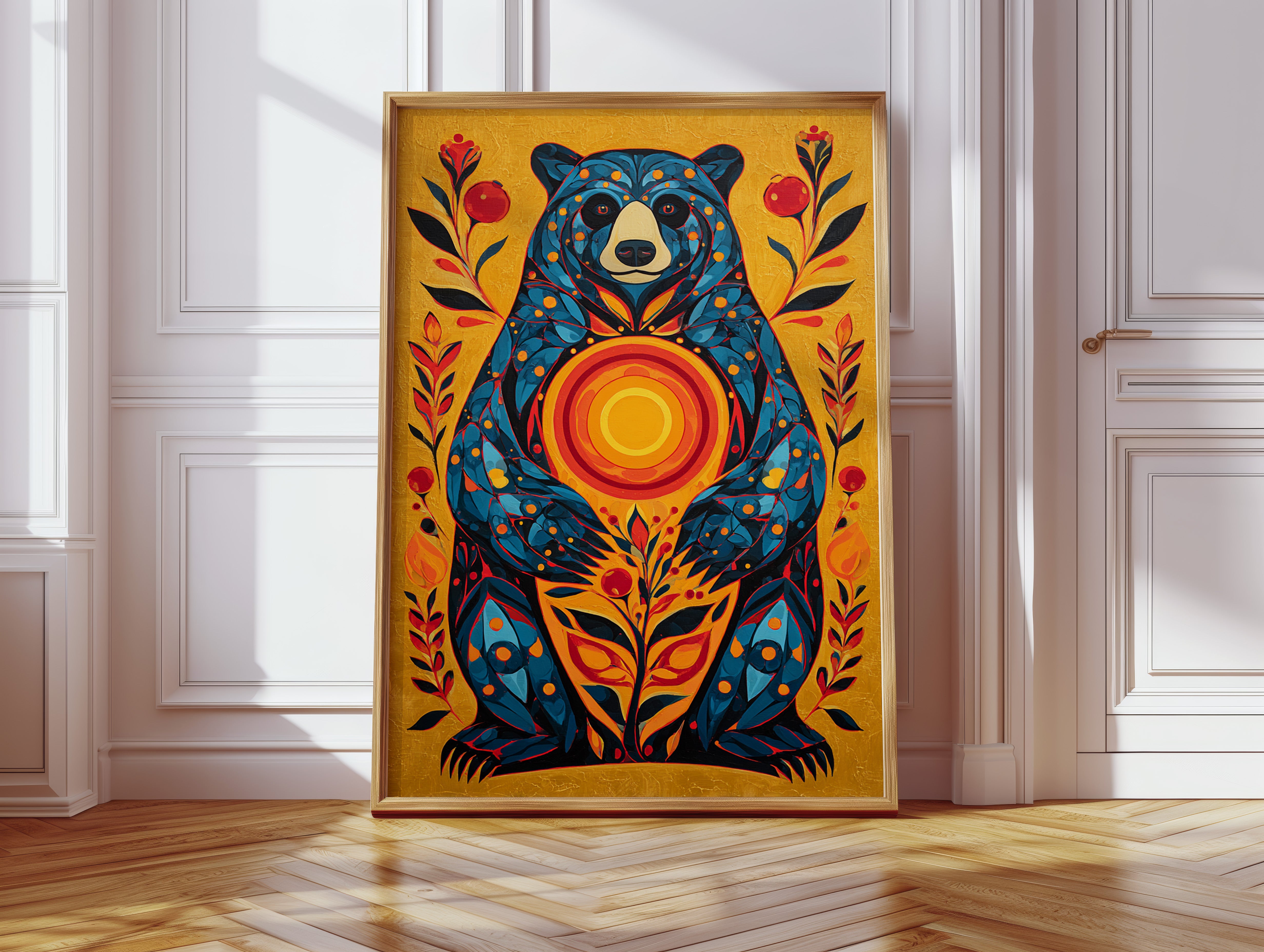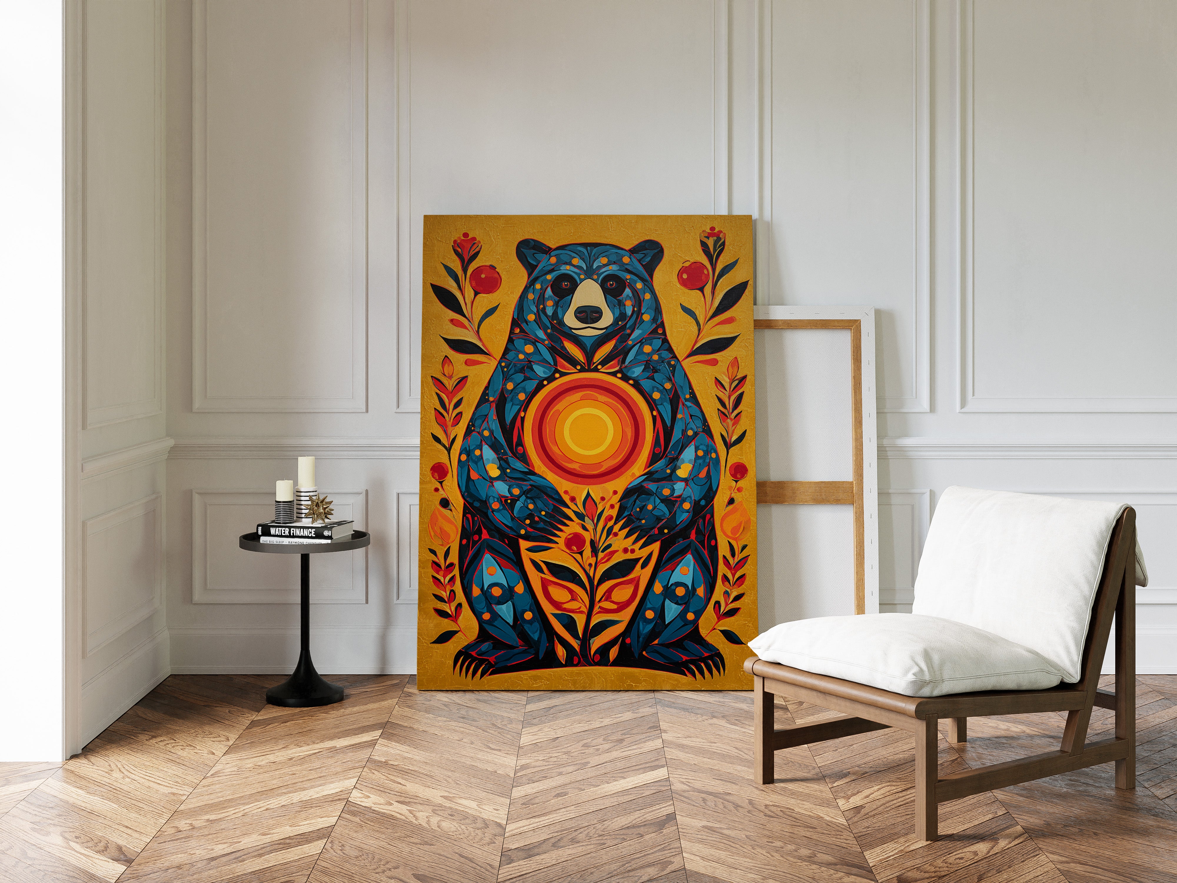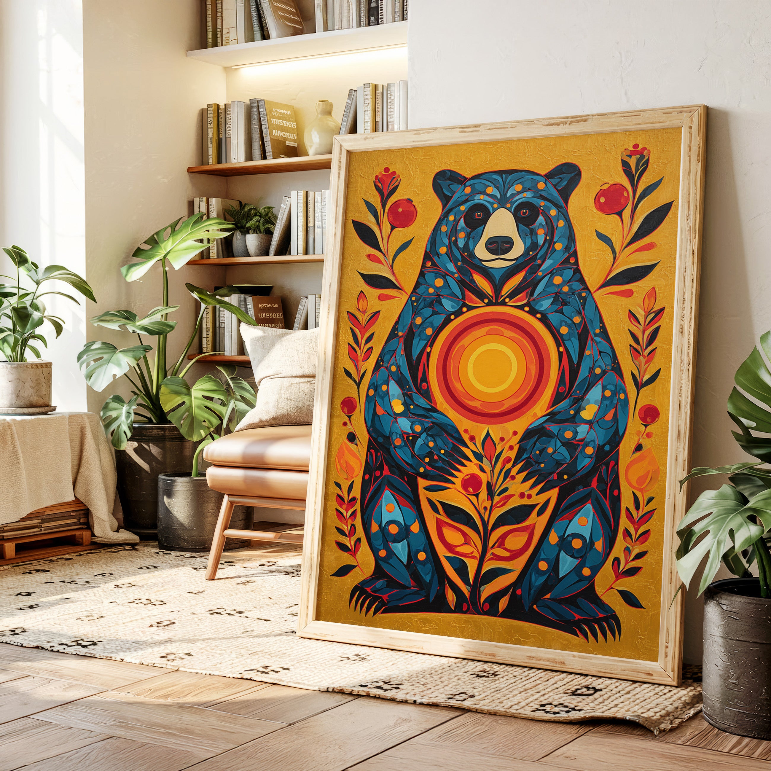 In a vibrant embrace of color, a bear sits steadfast, cradling the suns warmth within its grasp. This piece embodies the essence of the Artisanal collection, where tradition meets vivid imagination. With intricate patterns of blue and fiery orange, the bear symbolizes strength and nurturing, surrounded by flora that bursts with life, inviting contemplation of nature's harmony. Ideal for a cozy reading nook or a lively kitchen space, it brings a sense of comfort and connection to the wild.