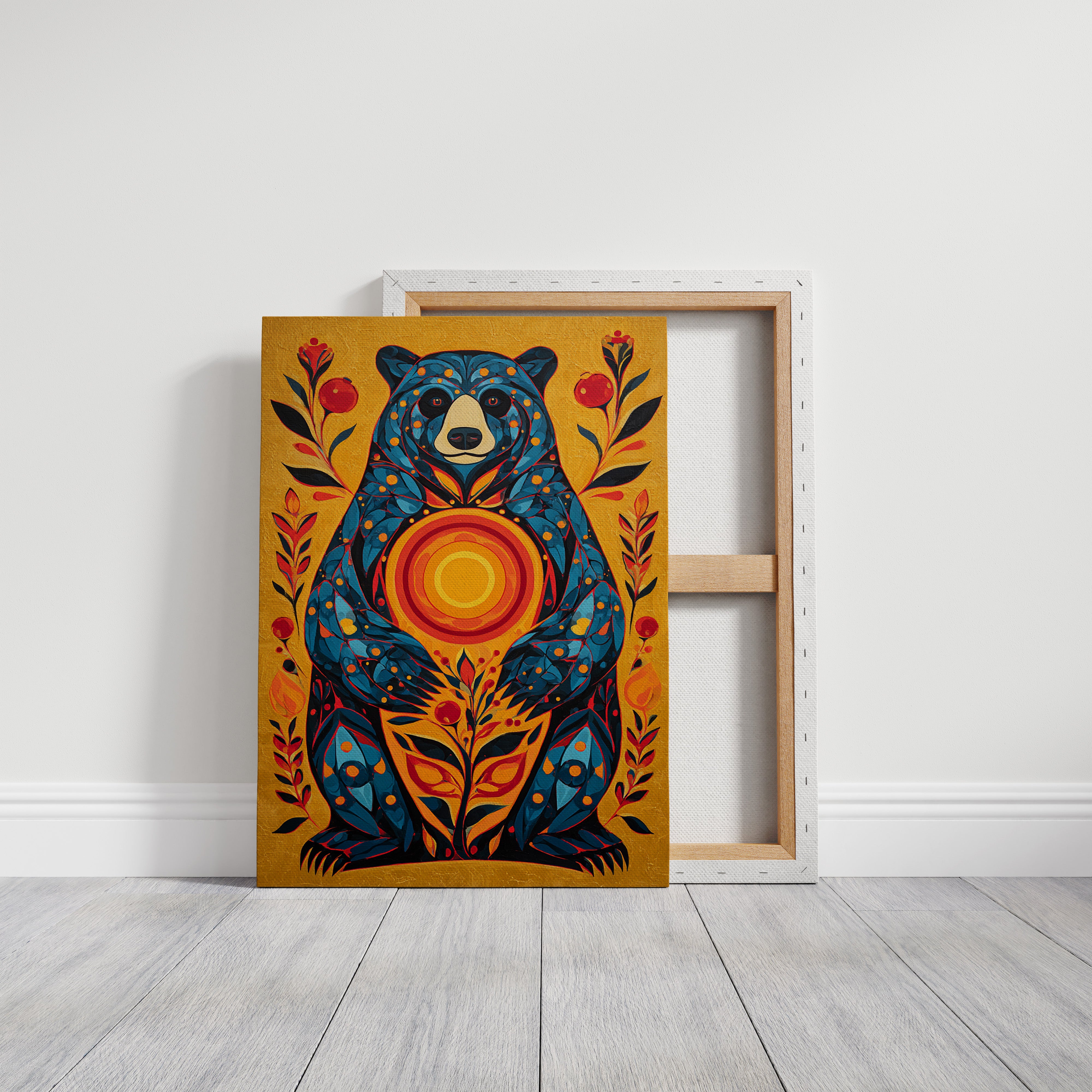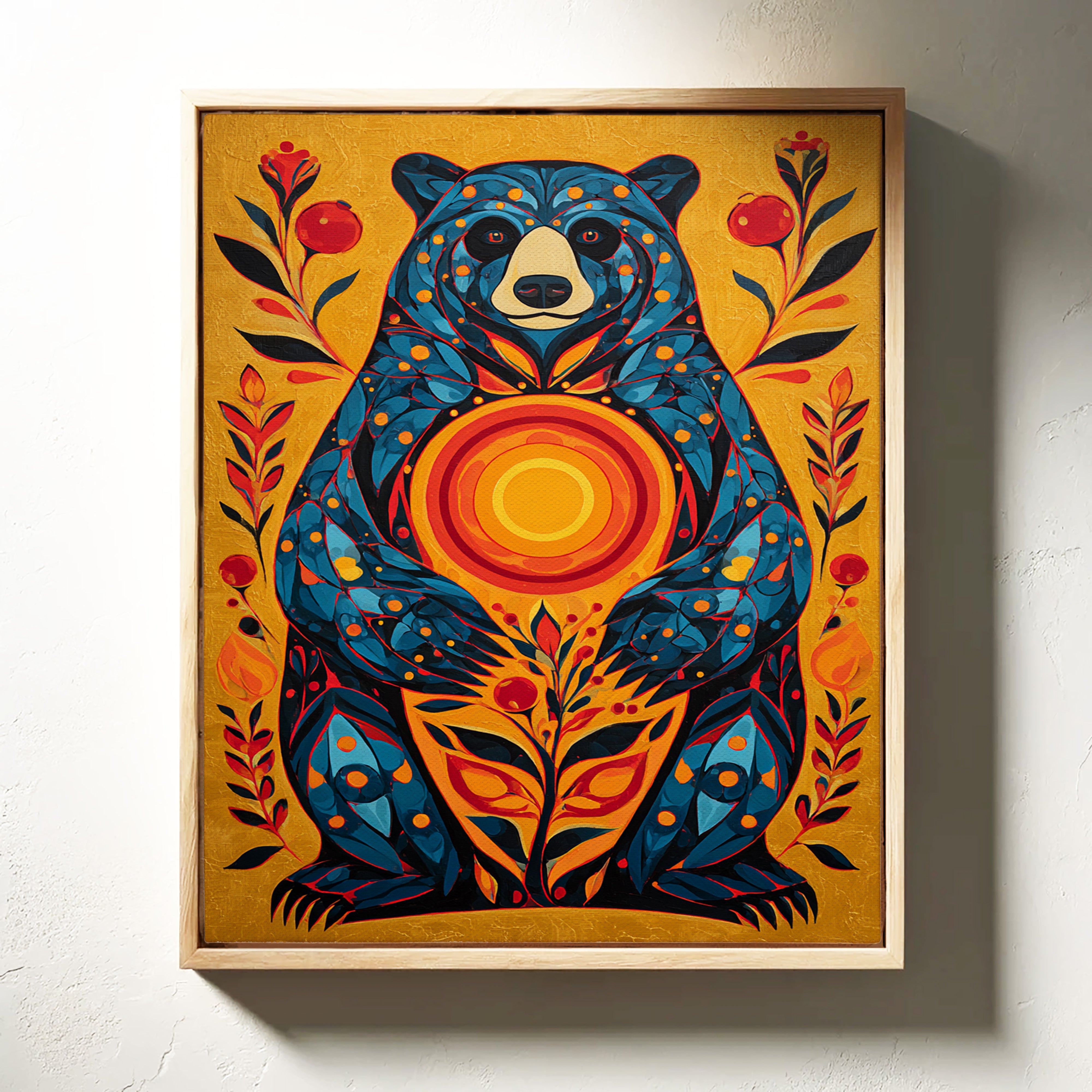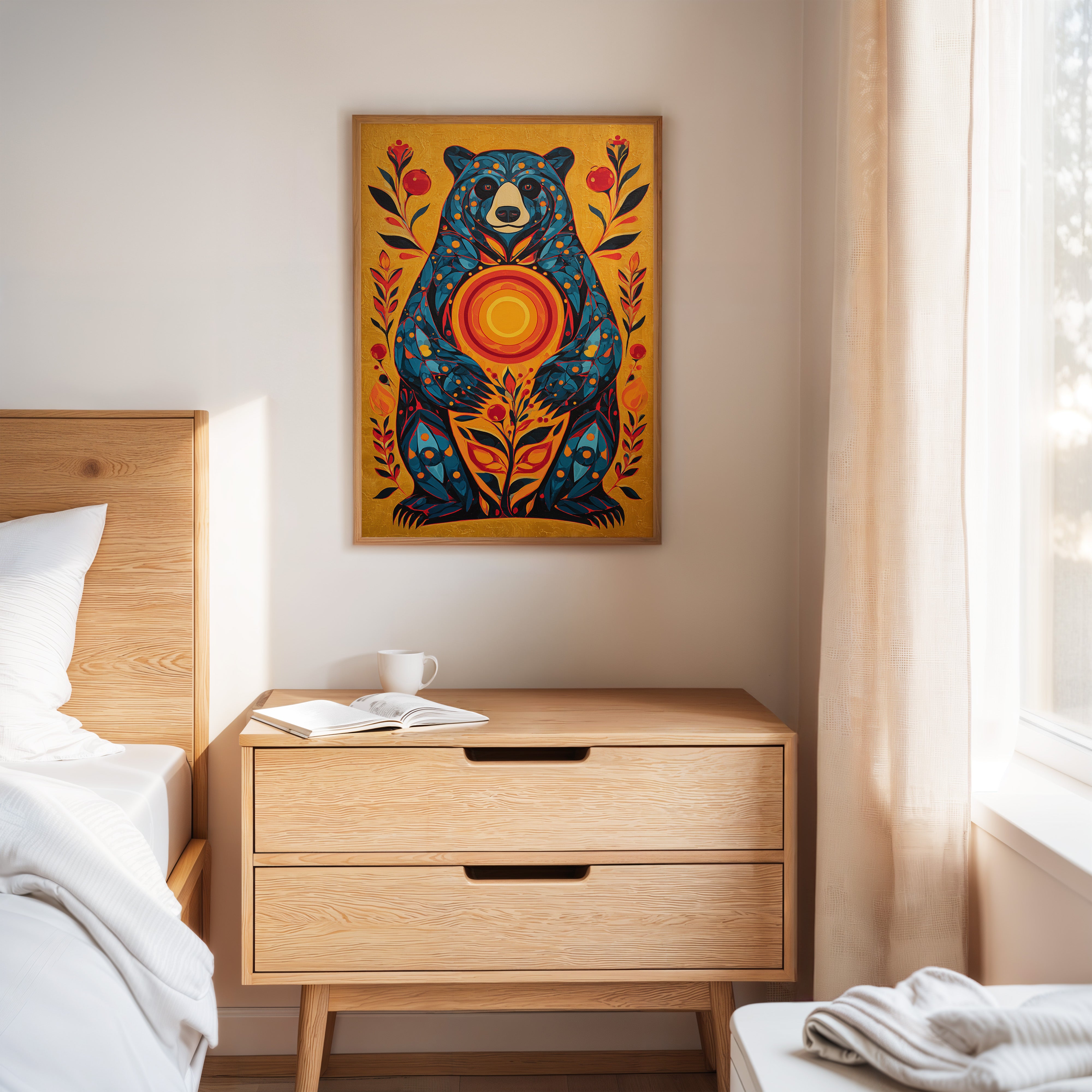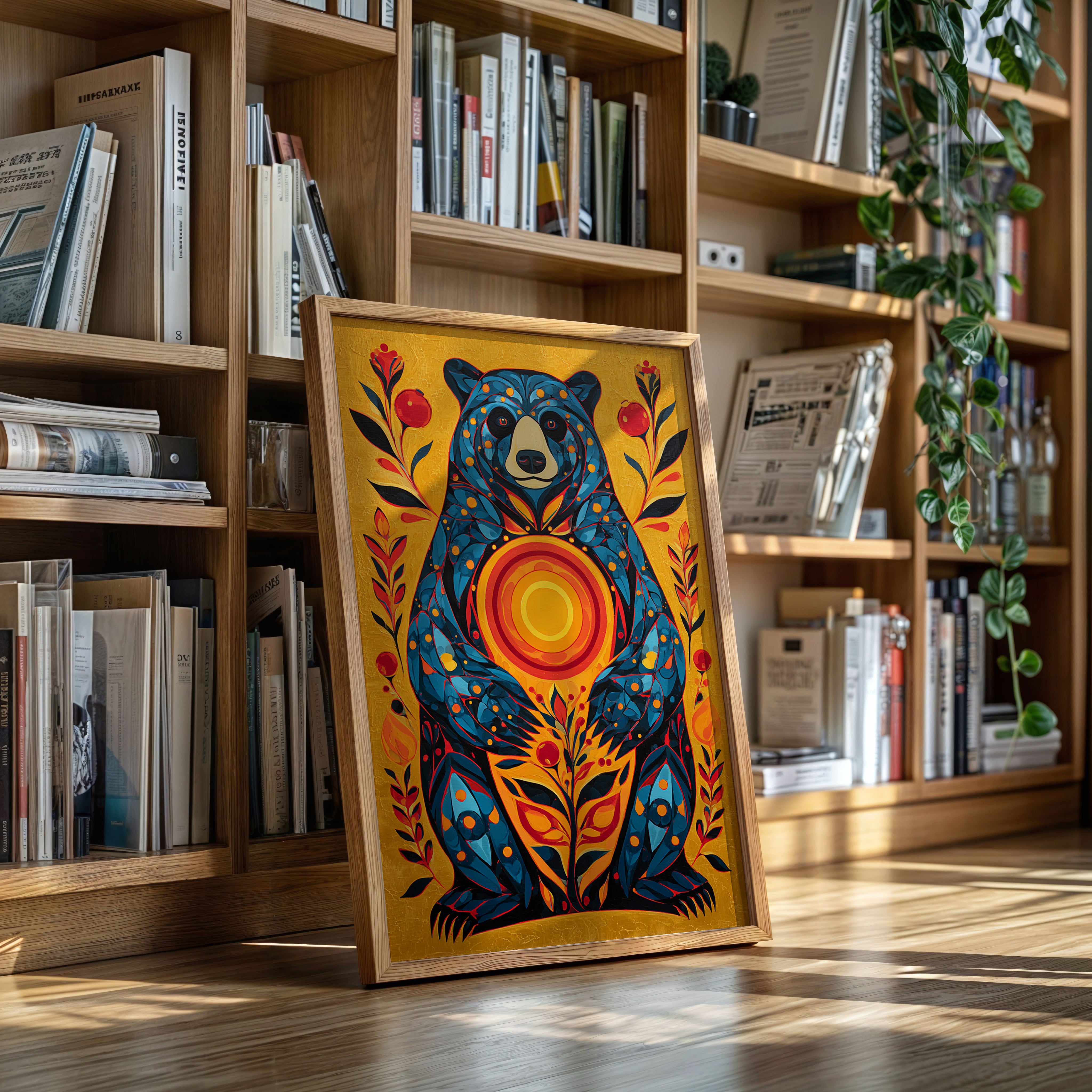 In a vibrant embrace of color, a bear sits steadfast, cradling the suns warmth within its grasp. This piece embodies the essence of the Artisanal collection, where tradition meets vivid imagination. With intricate patterns of blue and fiery orange, the bear symbolizes strength and nurturing, surrounded by flora that bursts with life, inviting contemplation of nature's harmony. Ideal for a cozy reading nook or a lively kitchen space, it brings a sense of comfort and connection to the wild.