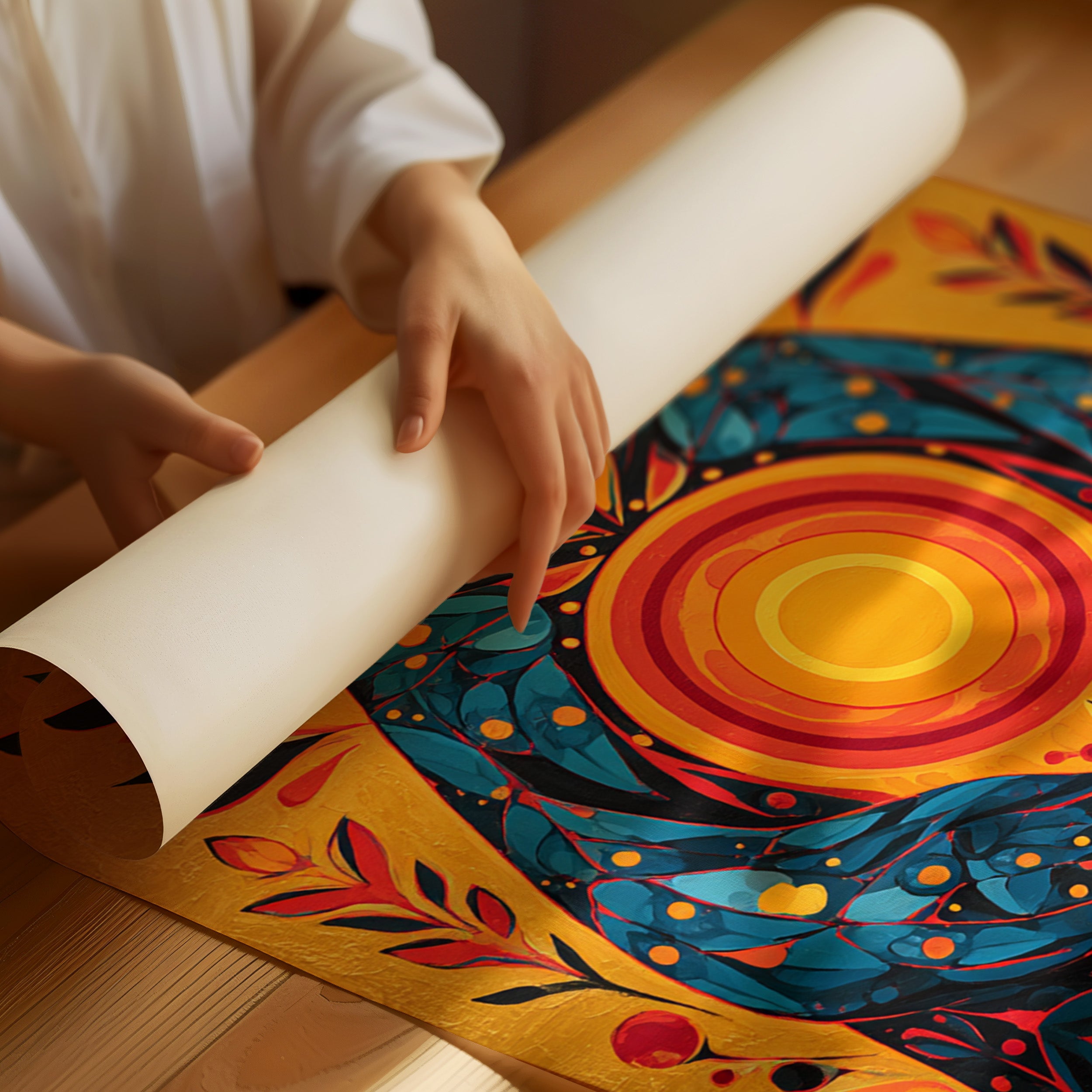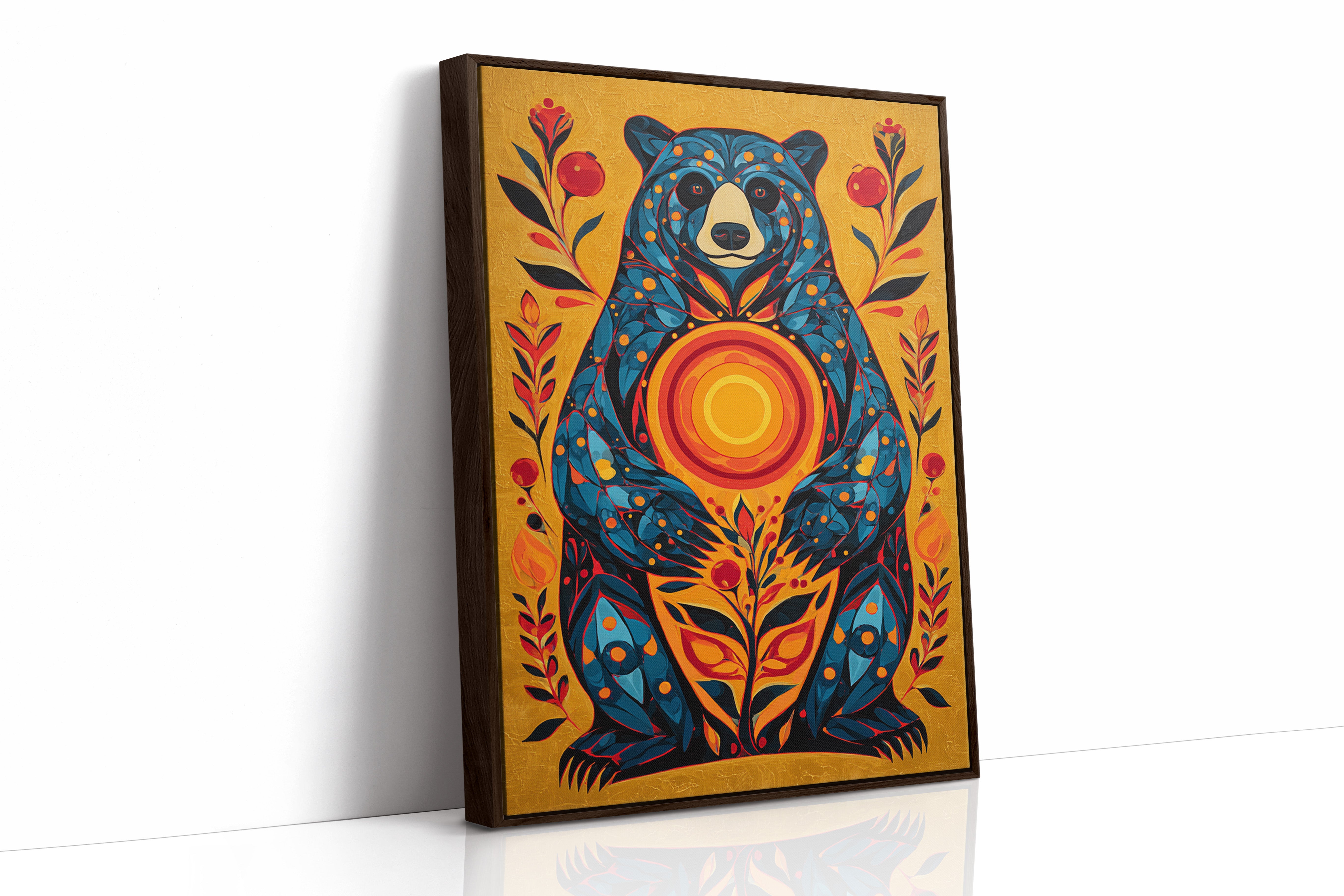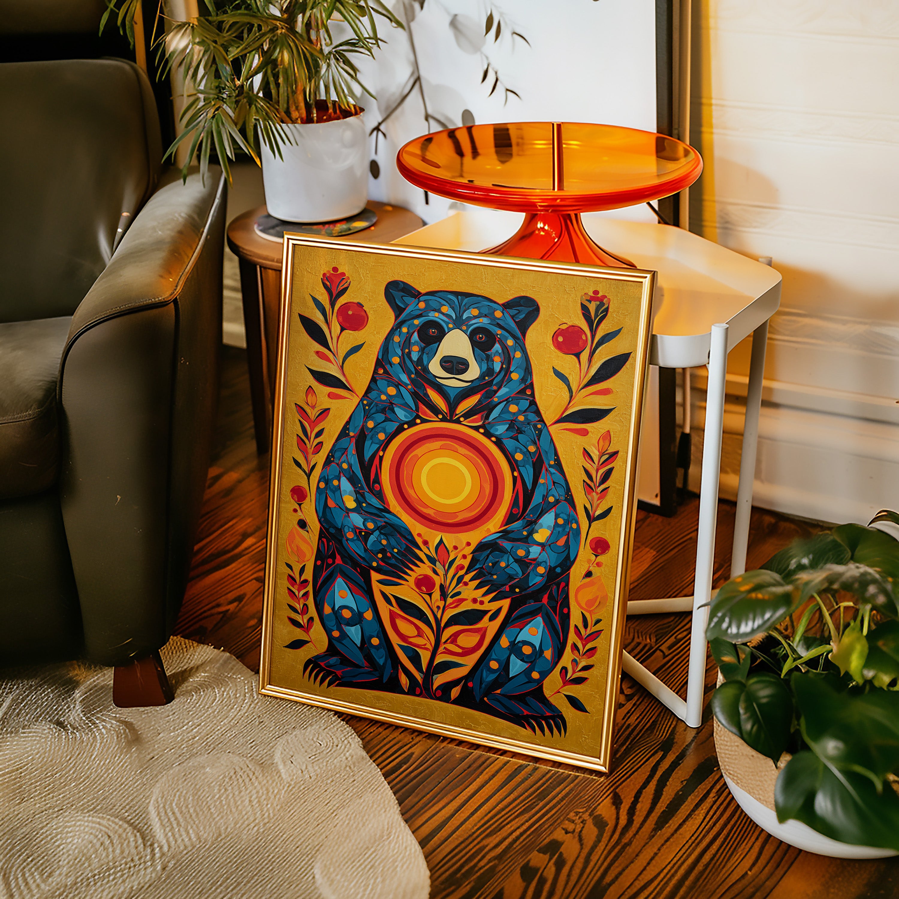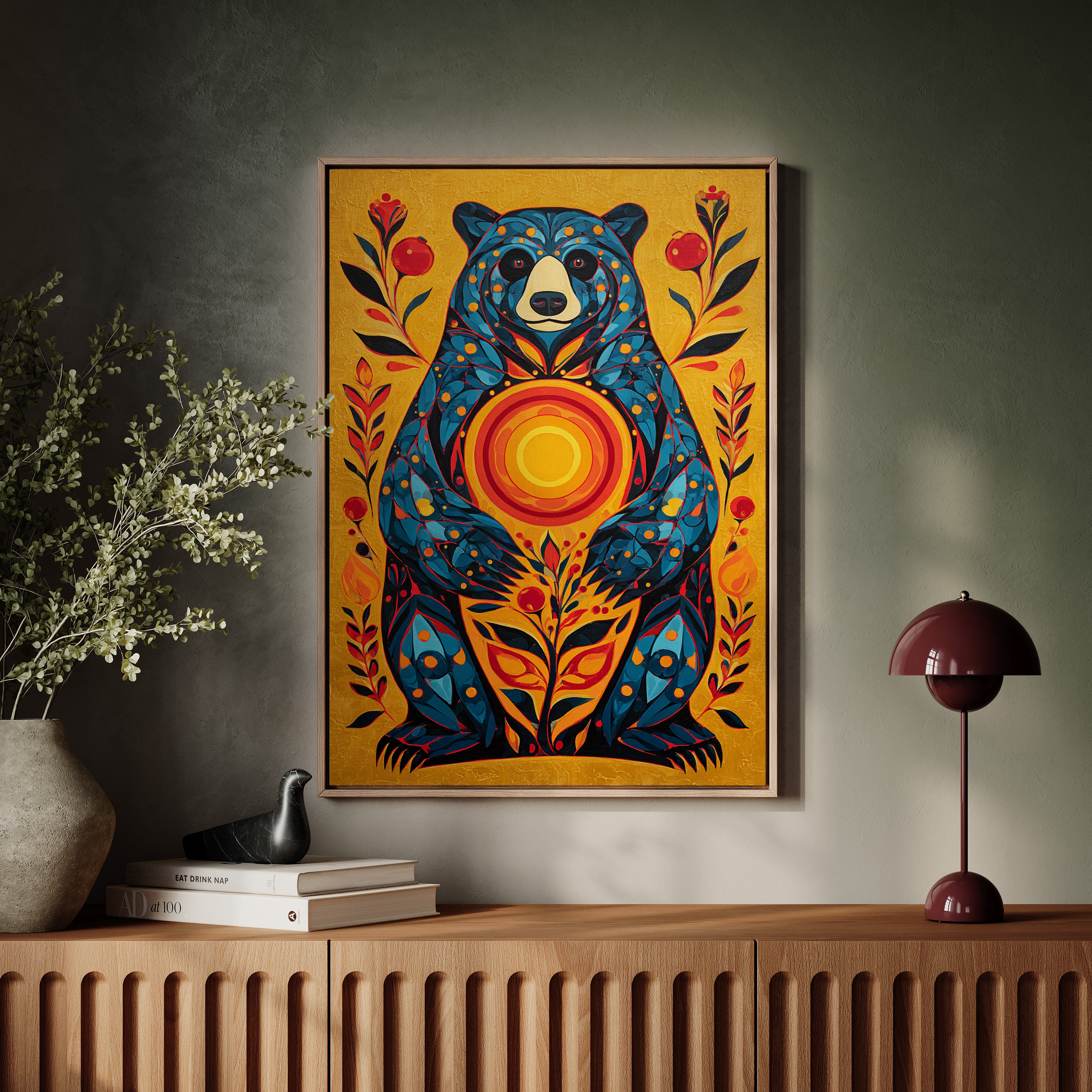 In a vibrant embrace of color, a bear sits steadfast, cradling the suns warmth within its grasp. This piece embodies the essence of the Artisanal collection, where tradition meets vivid imagination. With intricate patterns of blue and fiery orange, the bear symbolizes strength and nurturing, surrounded by flora that bursts with life, inviting contemplation of nature's harmony. Ideal for a cozy reading nook or a lively kitchen space, it brings a sense of comfort and connection to the wild.