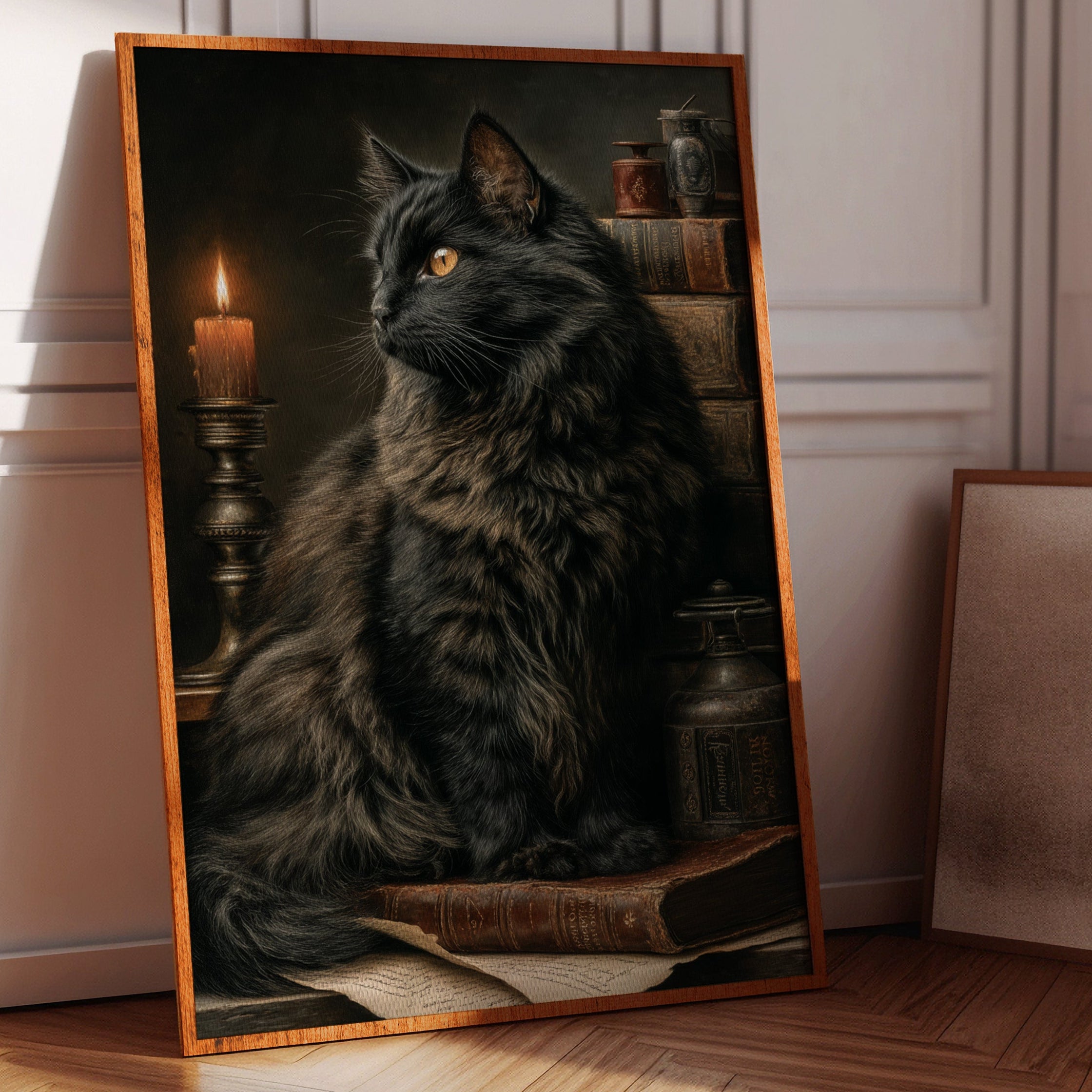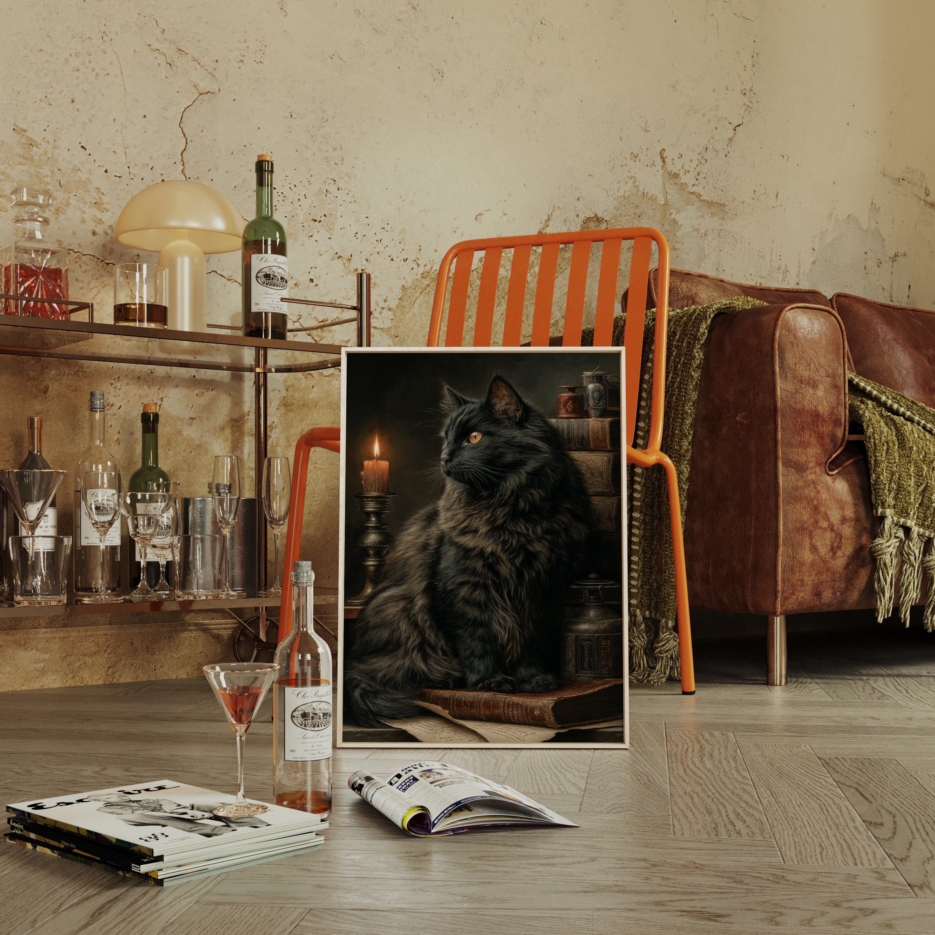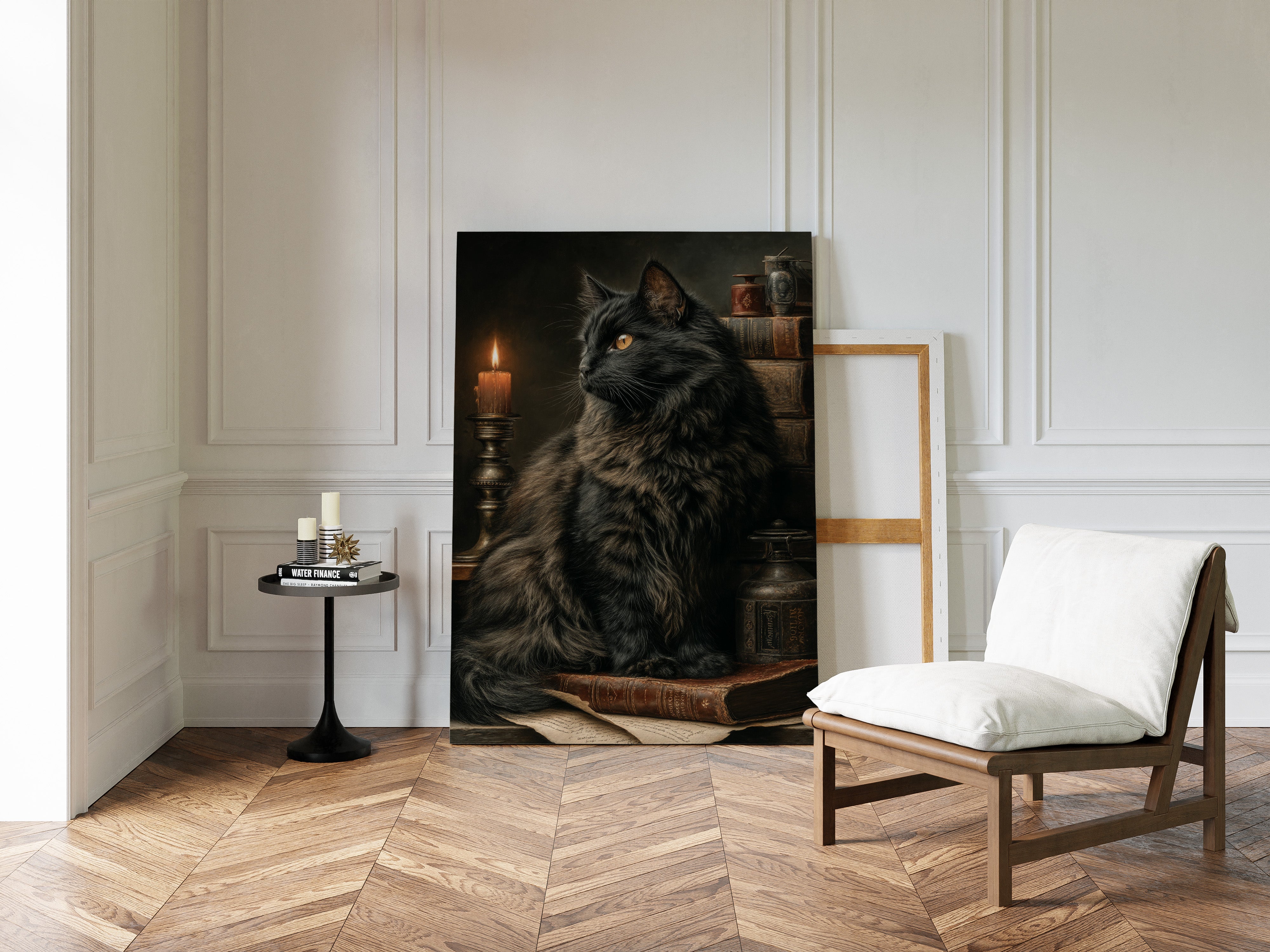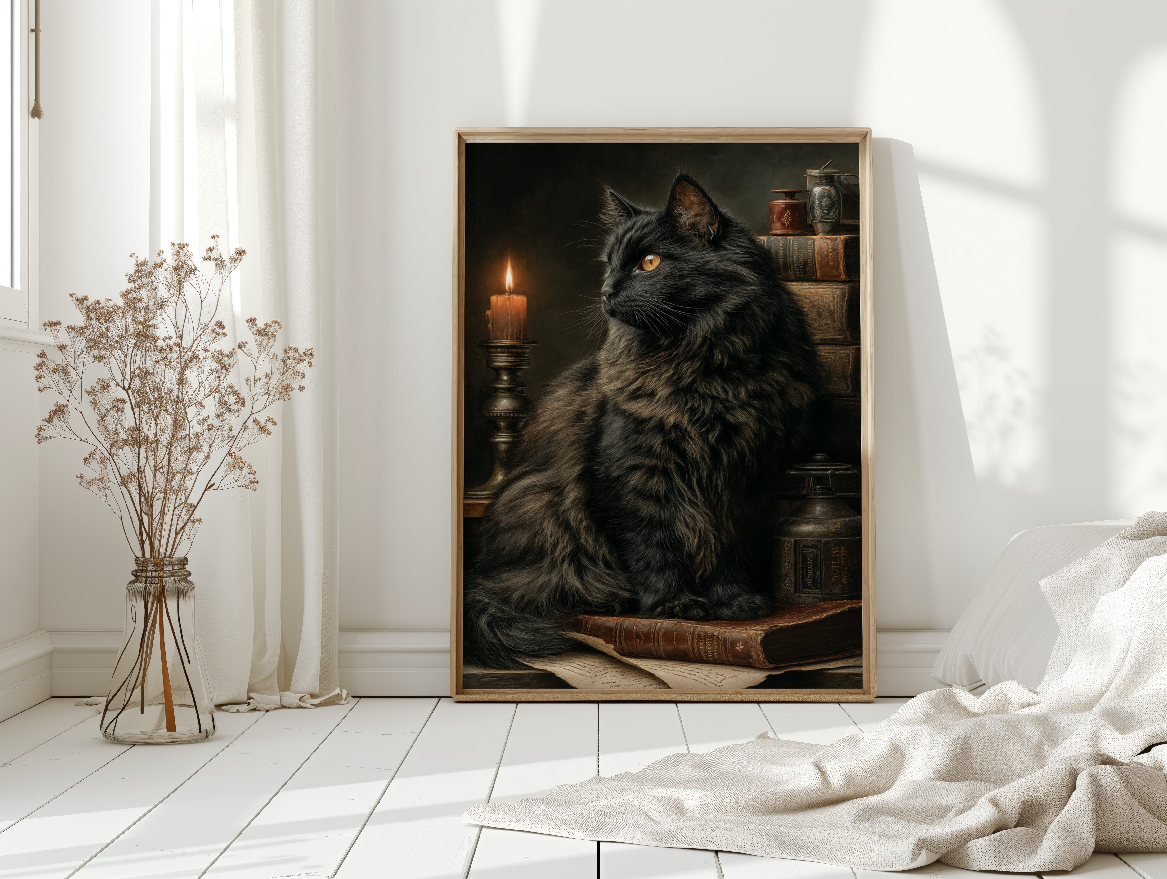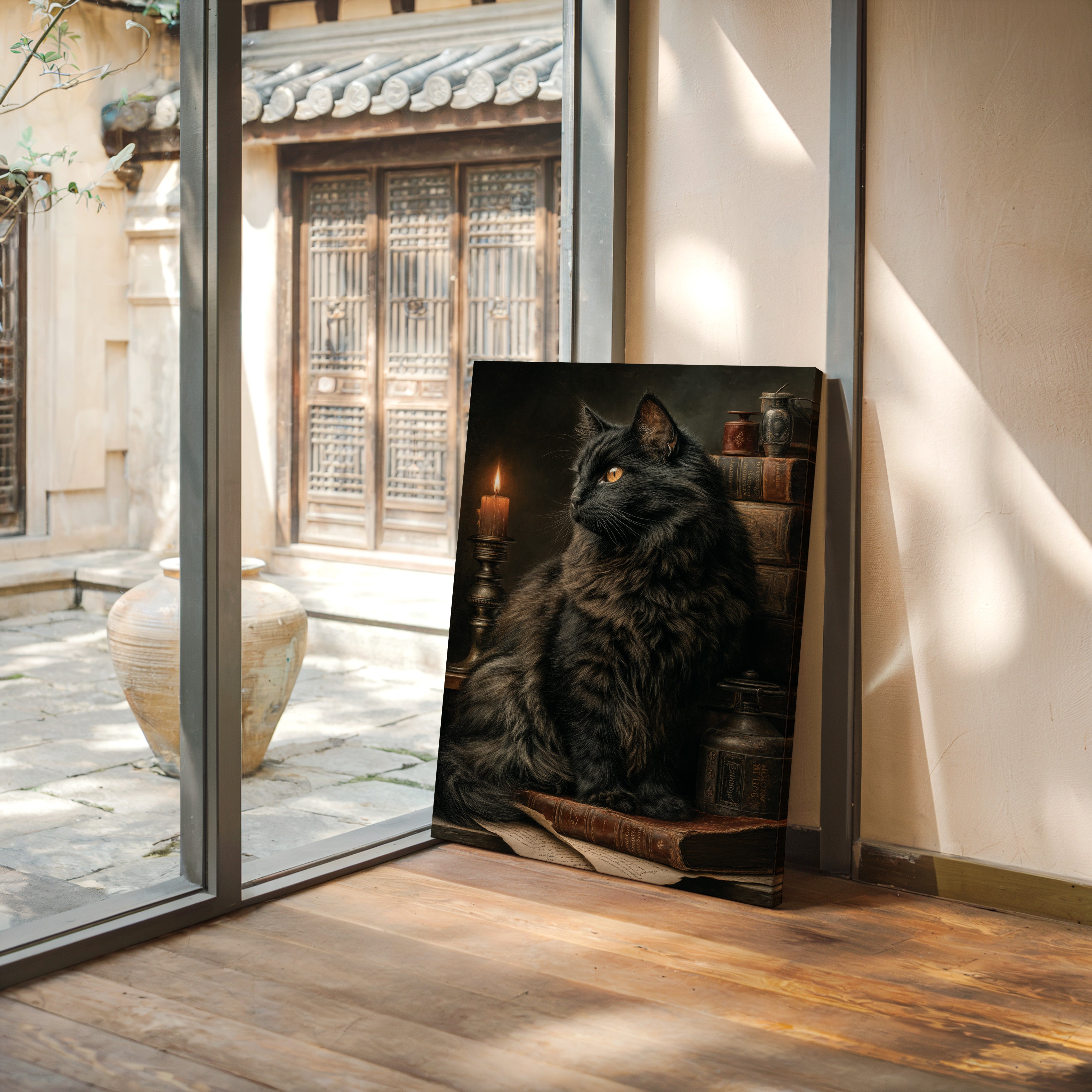 In a quiet corner, a regal feline sits, illuminated by the soft glow of candlelight, guarding the secrets of ages past. This piece encapsulates the essence of contemporary elegance and serenity. The deep, rich fur of the cat contrasts beautifully with the warm light, while the aged books and artifacts create a narrative of history and wisdom, inviting the viewer to ponder the stories held within each page and object. Perfect for a study or library, this artwork brings a touch of sophistication and curiosity to any space.