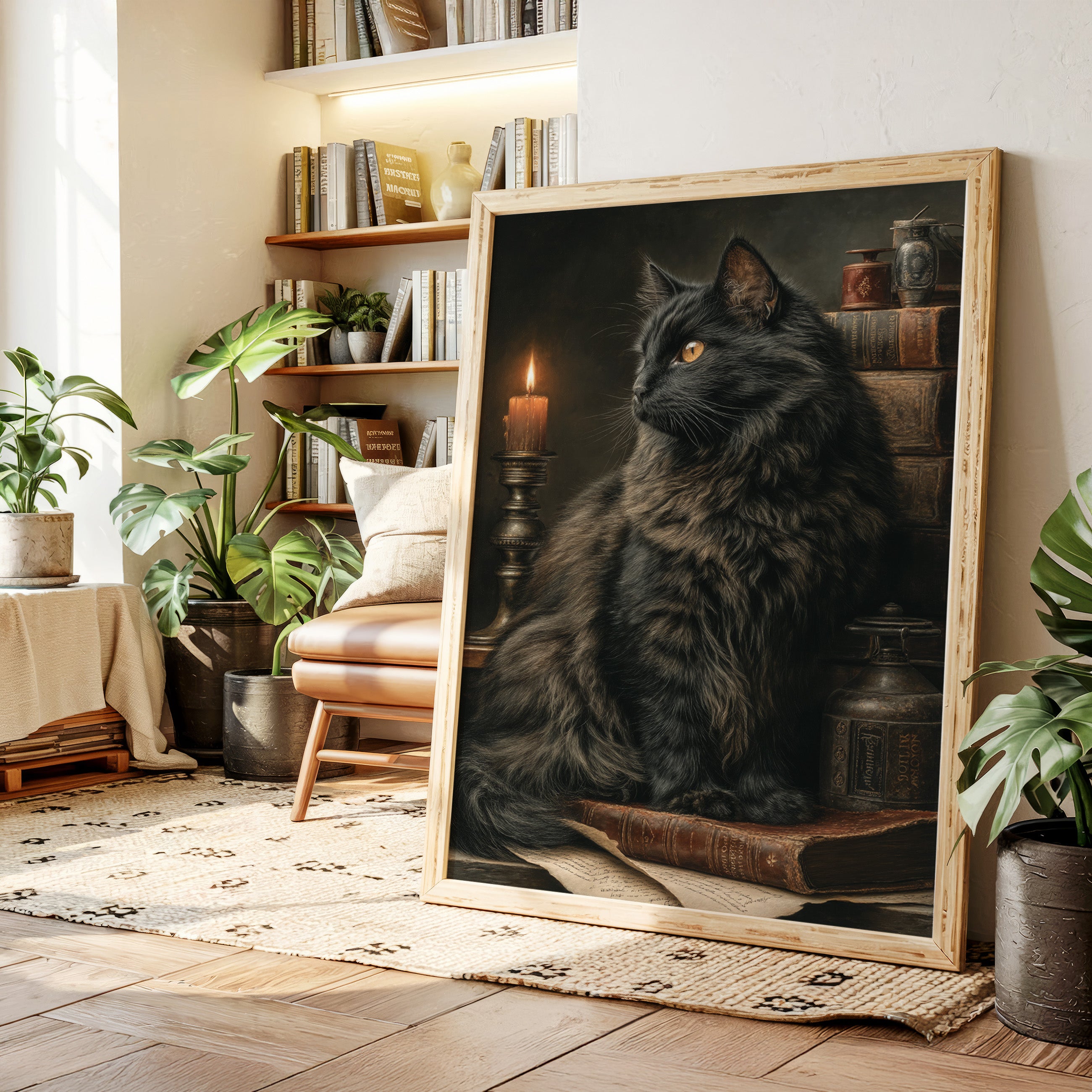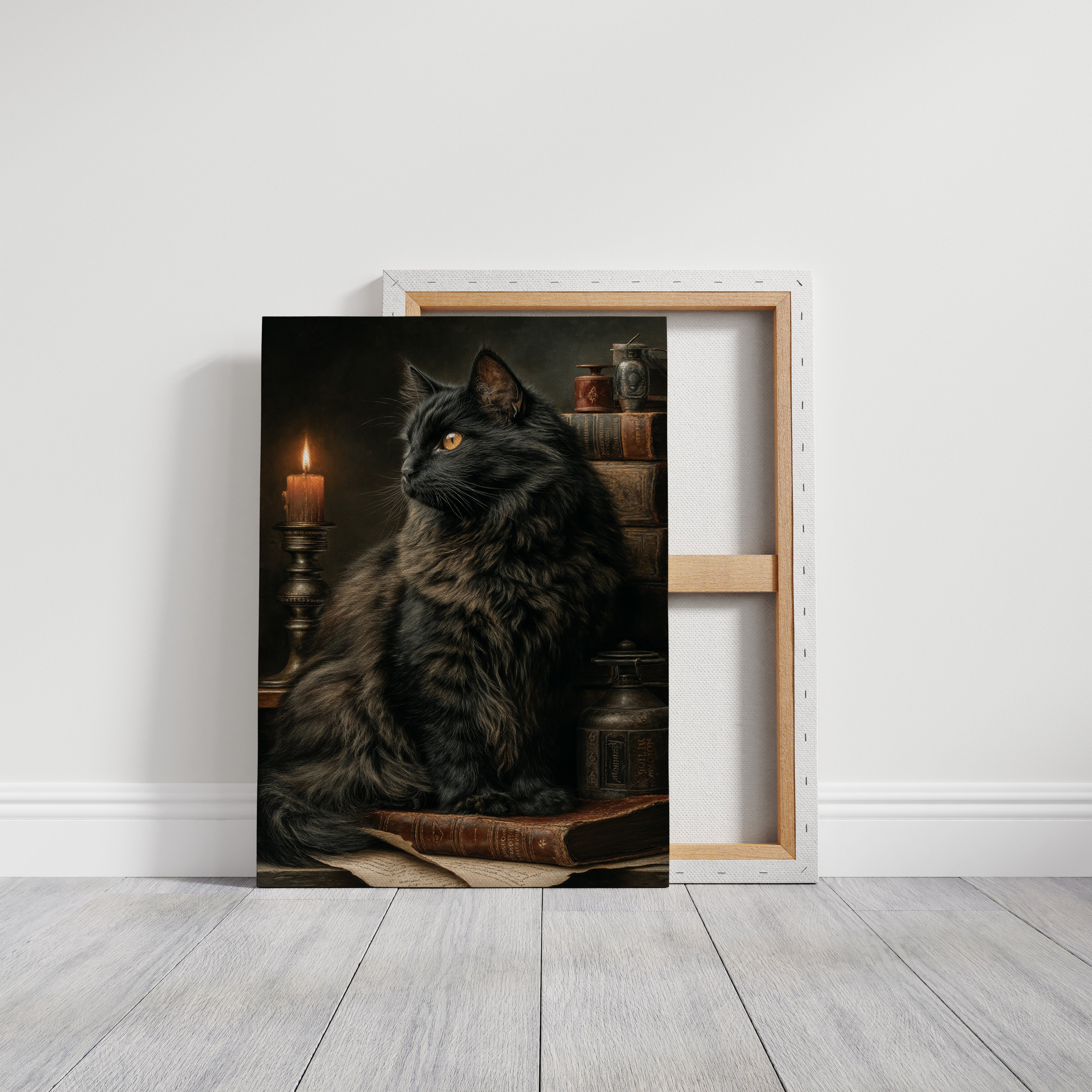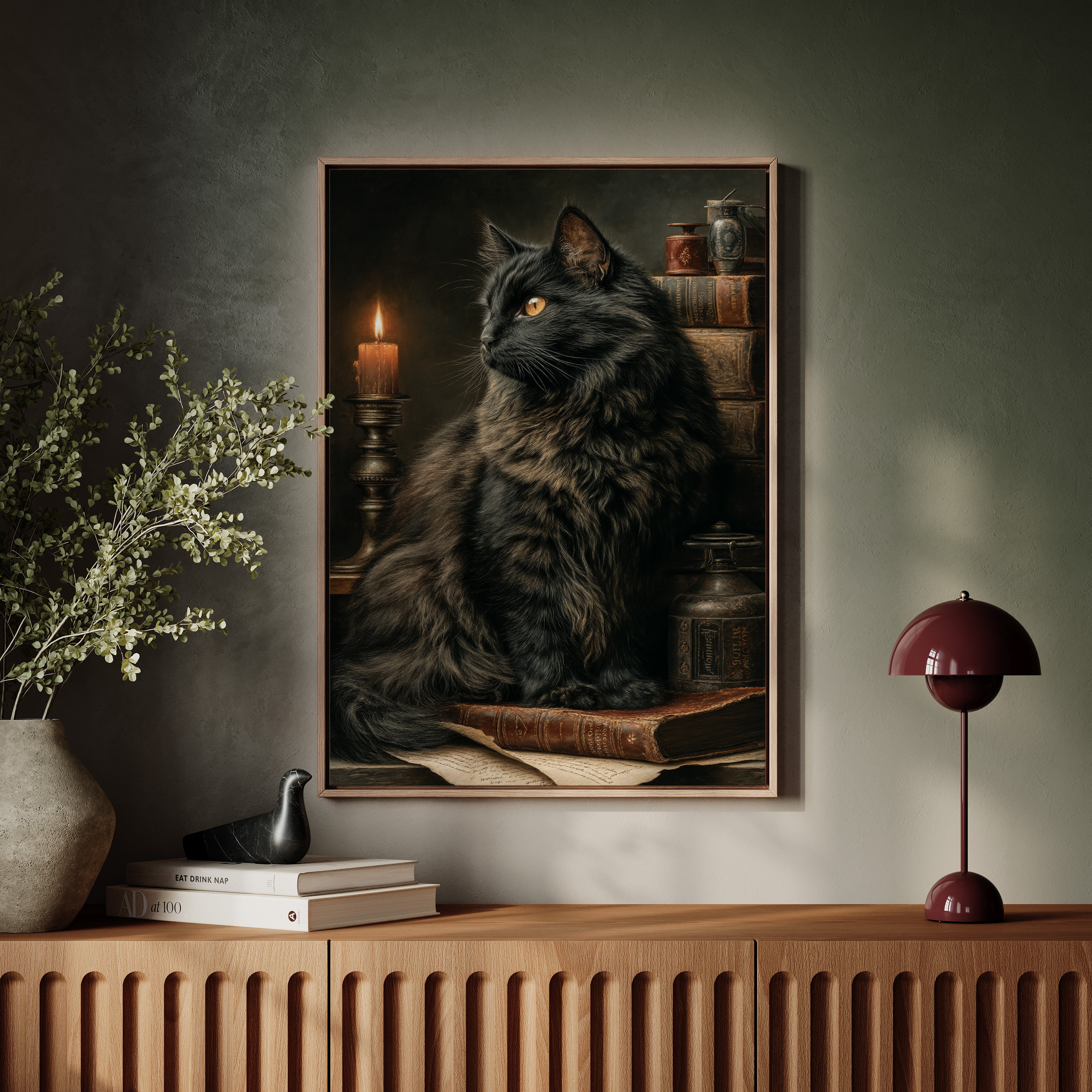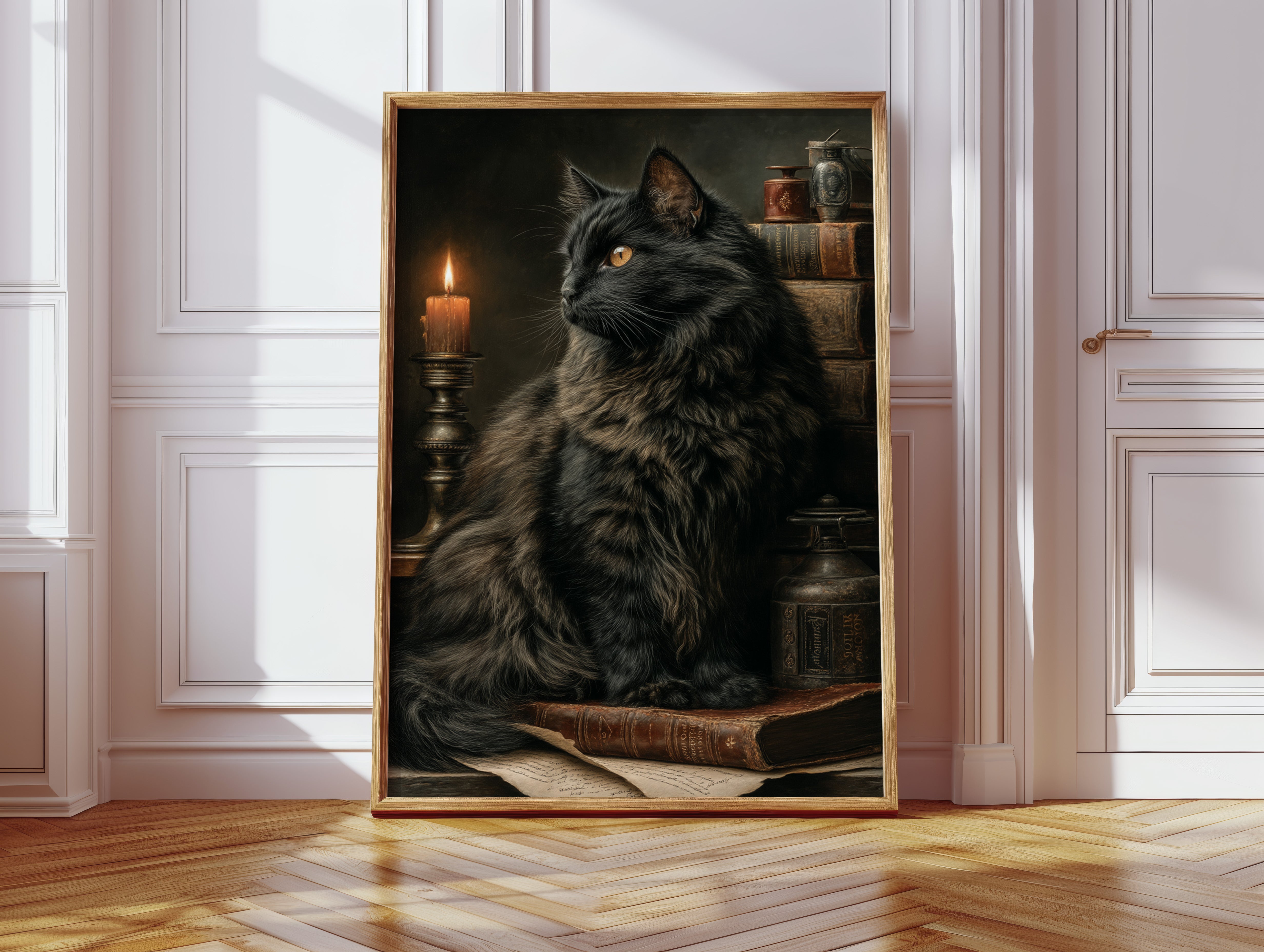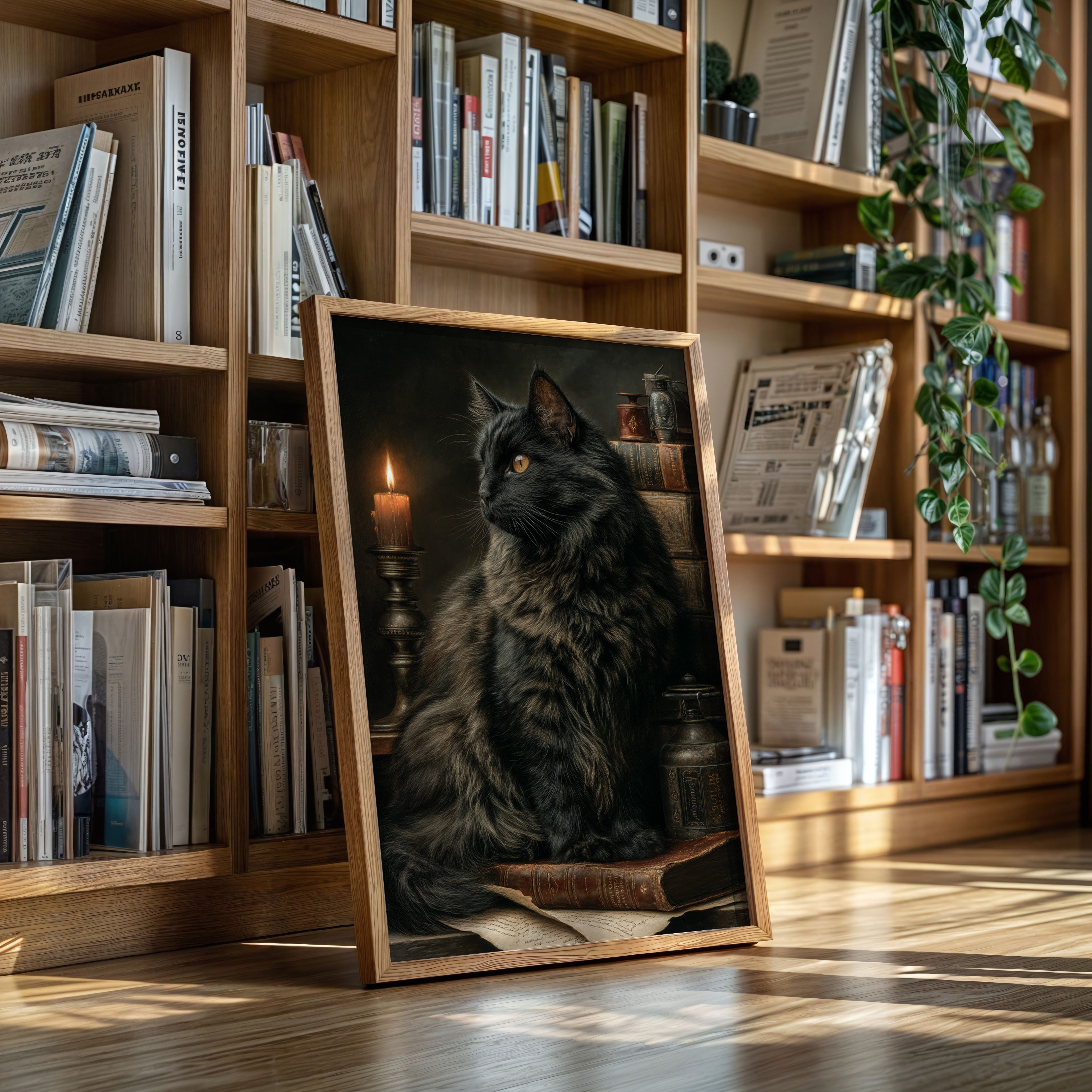 In a quiet corner, a regal feline sits, illuminated by the soft glow of candlelight, guarding the secrets of ages past. This piece encapsulates the essence of contemporary elegance and serenity. The deep, rich fur of the cat contrasts beautifully with the warm light, while the aged books and artifacts create a narrative of history and wisdom, inviting the viewer to ponder the stories held within each page and object. Perfect for a study or library, this artwork brings a touch of sophistication and curiosity to any space.