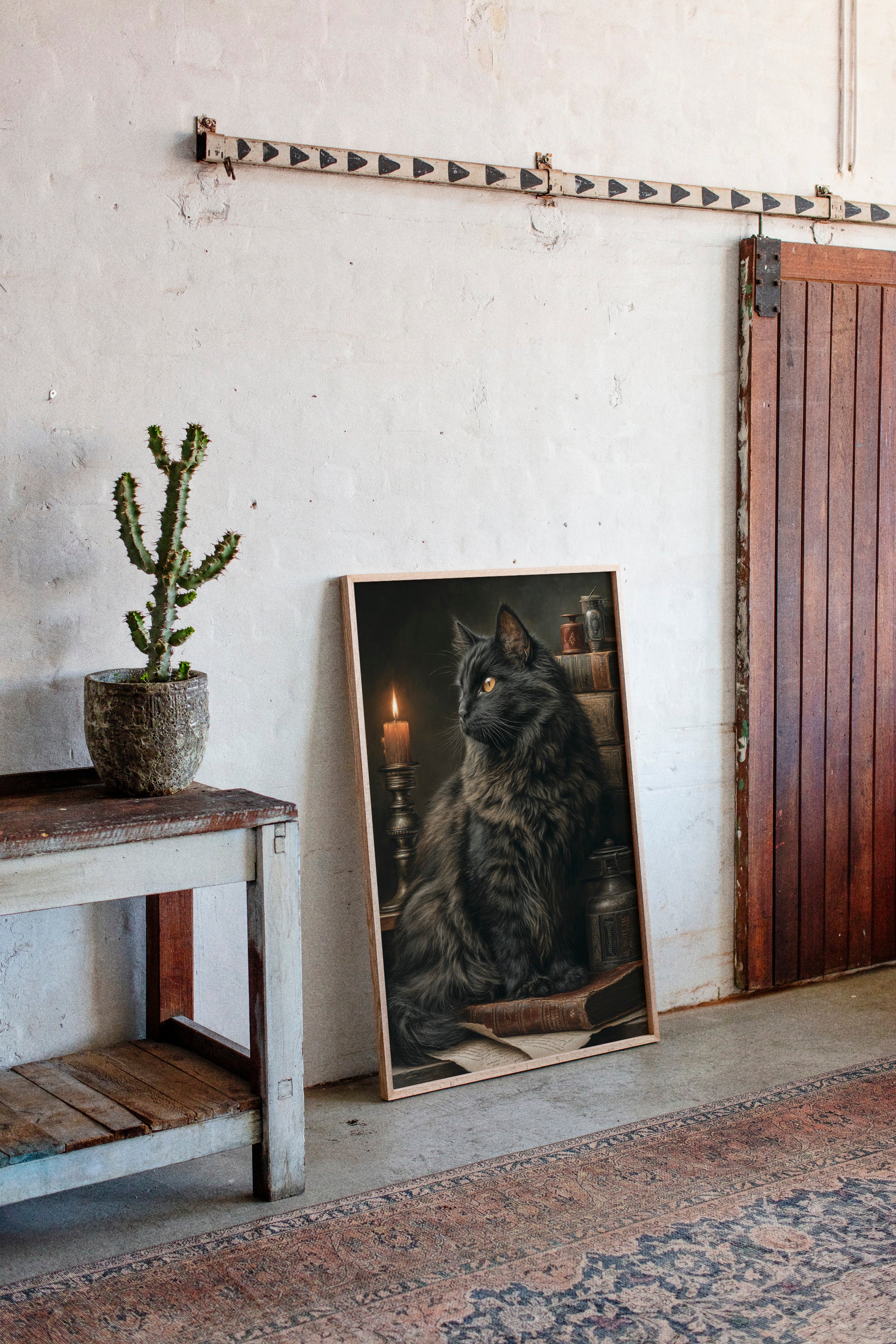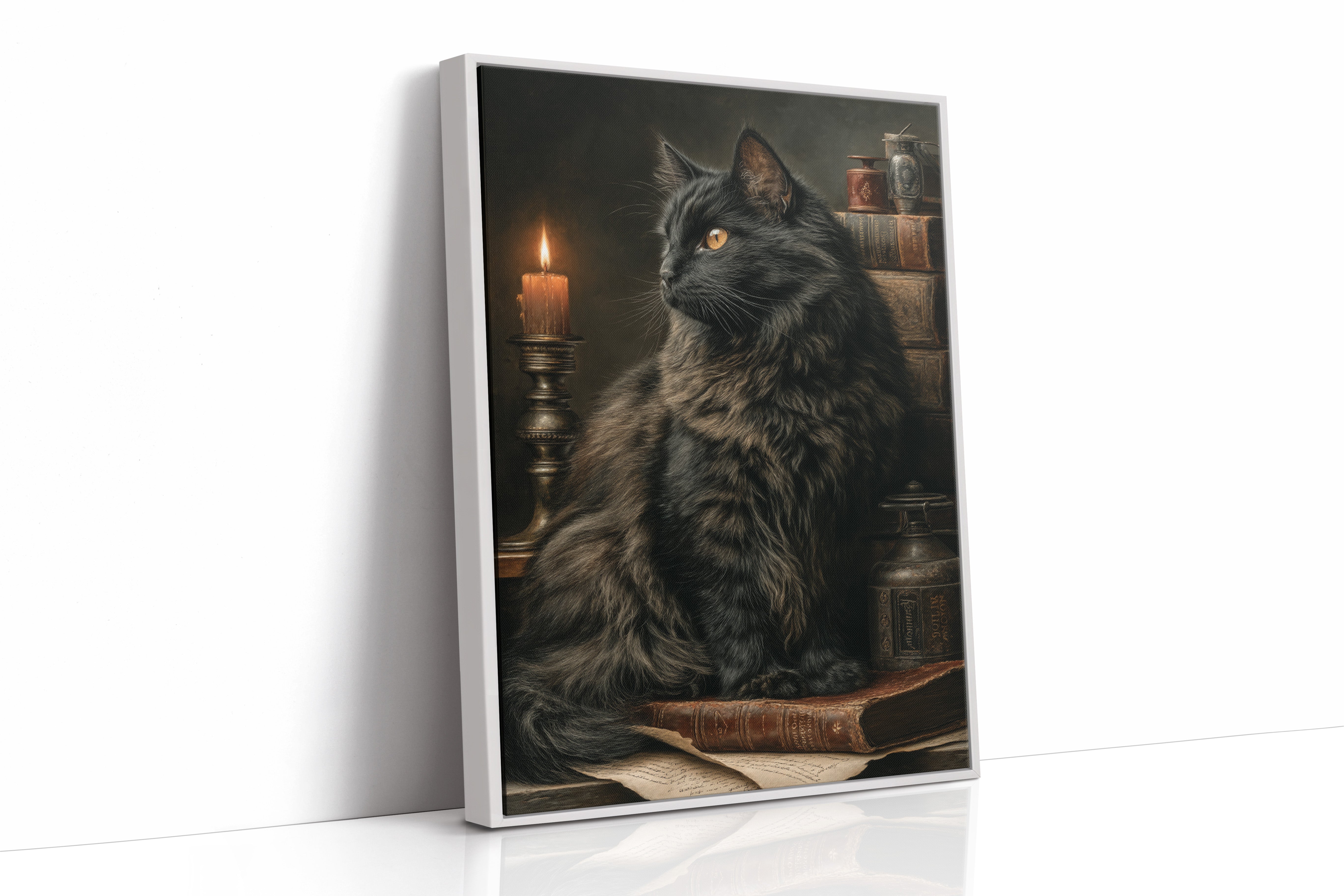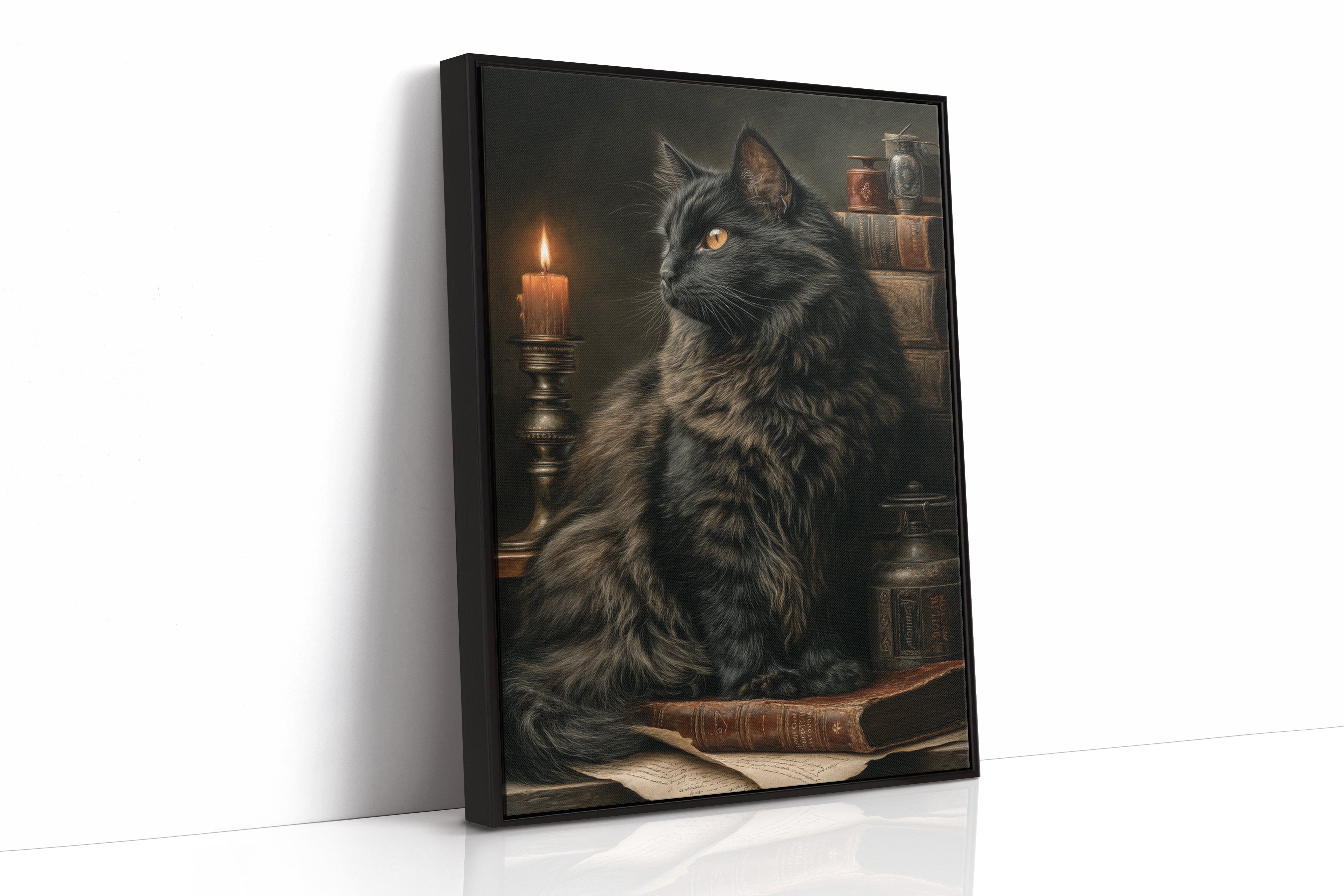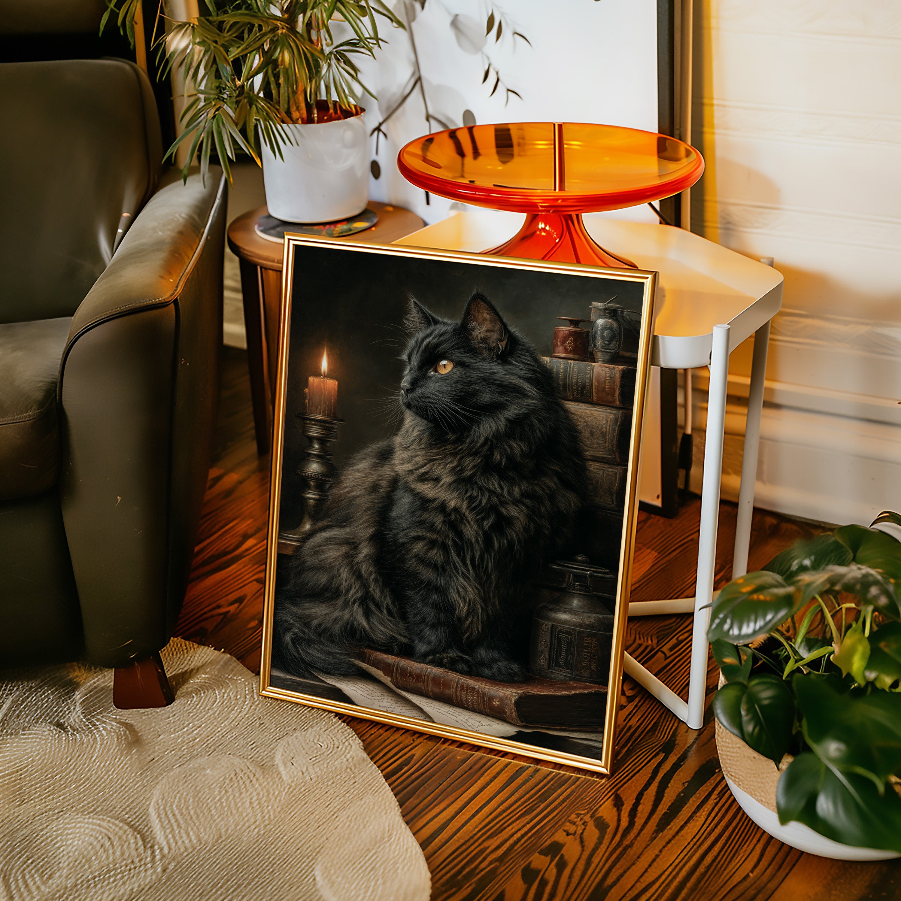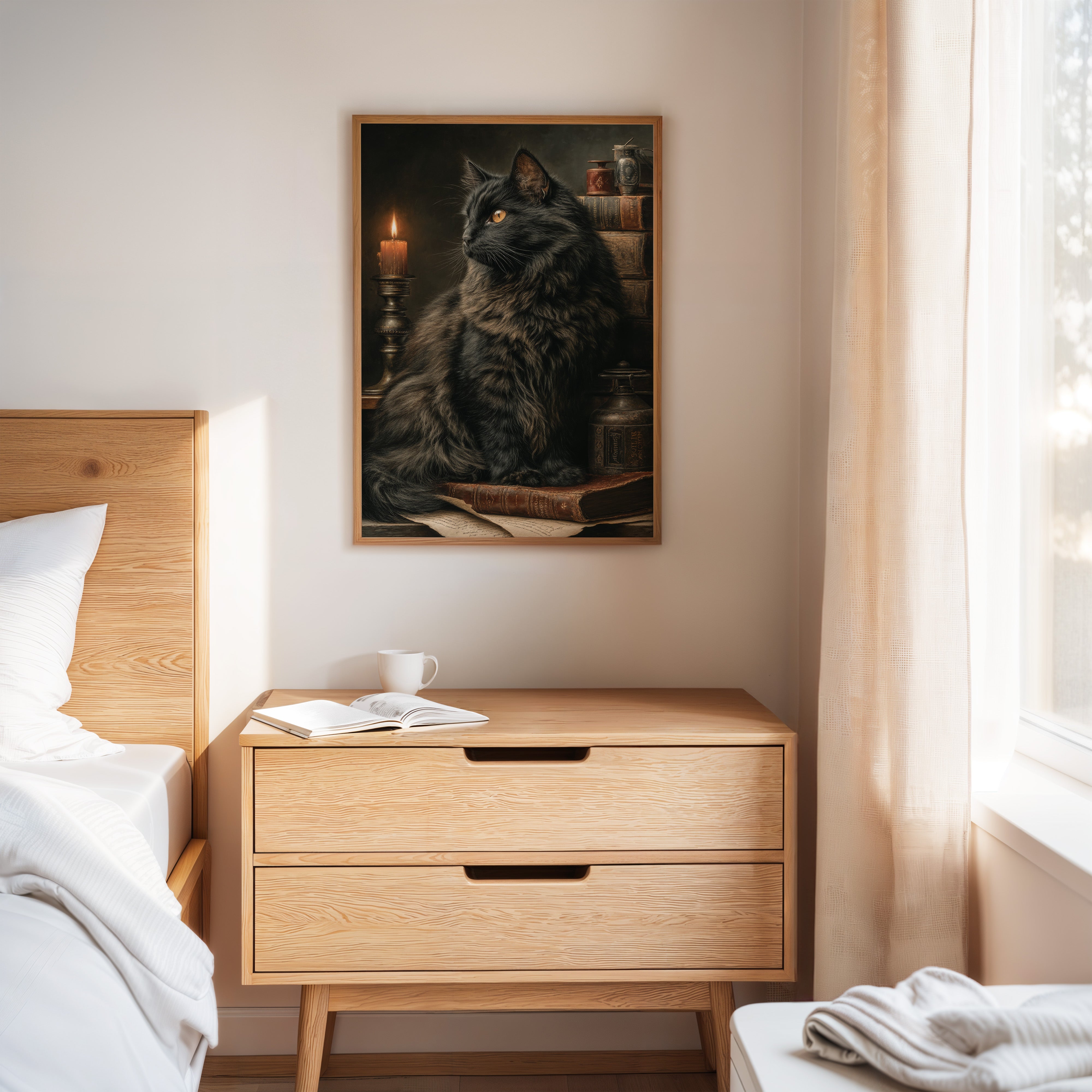 In a quiet corner, a regal feline sits, illuminated by the soft glow of candlelight, guarding the secrets of ages past. This piece encapsulates the essence of contemporary elegance and serenity. The deep, rich fur of the cat contrasts beautifully with the warm light, while the aged books and artifacts create a narrative of history and wisdom, inviting the viewer to ponder the stories held within each page and object. Perfect for a study or library, this artwork brings a touch of sophistication and curiosity to any space.