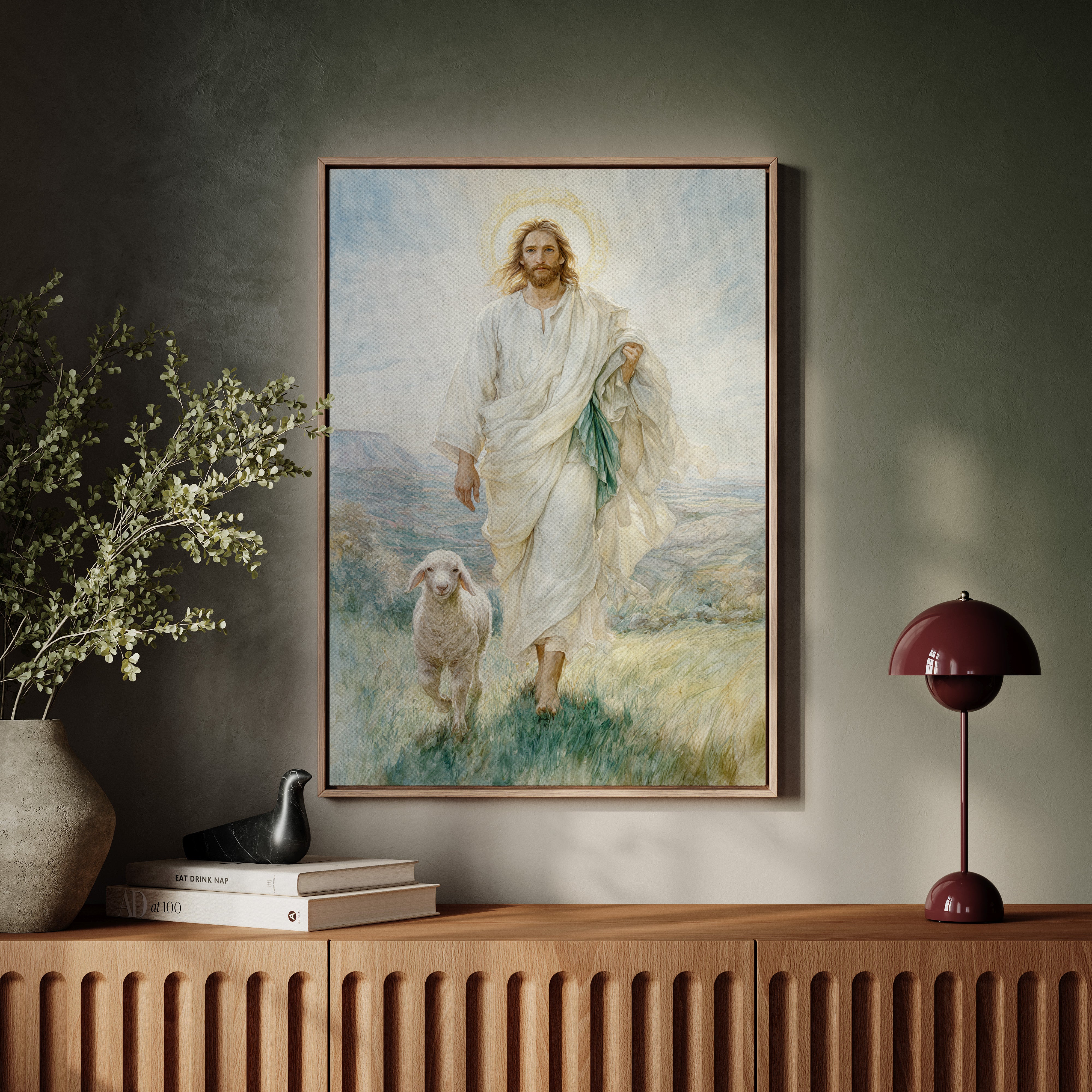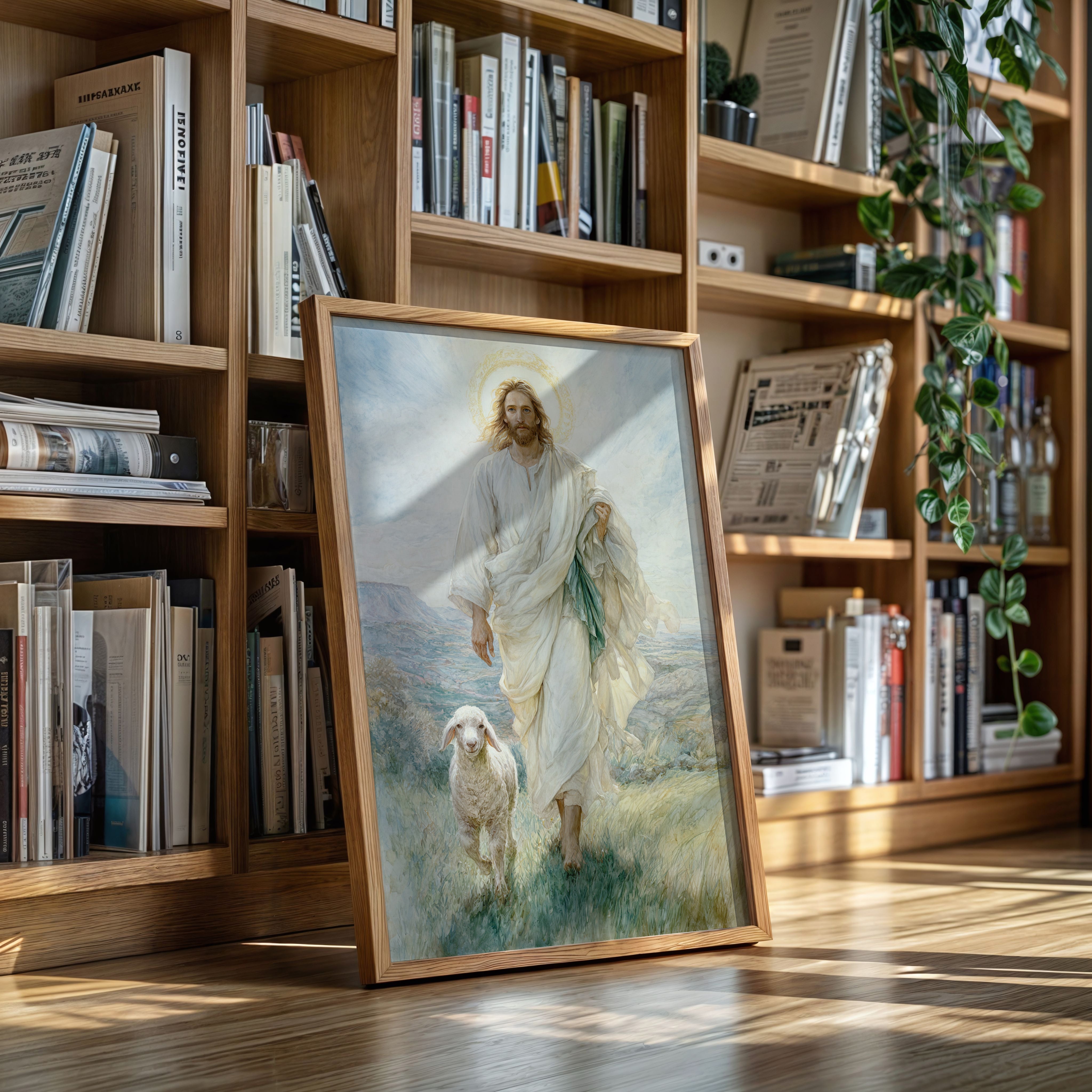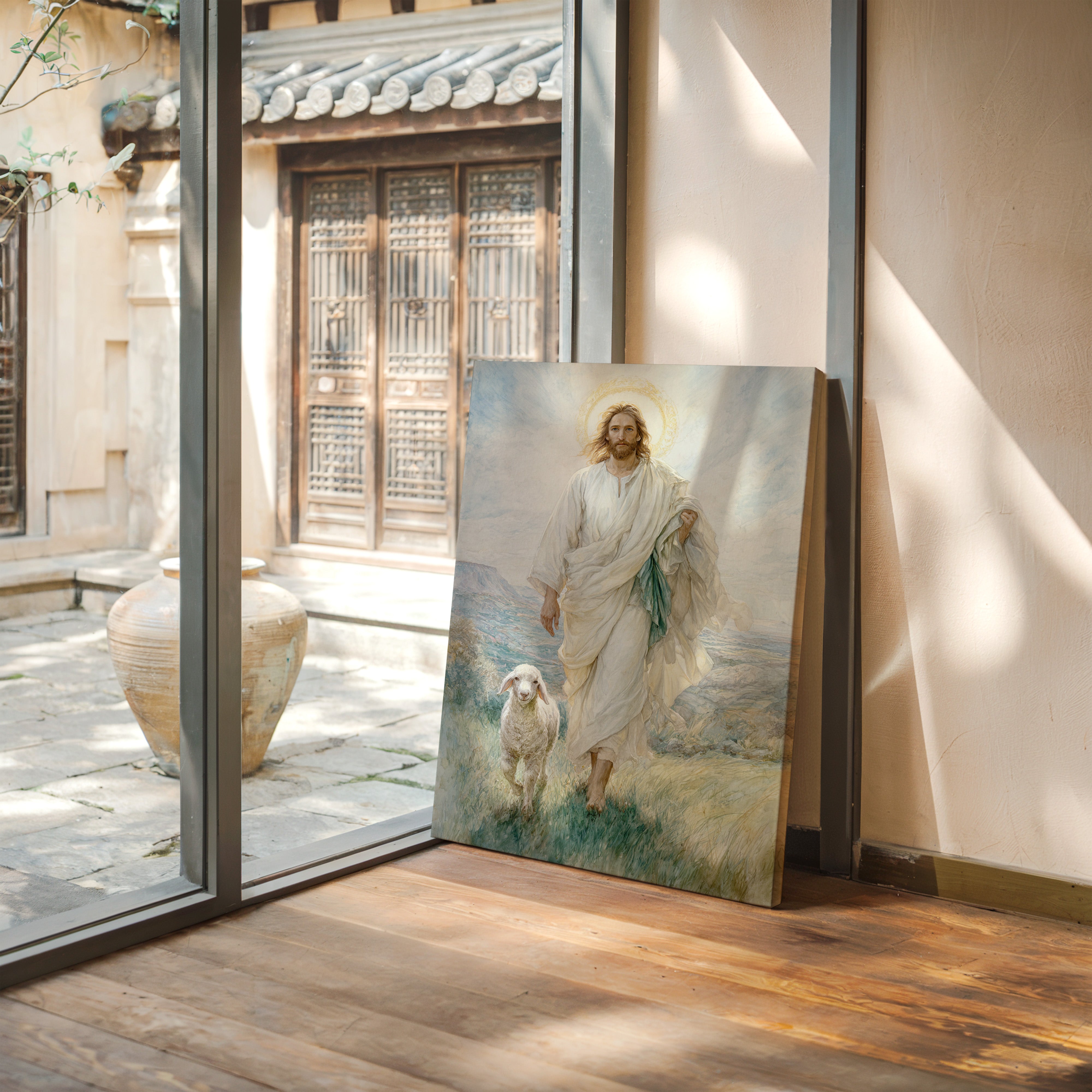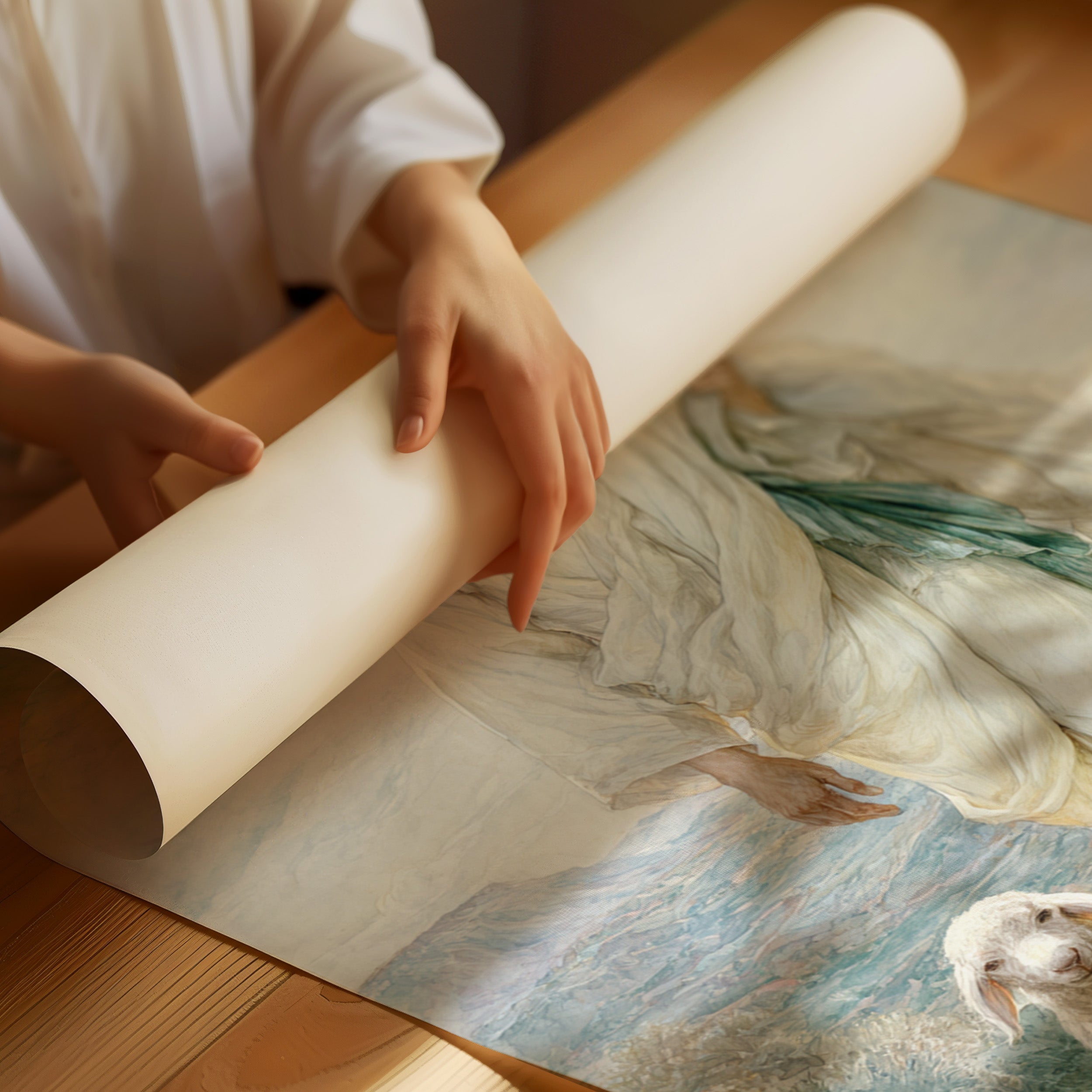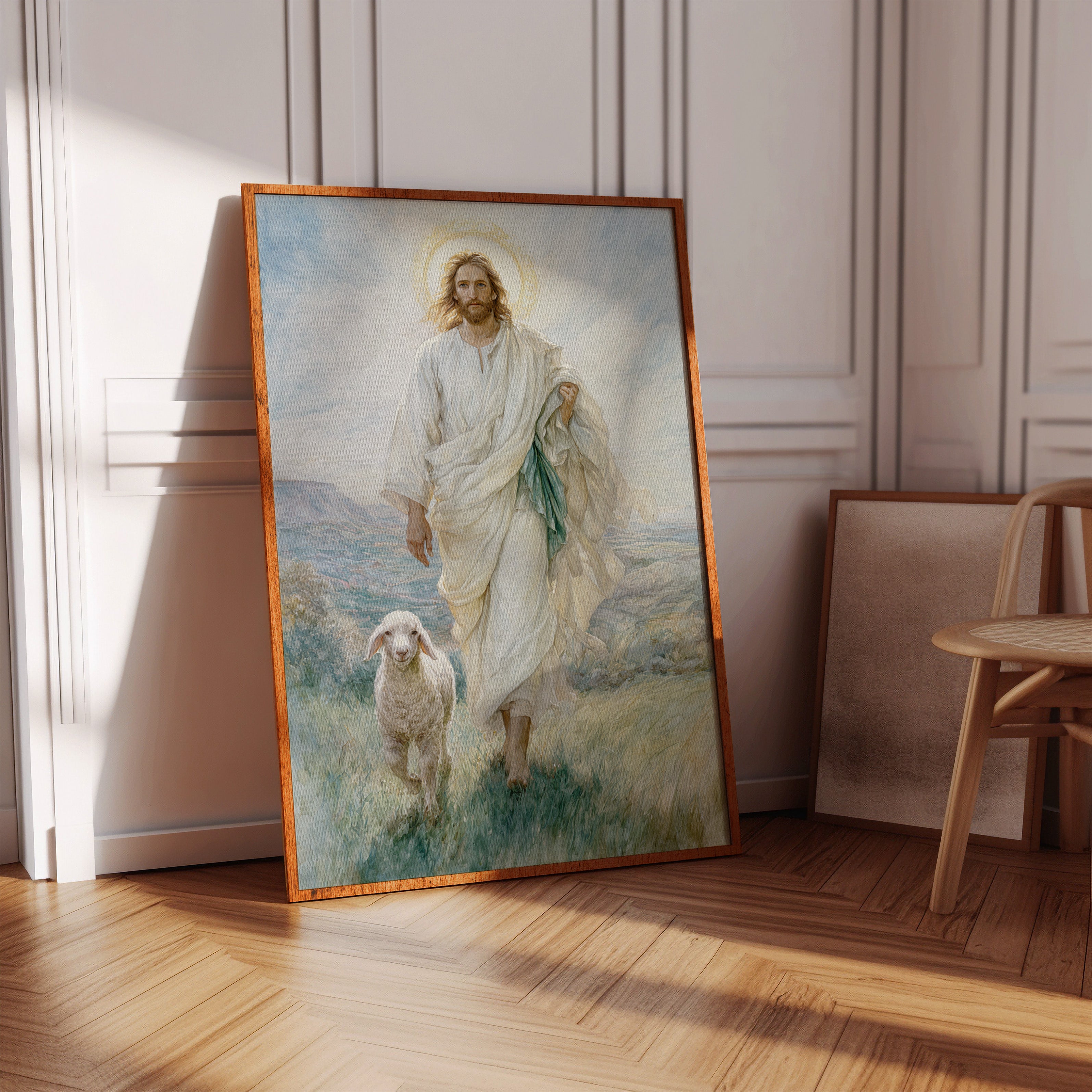 In a sunlit meadow, a figure walks with serene purpose, accompanied by a soft, woolly companion. This piece embodies the spirit of the 'Artisanal' collection, celebrating the harmony between humanity and nature. The gentle hues of the landscape blend seamlessly, evoking a sense of peace and tranquility, while the delicate details of flowing robes and the lively sheep invite the viewer into a narrative of companionship and guidance. Ideal for a serene space, this piece fits beautifully in a reading nook or meditation area, fostering a calm atmosphere.