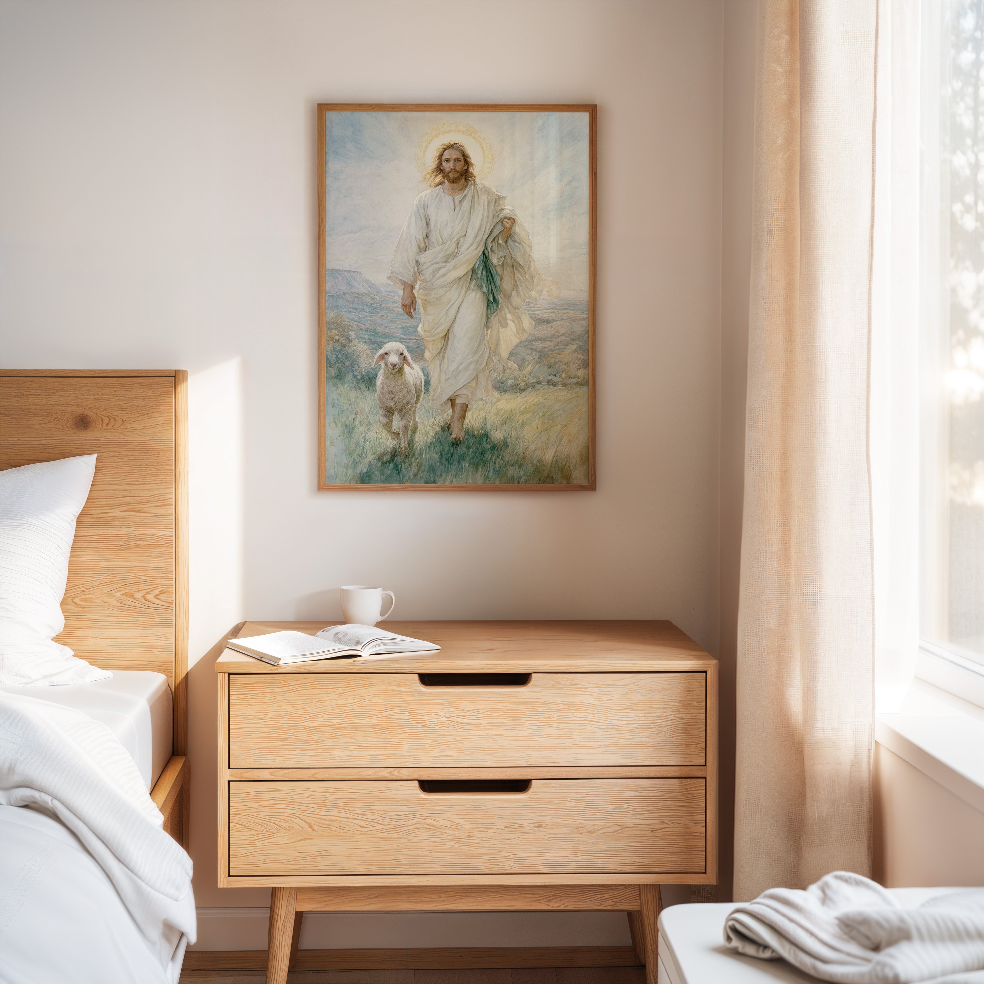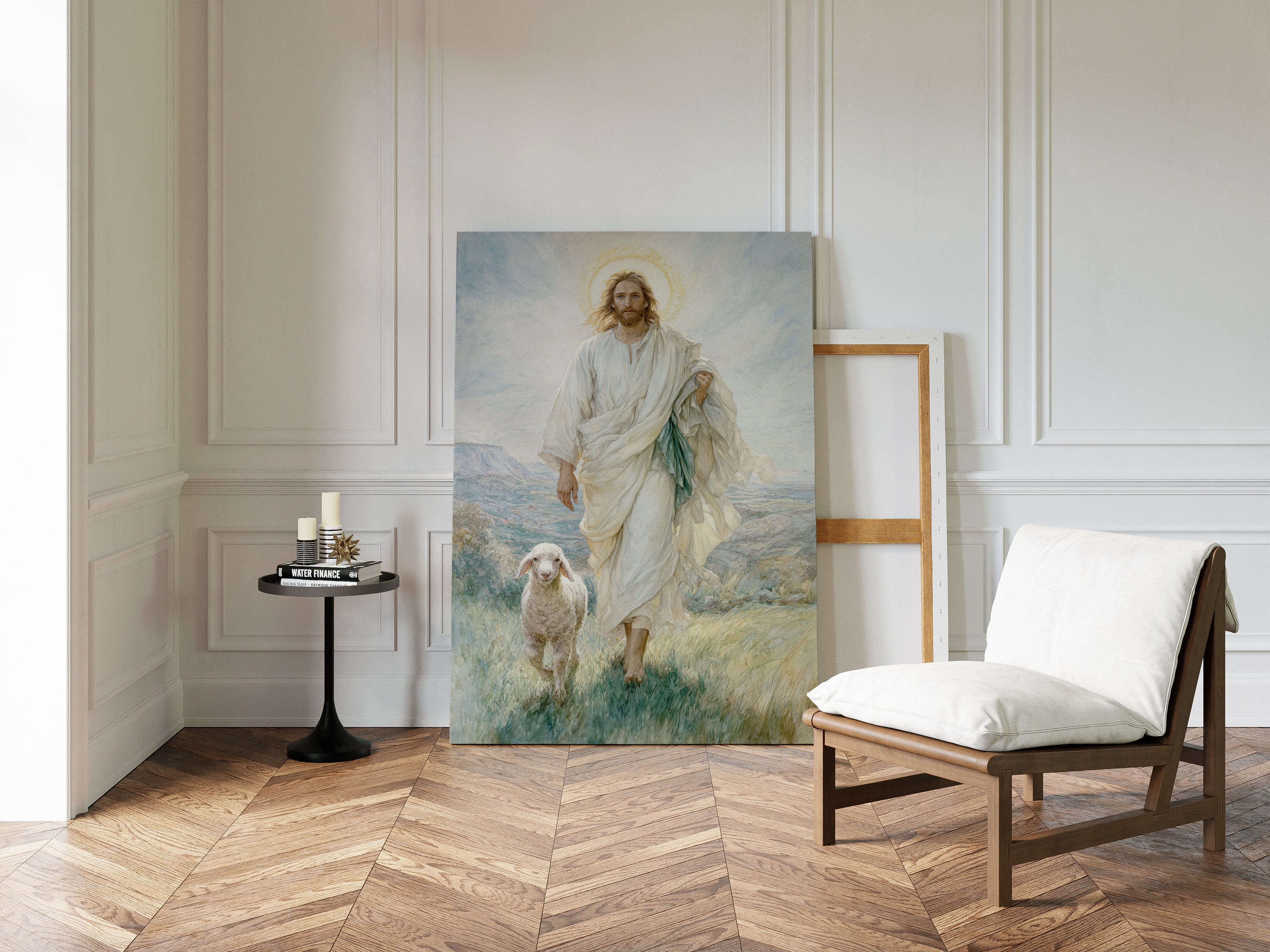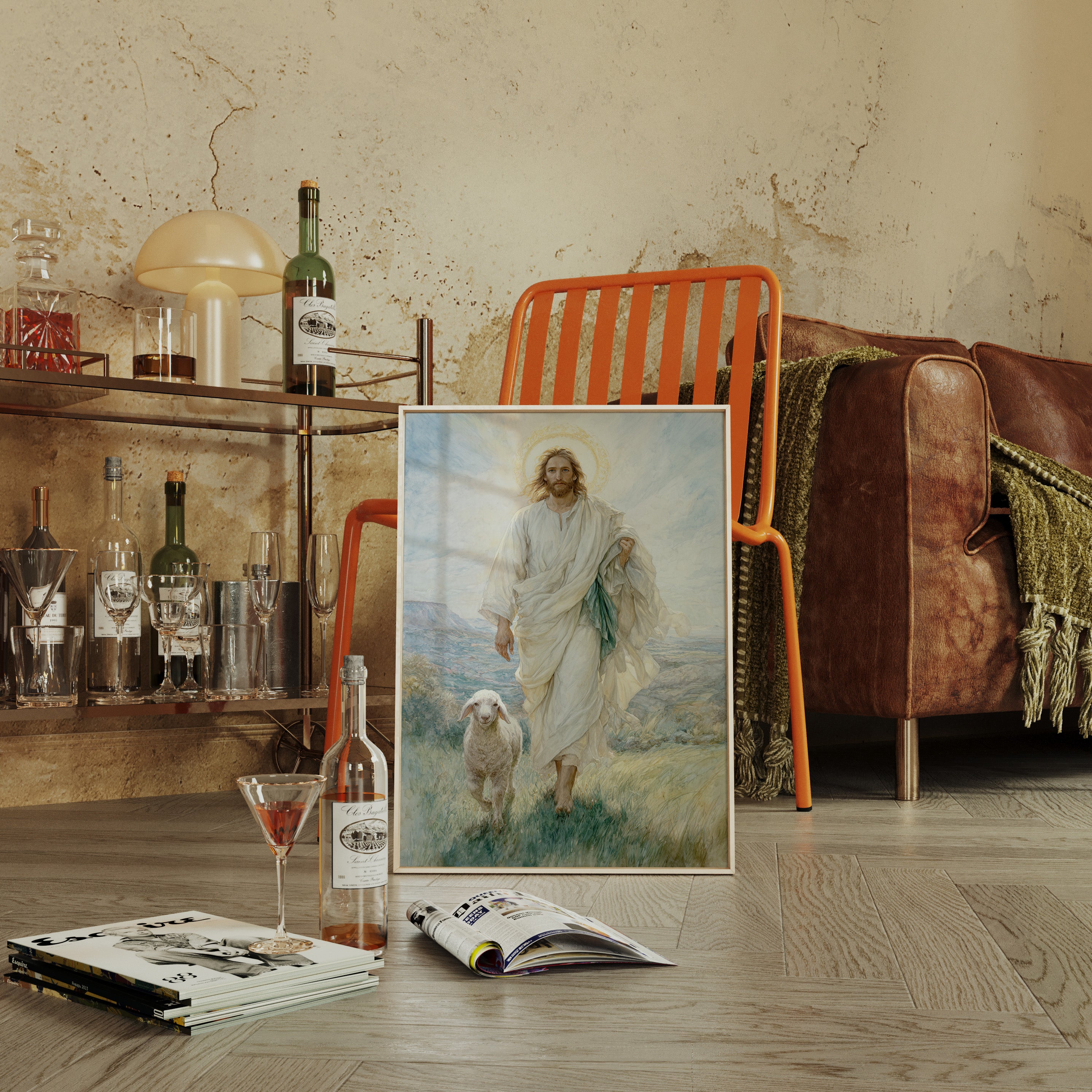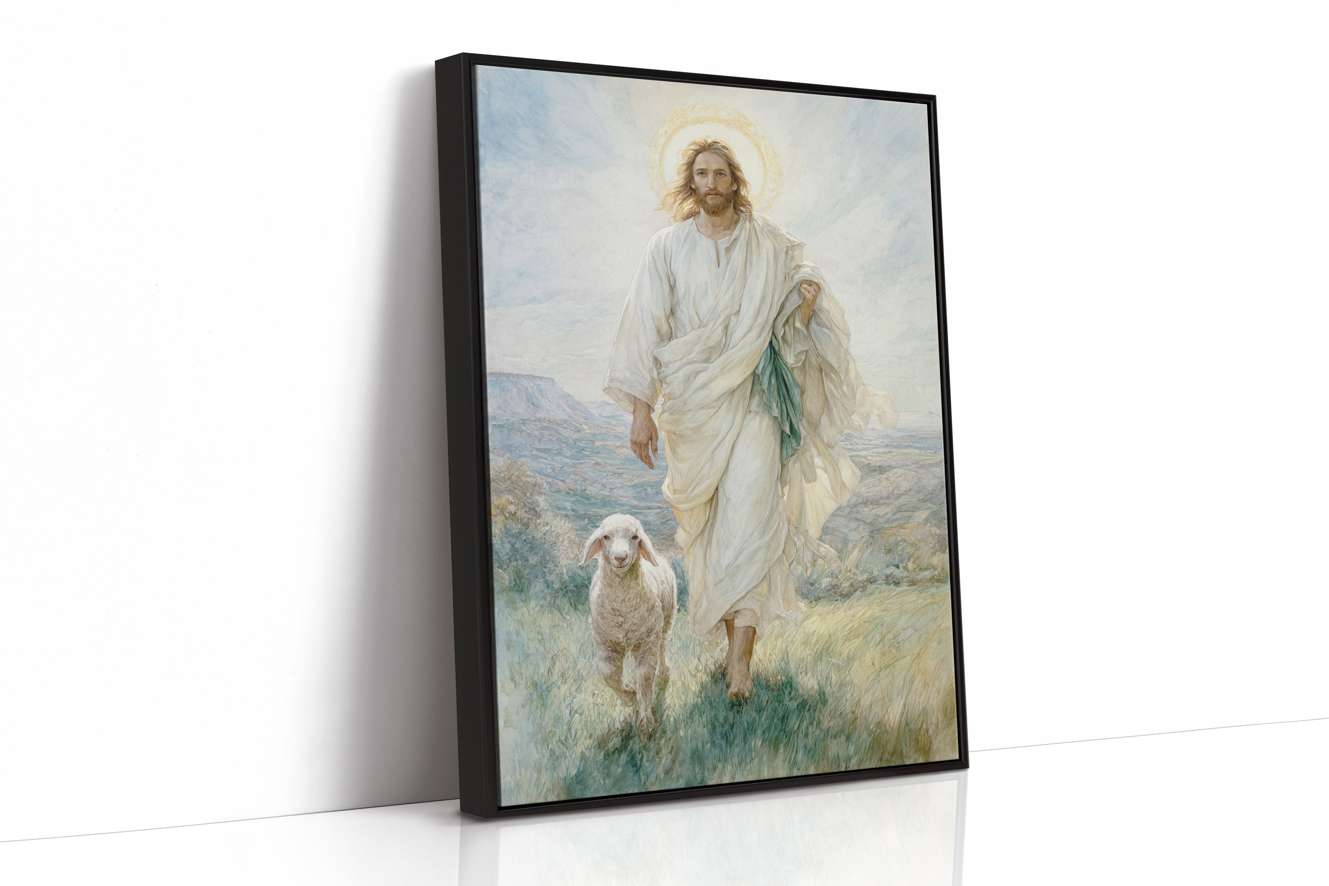 In a sunlit meadow, a figure walks with serene purpose, accompanied by a soft, woolly companion. This piece embodies the spirit of the 'Artisanal' collection, celebrating the harmony between humanity and nature. The gentle hues of the landscape blend seamlessly, evoking a sense of peace and tranquility, while the delicate details of flowing robes and the lively sheep invite the viewer into a narrative of companionship and guidance. Ideal for a serene space, this piece fits beautifully in a reading nook or meditation area, fostering a calm atmosphere.