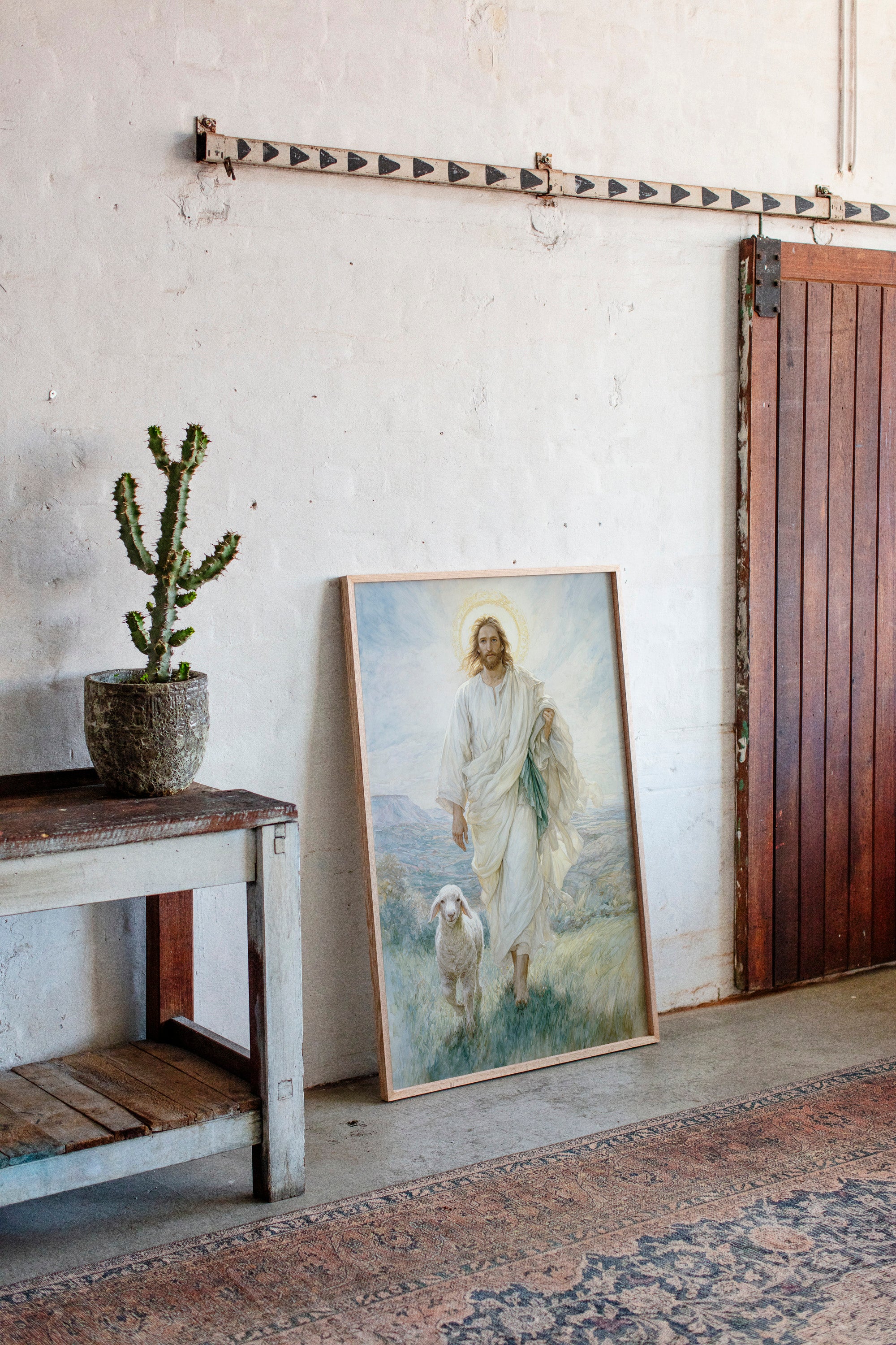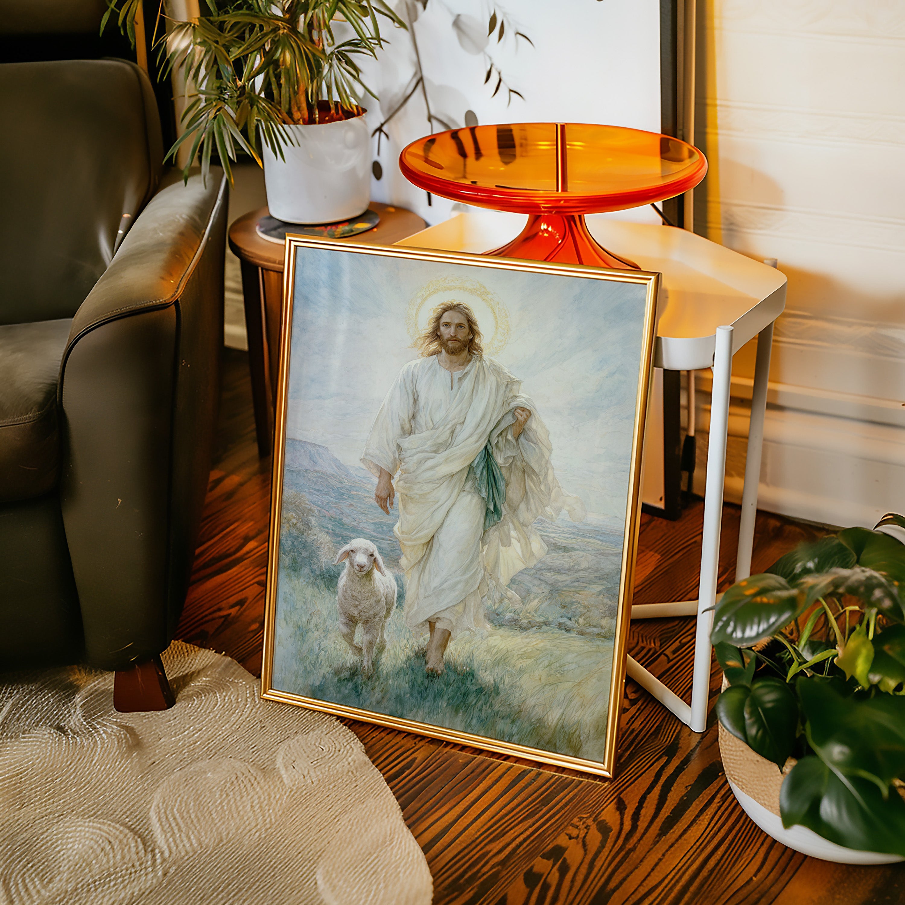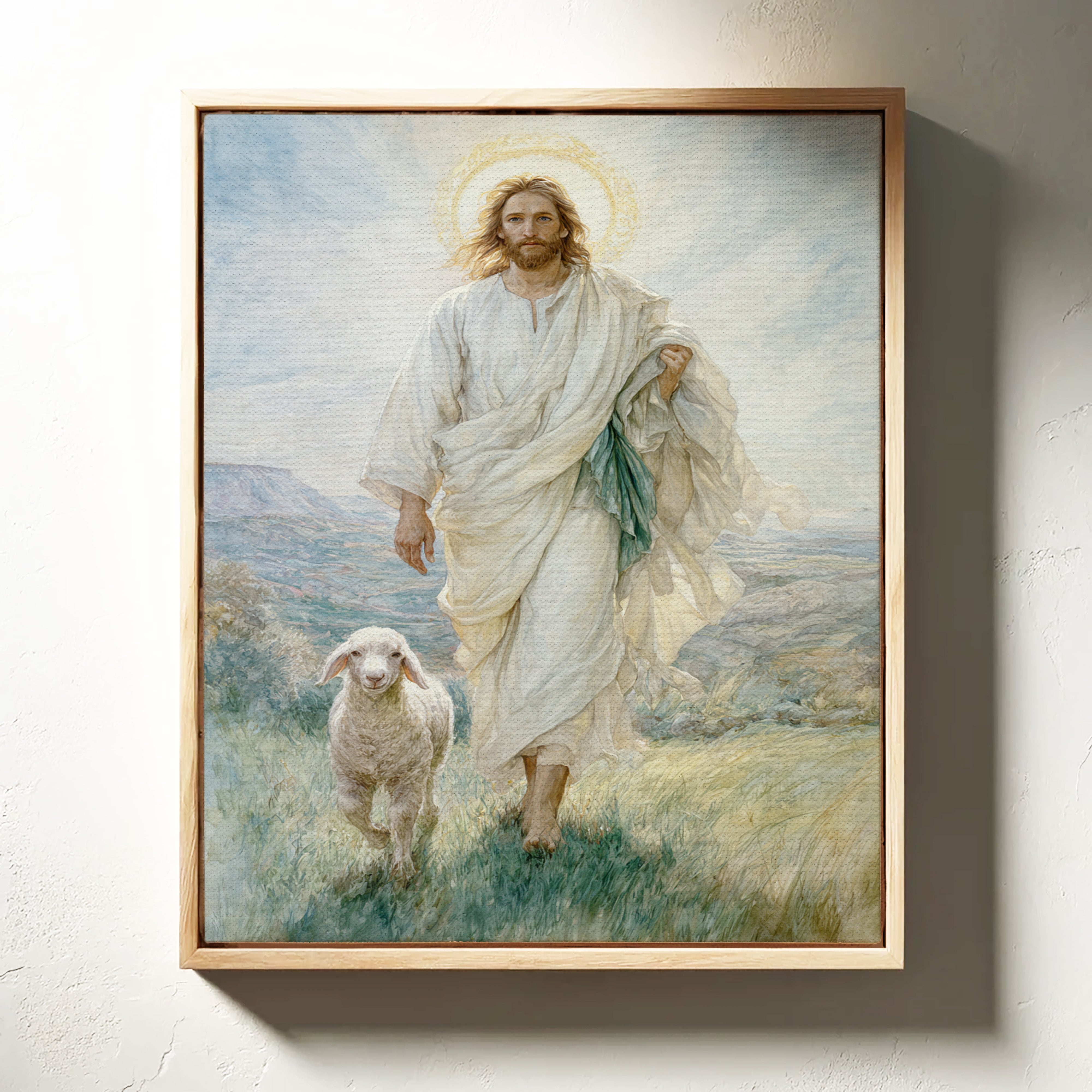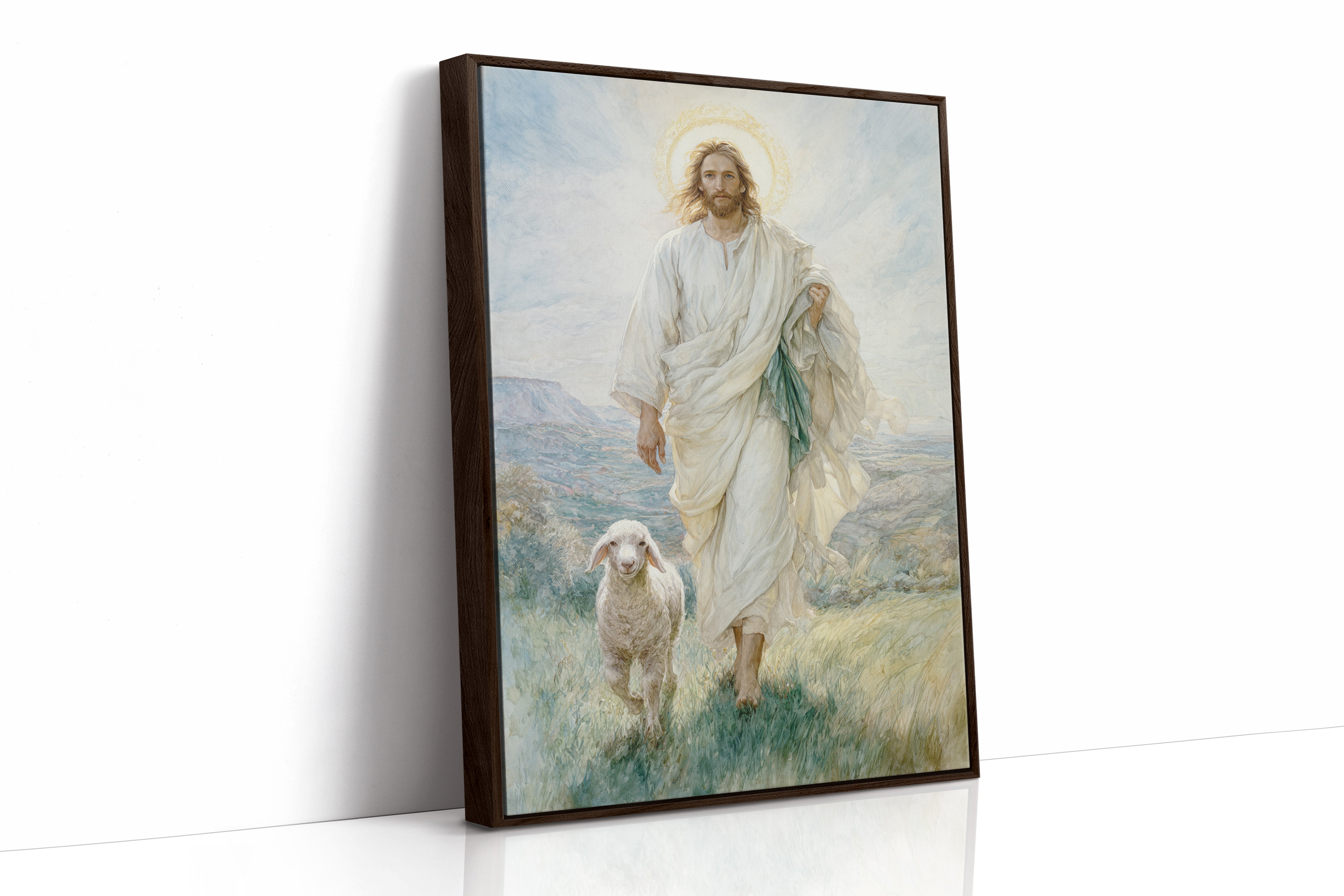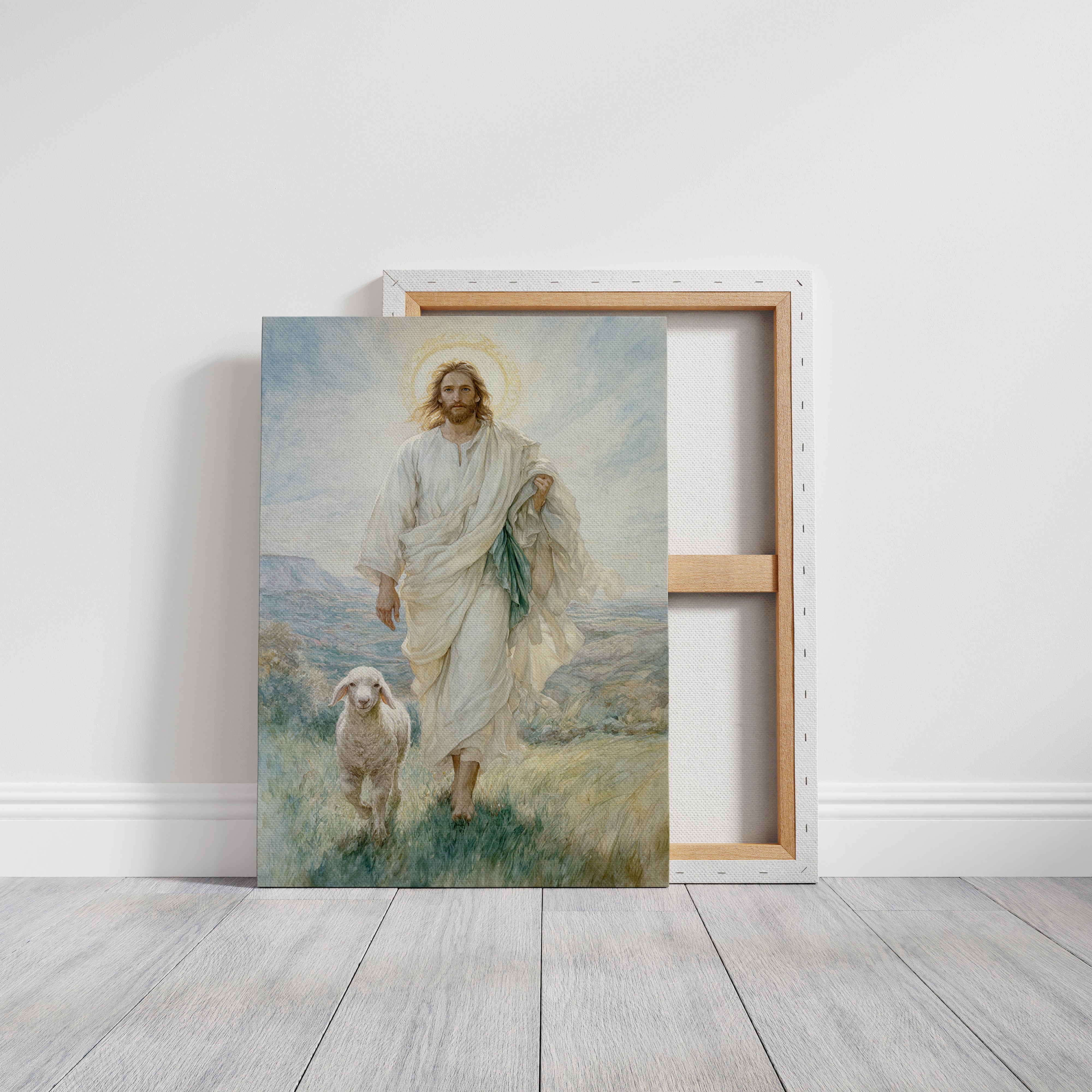 In a sunlit meadow, a figure walks with serene purpose, accompanied by a soft, woolly companion. This piece embodies the spirit of the 'Artisanal' collection, celebrating the harmony between humanity and nature. The gentle hues of the landscape blend seamlessly, evoking a sense of peace and tranquility, while the delicate details of flowing robes and the lively sheep invite the viewer into a narrative of companionship and guidance. Ideal for a serene space, this piece fits beautifully in a reading nook or meditation area, fostering a calm atmosphere.