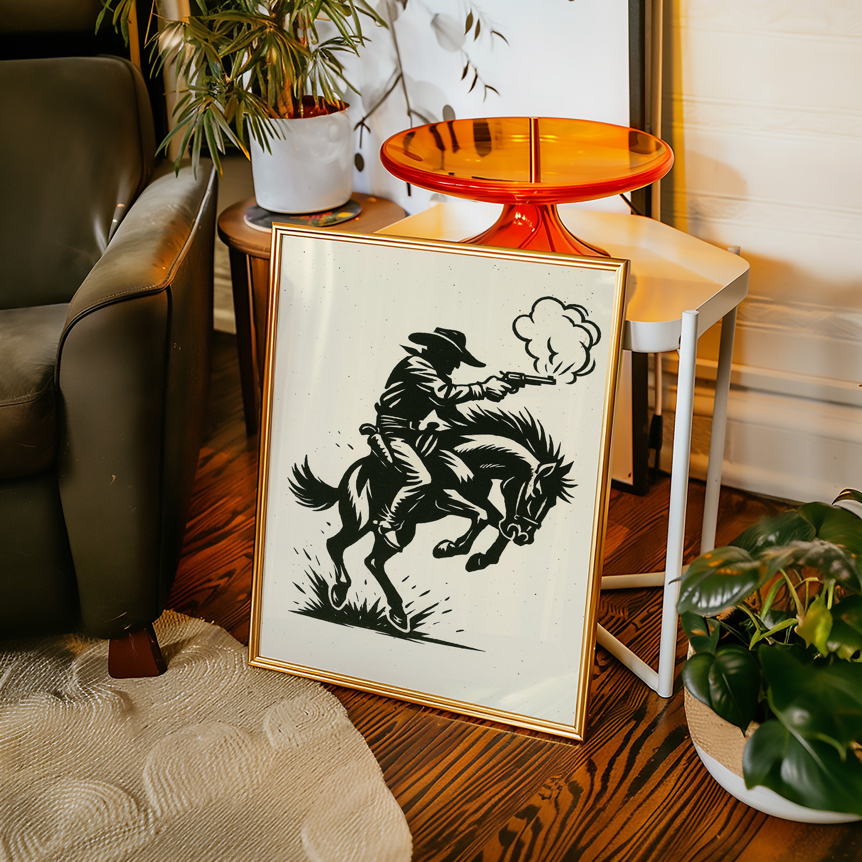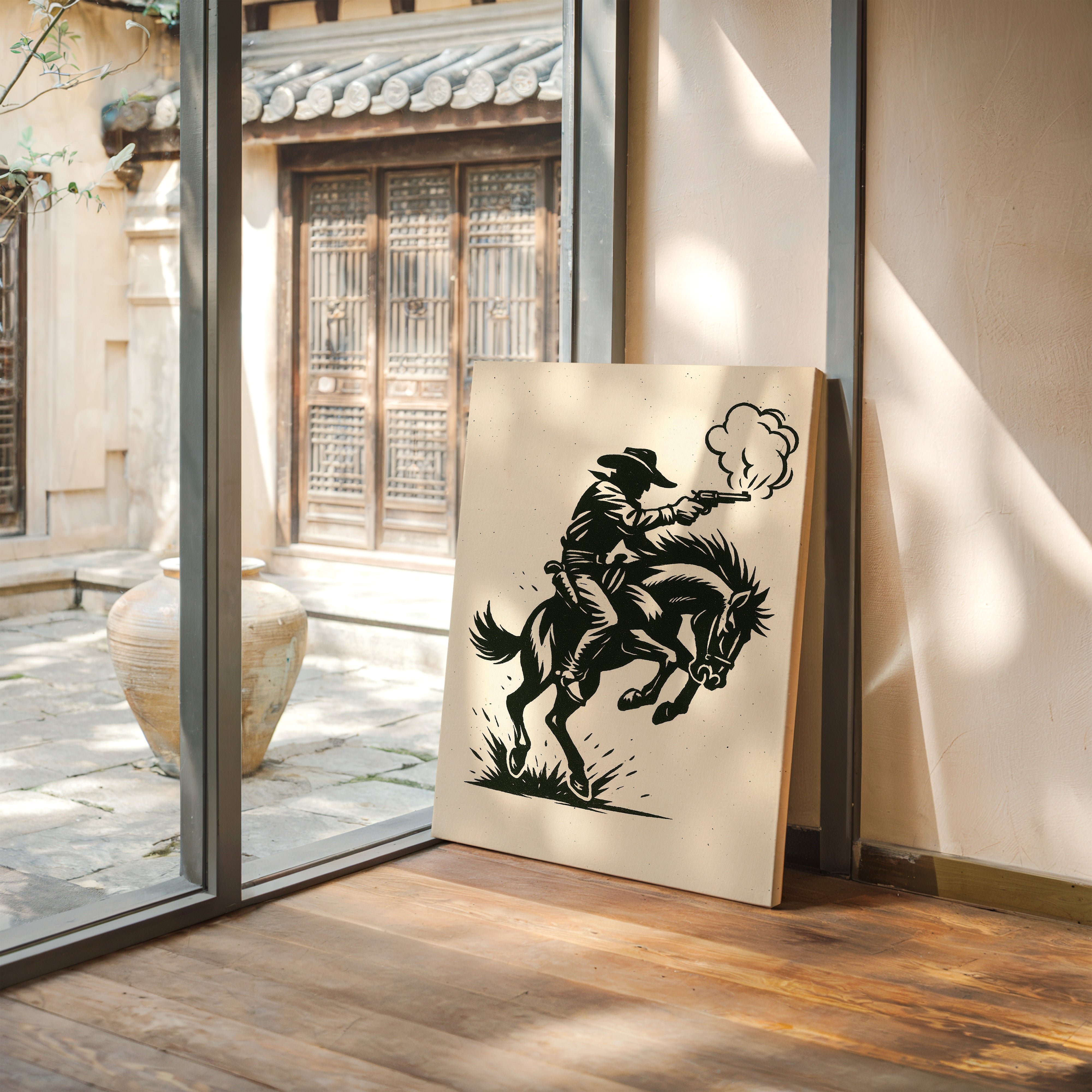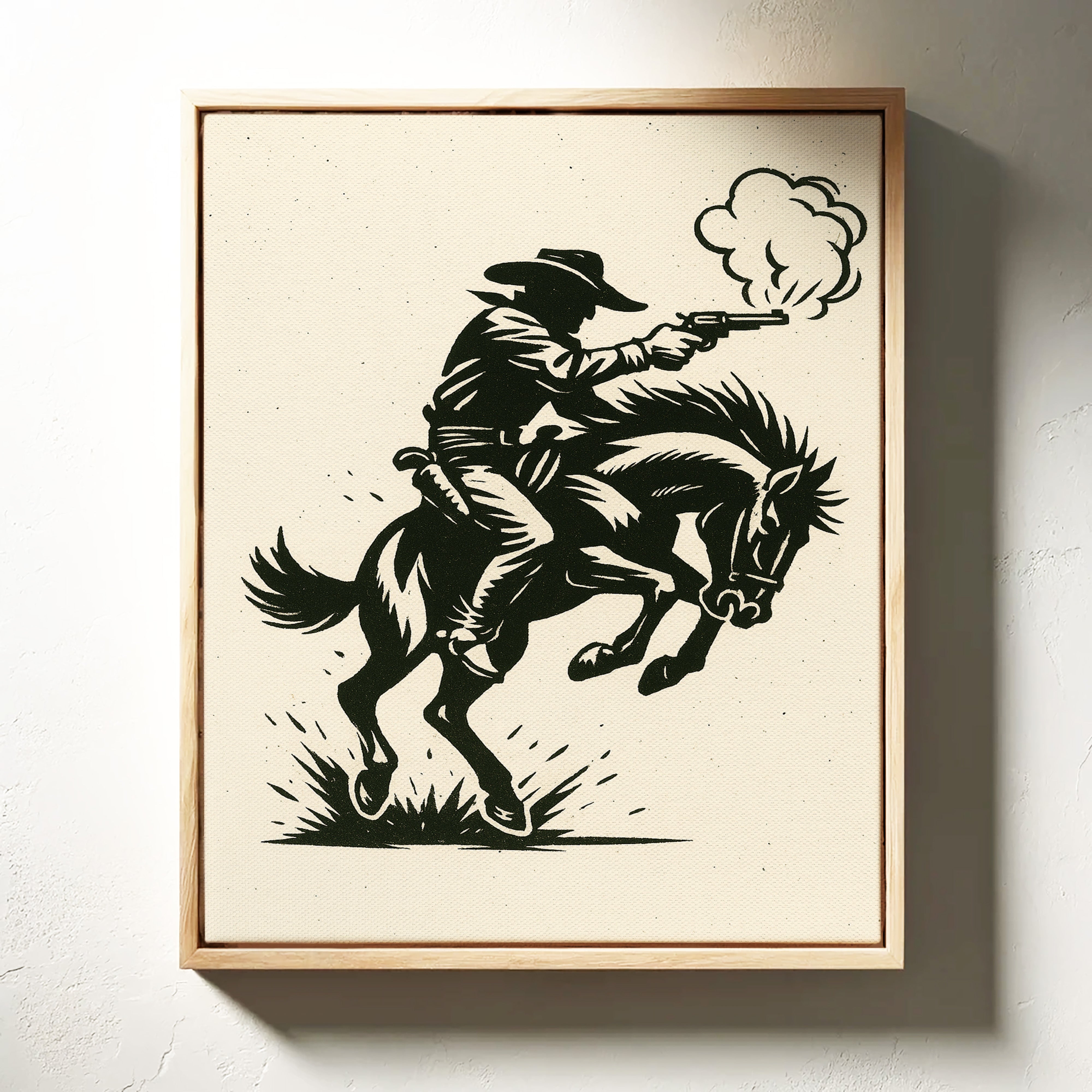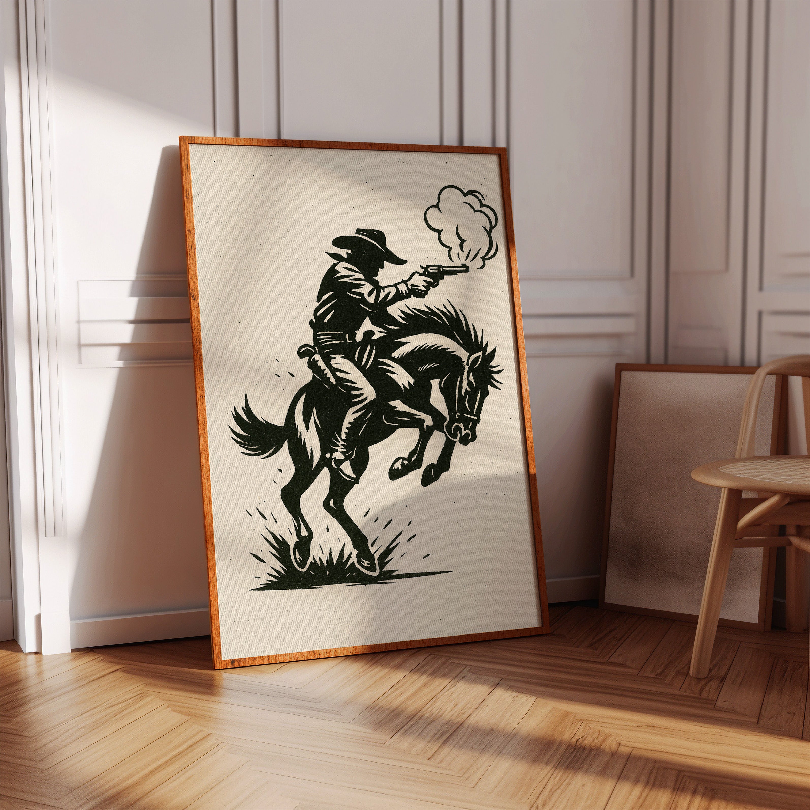 A split-second captured in grit and smoke—a rider fires mid-leap as the dust erupts beneath them. Rendered in bold vintage engraving, it roars with western drama.