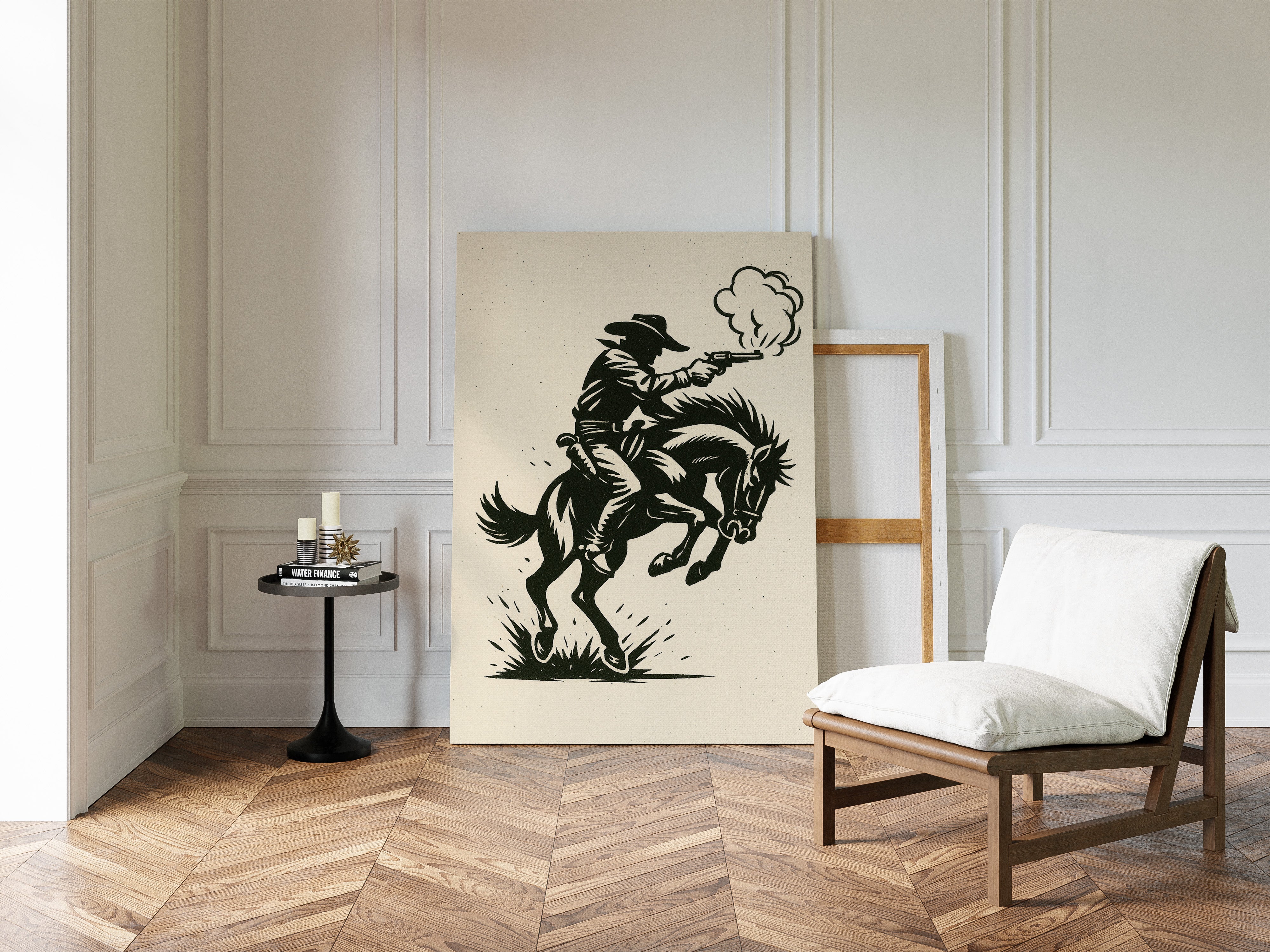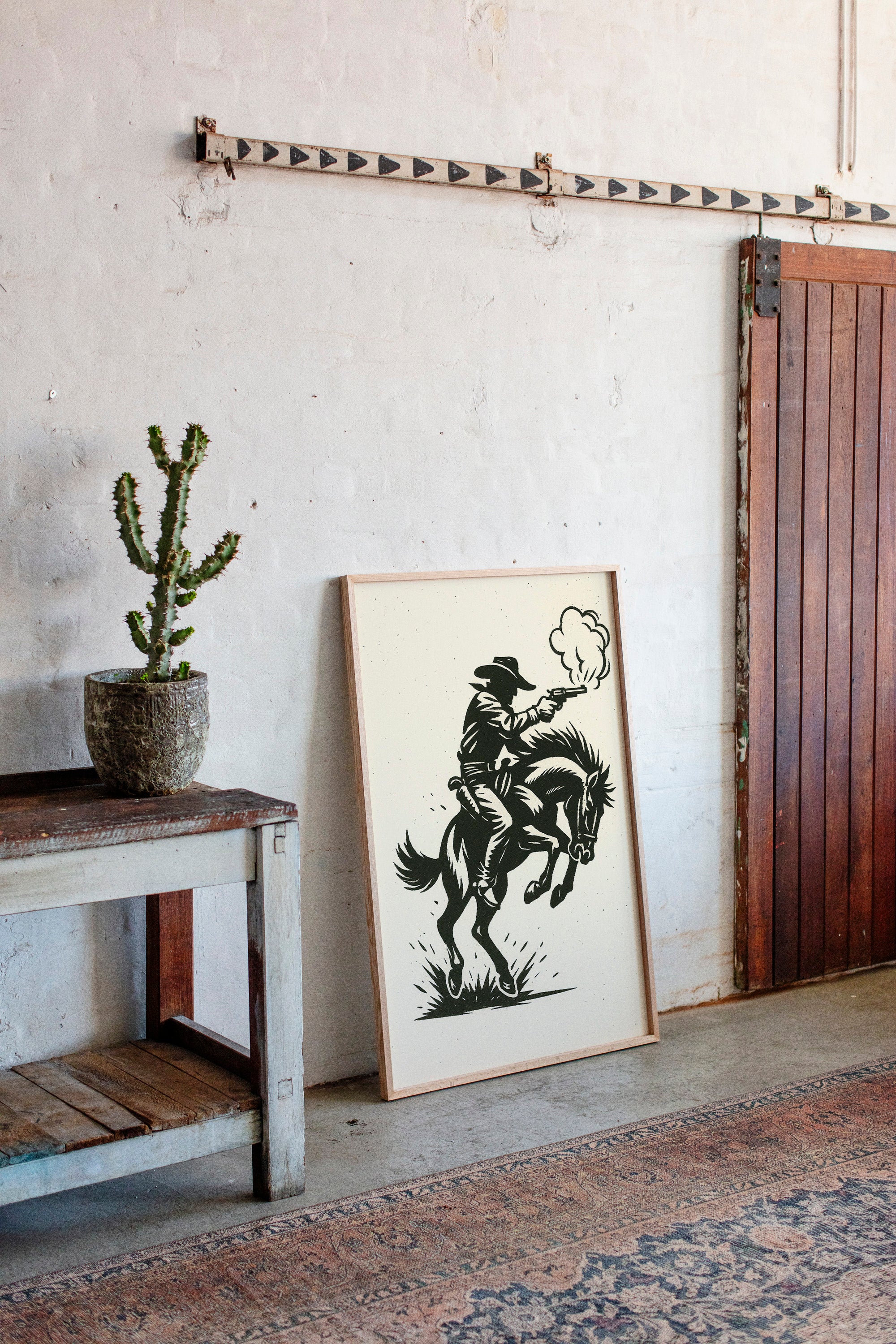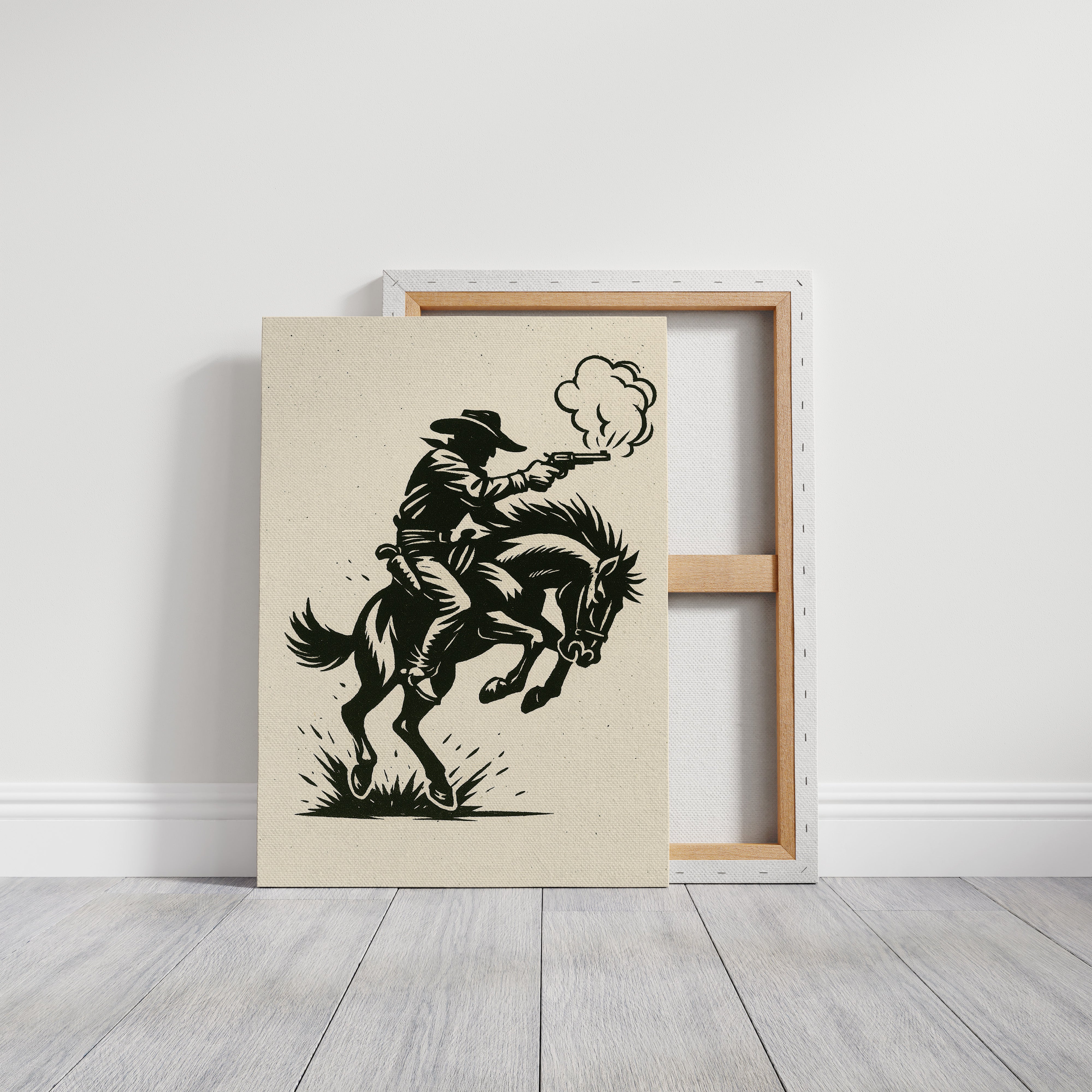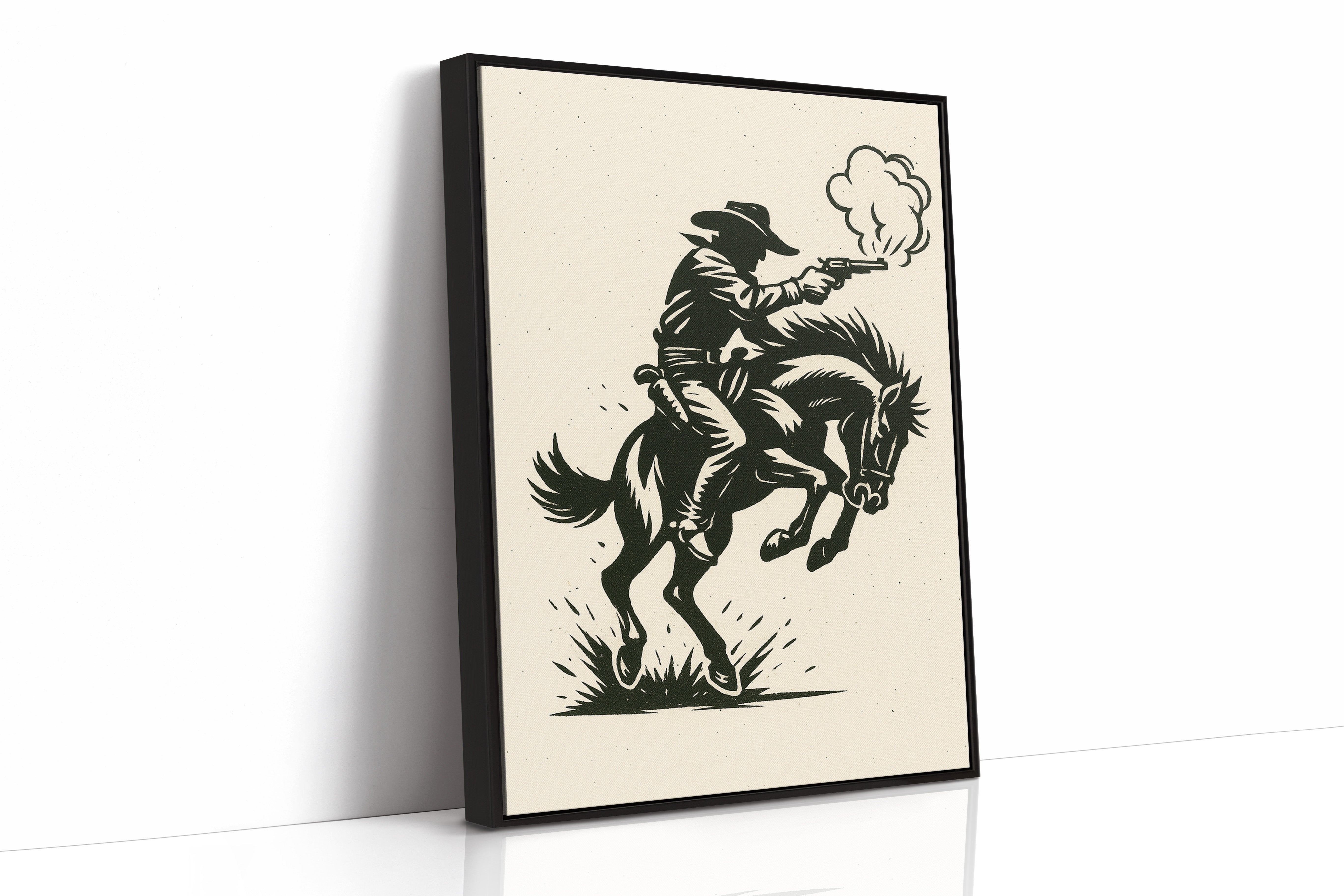 A split-second captured in grit and smoke—a rider fires mid-leap as the dust erupts beneath them. Rendered in bold vintage engraving, it roars with western drama.