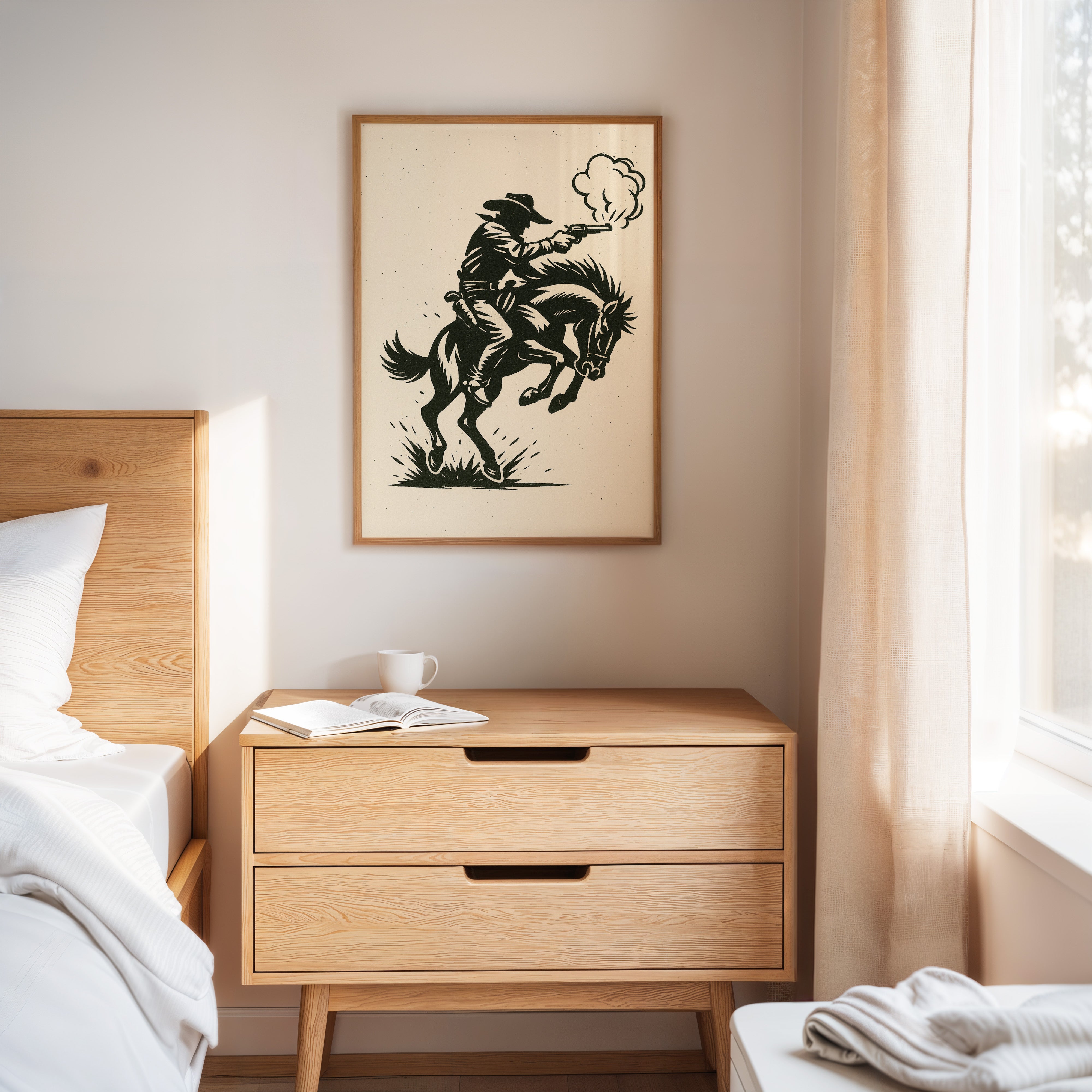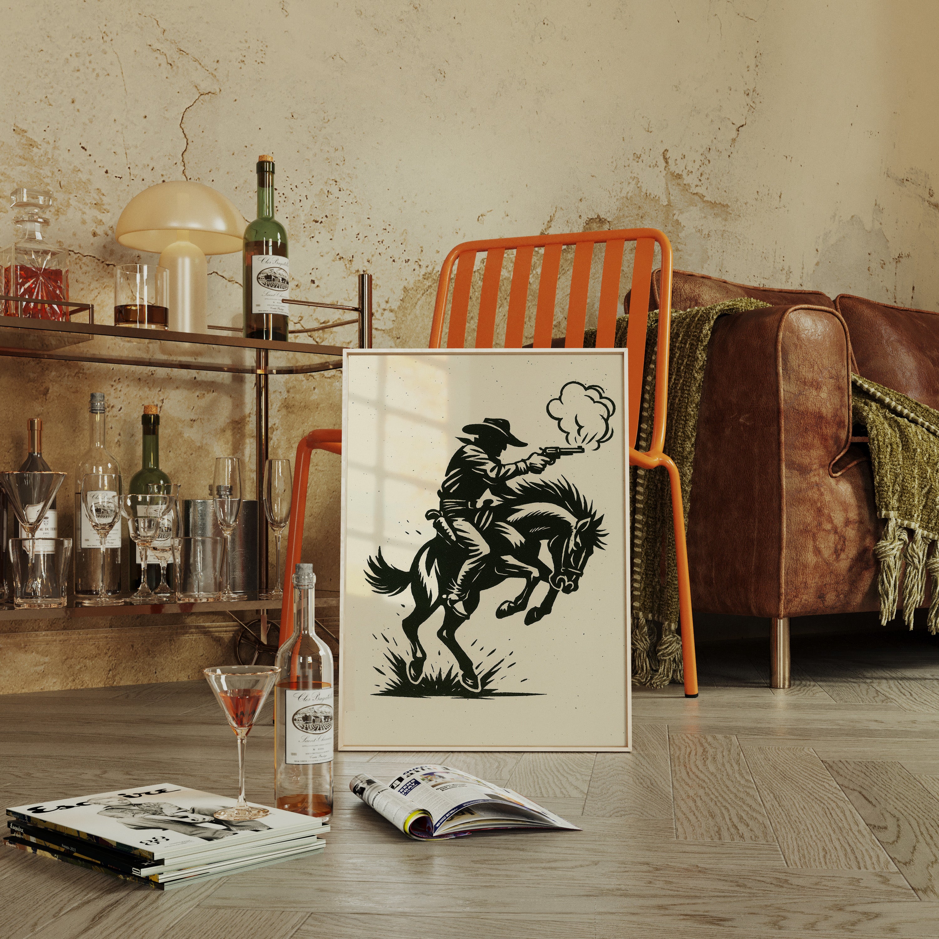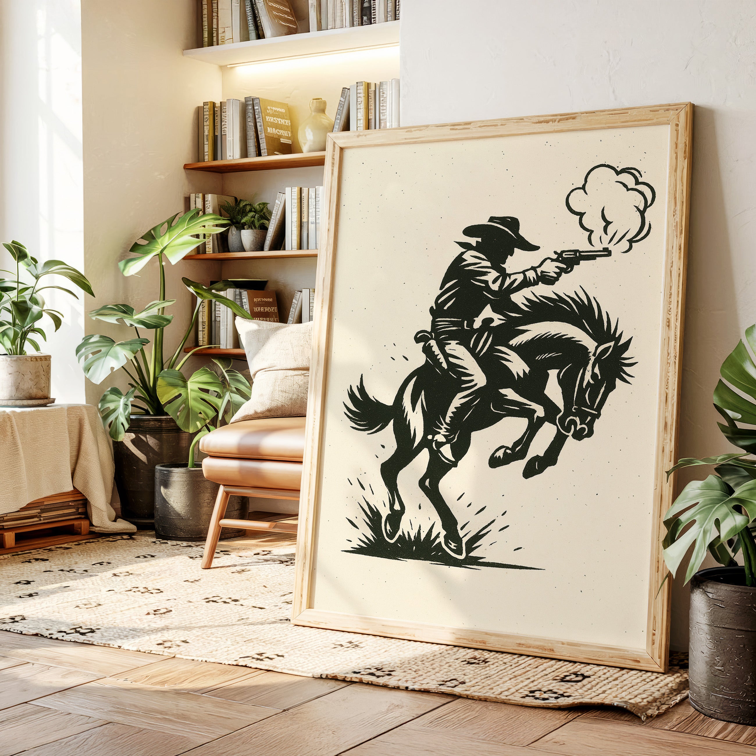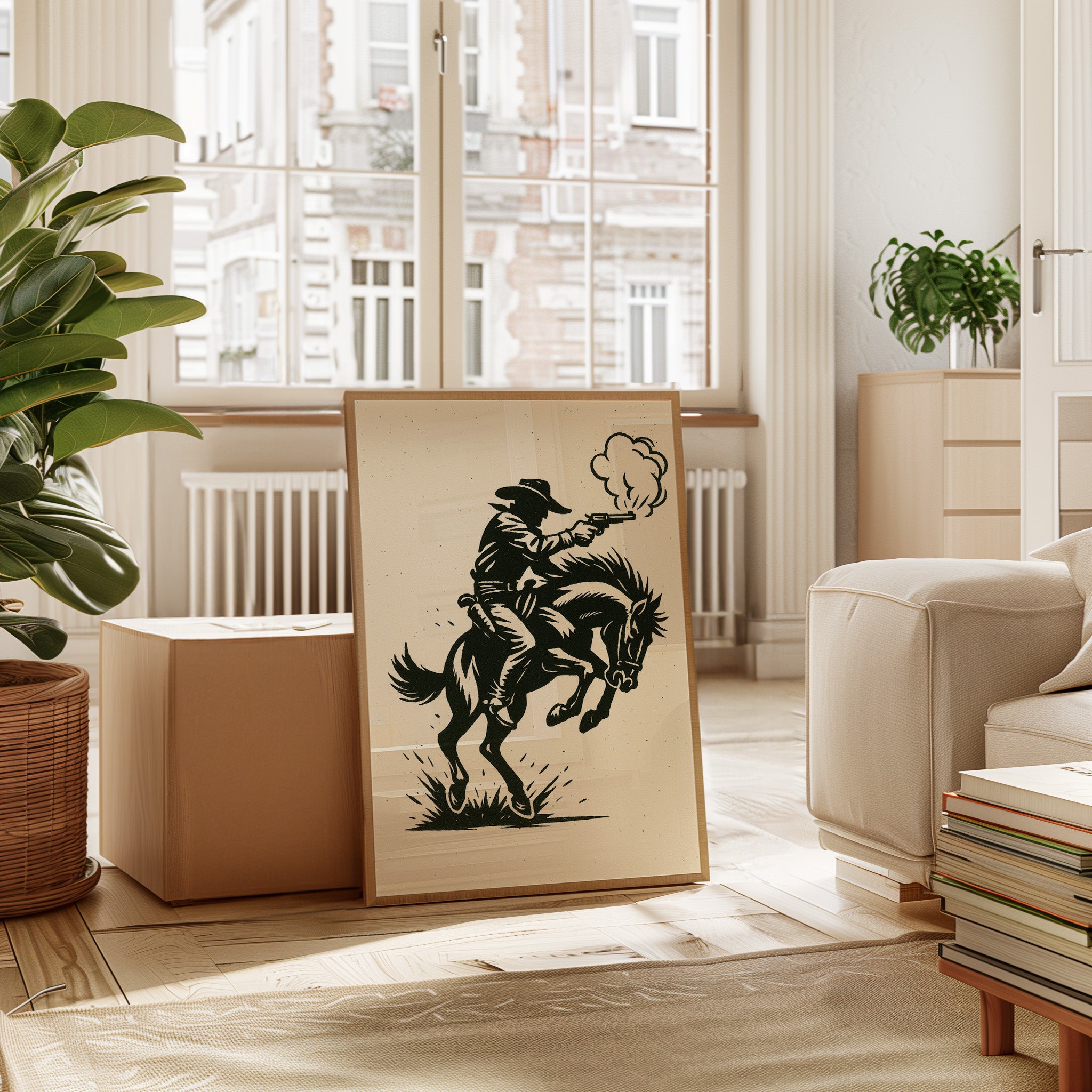 A split-second captured in grit and smoke—a rider fires mid-leap as the dust erupts beneath them. Rendered in bold vintage engraving, it roars with western drama.