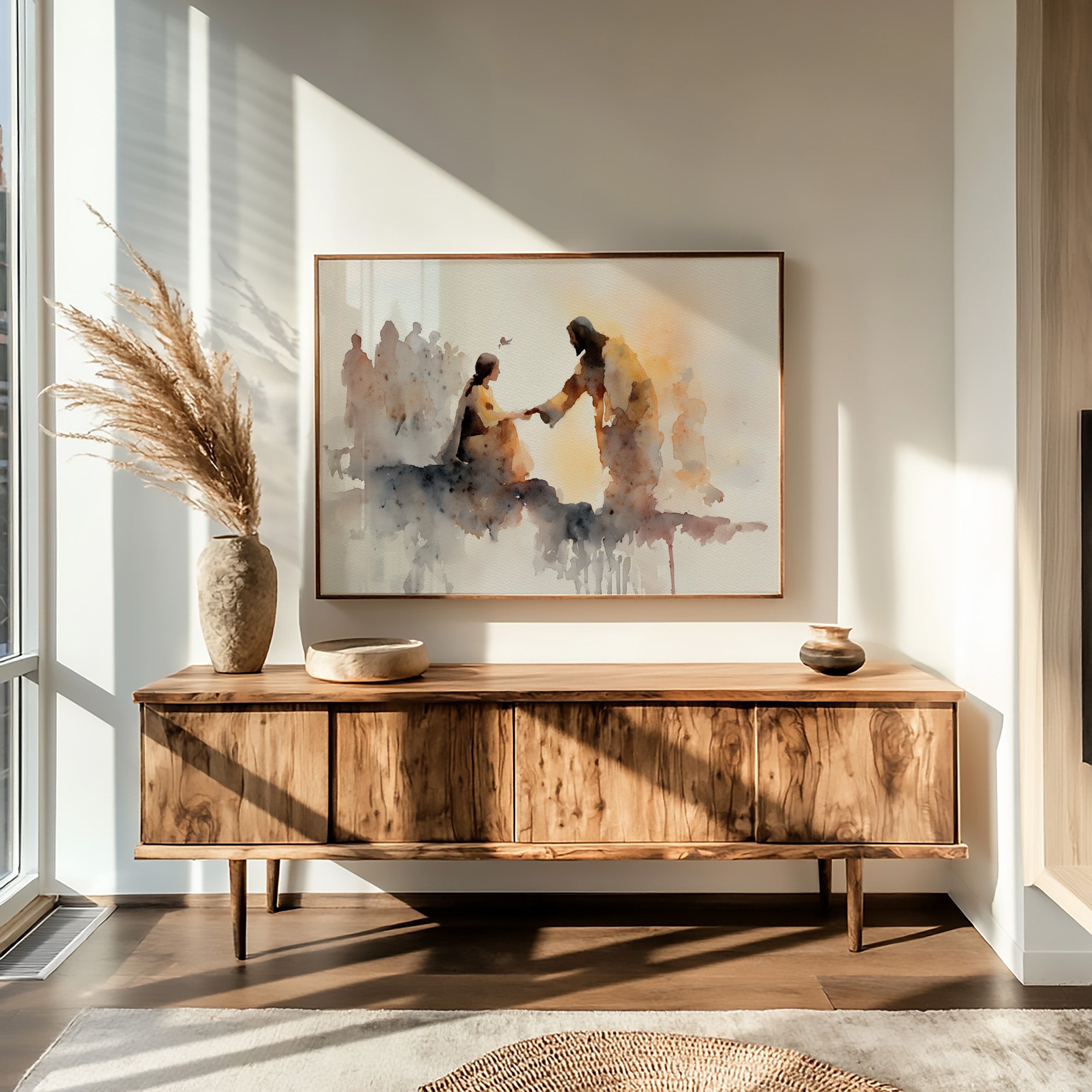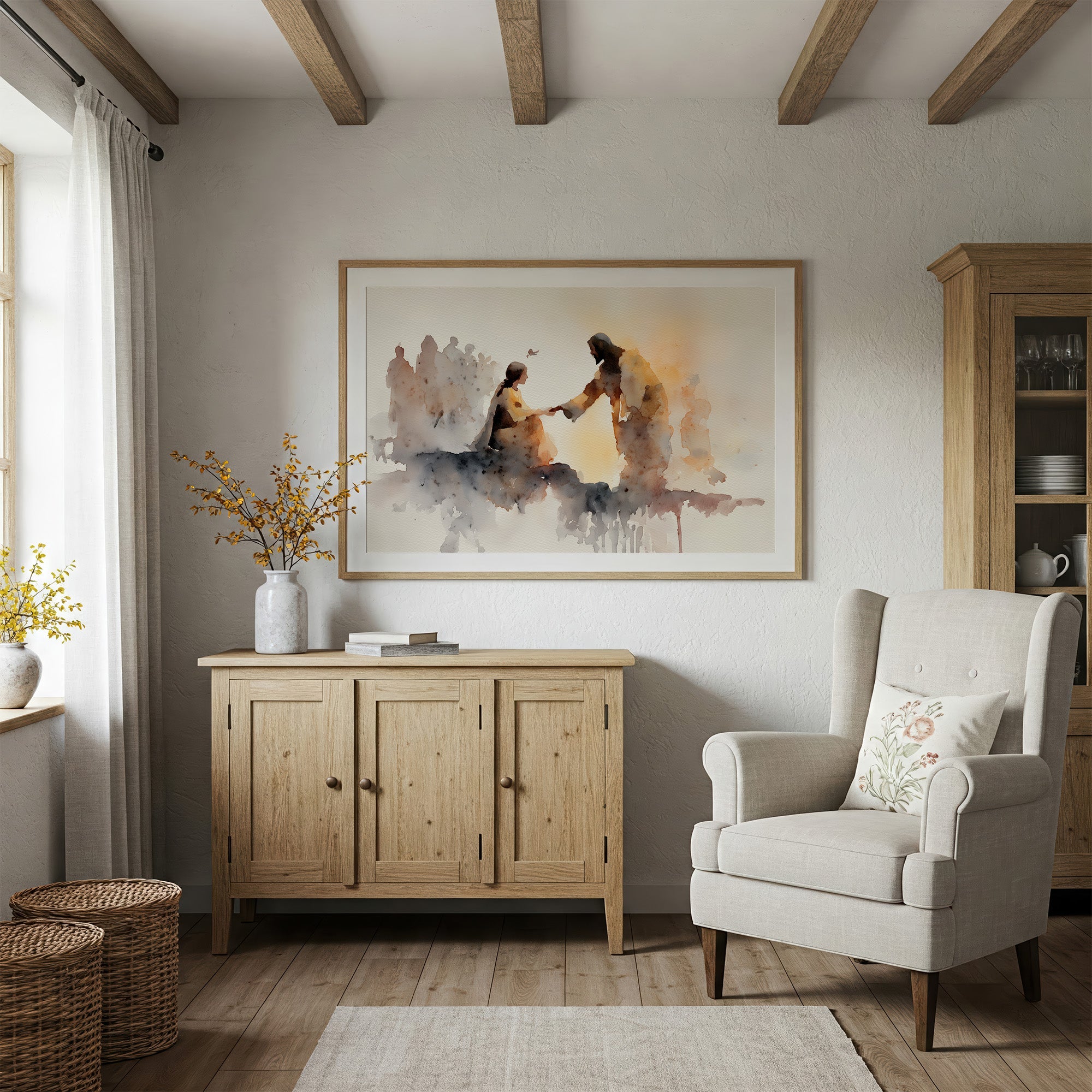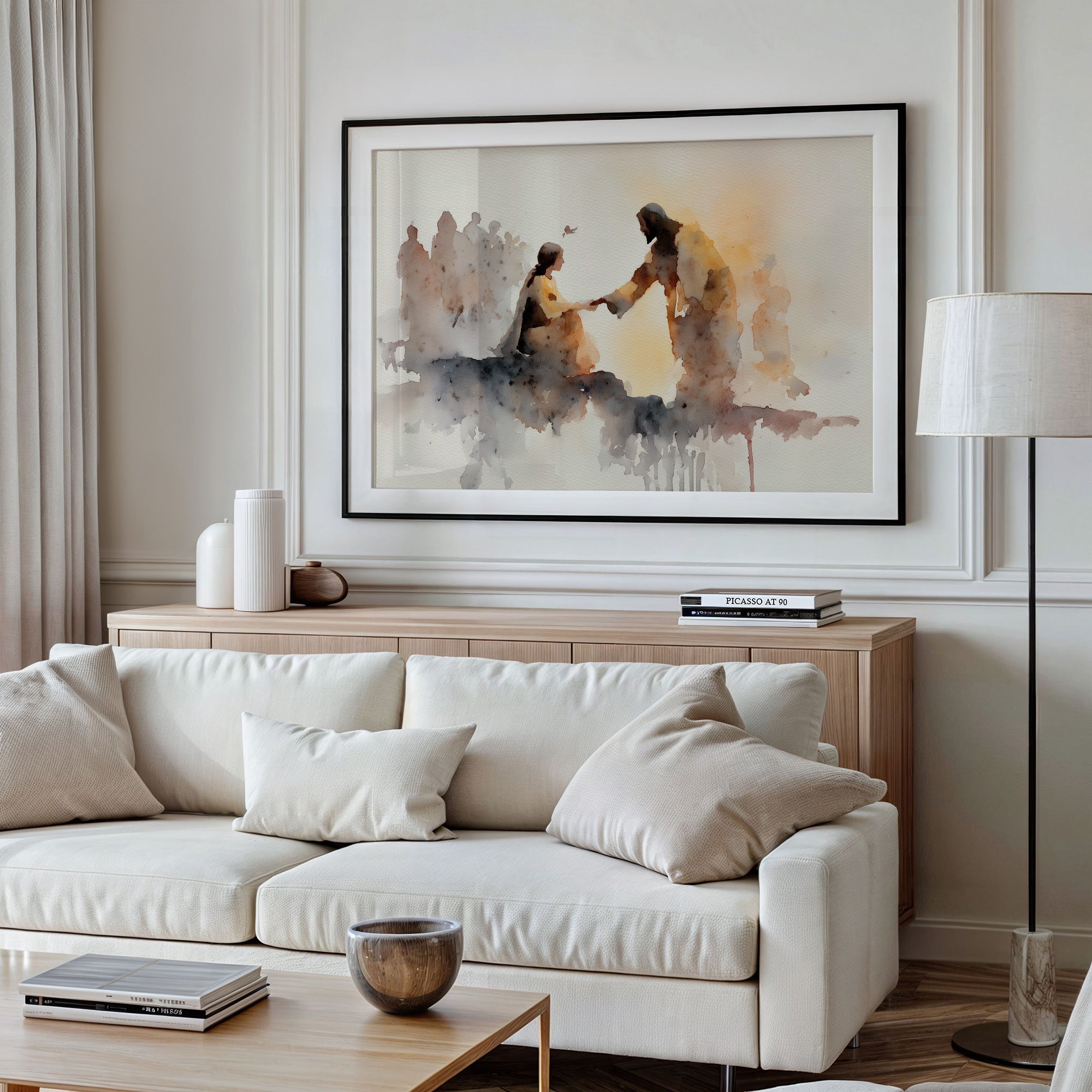 A moment of profound connection unfolds in gentle watercolor strokes, bathed in warm amber and golden hues. Two figures reach toward one another, their silhouettes softly blending into the background while their extended hands form the emotional center of the composition. The delicate wash technique creates an ethereal quality, suggesting both intimacy and universality in this simple yet powerful gesture. This contemplative piece brings quiet sophistication to a reading nook, study, or meditation space.
