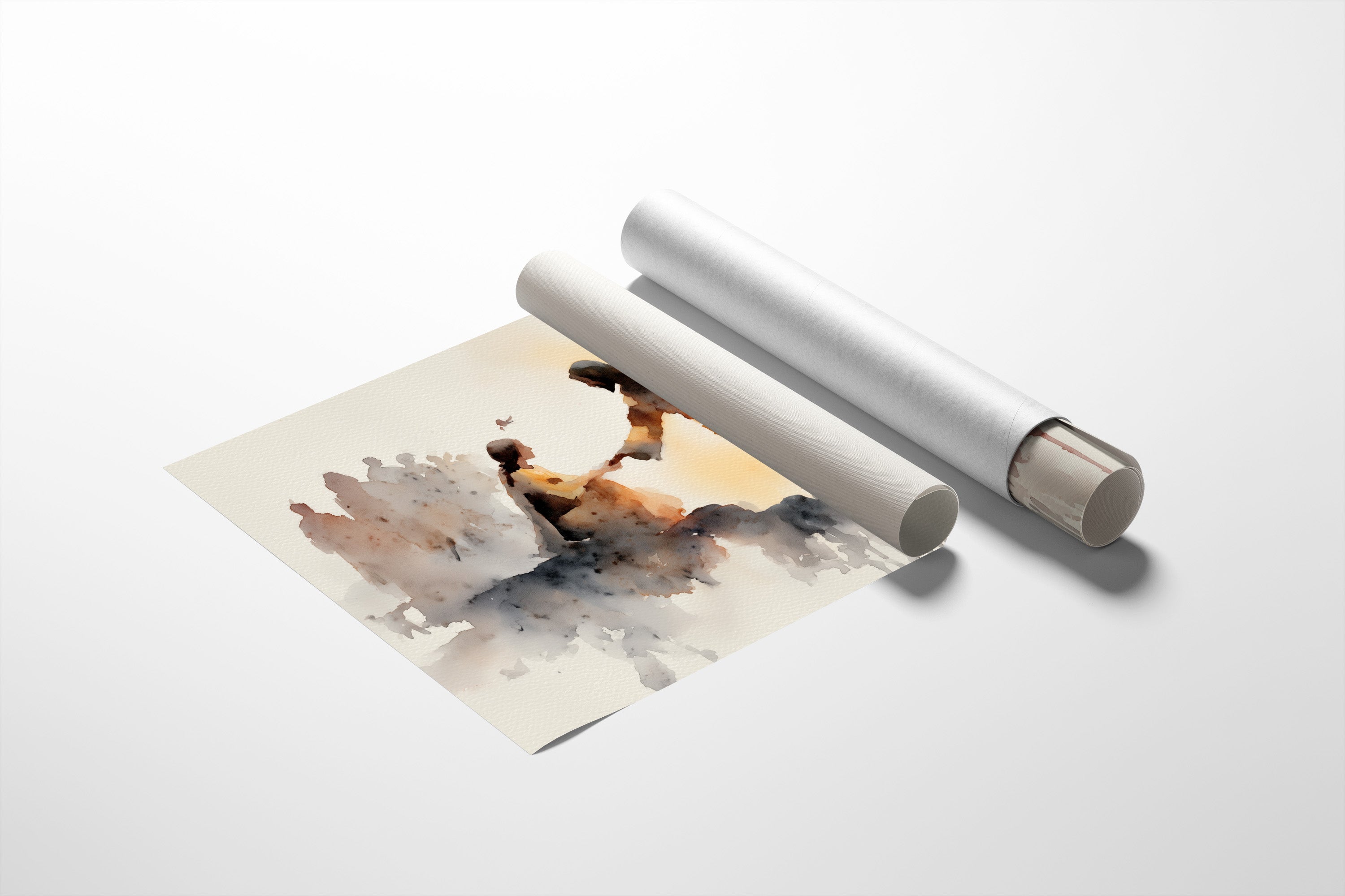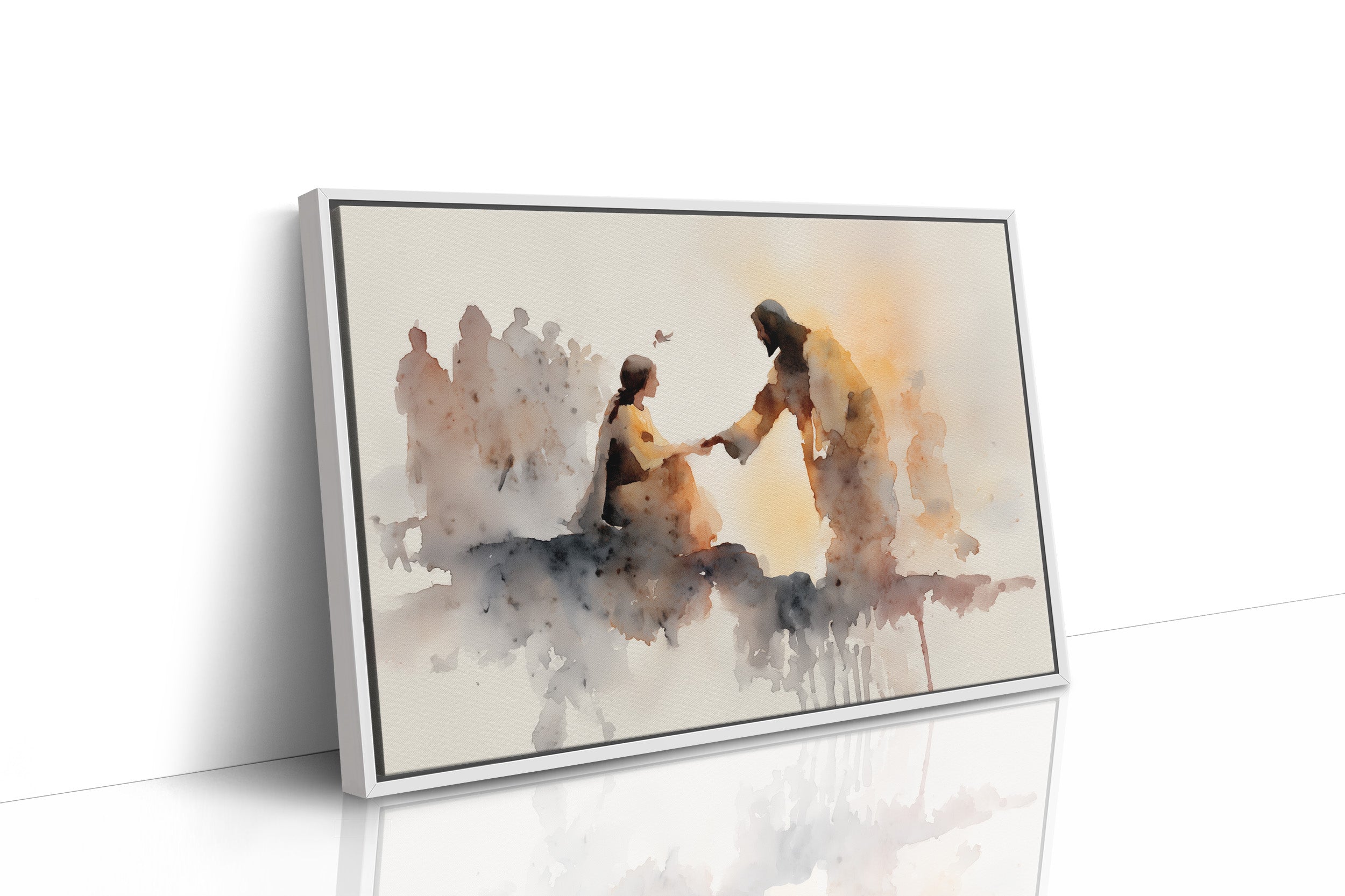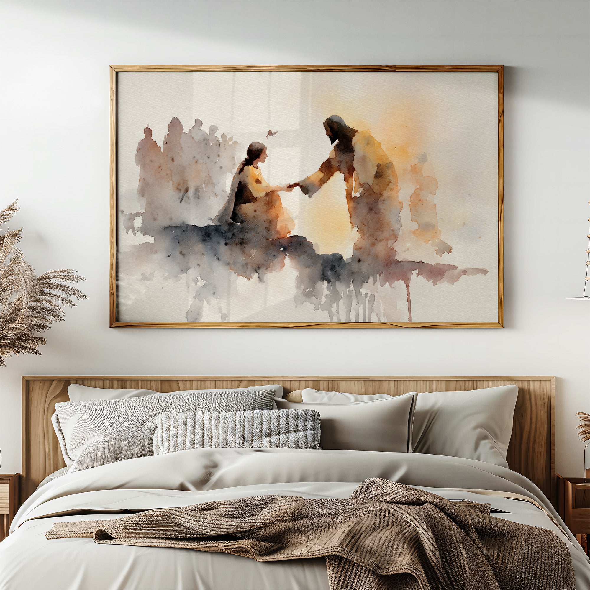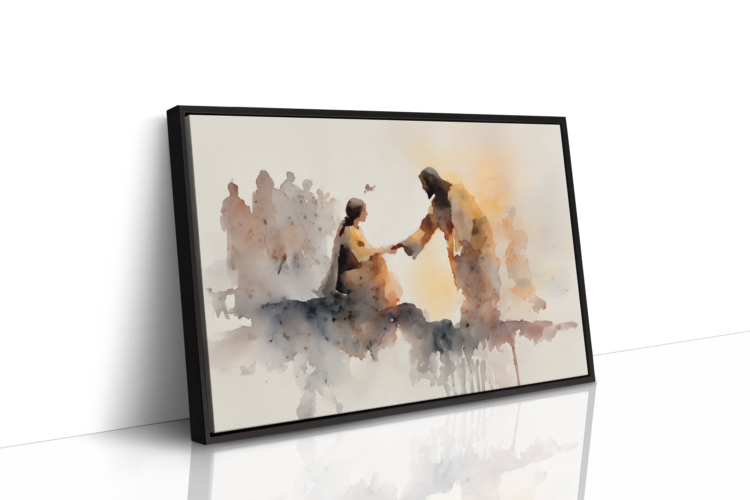 A moment of profound connection unfolds in gentle watercolor strokes, bathed in warm amber and golden hues. Two figures reach toward one another, their silhouettes softly blending into the background while their extended hands form the emotional center of the composition. The delicate wash technique creates an ethereal quality, suggesting both intimacy and universality in this simple yet powerful gesture. This contemplative piece brings quiet sophistication to a reading nook, study, or meditation space.