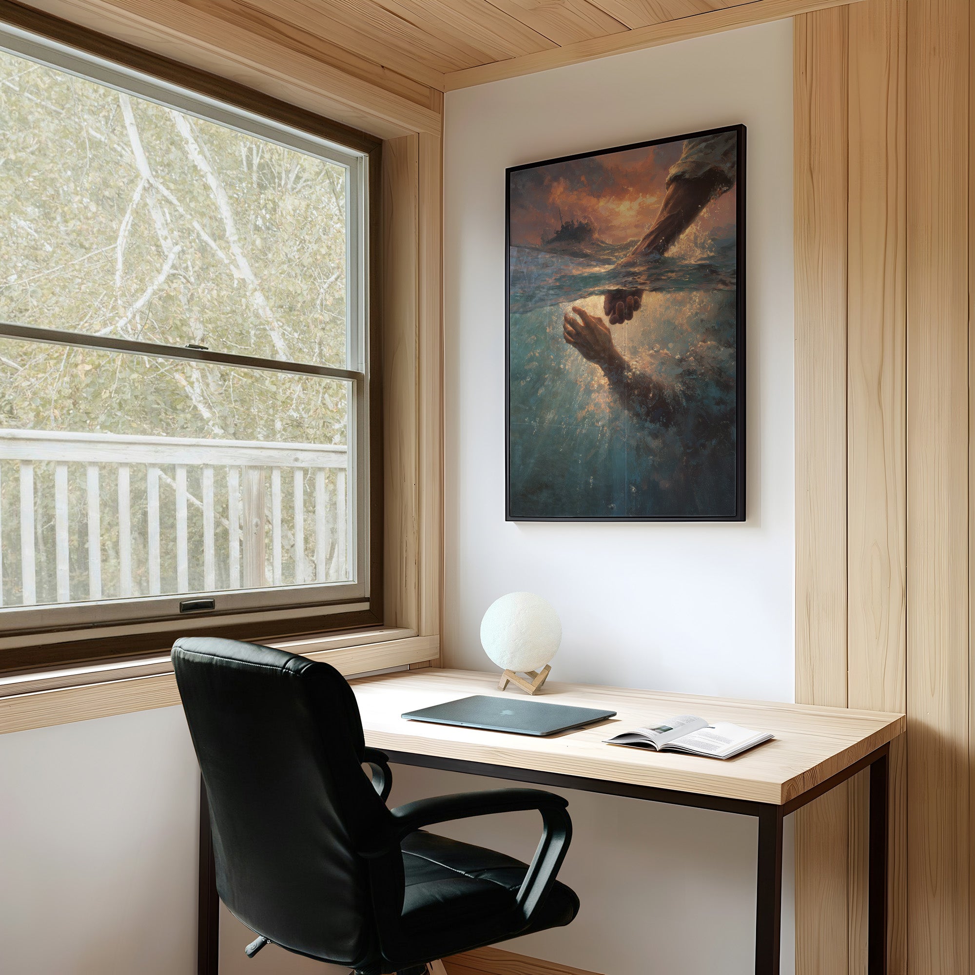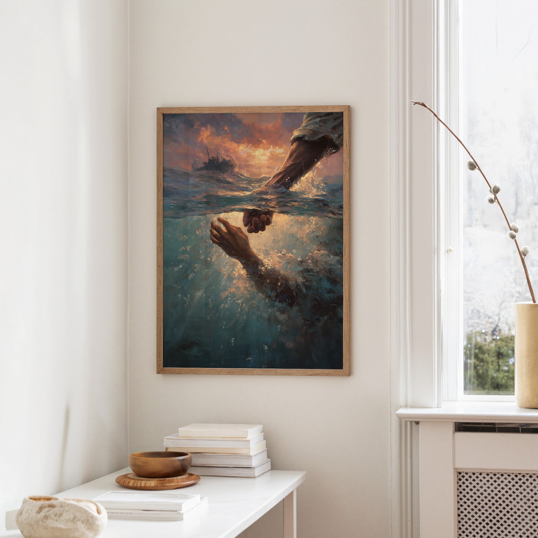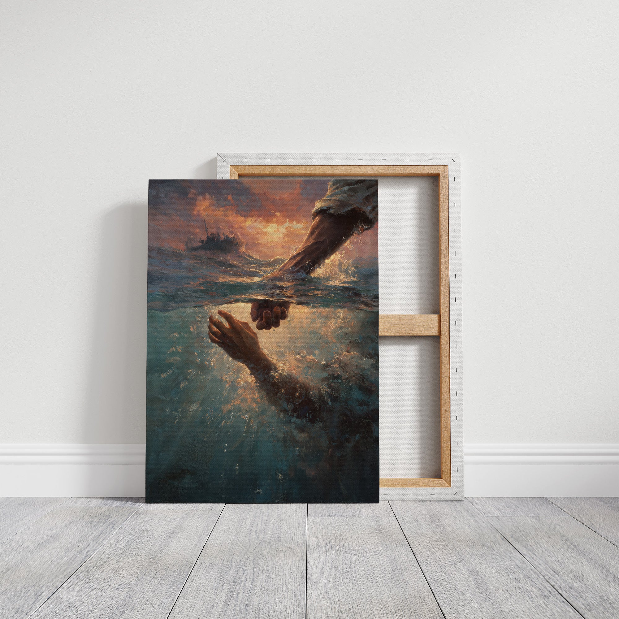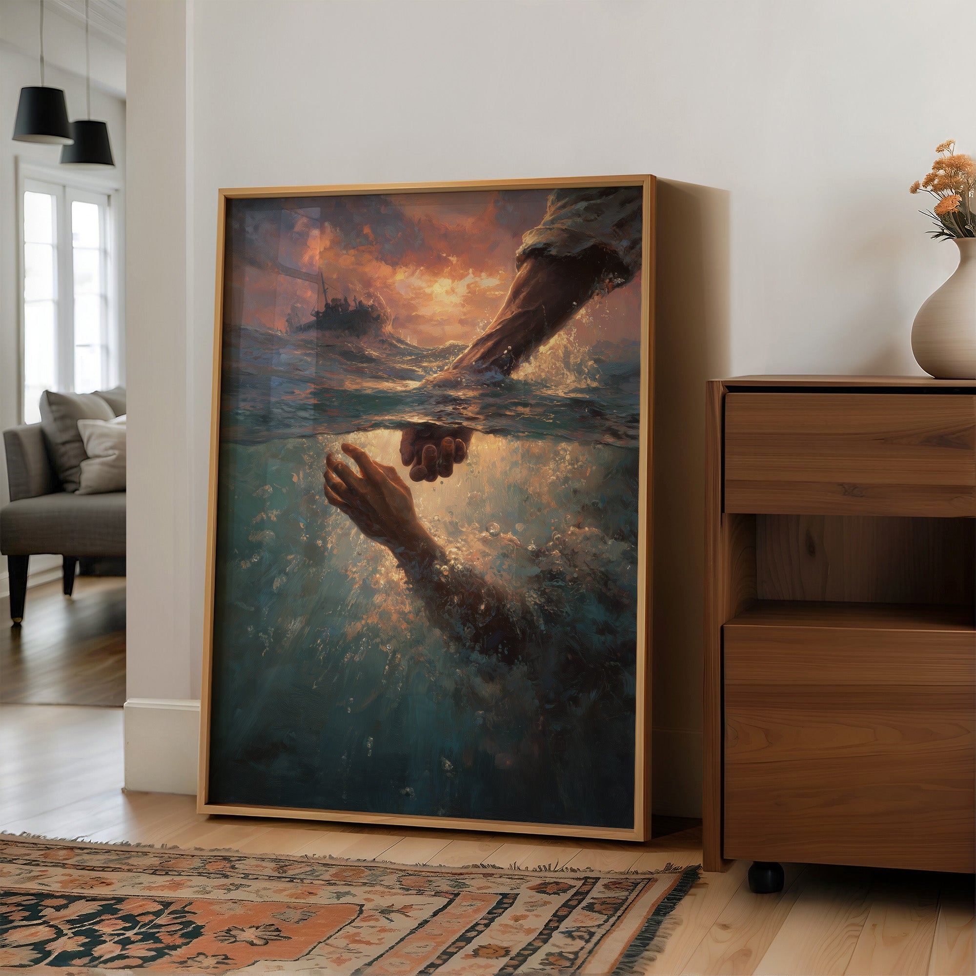 A moment suspended between salvation and surrender, where fingertips strain across churning seawater beneath a fiery sky. The dramatic painting captures the emotional intensity of human connection amid crisis, with teal waters splashing against outstretched arms while a distant ship battles the same tempestuous sea. The rich contrast between the warm sunset palette above and cool aquatic tones below creates a powerful narrative of hope amidst chaos.