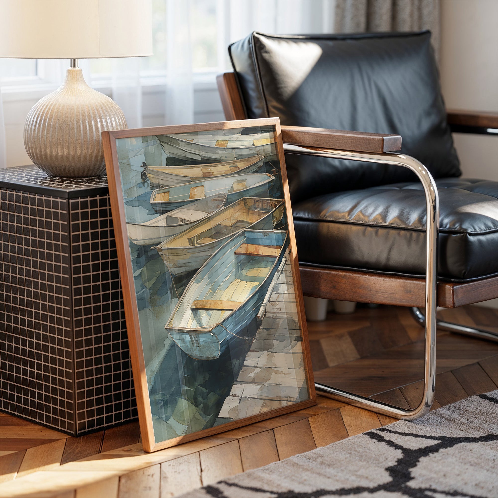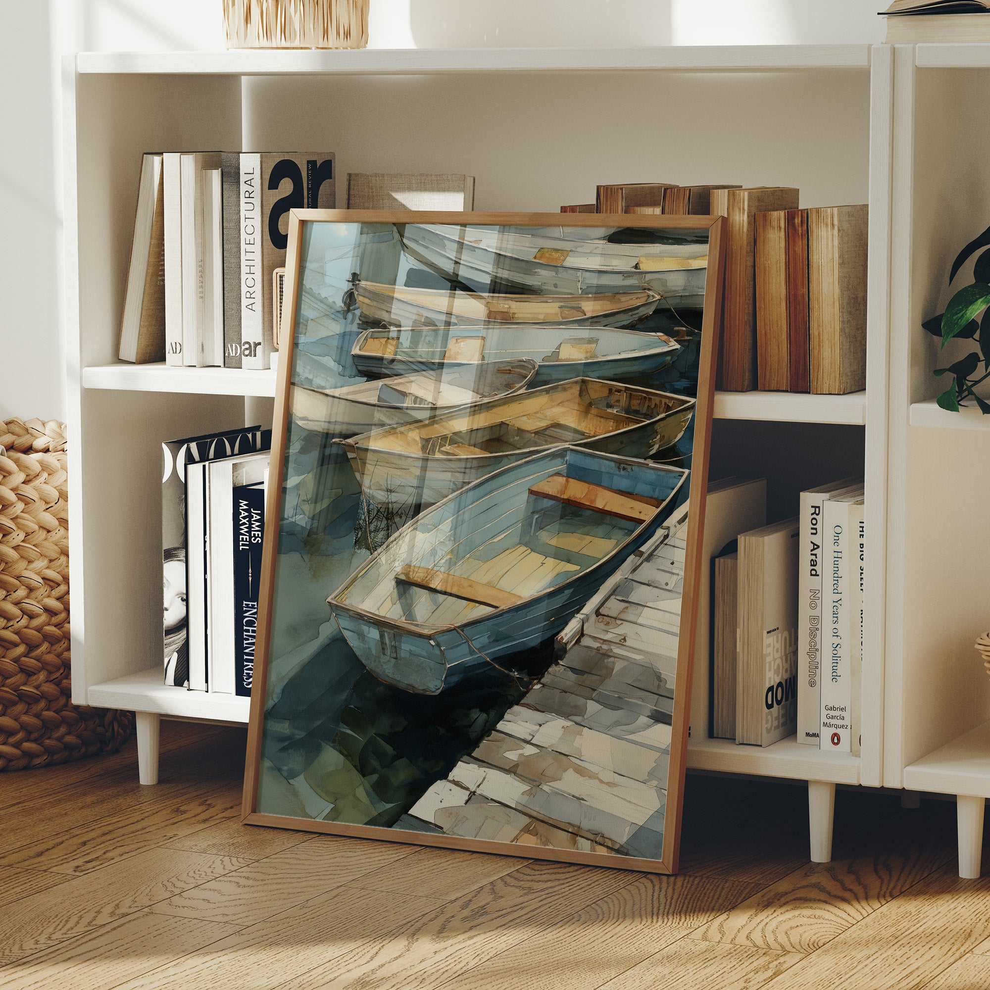 A contemplative watercolor painting of wooden rowboats nestled together at a dock. The composition features several boats in varying shades of blue, white, and natural wood tones, creating a harmonious rhythm as they float on dark, reflective water. The artist's technique captures the weathered texture of the boats and the subtle interplay of light across their surfaces.