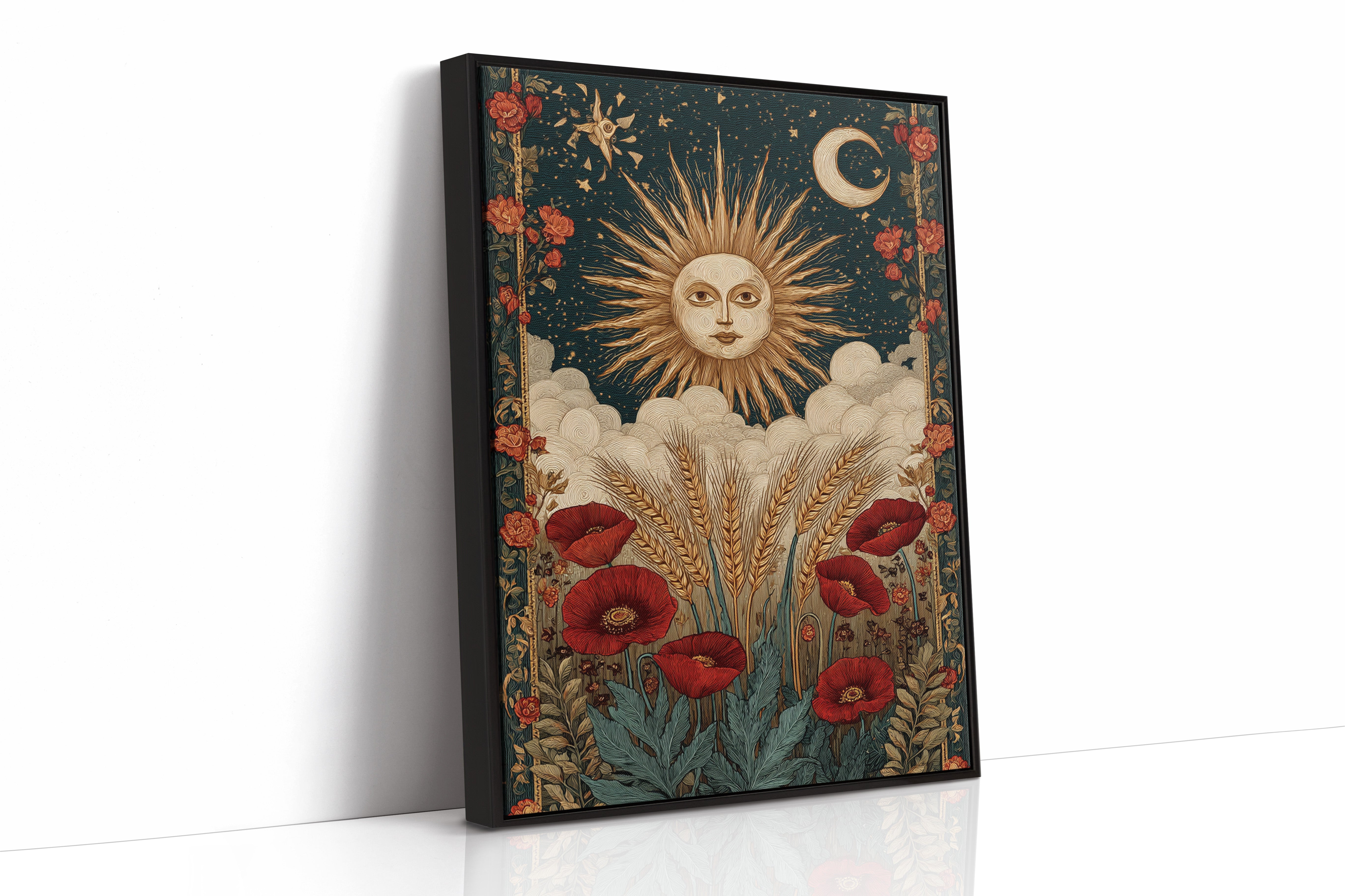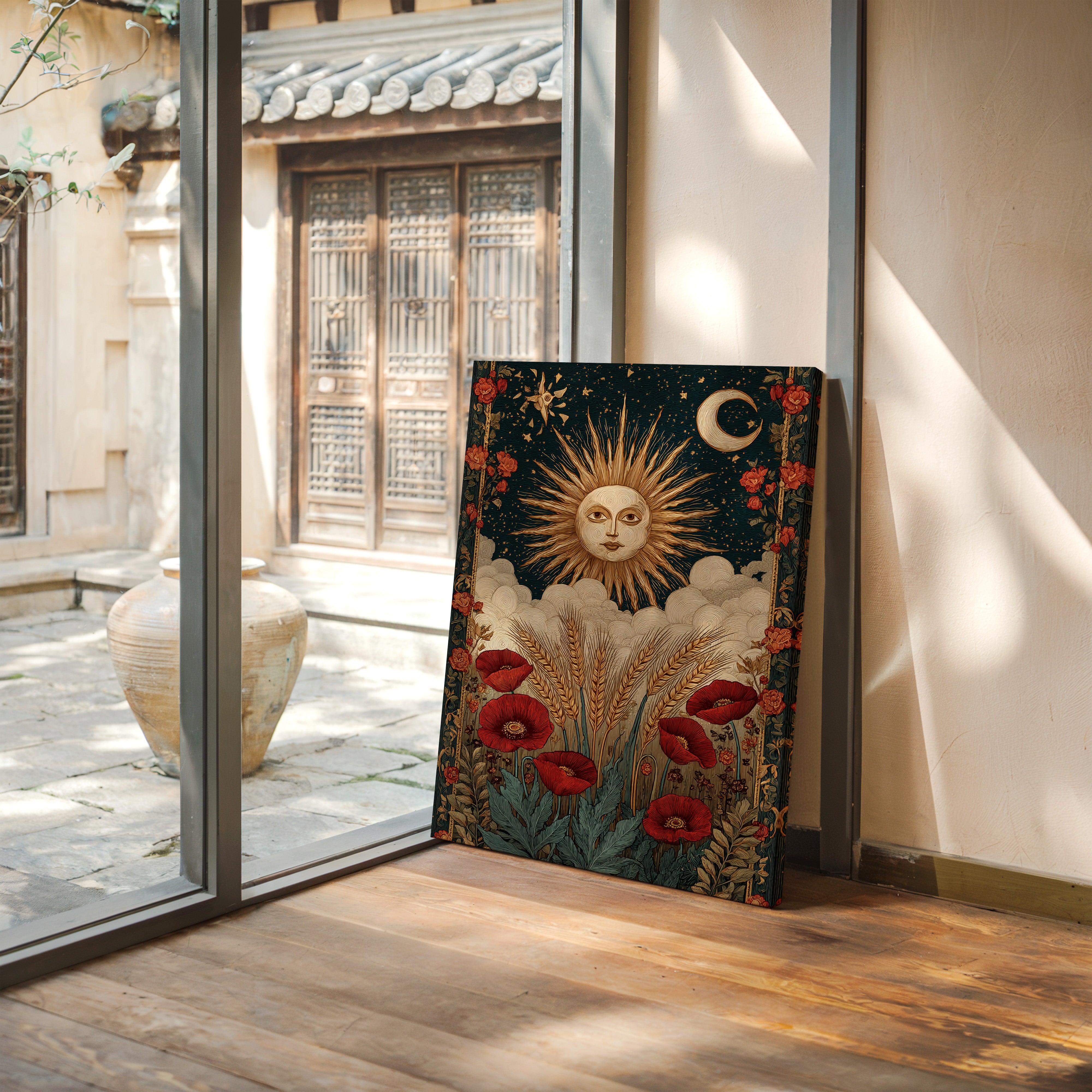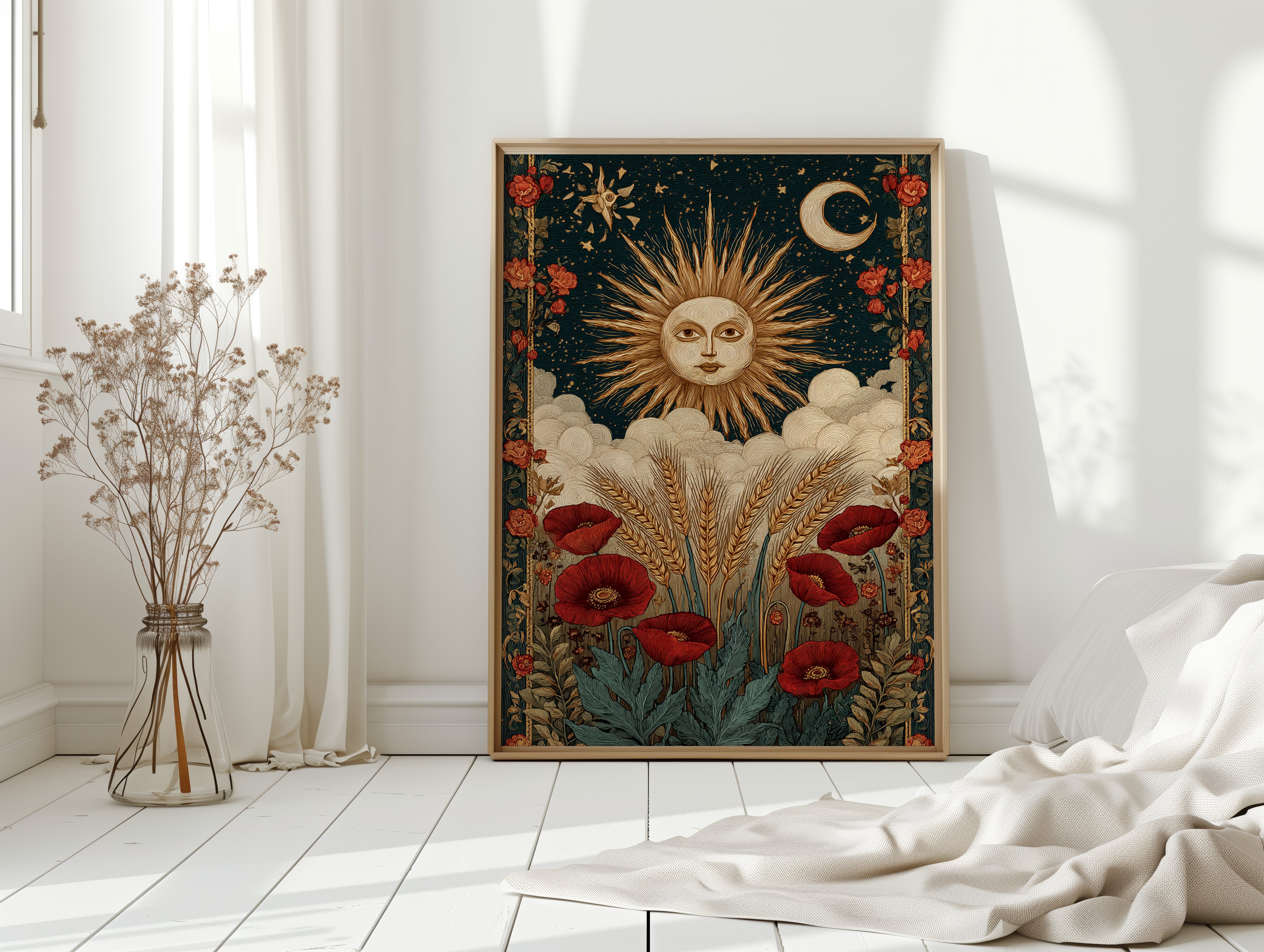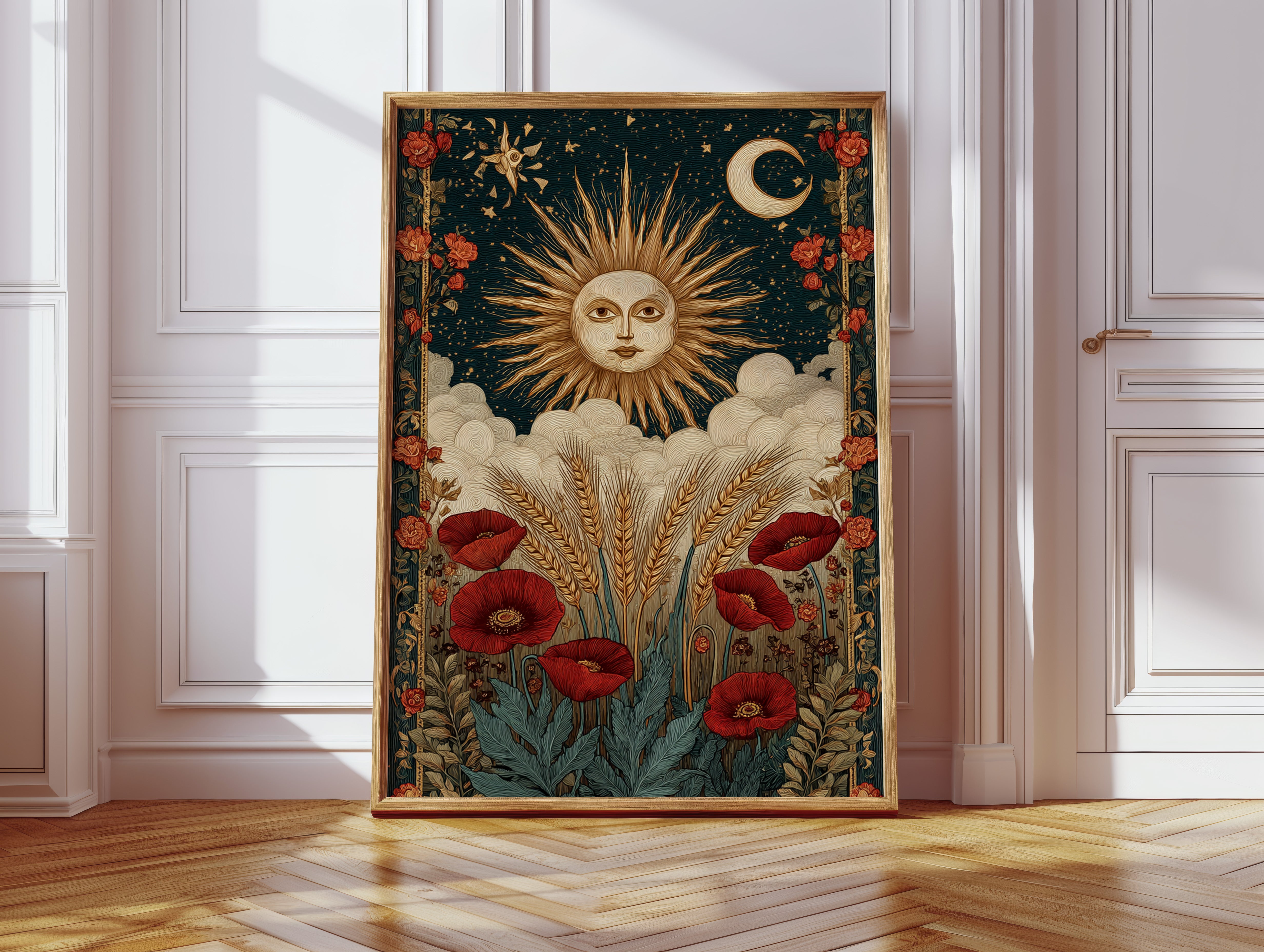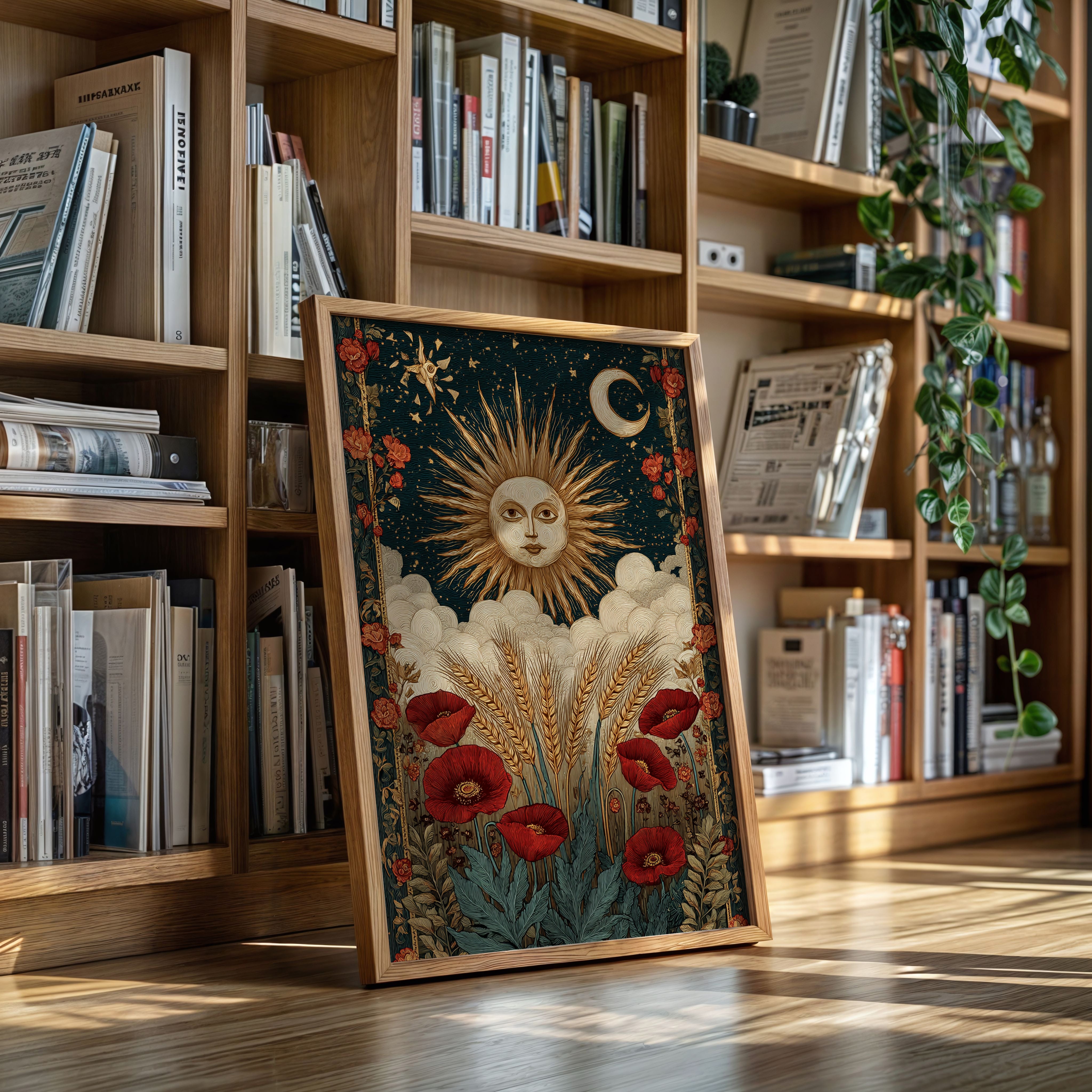 As dawn breaks, the sun rises in a flourish, illuminating fields adorned with vibrant poppies. This piece captures the essence of the Artisanal collection, where nature and craftsmanship intertwine. Golden wheat sways gently, cradled by soft clouds, while the moon and stars weave a celestial tapestry above, inviting the viewer to reflect on the cycles of life and the beauty of the earth. Perfect for a sunlit kitchen or a cozy reading nook, where warmth and inspiration flourish.