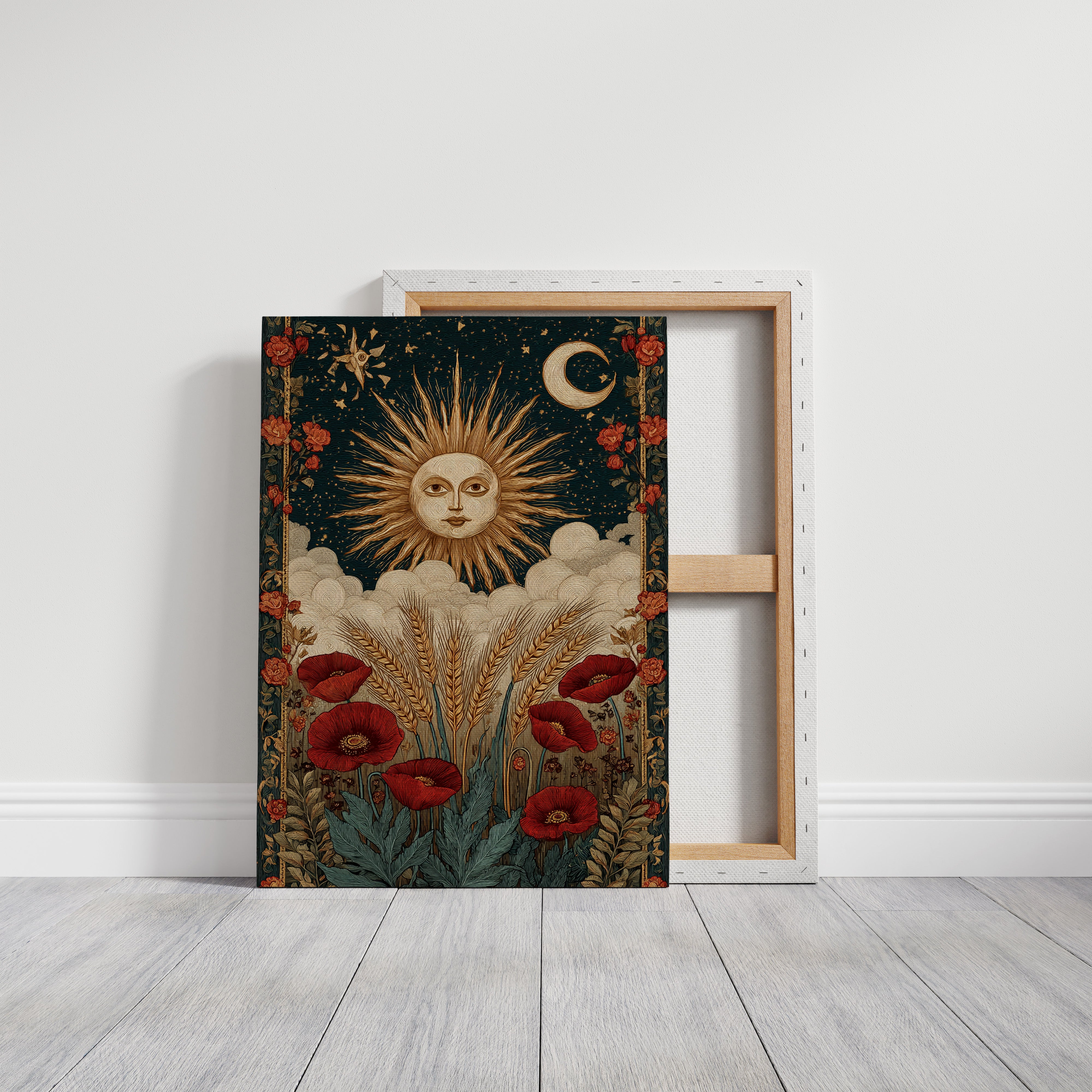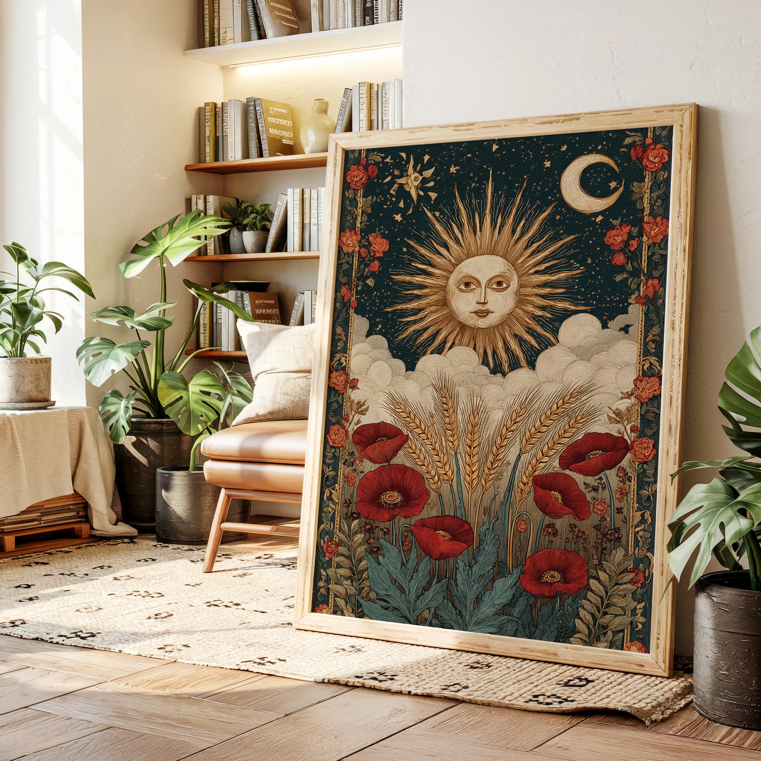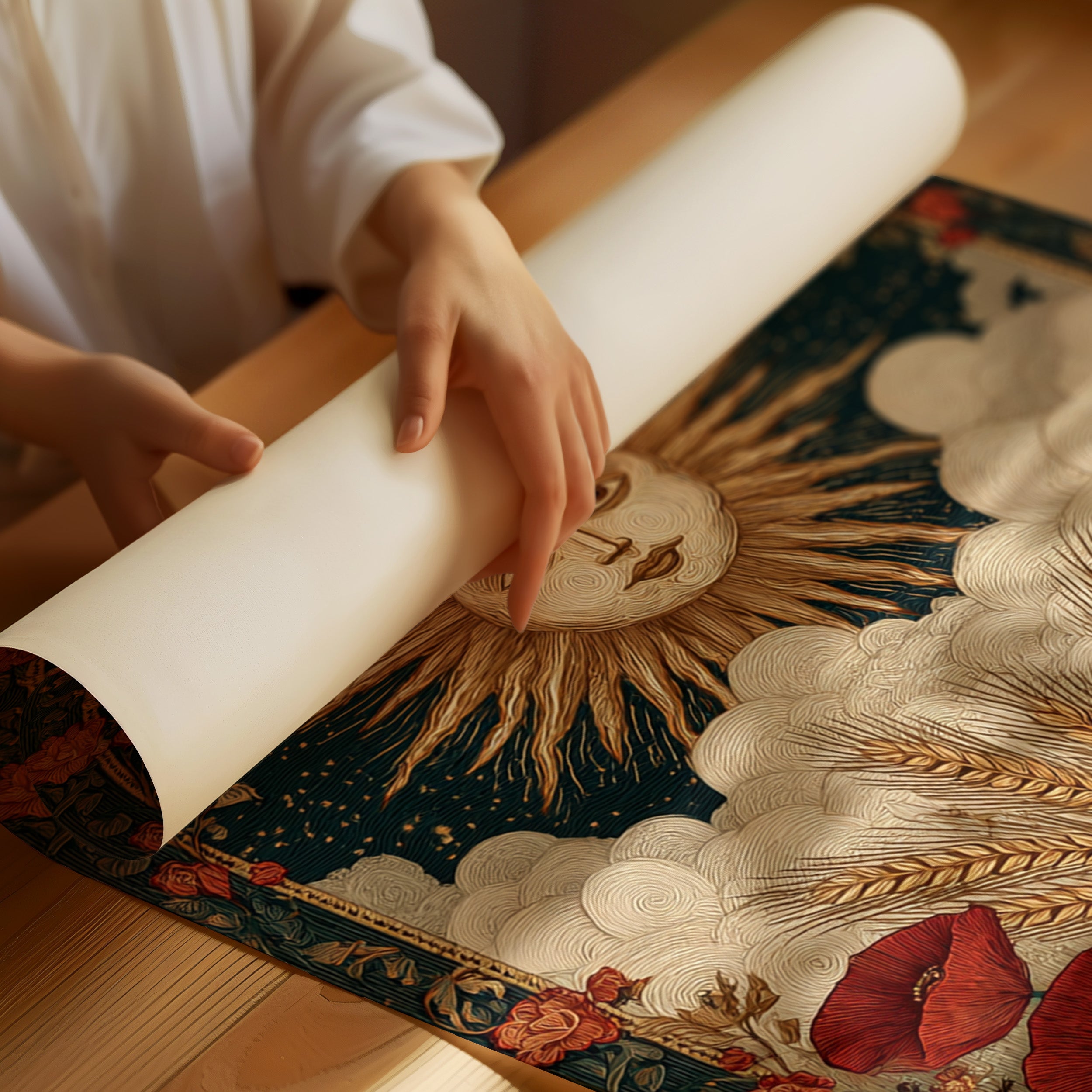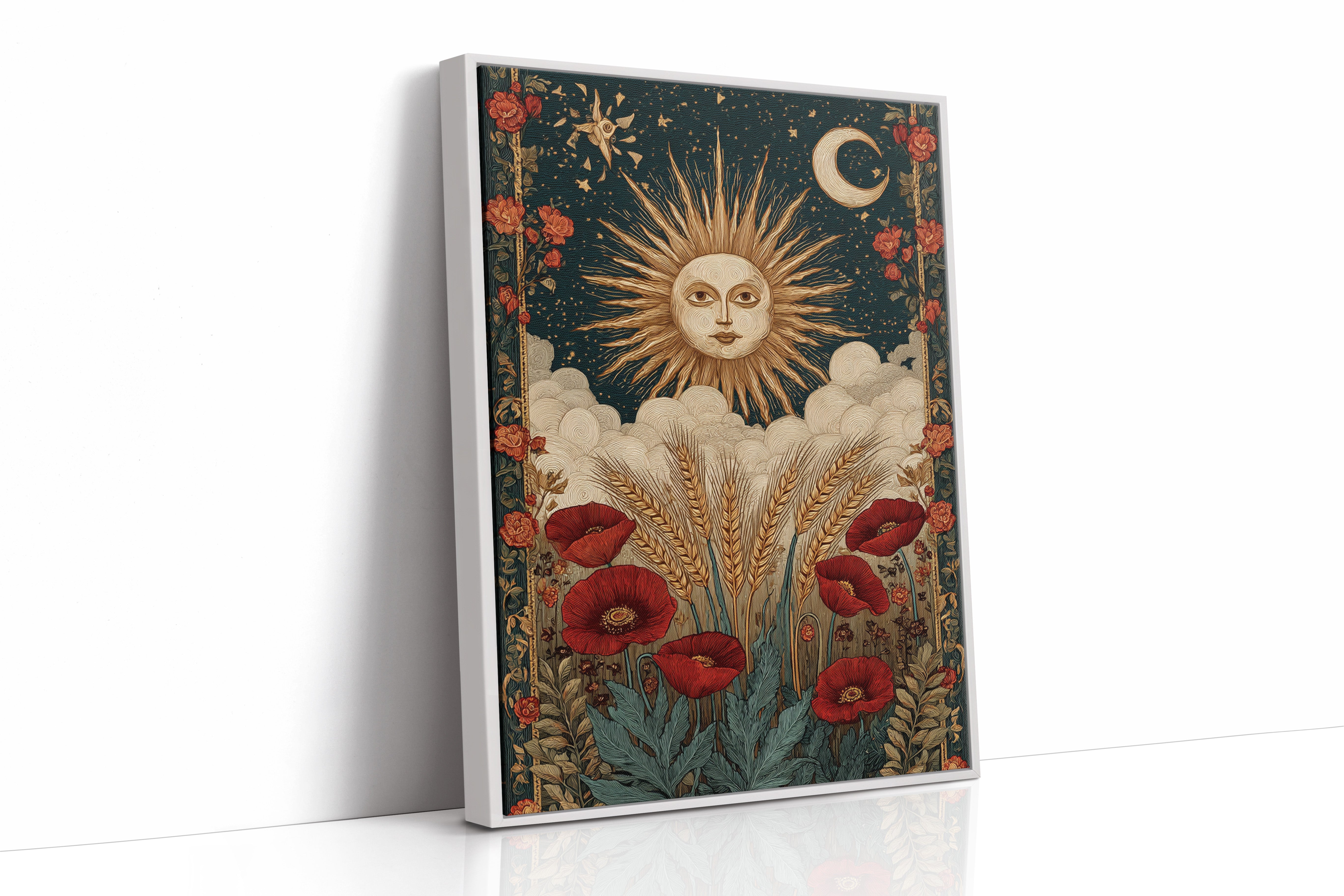As dawn breaks, the sun rises in a flourish, illuminating fields adorned with vibrant poppies. This piece captures the essence of the Artisanal collection, where nature and craftsmanship intertwine. Golden wheat sways gently, cradled by soft clouds, while the moon and stars weave a celestial tapestry above, inviting the viewer to reflect on the cycles of life and the beauty of the earth. Perfect for a sunlit kitchen or a cozy reading nook, where warmth and inspiration flourish.