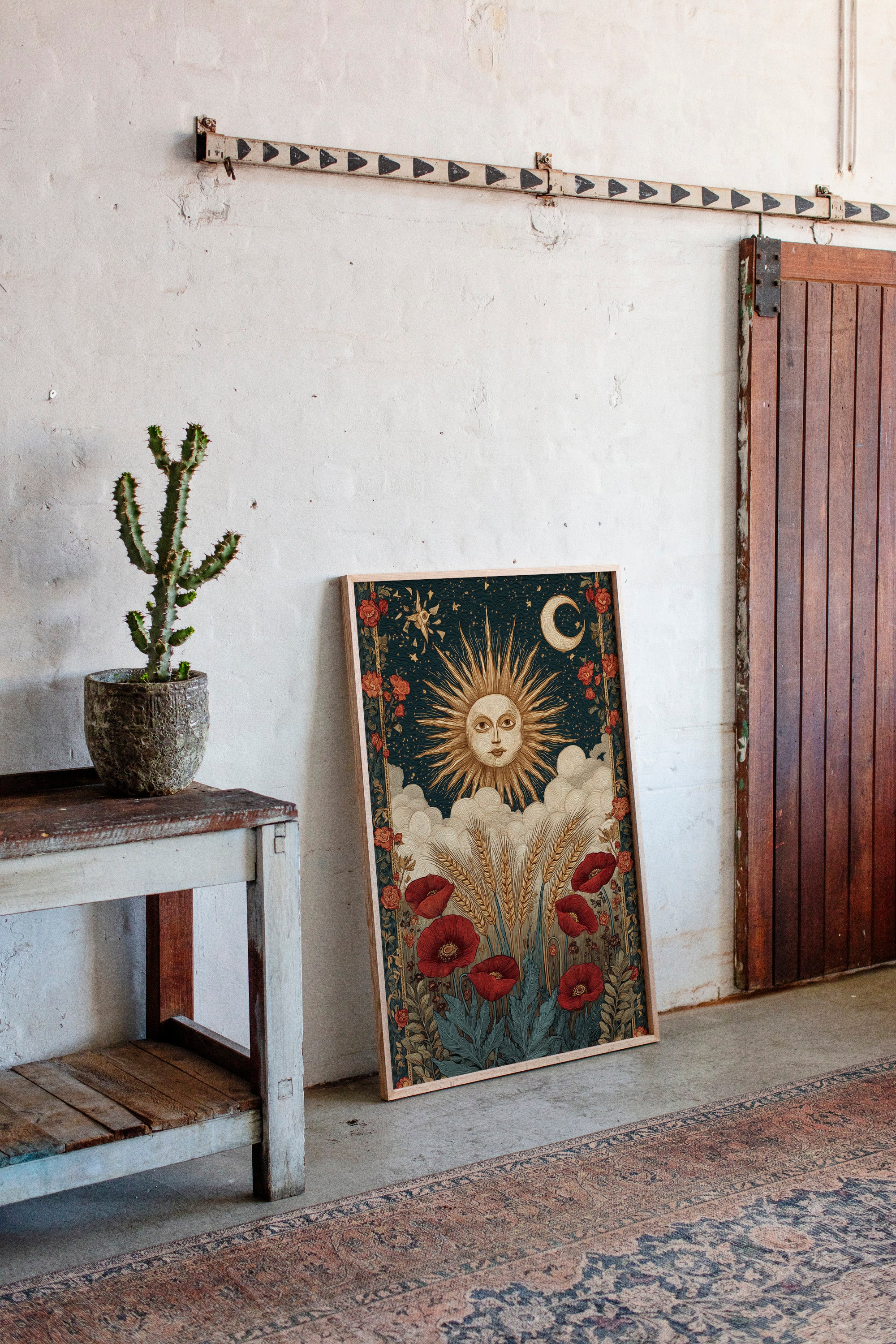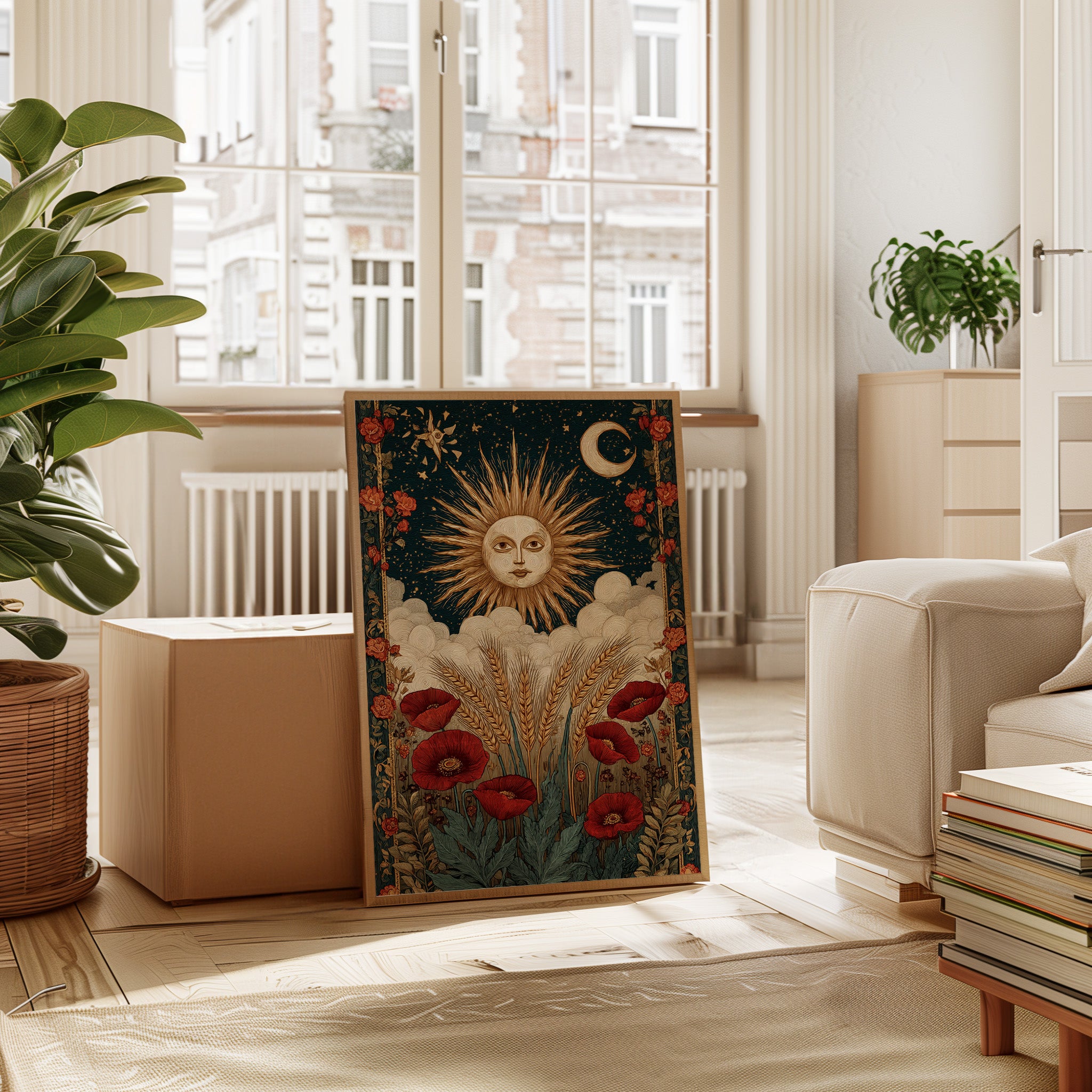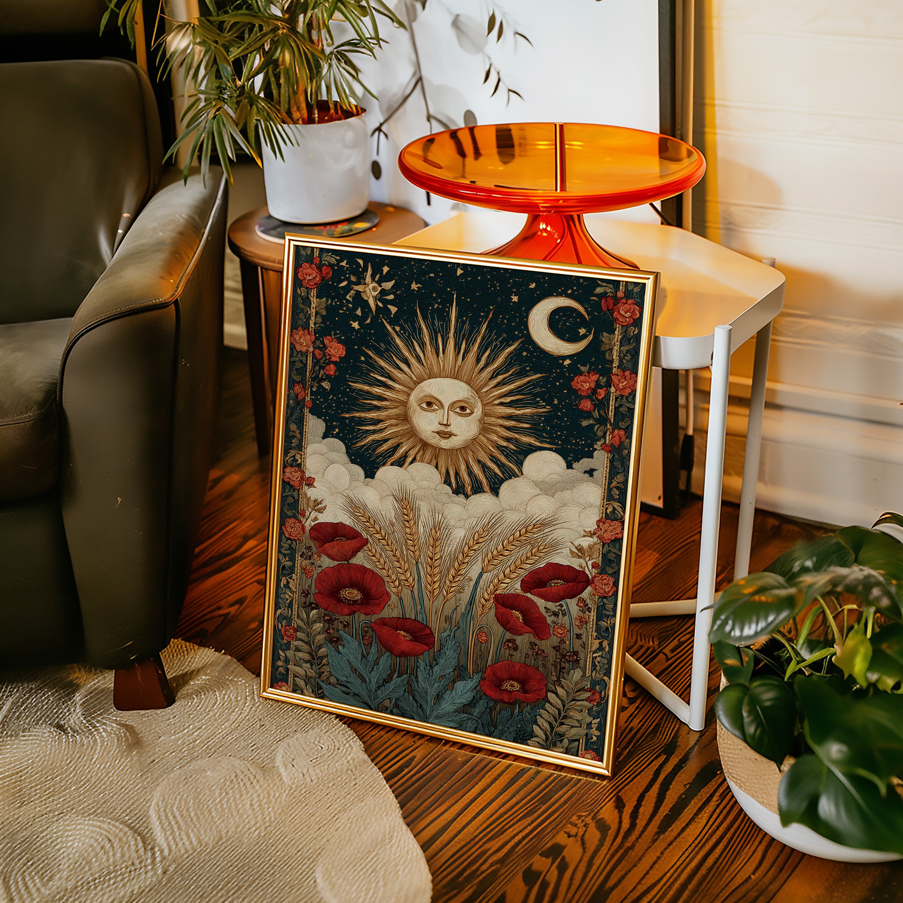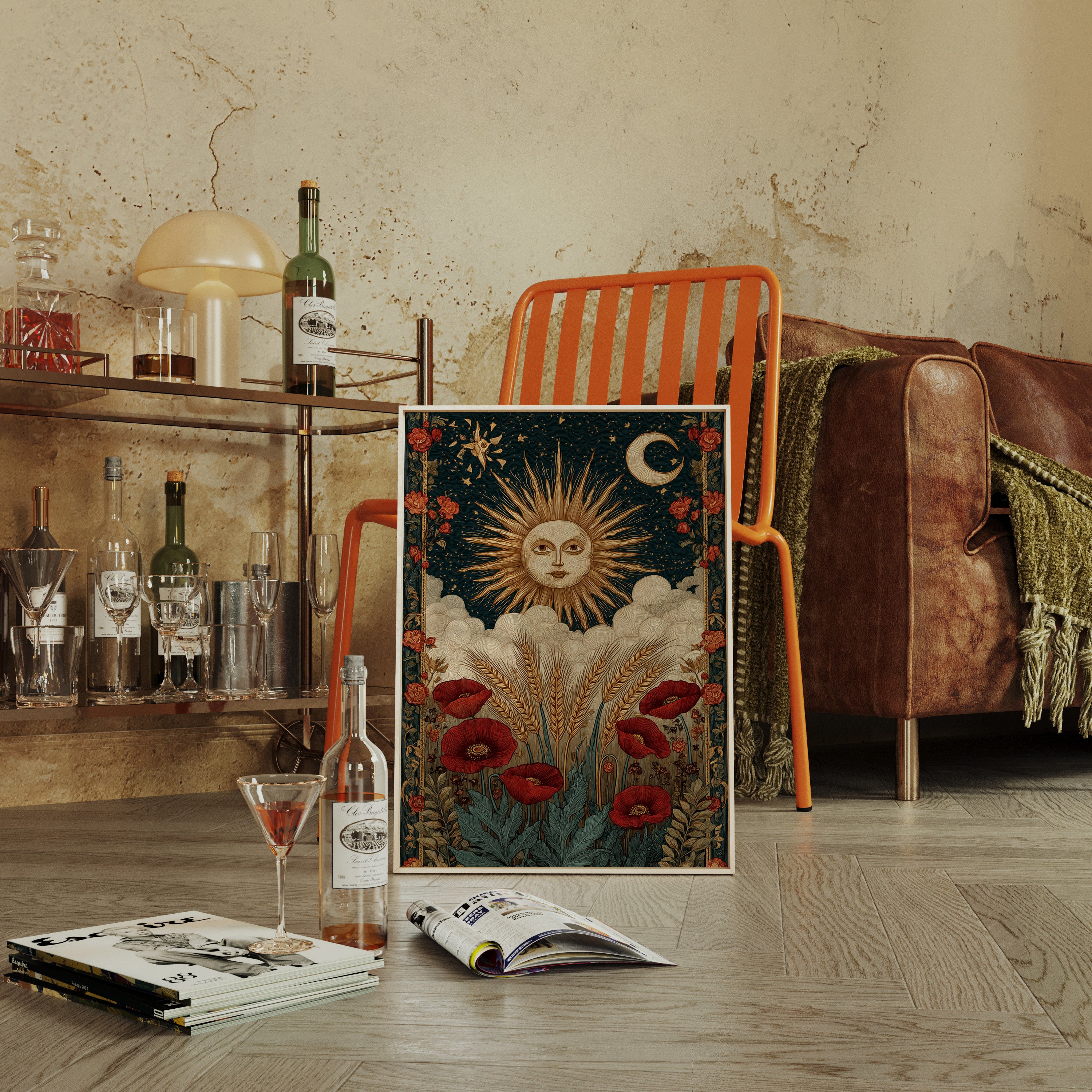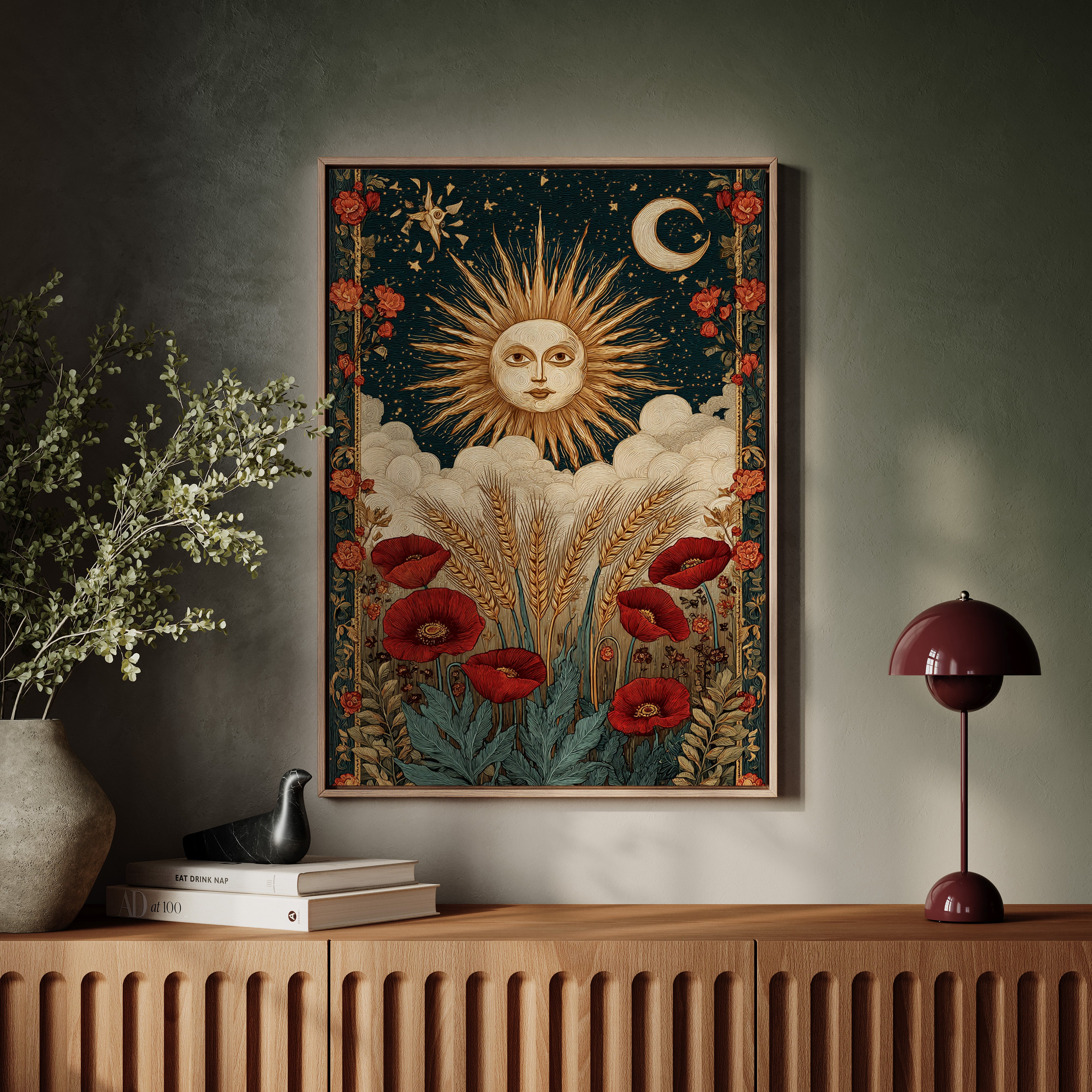 As dawn breaks, the sun rises in a flourish, illuminating fields adorned with vibrant poppies. This piece captures the essence of the Artisanal collection, where nature and craftsmanship intertwine. Golden wheat sways gently, cradled by soft clouds, while the moon and stars weave a celestial tapestry above, inviting the viewer to reflect on the cycles of life and the beauty of the earth. Perfect for a sunlit kitchen or a cozy reading nook, where warmth and inspiration flourish.