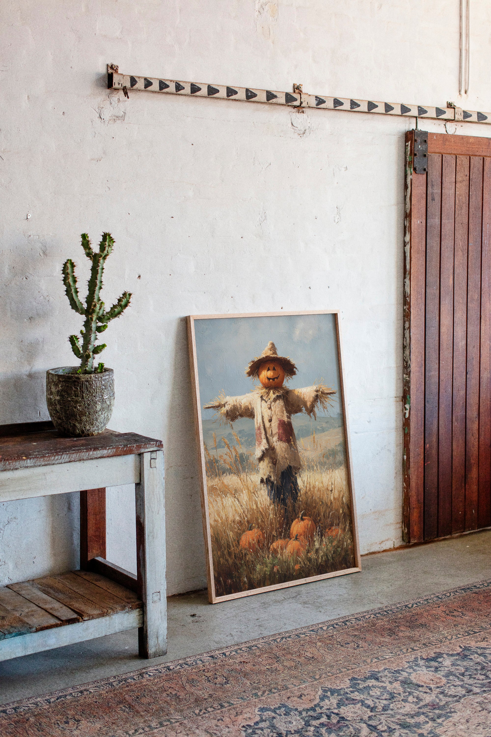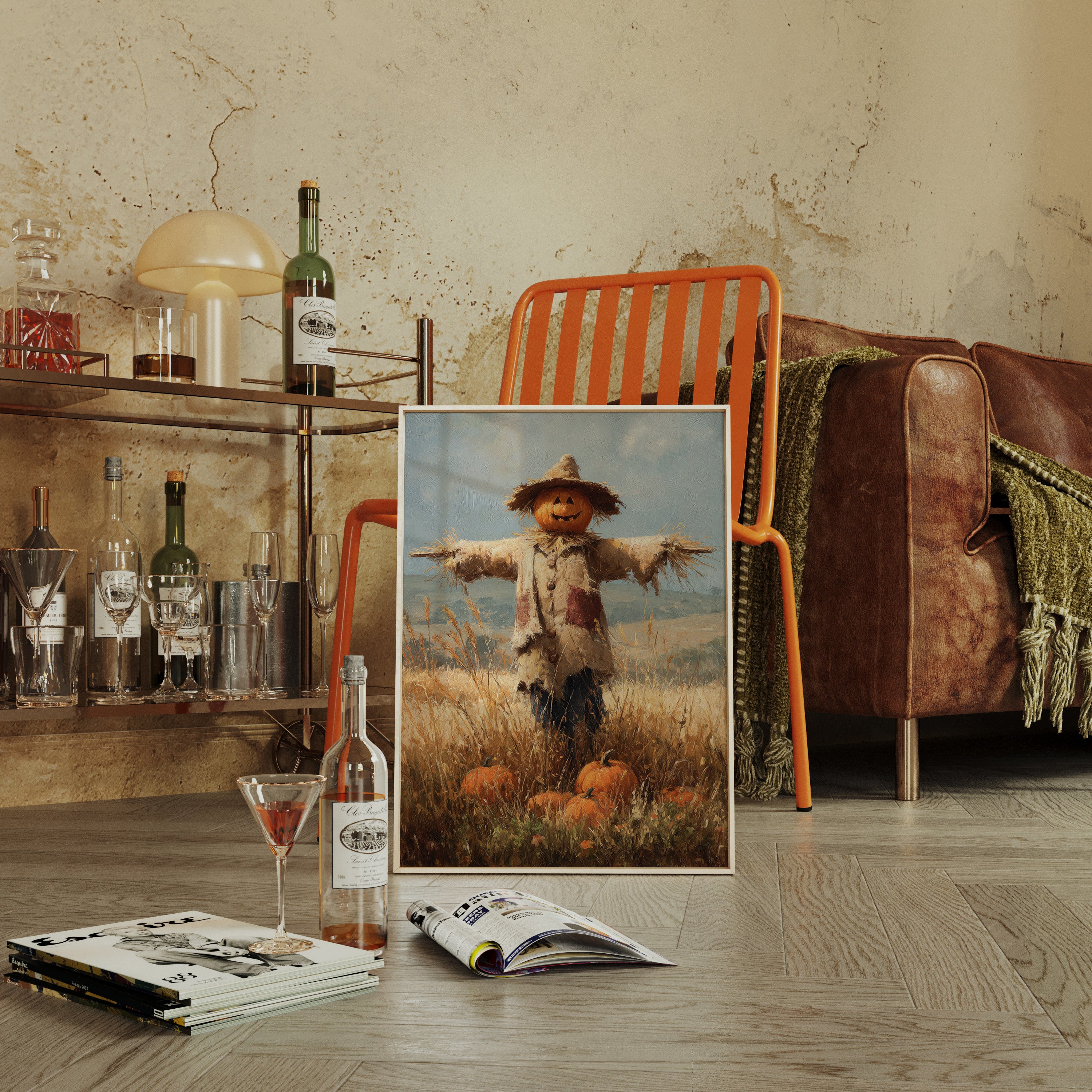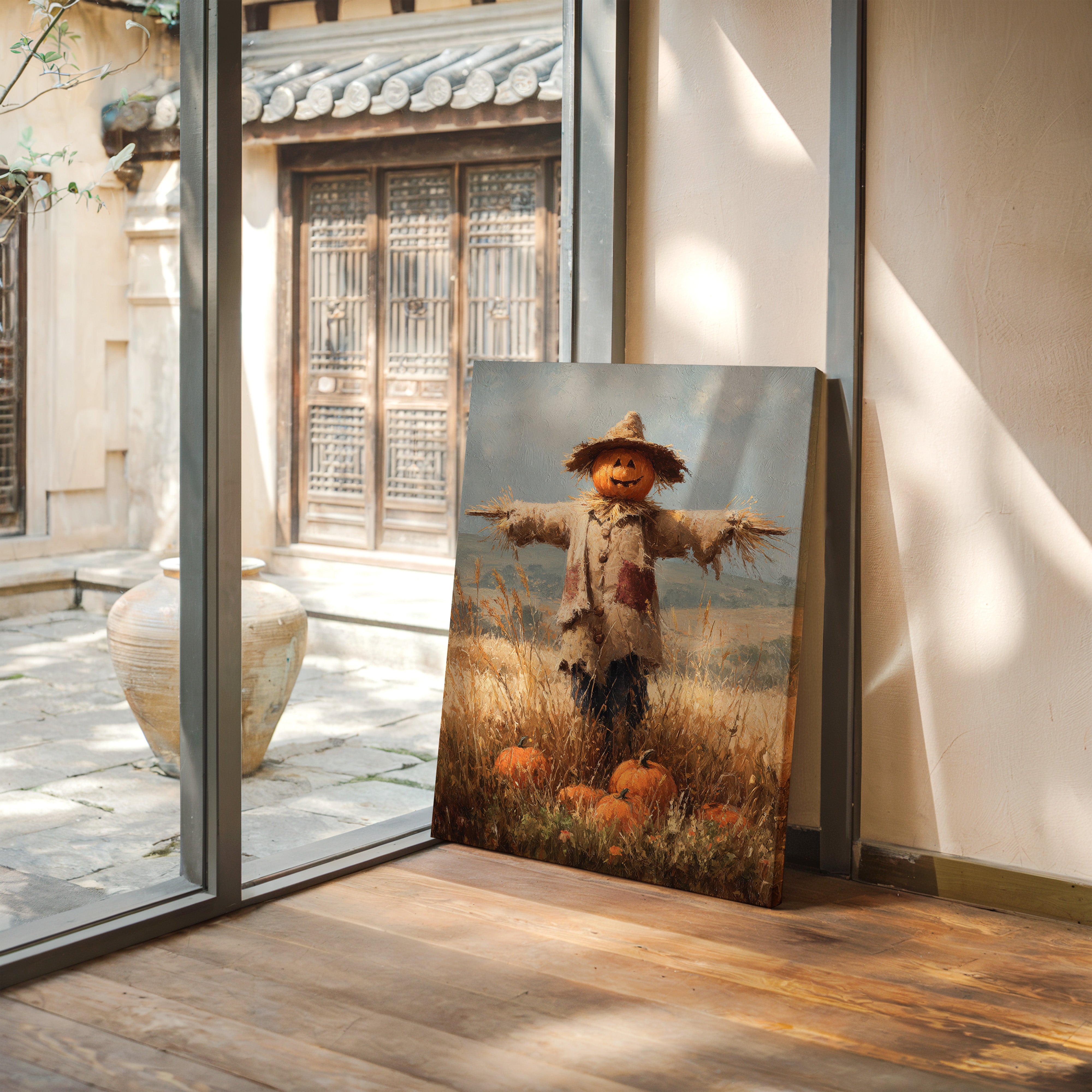 A charming scarecrow stands sentinel in a sun-drenched autumn field, its pumpkin head gleaming with a friendly smile. Rich textures of straw and weathered fabric create a rustic character against the pastoral backdrop, while scattered pumpkins nest among golden wheat stalks at its feet. The interplay of warm oranges and creamy beiges captures the essence of fall's abundance, with brushstrokes that dance between impressionism and realism. This nostalgic scene would bring seasonal warmth to a country kitchen or create an inviting focal point in a dining room where family gatherings celebrate harvest traditions.
